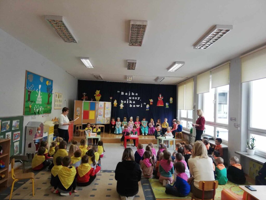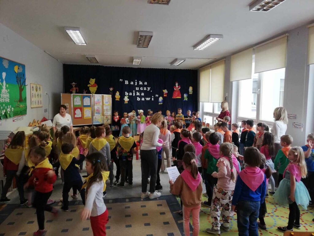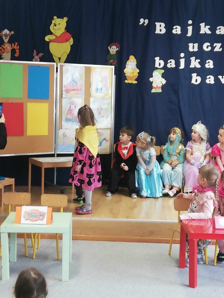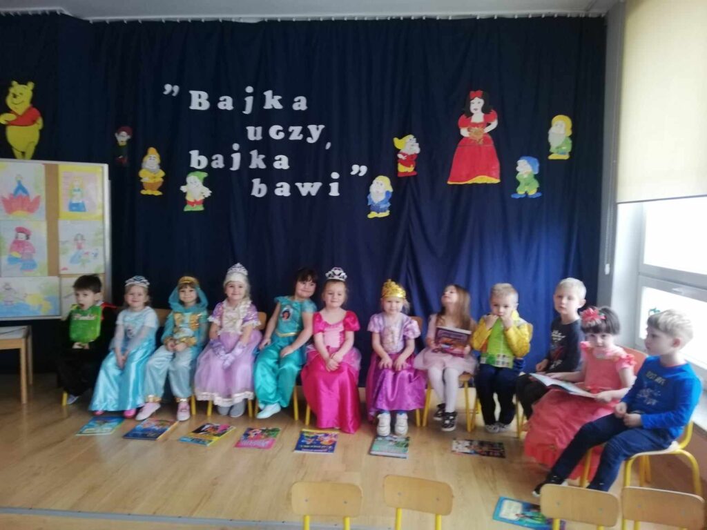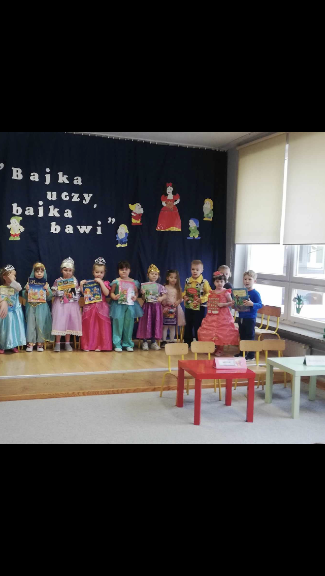 Baśń i bajka w wychowaniu dziecka odgrywa dużą rolę. Treści wzmacniają przekonanie i wiarę w dobroć, sprawiedliwość czyniąc je lepszymi i bogatszymi wewnętrznie. 23.II. 2024r. Grupa „Wiewiórki” zorganizowała dla gr. 5 latków „ Misie”, „ Biedronki”, „Motylki” Quiz z wiedzy o bajkach i baśniach. Przed rozpoczęciem na sali pojawiły się kolorowe postacie – dzieci z gr. „ Wiewiórki” przebrane były za bohaterów z bajek. Przedszkolaki rozpoznawały znane i lubiane bajki i odkrywały mądrość w nich drzemiącą. Podsumowaniem było stwierdzenie, że warto czytać baśnie. Każda z nich bowiem kryje morał , który jest ponadczasową nauką dla każdego człowieka. Uśmiechy na twarzach po zakończonych zajęciach i otrzymane dyplomy były najlepszym dowodem świetnej zabawy.
