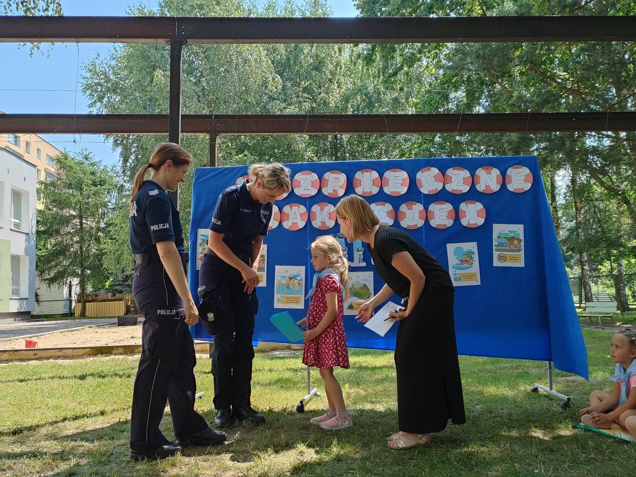 Dzieci dowiedziały się jak odpowiedzialnie i bezpiecznie zachowywać się nad wodą i w górach oraz przypomniały sobie zasady ograniczonego zaufania w stosunku do osób obcych. Policjantki przypomniały także jak prawidłowo przechodzić przez jezdnię oraz o obowiązku zapinania pasów bezpieczeństwa, jeździe w fotelikach i noszeniu elementów odblaskowych. Na przykładzie odegranych scenek przedszkolaki wiedzą już co zrobić w przypadku zgubienia się. Za miło spędzony czas oraz współpracę z naszym przedszkolem dzieci podziękowały Funkcjonariuszkom wręczając im własnoręcznie wykonaną książeczkę.