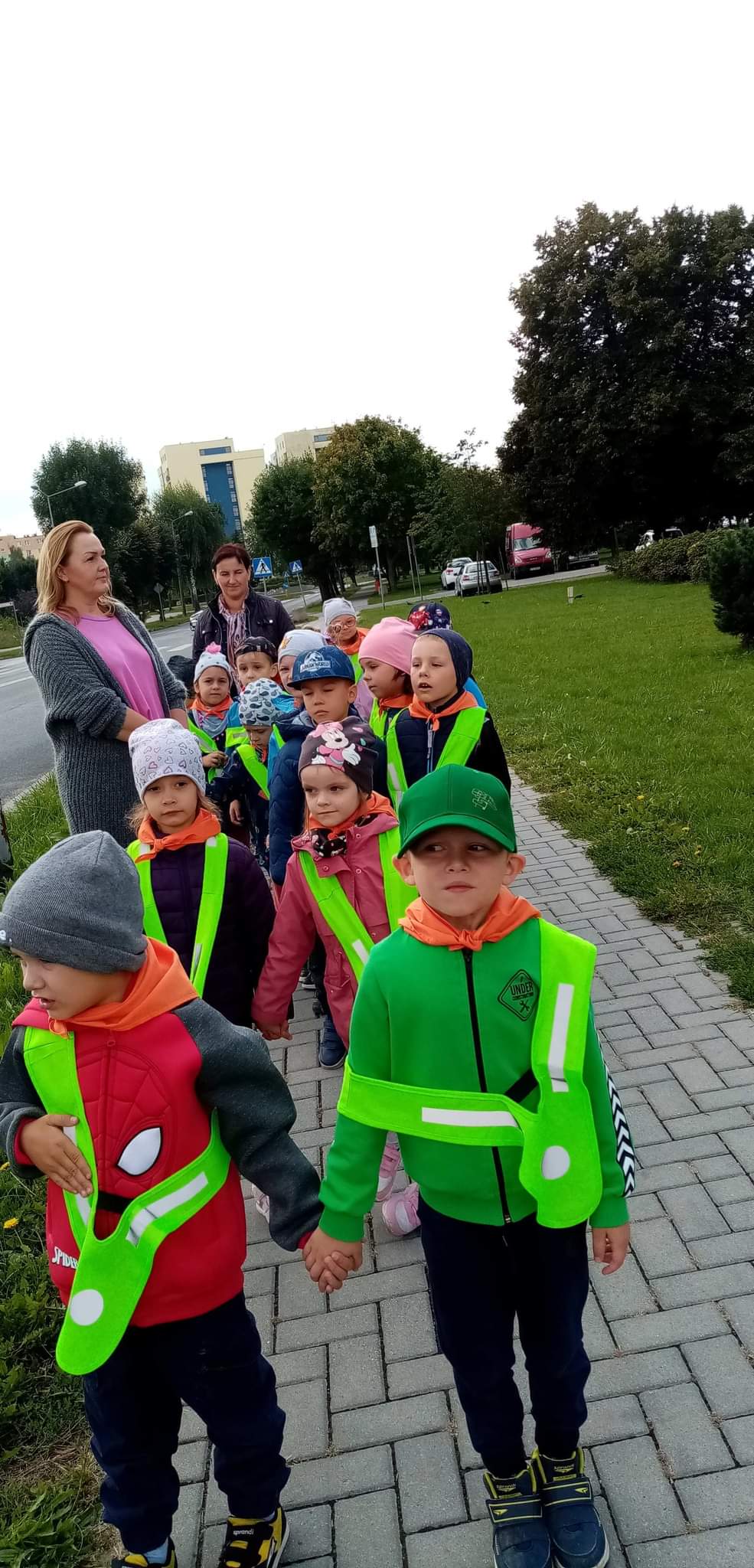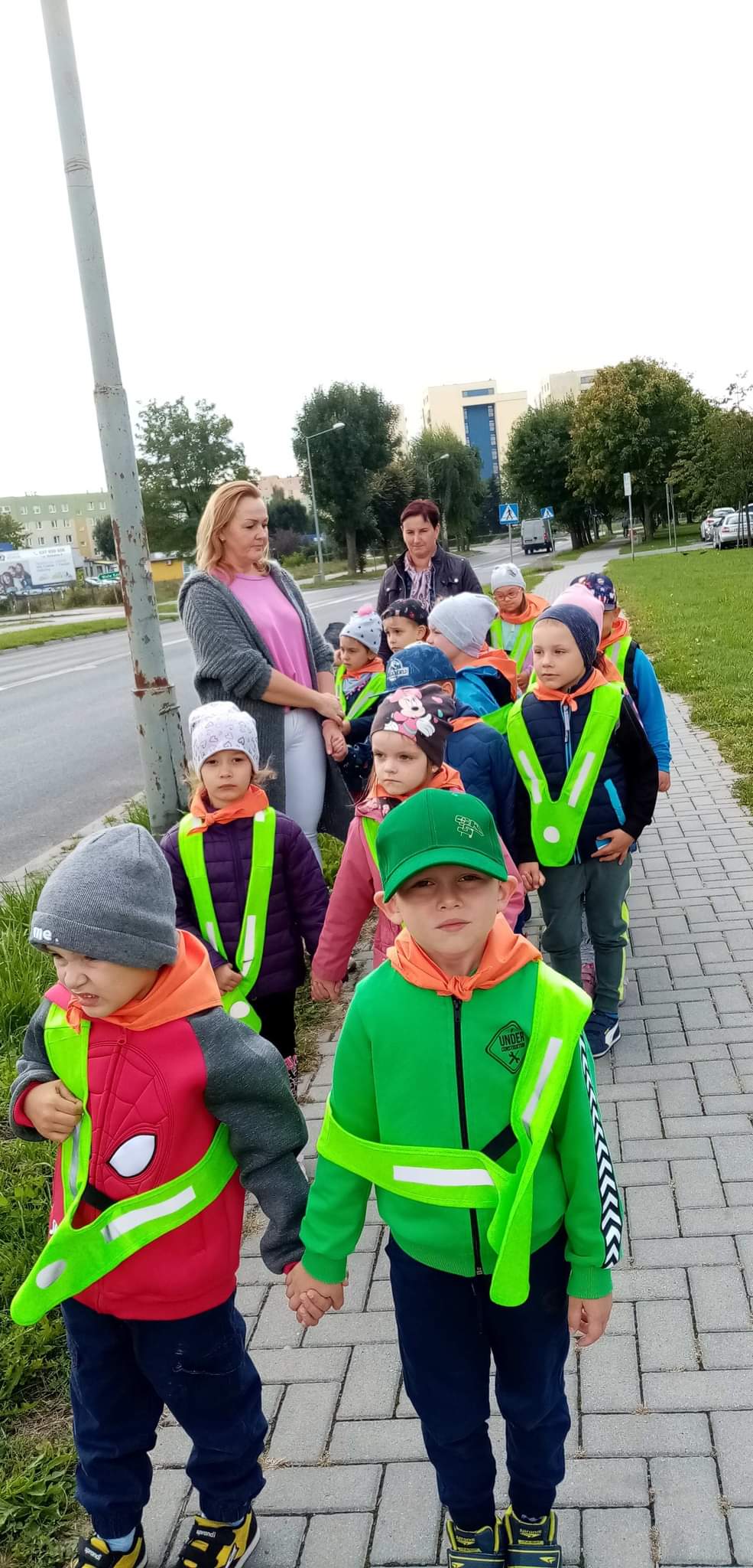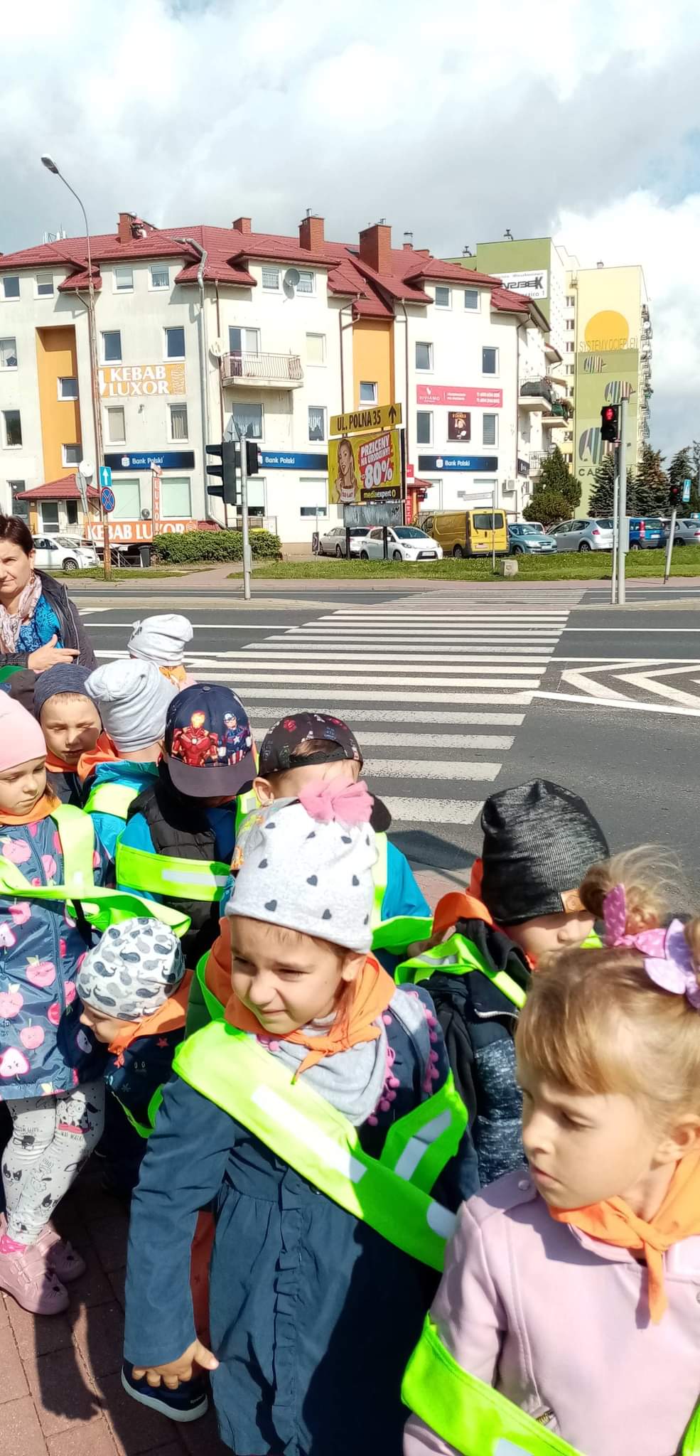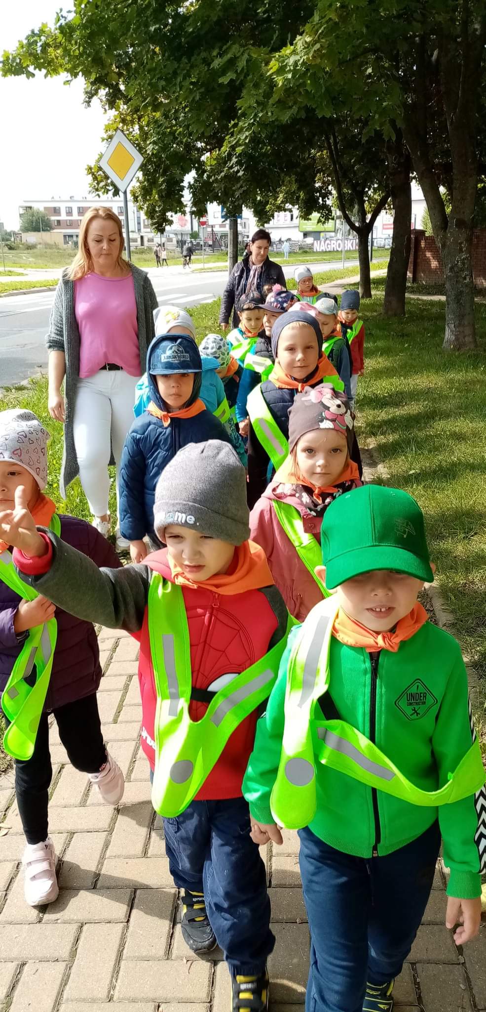 Wrzesień to miesiąc, w którym szczególnie przypominamy o zasadach zachowania bezpieczeństwa w przedszkolu ale także na chodnikach i jezdni. Dzieci jako piesi są uczestnikami ruchu drogowego. Dlatego wybraliśmy się na skrzyżowanie ze światłami, aby zobaczyć jak wygląda ruch uliczny w naszym mieście. Spacer był okazją do wykorzystania w praktyce zdobytych wiadomości.