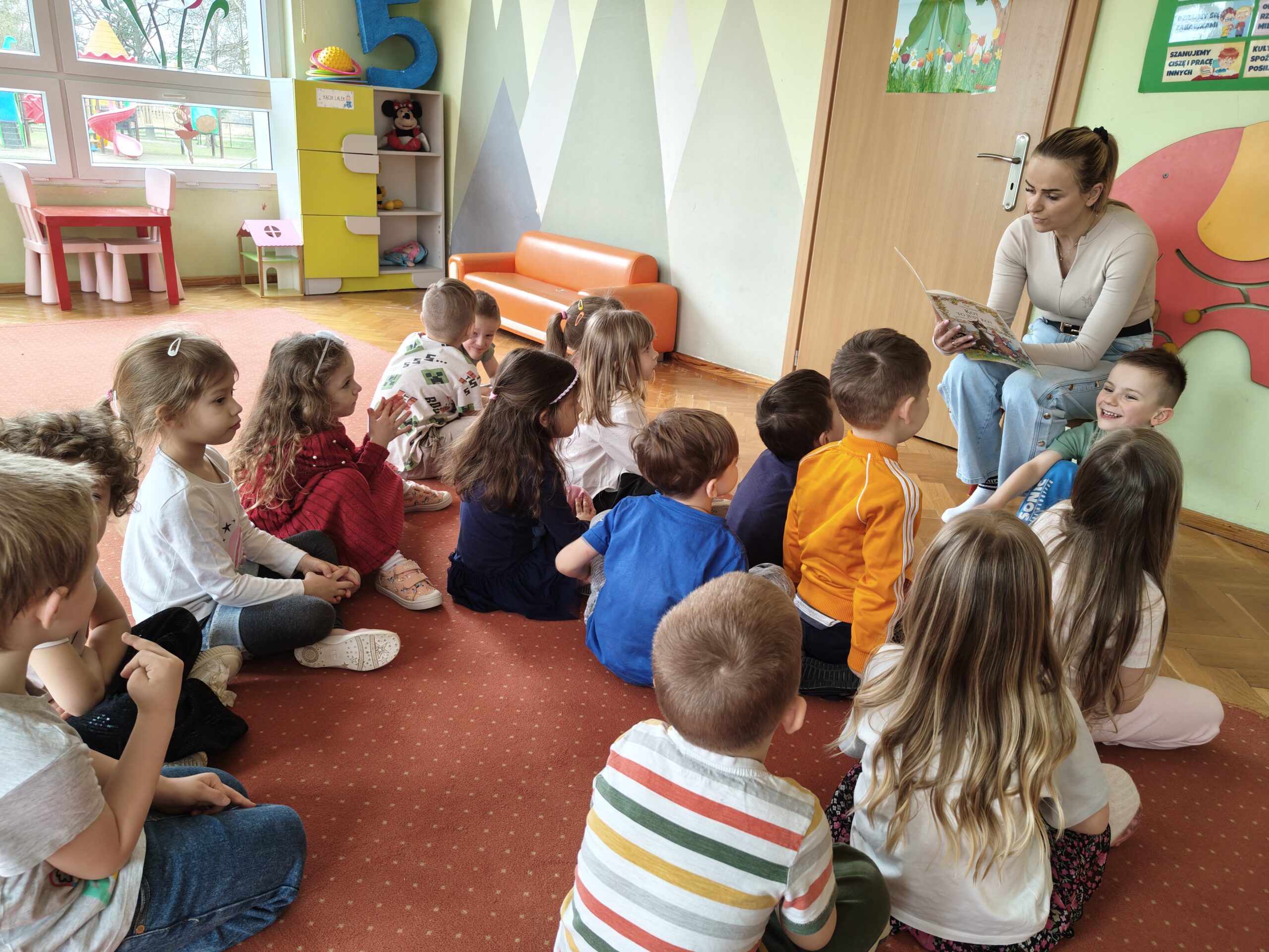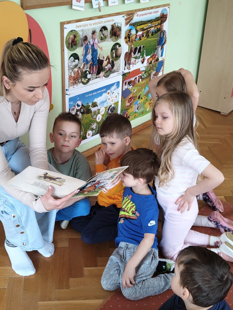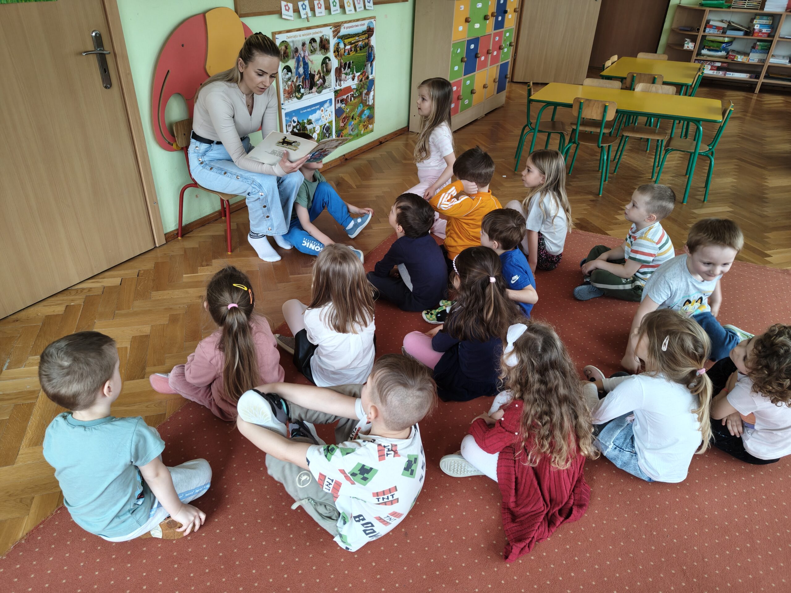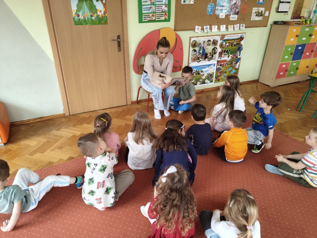 W marcu grupę „Pszczółki” odwiedziła mama Marcela. Pani Kasia przeczytała dzieciom książeczkę o zwierzątkach mieszkających na wsi, czym nawiązała do tematu tygodnia, uzupełniając nasze zajęcia edukacyjne. Dzieci uważnie słuchały czytanego tekstu. Rozwijały swoją wyobraźnię, wzbogacały słownictwo i ćwiczyły umiejętność koncentracji uwagi. Dziękujemy pani Kasi za włączenie się w kampanię społeczną Cała Polska Czyta Dzieciom i promocję czytelnictwa wśród najmłodszych