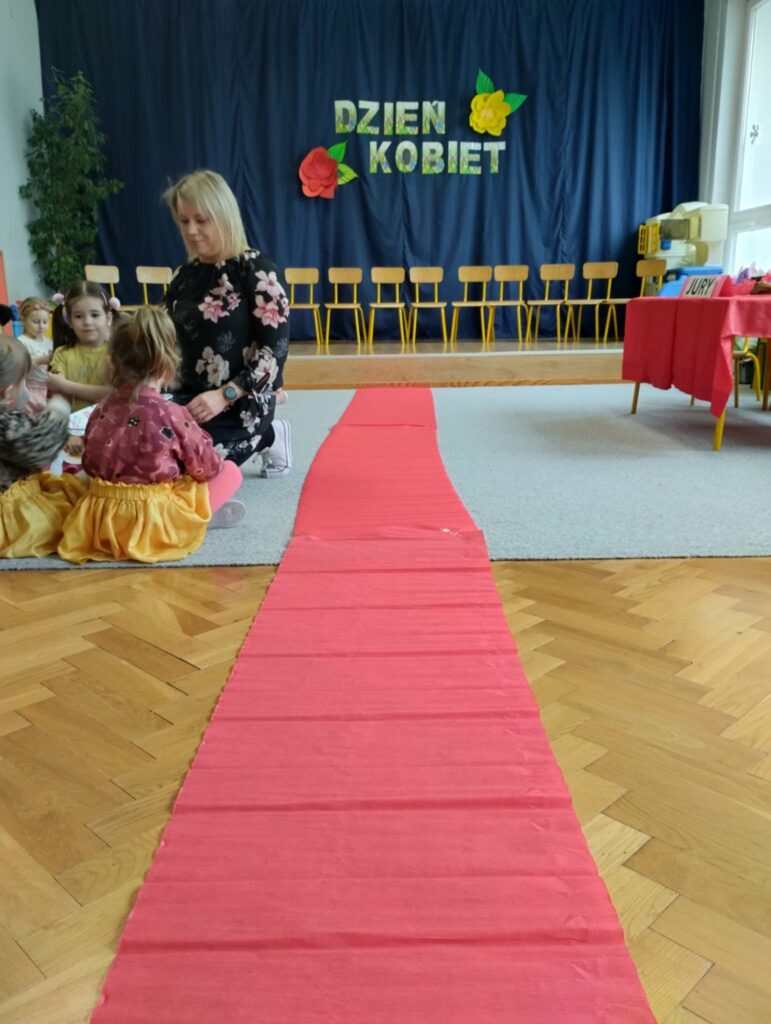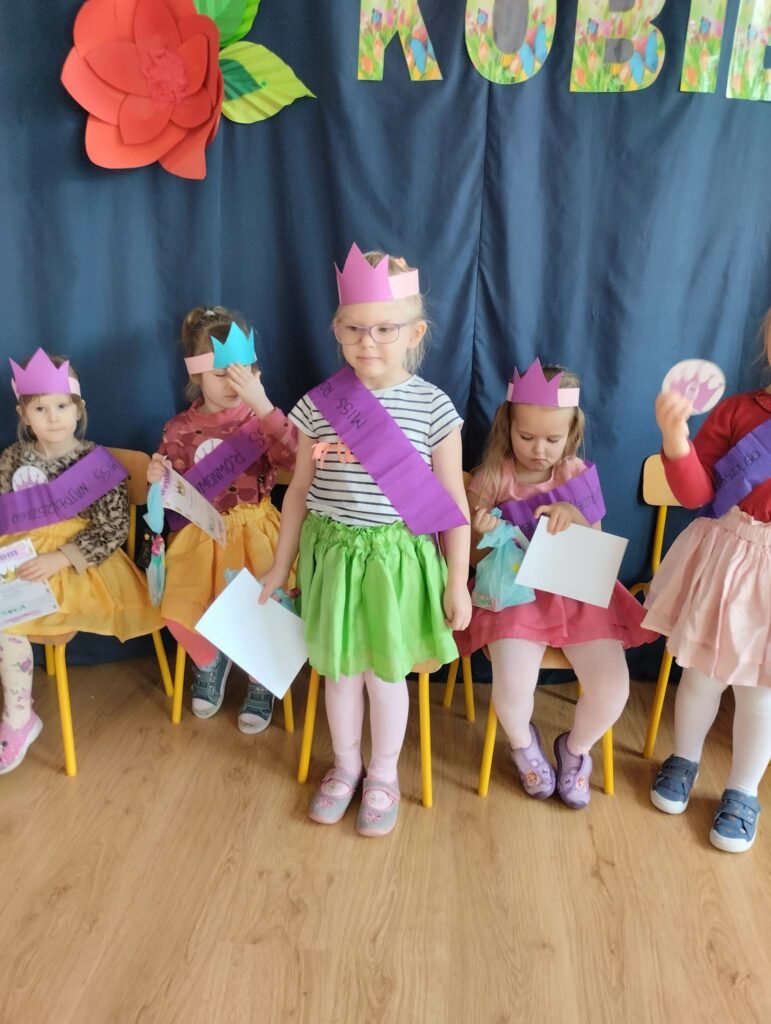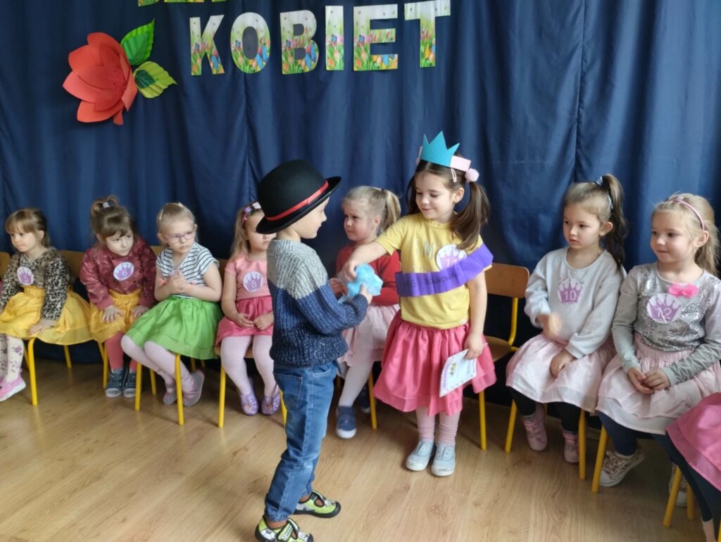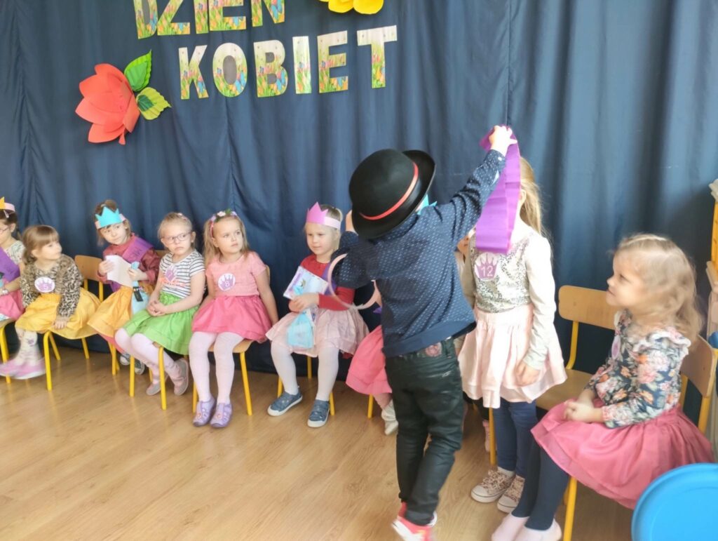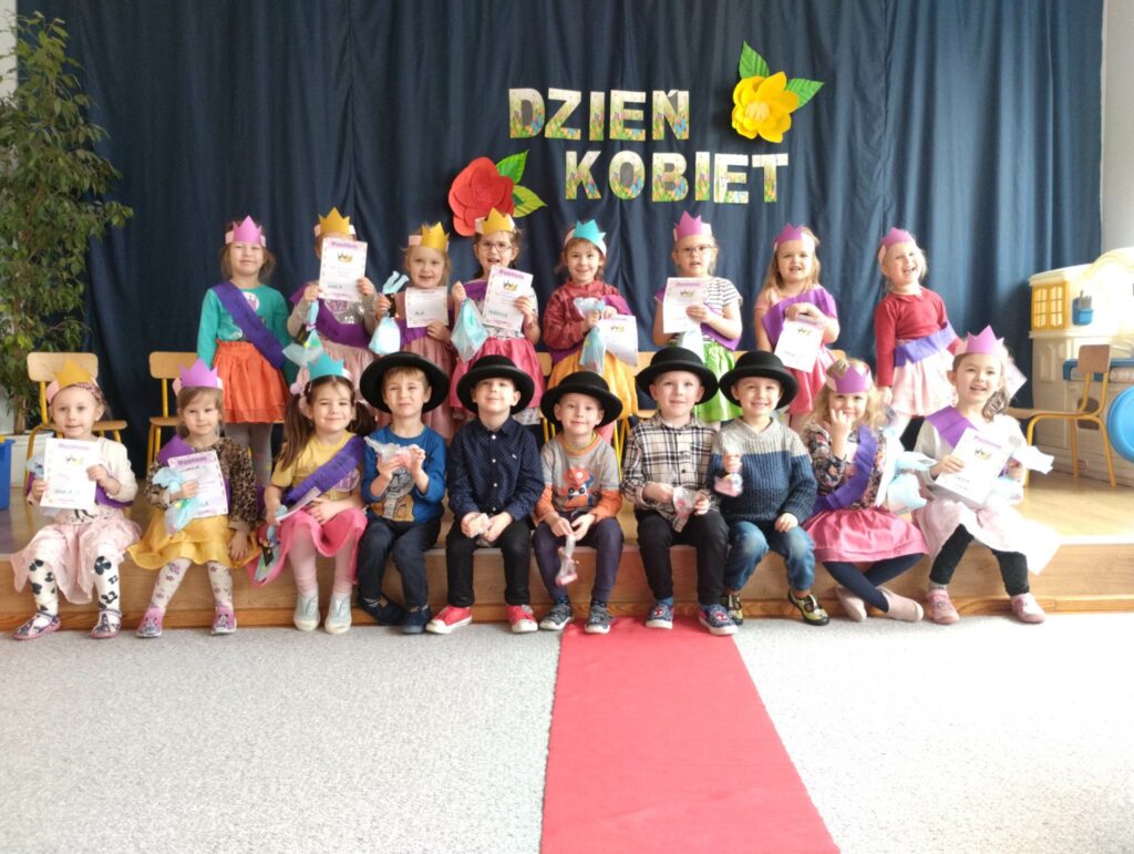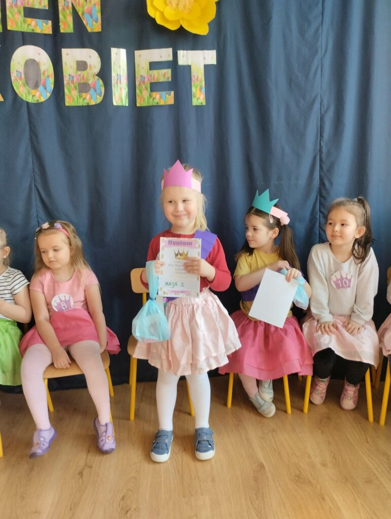 8 marca w naszej grupie był bardzo uroczysty. W Sali pojawił się czerwony dywan po którym z gracją w towarzystwie naszych małych mężczyzn, kroczyły młode damy. Dziewczynki prezentowały swoje wszechstronne umiejętności taneczne, wokalne, matematyczne, zręcznościowe . Chłopcy wraz z Panią Mariolką zasiedli w jury. Każda dziewczynka otrzymała koronę, szarfę i drobny upominek w dziedzinie w której wykazywała się największym zaangażowaniem. Chłopcy mieli trudne zadanie i musieli wykazać się dużą spostrzegawczością za co również zostali wynagrodzeni. Dziękujemy Rodzicom za organizację upominków.