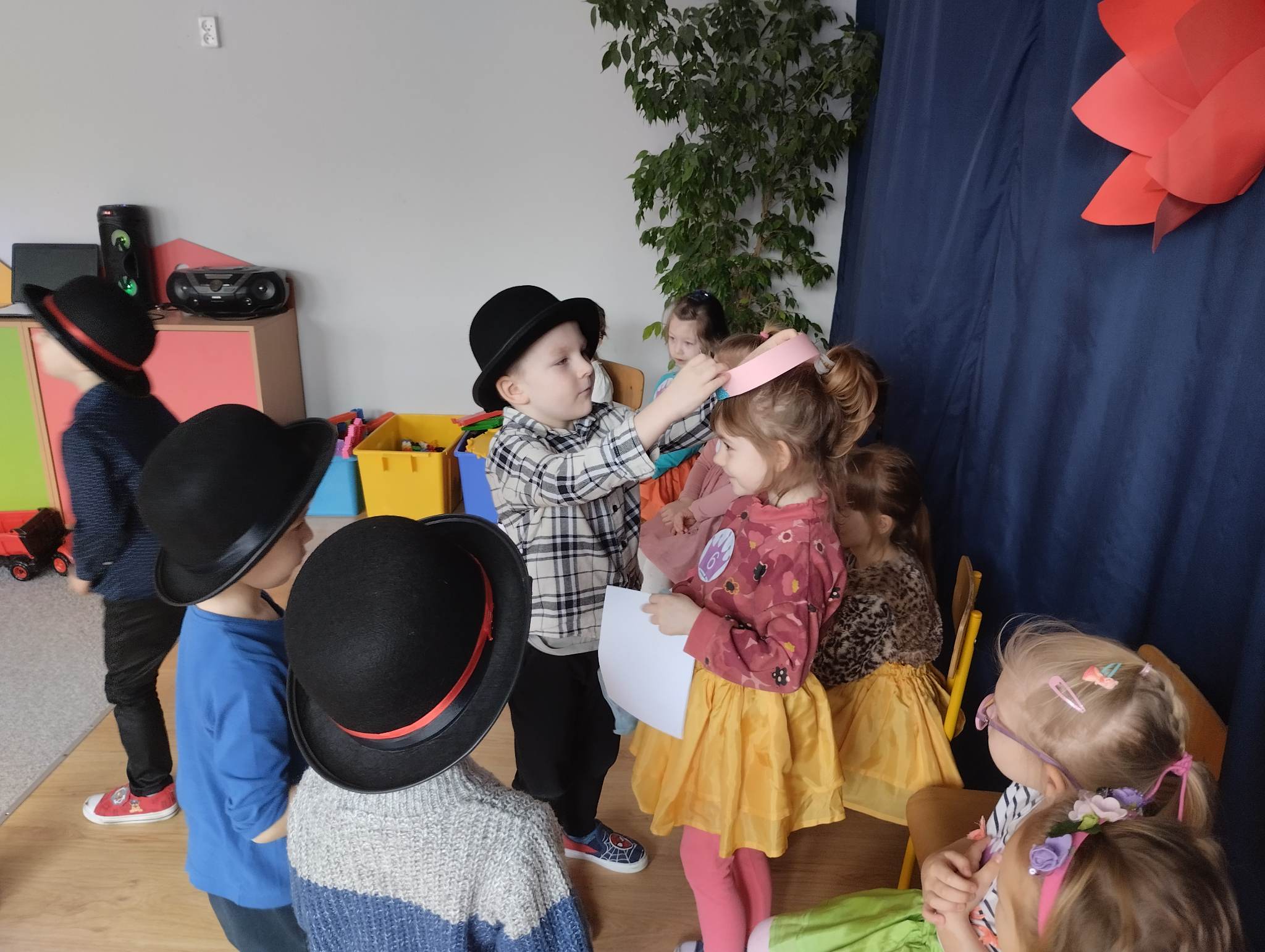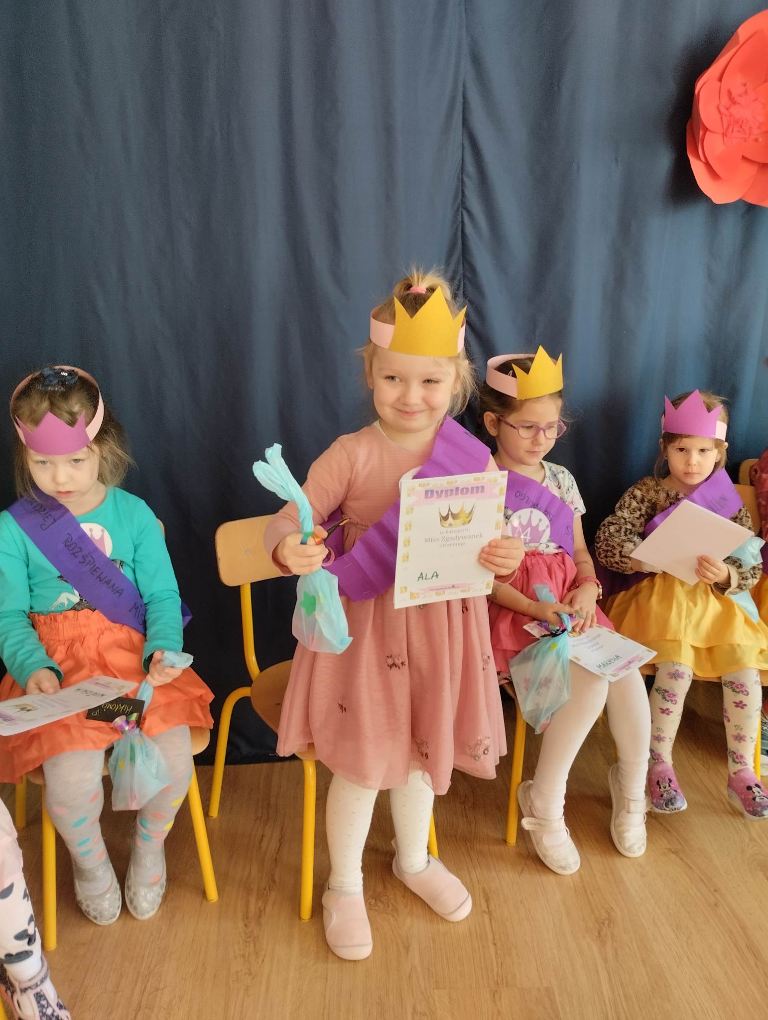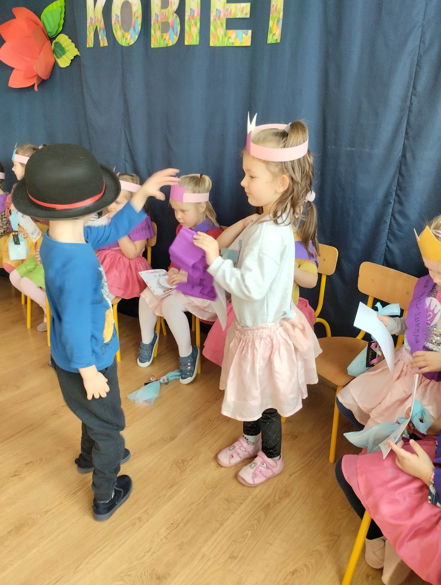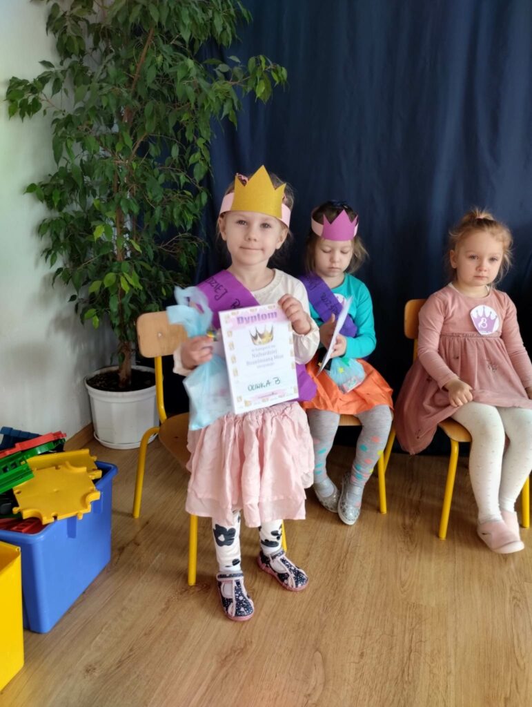 8 marca w naszej grupie był bardzo uroczysty. W Sali pojawił się czerwony dywan po którym z gracją w towarzystwie naszych małych mężczyzn, kroczyły młode damy. Dziewczynki prezentowały swoje wszechstronne umiejętności taneczne, wokalne, matematyczne, zręcznościowe . Chłopcy wraz z Panią Mariolką zasiedli w jury. Każda dziewczynka otrzymała koronę, szarfę i drobny upominek w dziedzinie w której wykazywała się największym zaangażowaniem. Chłopcy mieli trudne zadanie i musieli wykazać się dużą spostrzegawczością za co również zostali wynagrodzeni. Dziękujemy Rodzicom za organizację upominków.