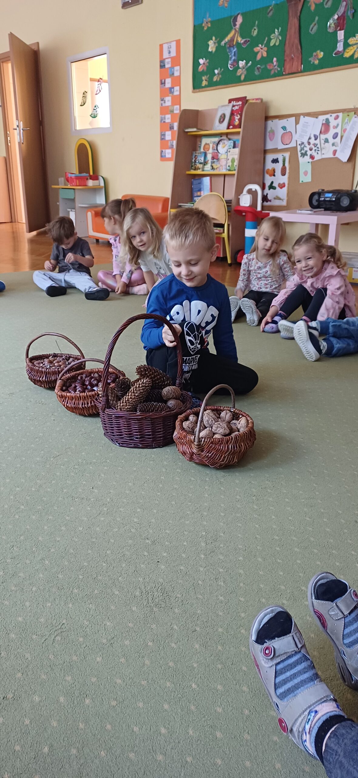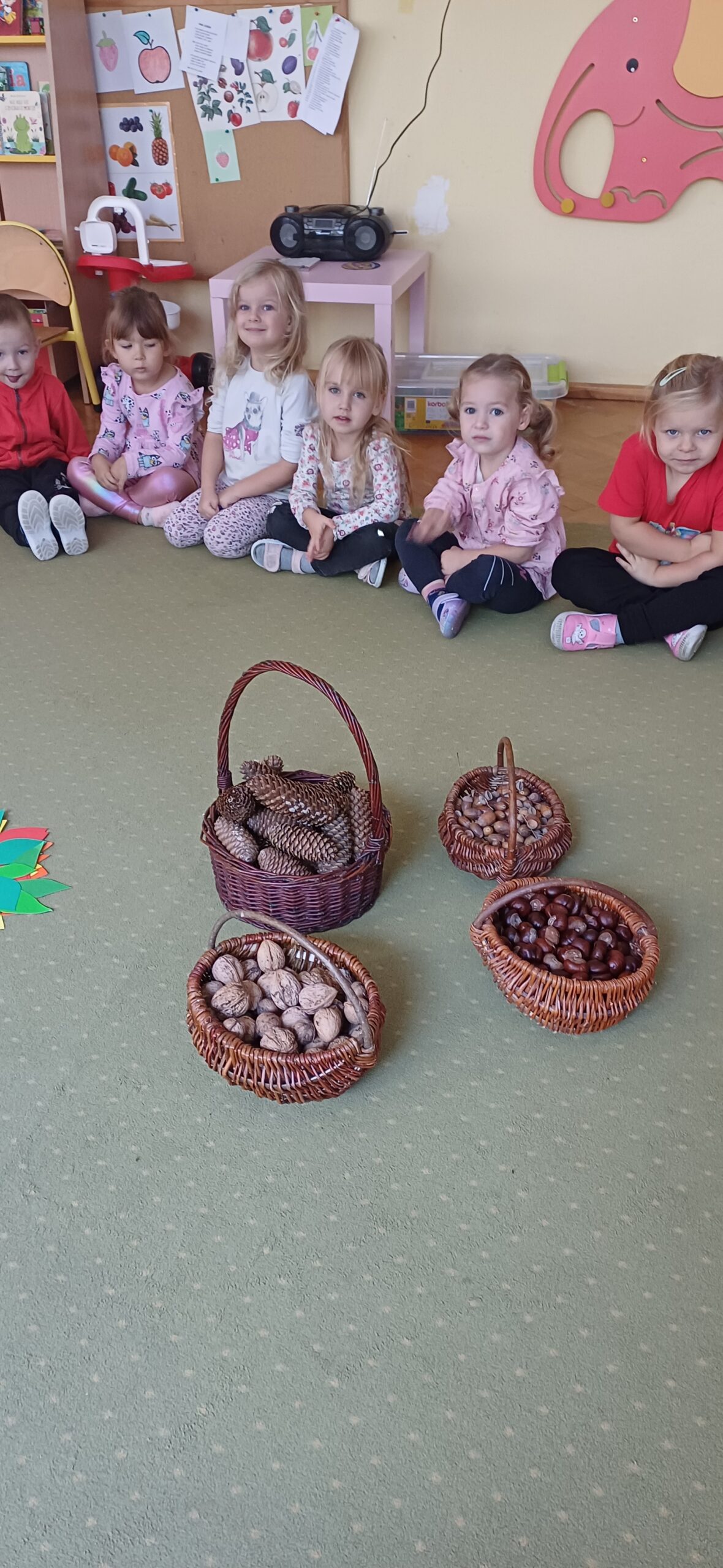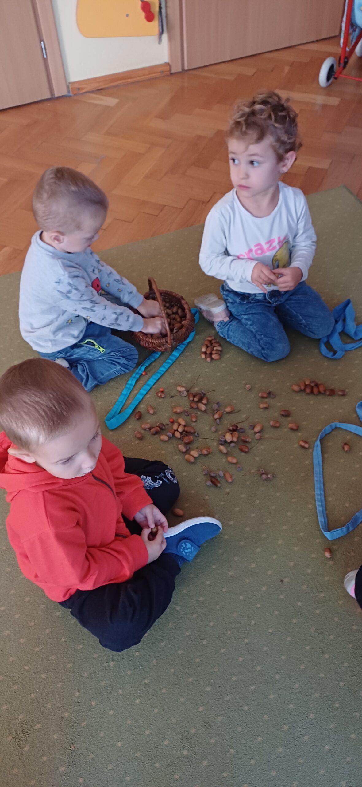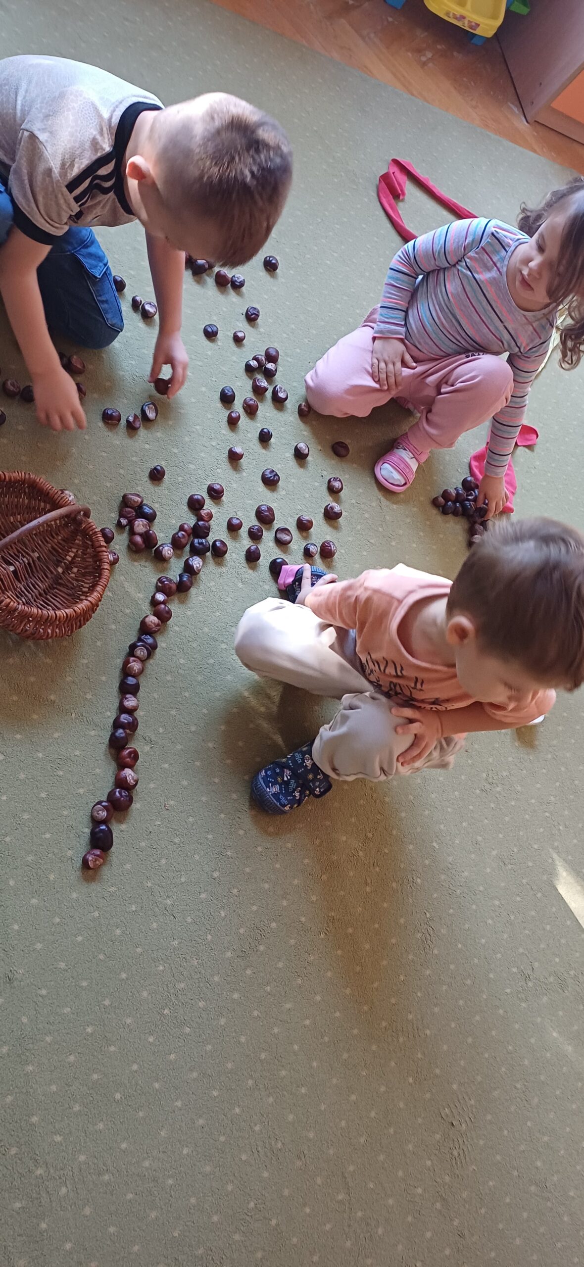 Jesień przynosi dużo darów, które często wykorzystujemy do różnych zabaw. Możemy z nich segregować, rozpoznawać kolory, liczyć i układać różne kompozycje.