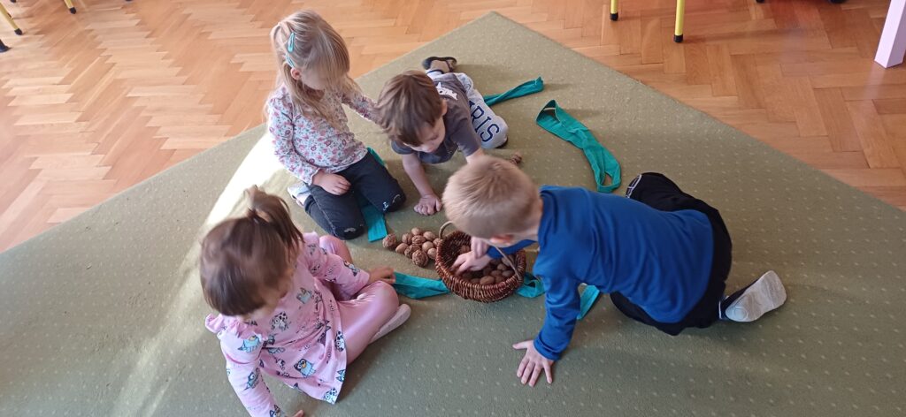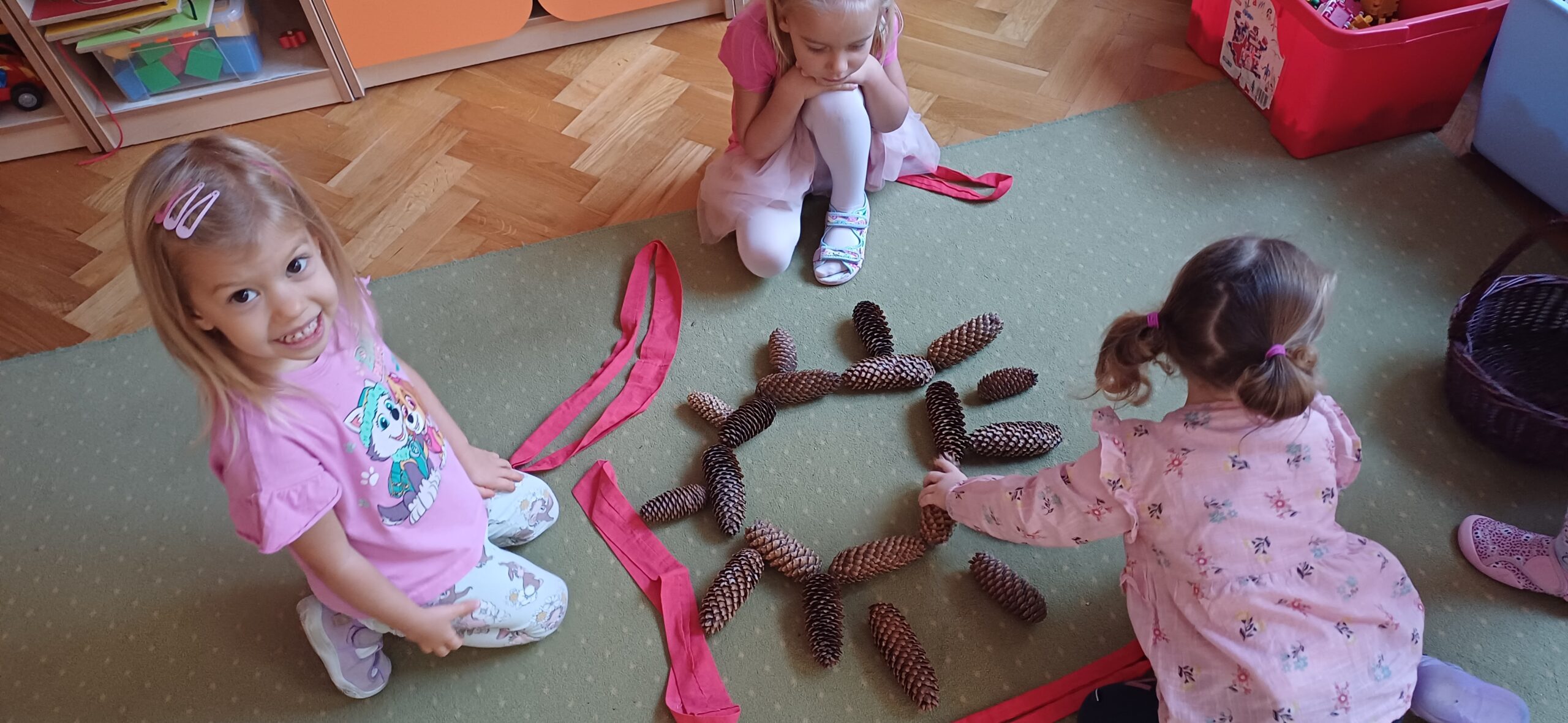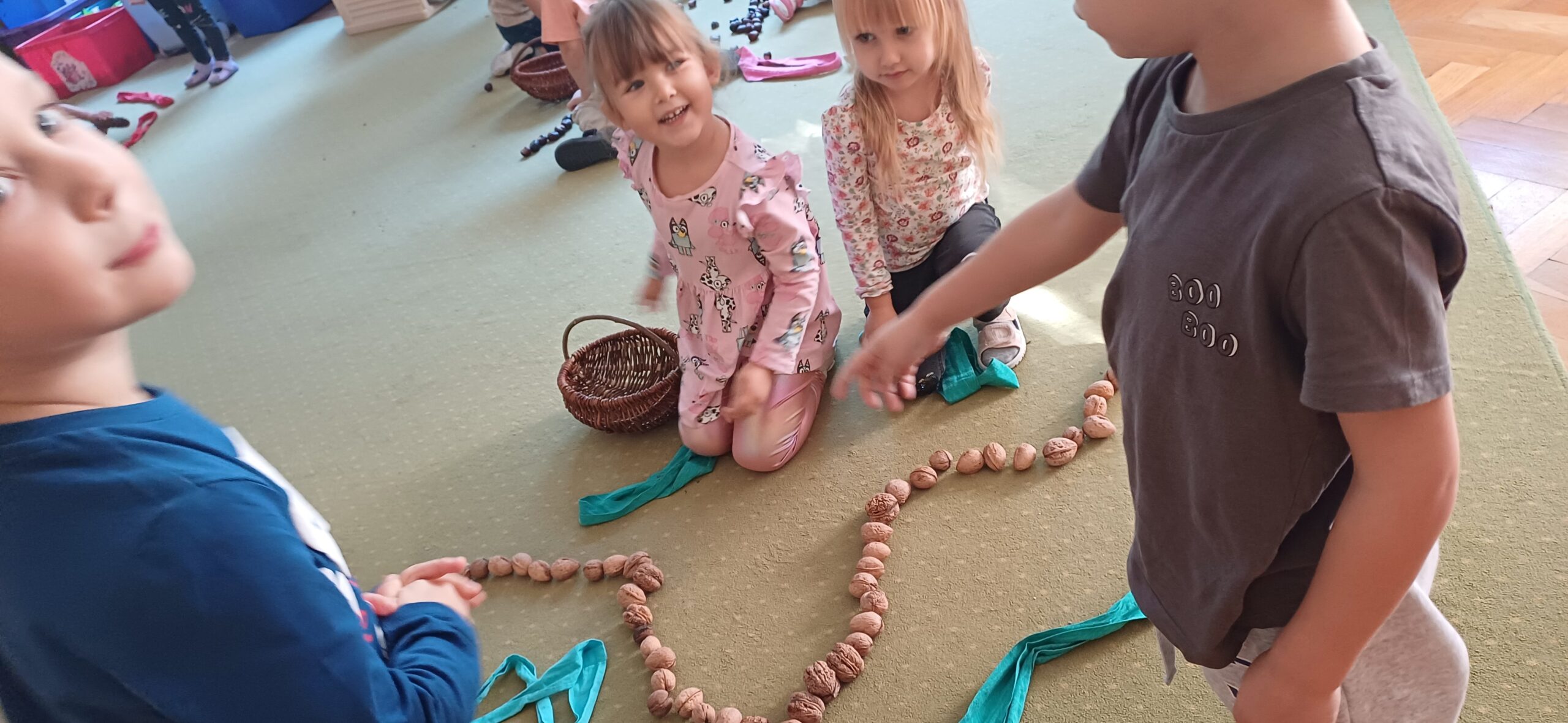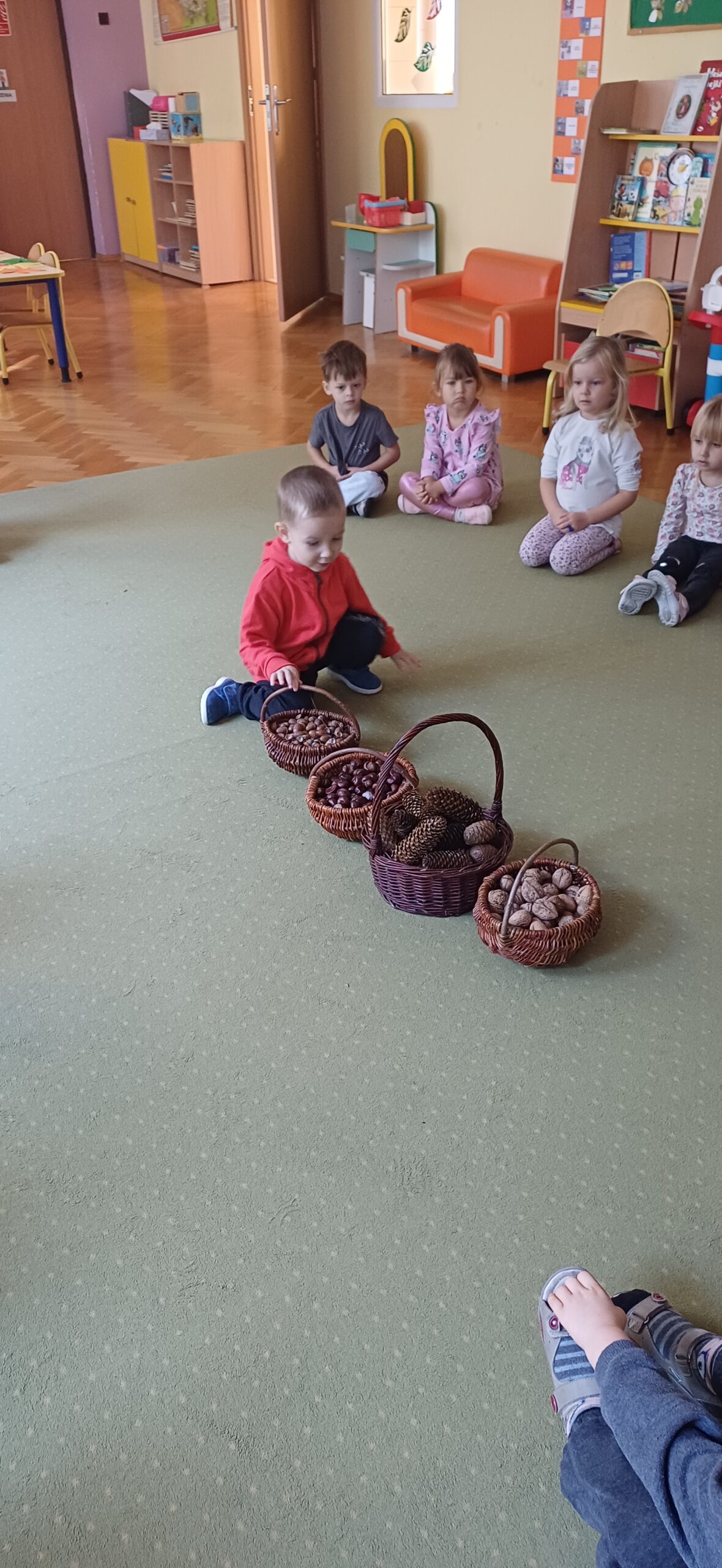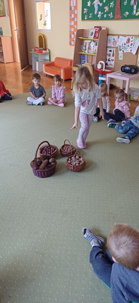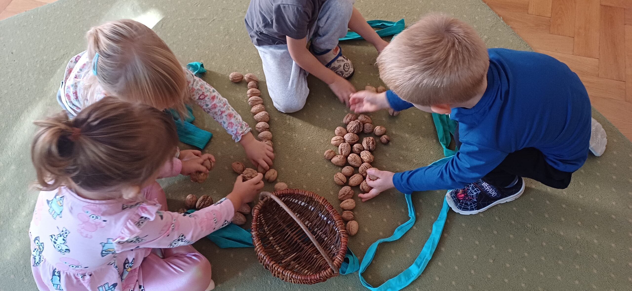 Jesień przynosi dużo darów, które często wykorzystujemy do różnych zabaw. Możemy z nich segregować, rozpoznawać kolory, liczyć i układać różne kompozycje.