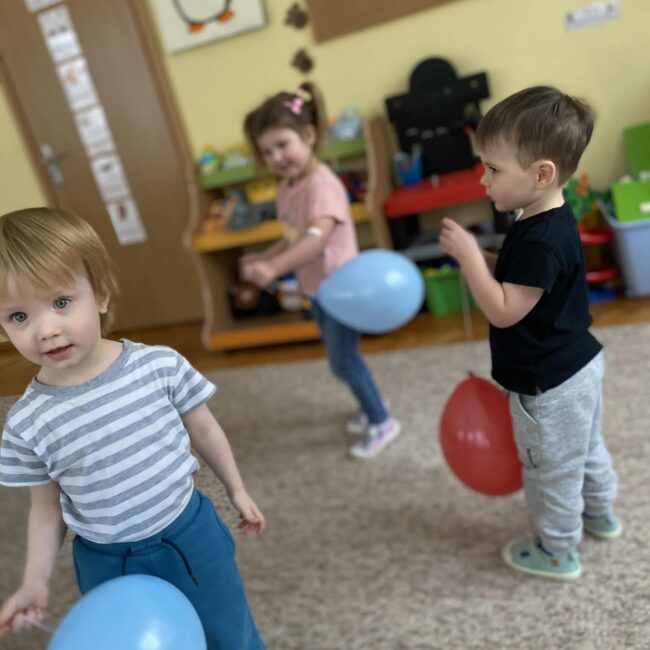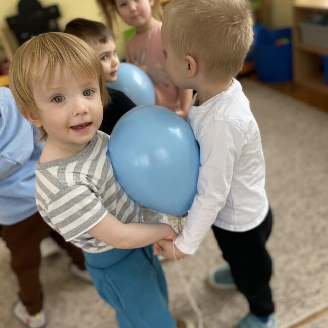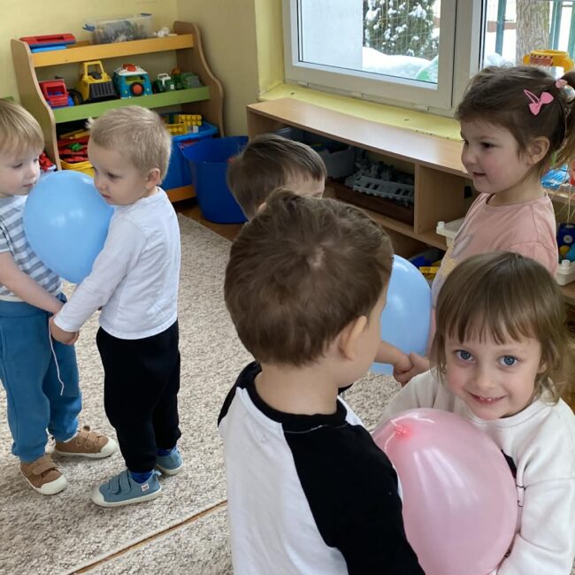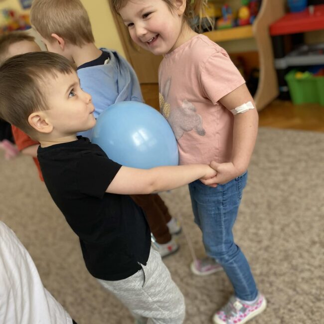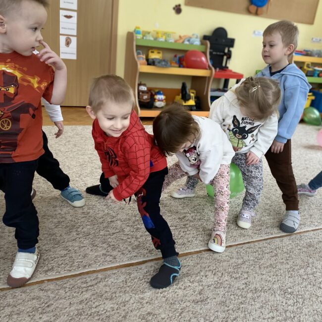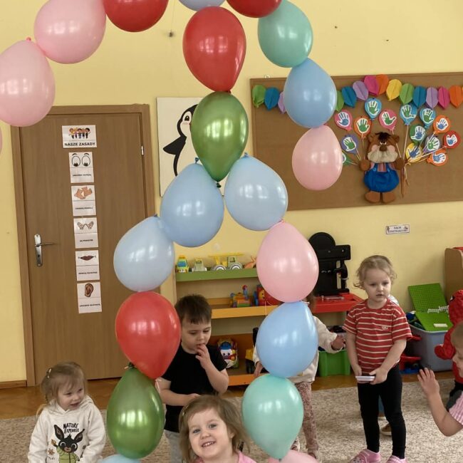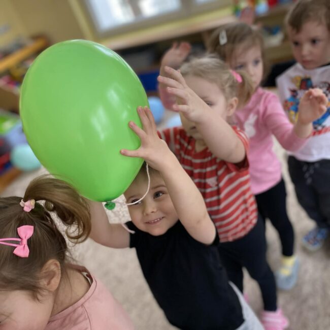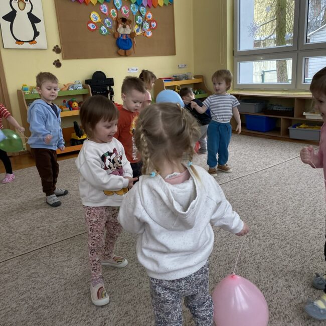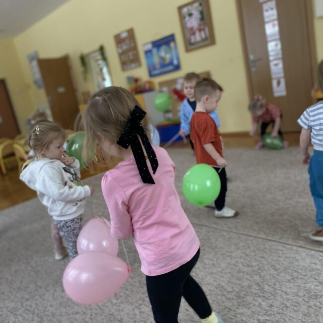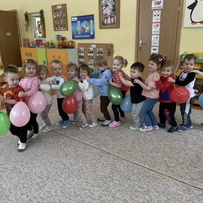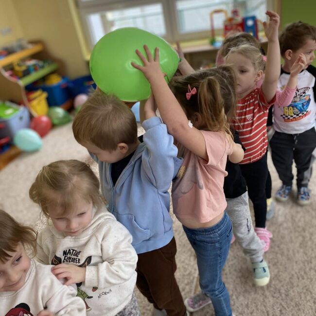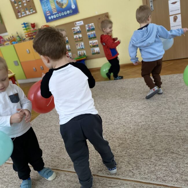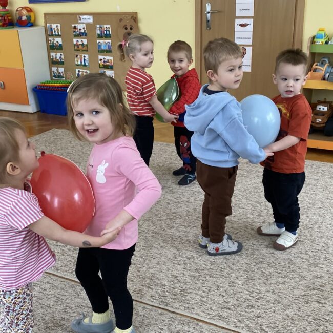 Balony stały się głównymi bohaterami dnia – od kolorowych dekoracji, po rekwizyty w emocjonujących konkurencjach. Przedszkolaki brały udział w slalomach, próbowały utrzymać balony w powietrzu siłą oddechu i tańczyły w parach, dbając o to, by ich kolorowy rekwizyt nie upadł na ziemię. Energia karnawału i balony wypełniły naszą salę po same brzegi! Działania rozwijały motorykę dużą oraz koordynację wzrokowo-ruchową poprzez zabawy zręcznościowe.