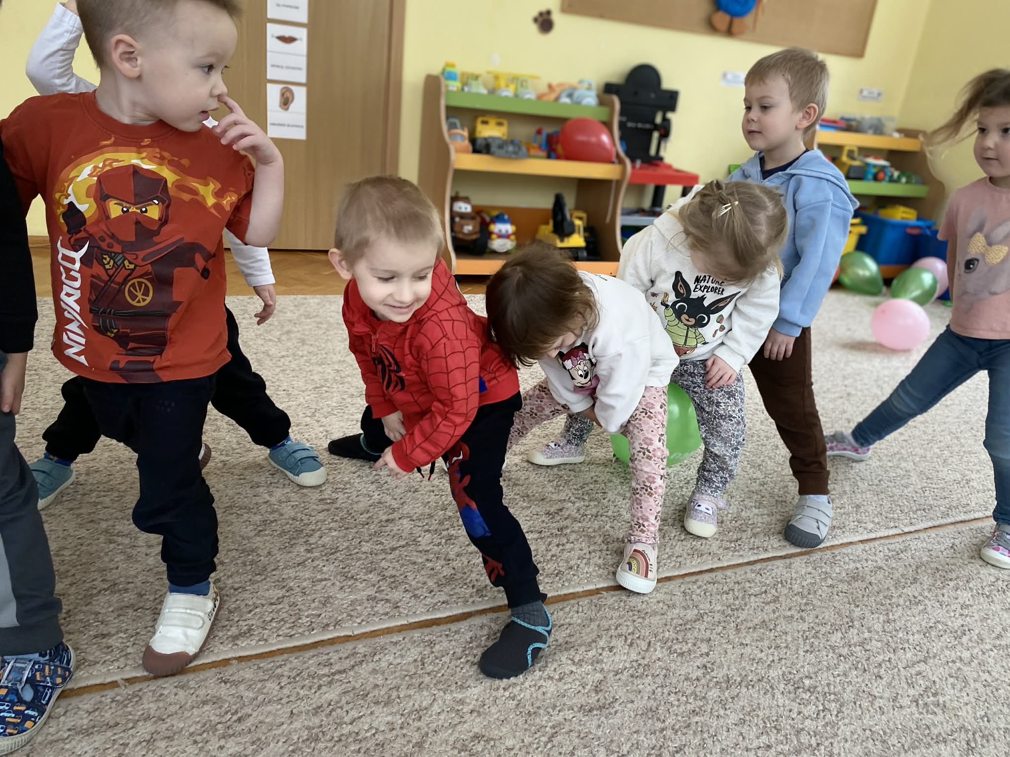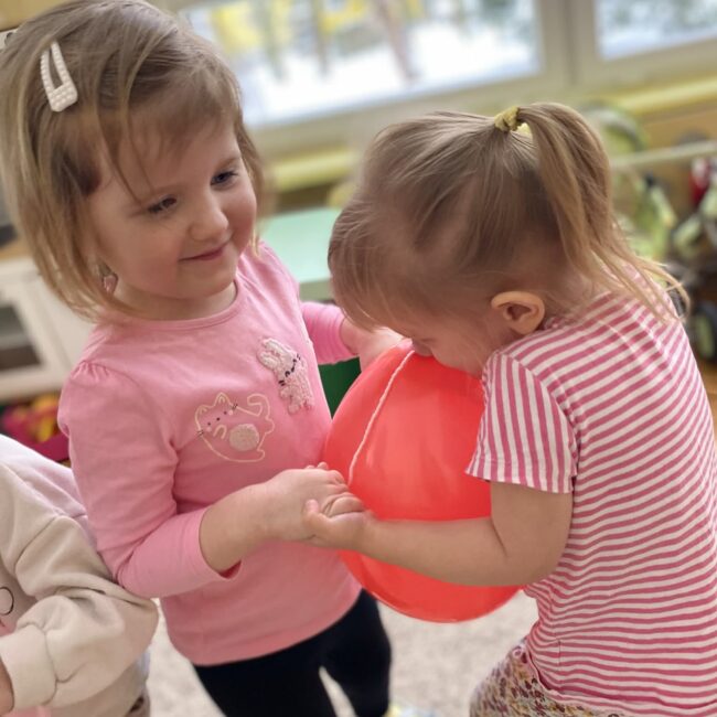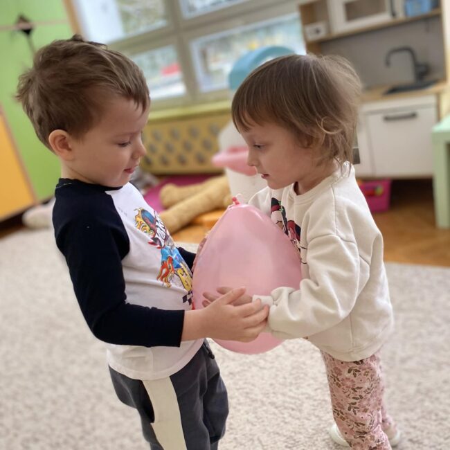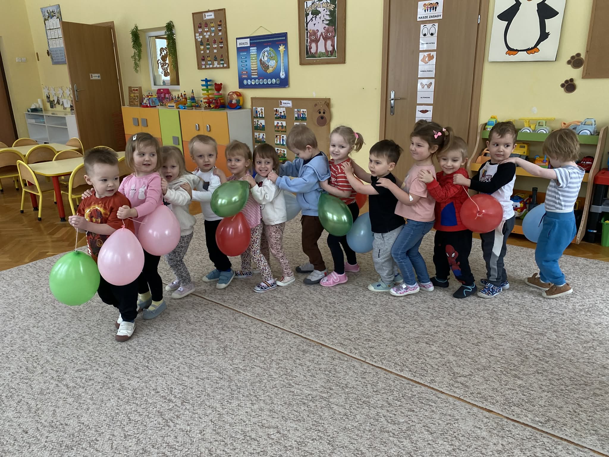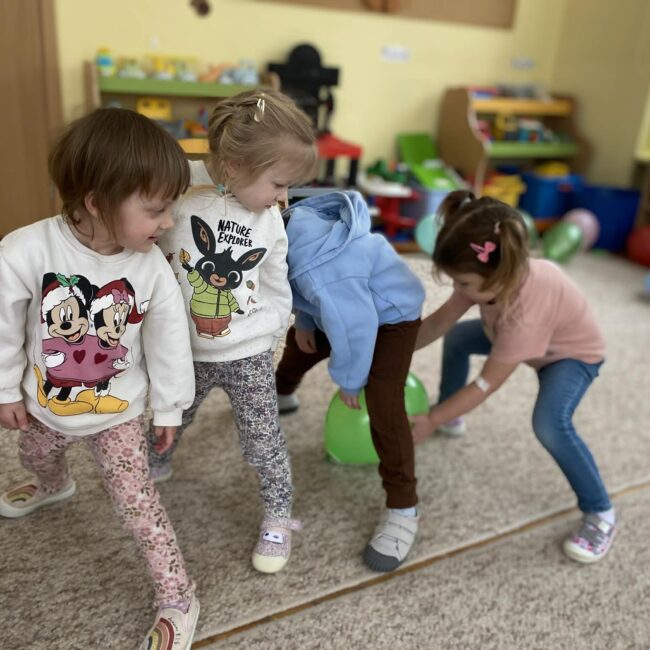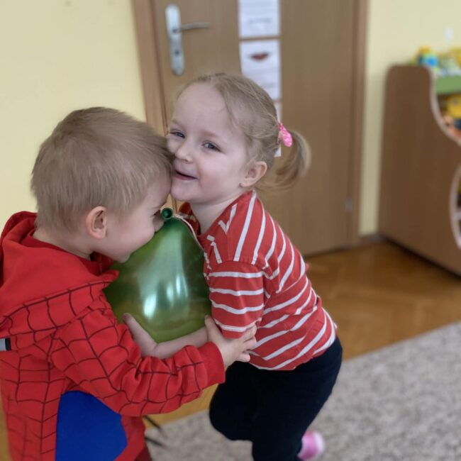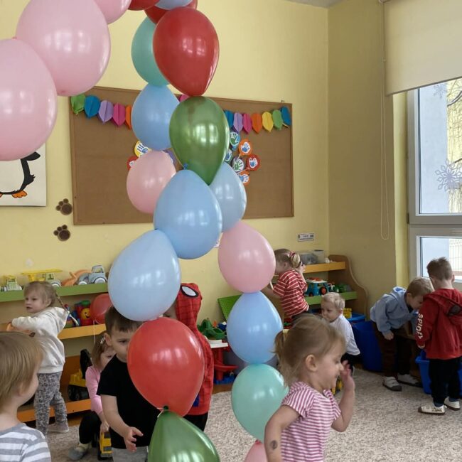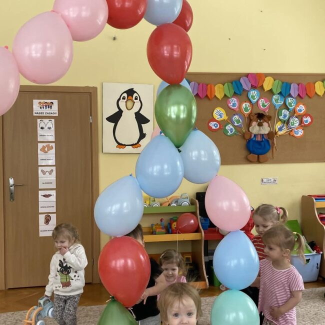 Balony stały się głównymi bohaterami dnia – od kolorowych dekoracji, po rekwizyty w emocjonujących konkurencjach. Przedszkolaki brały udział w slalomach, próbowały utrzymać balony w powietrzu siłą oddechu i tańczyły w parach, dbając o to, by ich kolorowy rekwizyt nie upadł na ziemię. Energia karnawału i balony wypełniły naszą salę po same brzegi! Działania rozwijały motorykę dużą oraz koordynację wzrokowo-ruchową poprzez zabawy zręcznościowe.