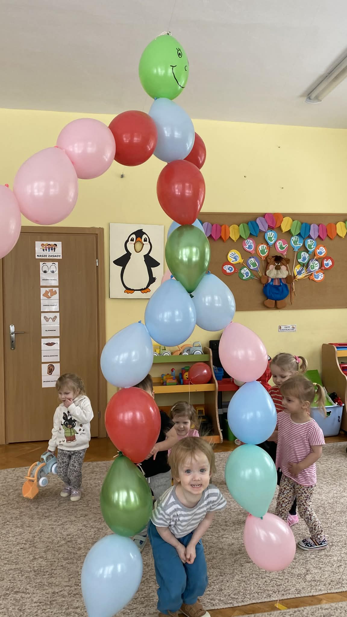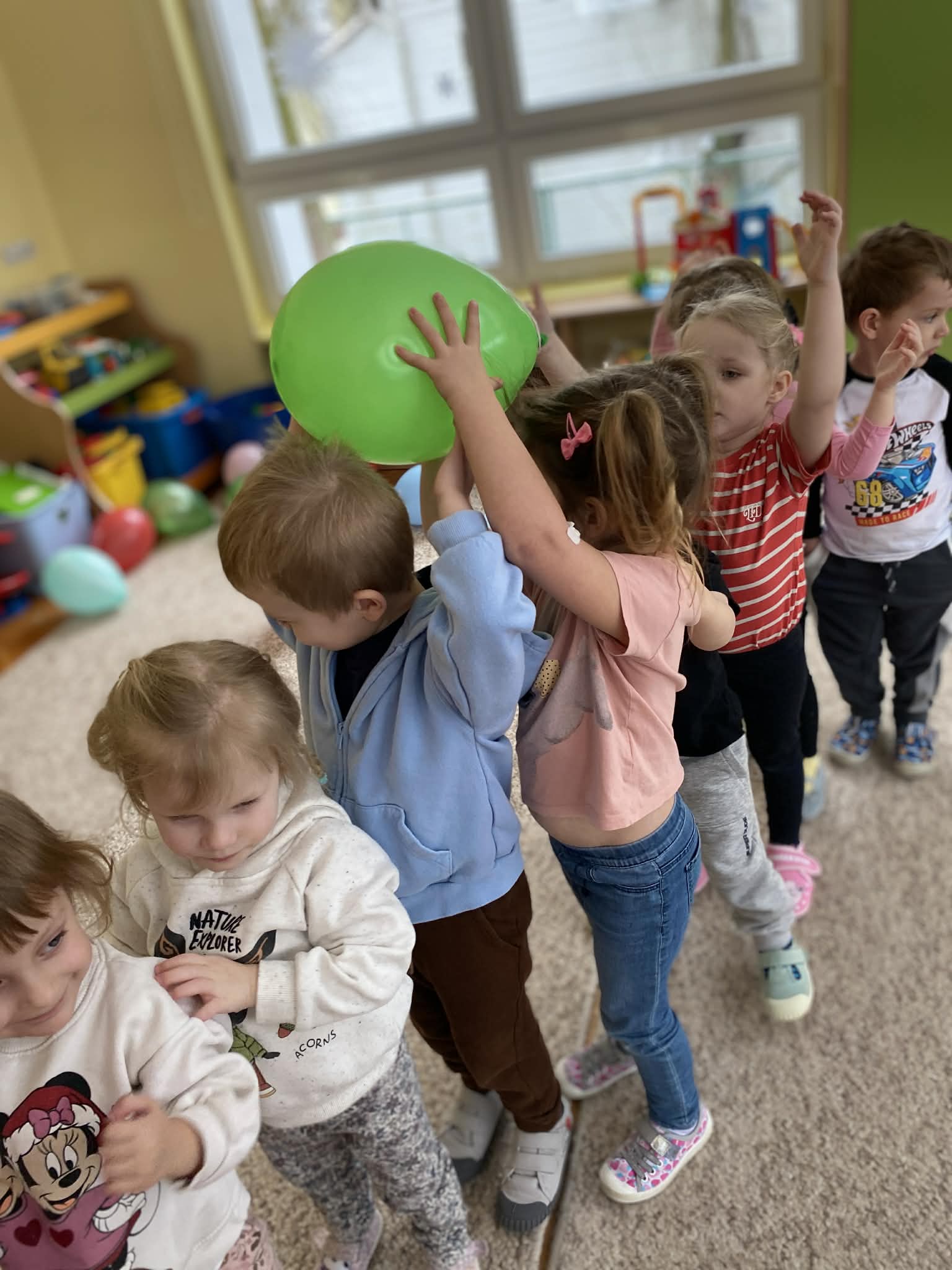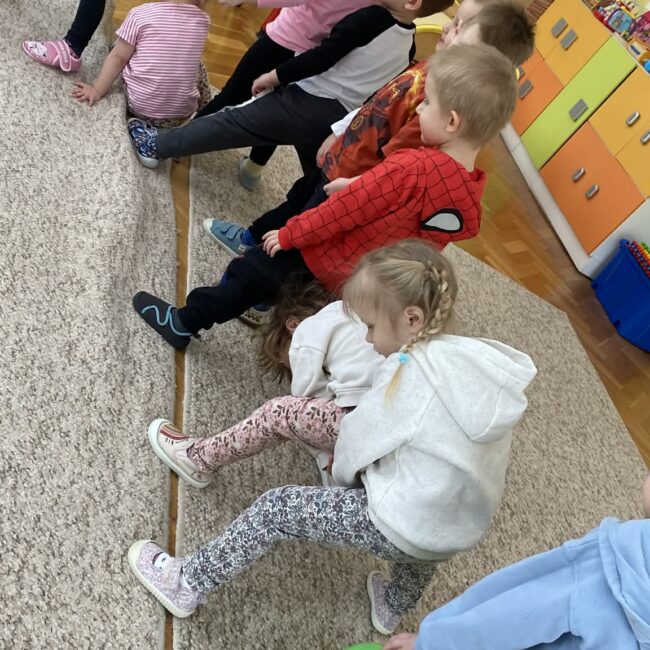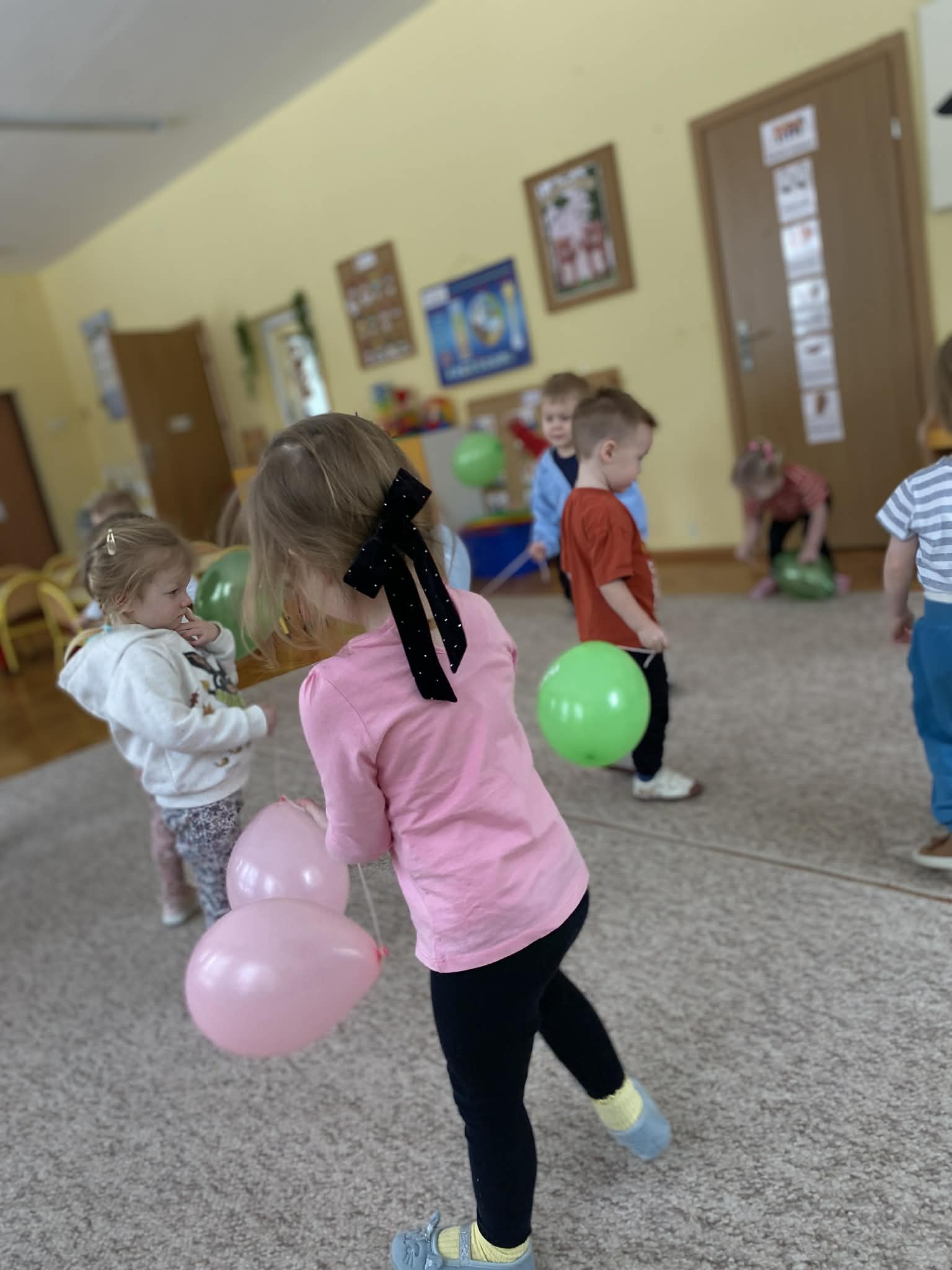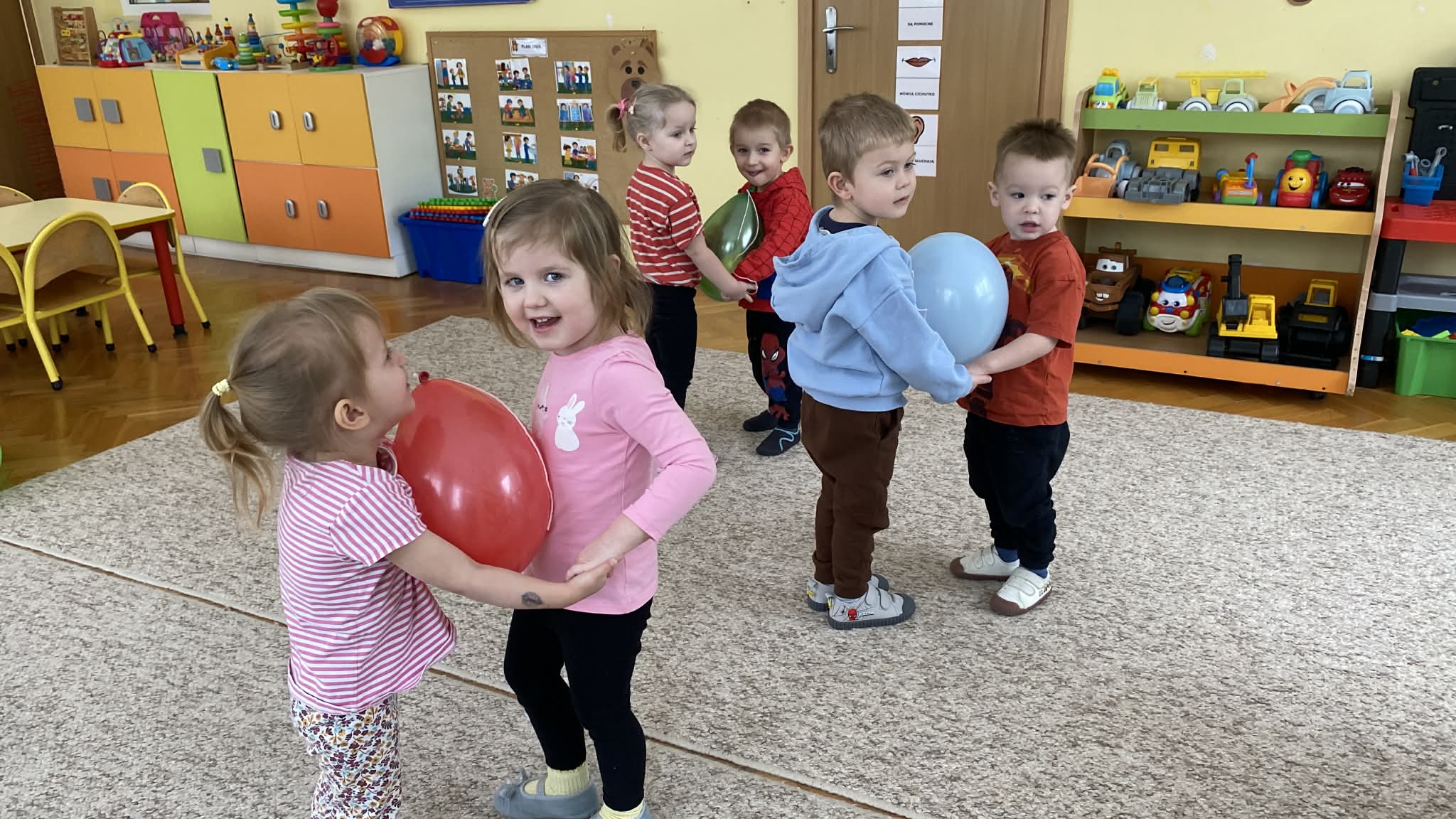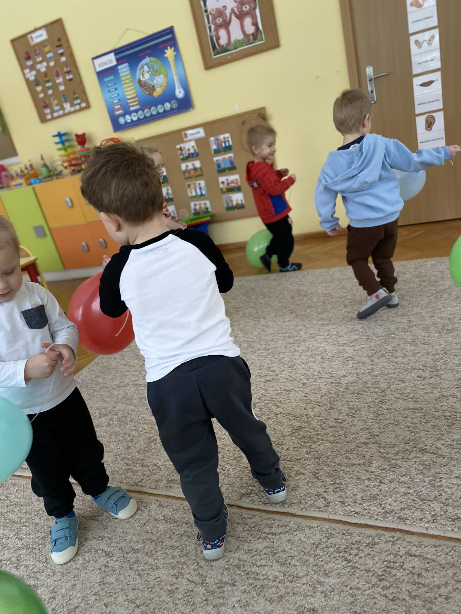 Balony stały się głównymi bohaterami dnia – od kolorowych dekoracji, po rekwizyty w emocjonujących konkurencjach. Przedszkolaki brały udział w slalomach, próbowały utrzymać balony w powietrzu siłą oddechu i tańczyły w parach, dbając o to, by ich kolorowy rekwizyt nie upadł na ziemię. Energia karnawału i balony wypełniły naszą salę po same brzegi! Działania rozwijały motorykę dużą oraz koordynację wzrokowo-ruchową poprzez zabawy zręcznościowe.