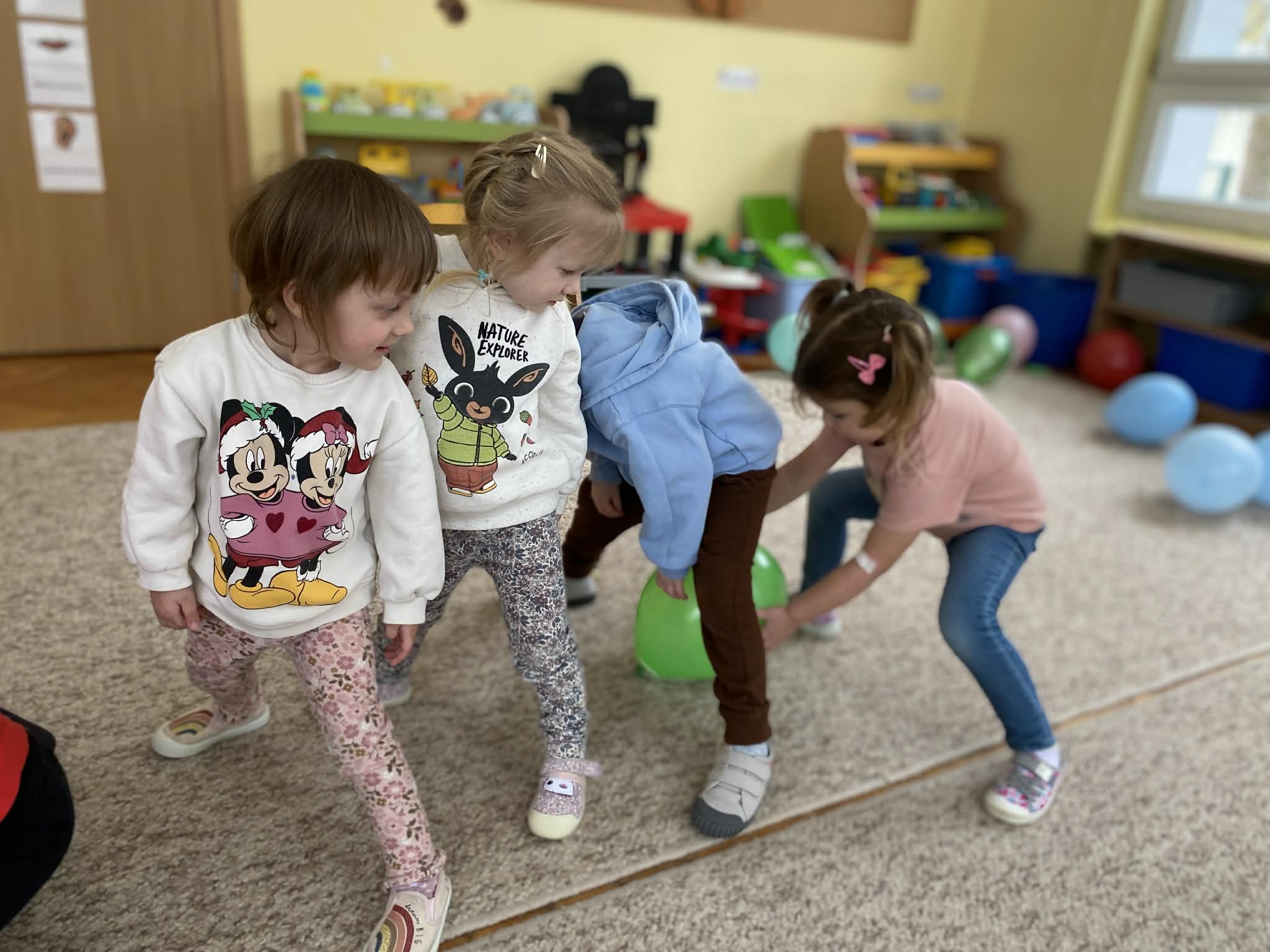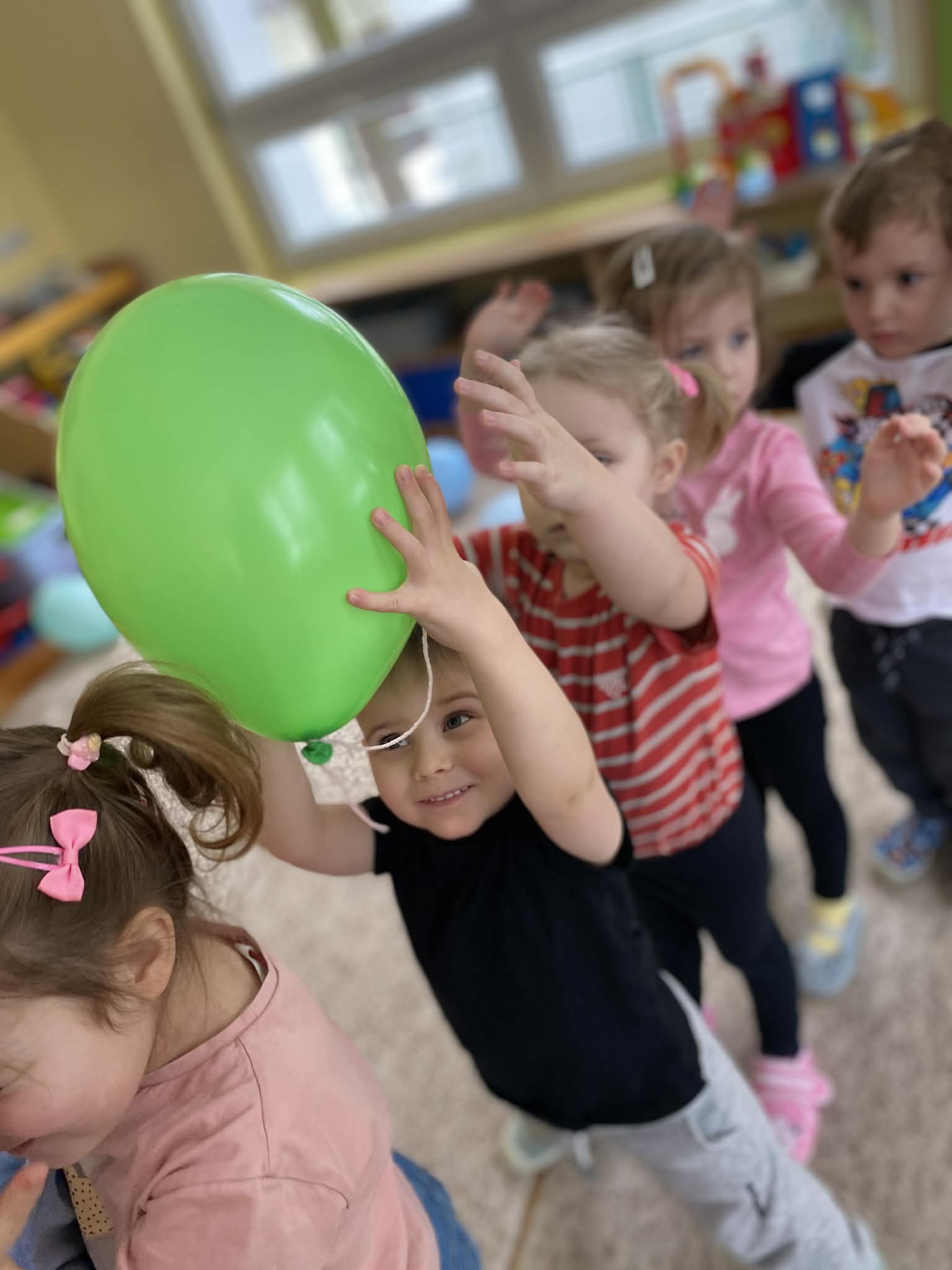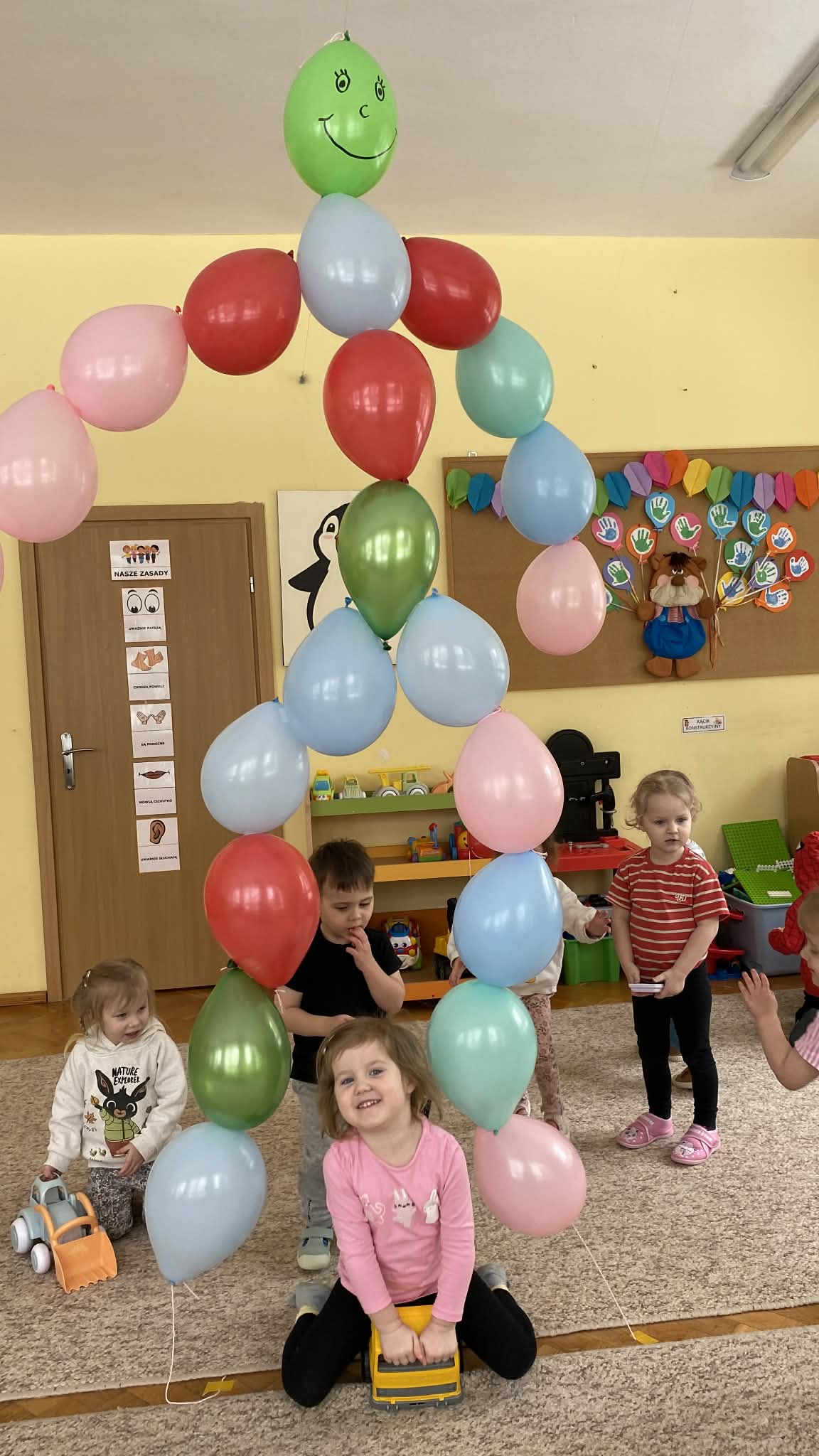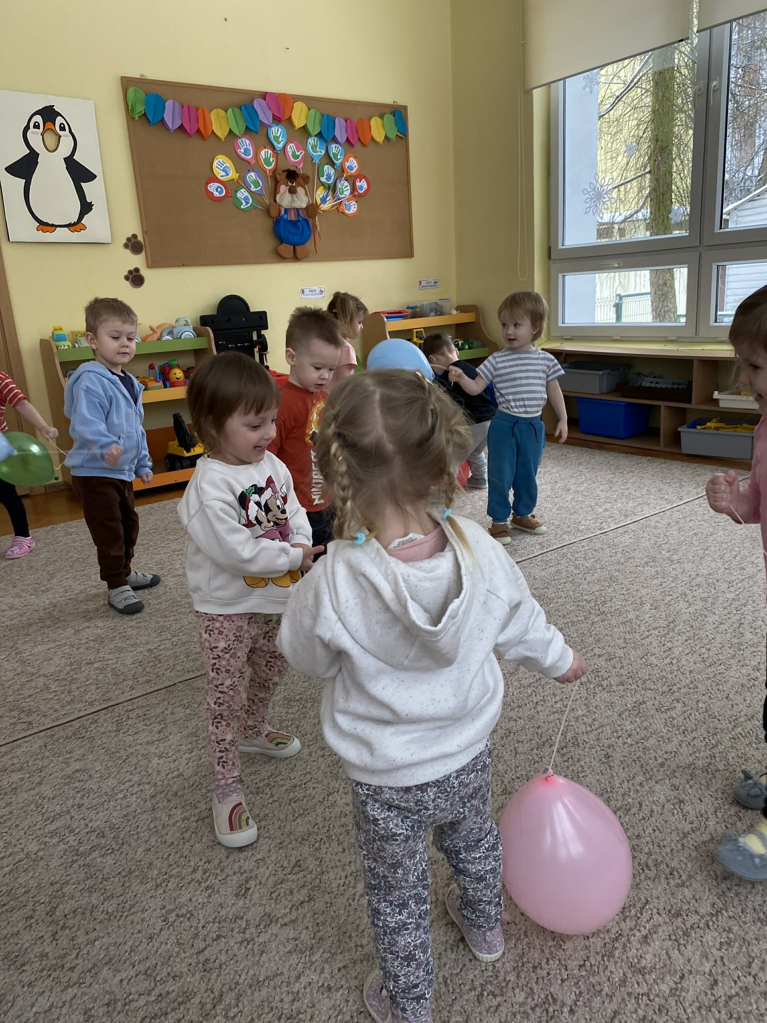Balony stały się głównymi bohaterami dnia – od kolorowych dekoracji, po rekwizyty w emocjonujących konkurencjach. Przedszkolaki brały udział w slalomach, próbowały utrzymać balony w powietrzu siłą oddechu i tańczyły w parach, dbając o to, by ich kolorowy rekwizyt nie upadł na ziemię. Energia karnawału i balony wypełniły naszą salę po same brzegi! Działania rozwijały motorykę dużą oraz koordynację wzrokowo-ruchową poprzez zabawy zręcznościowe.