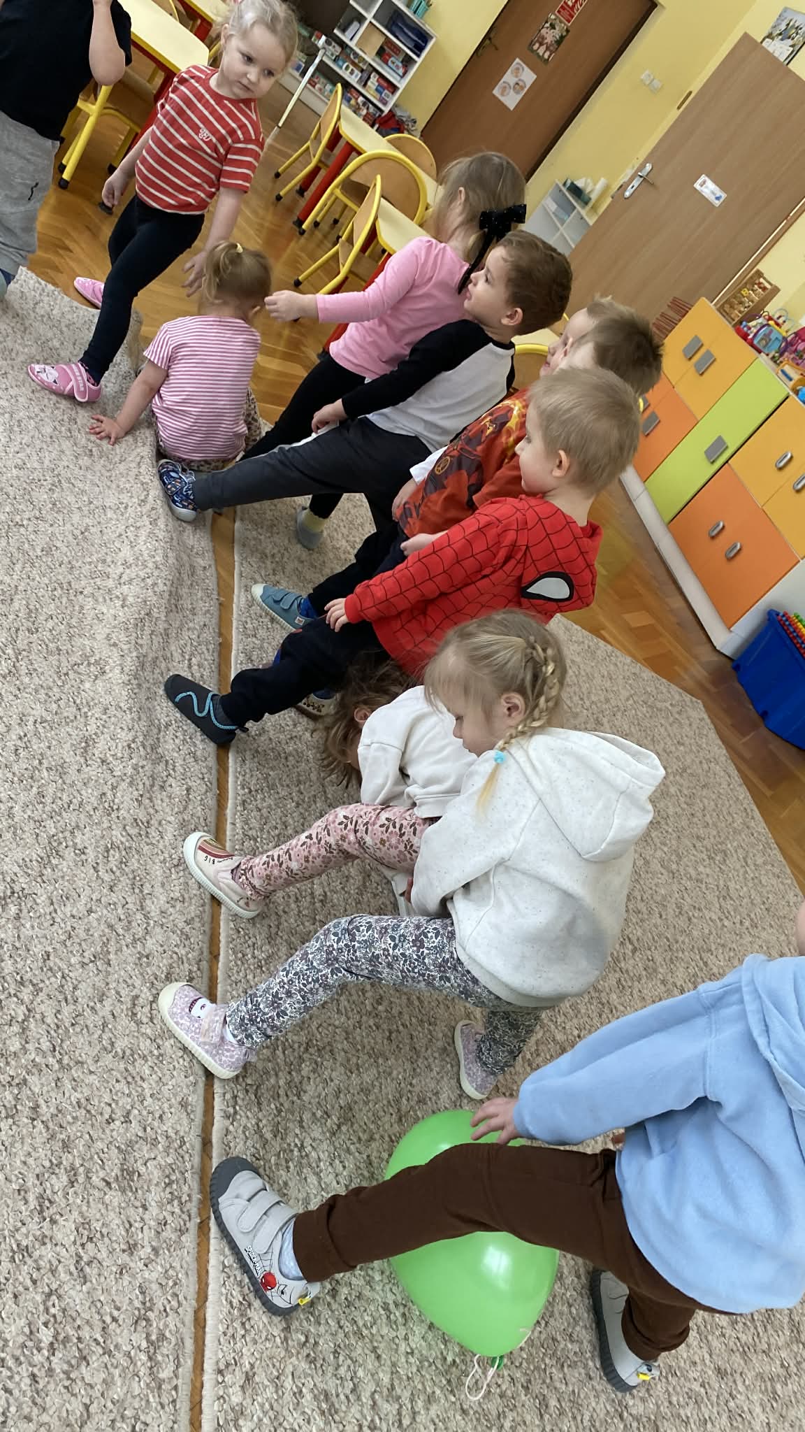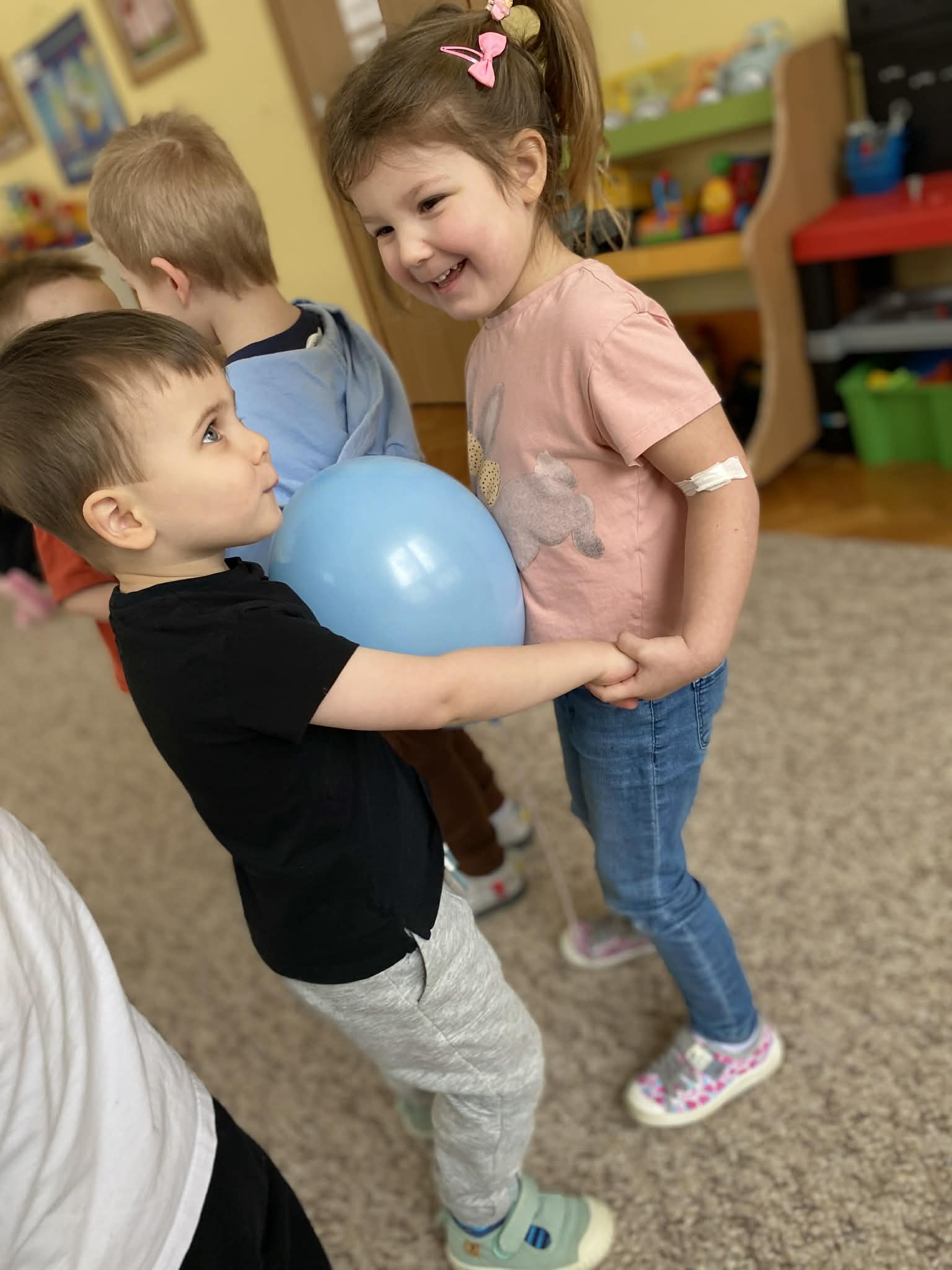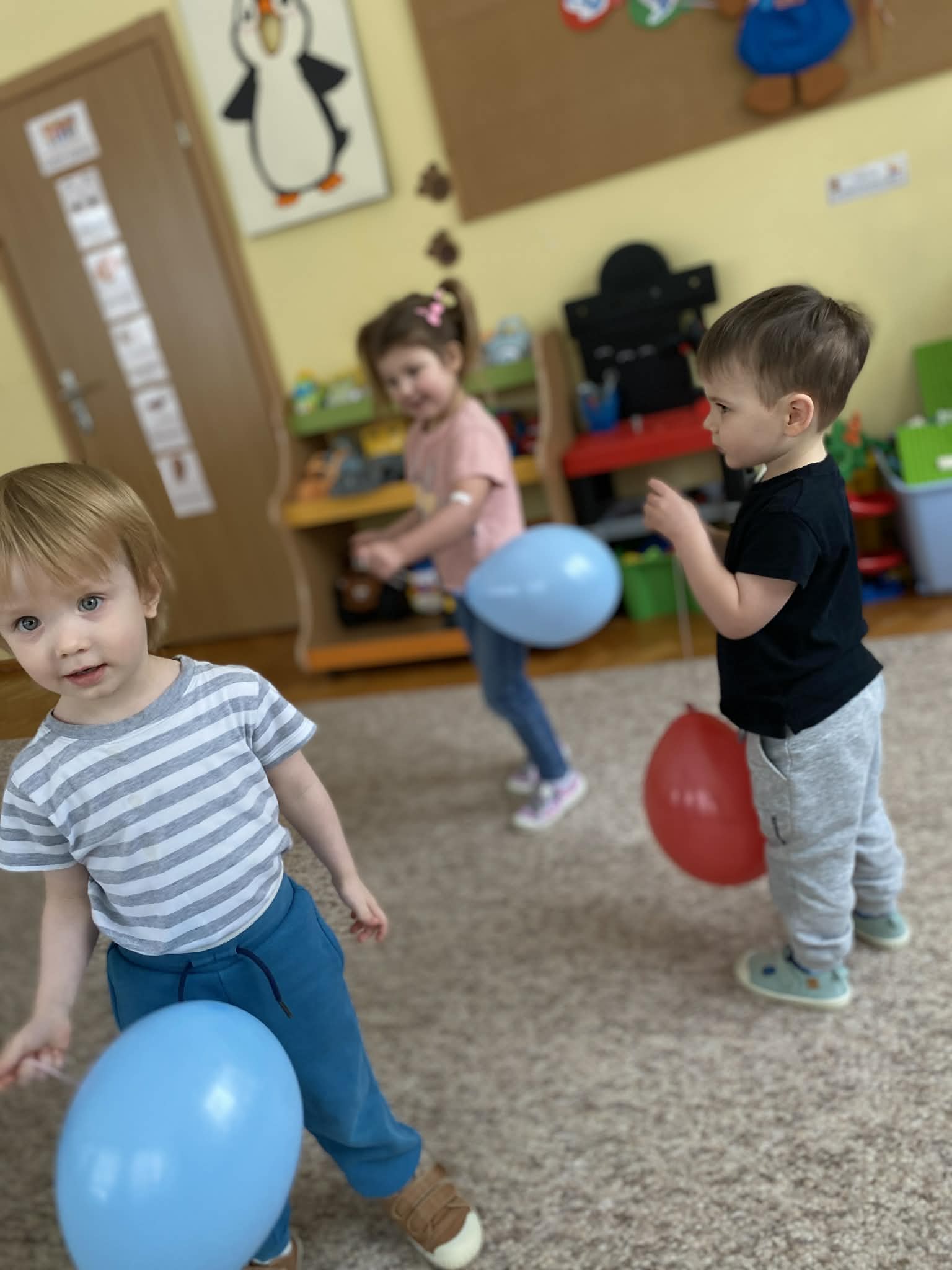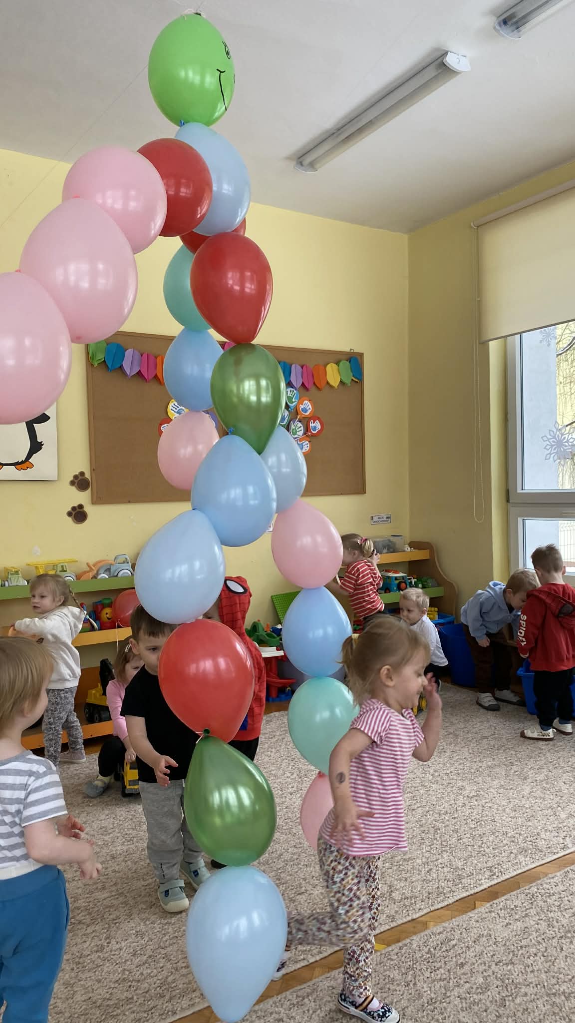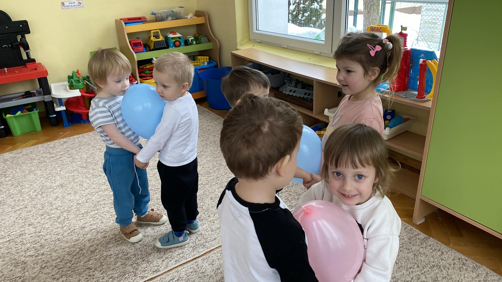 Balony stały się głównymi bohaterami dnia – od kolorowych dekoracji, po rekwizyty w emocjonujących konkurencjach. Przedszkolaki brały udział w slalomach, próbowały utrzymać balony w powietrzu siłą oddechu i tańczyły w parach, dbając o to, by ich kolorowy rekwizyt nie upadł na ziemię. Energia karnawału i balony wypełniły naszą salę po same brzegi! Działania rozwijały motorykę dużą oraz koordynację wzrokowo-ruchową poprzez zabawy zręcznościowe.