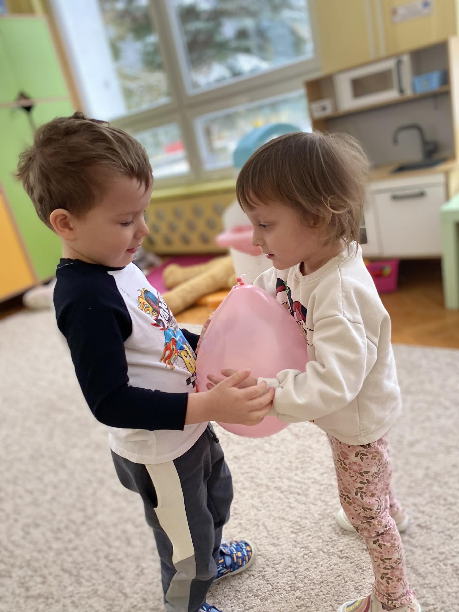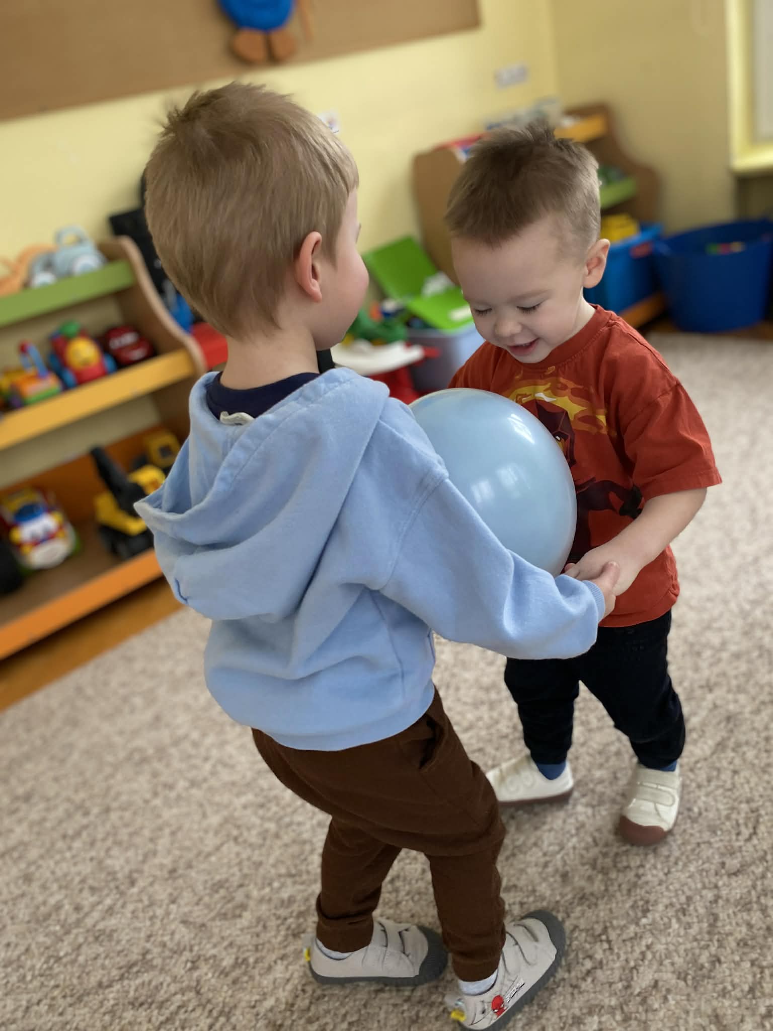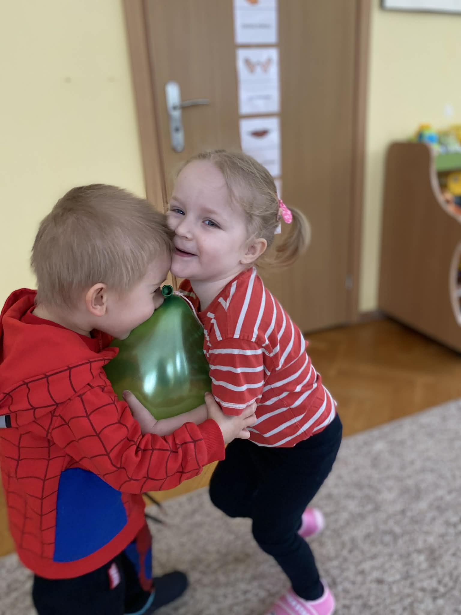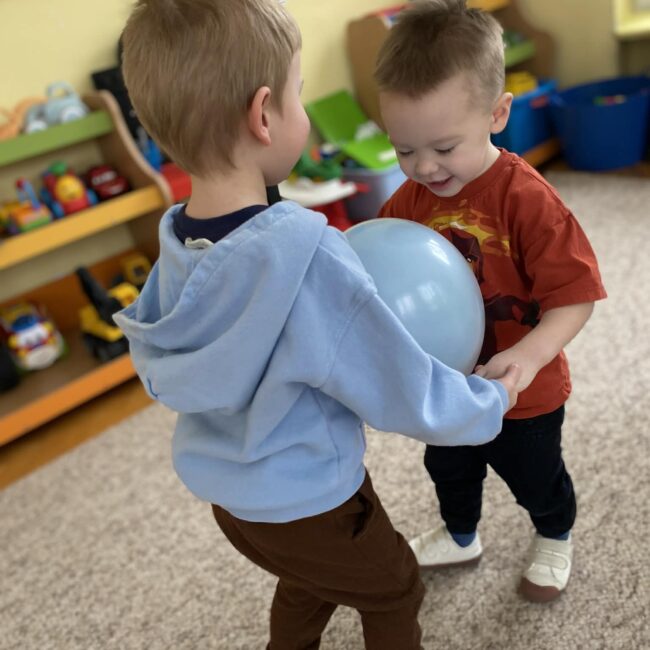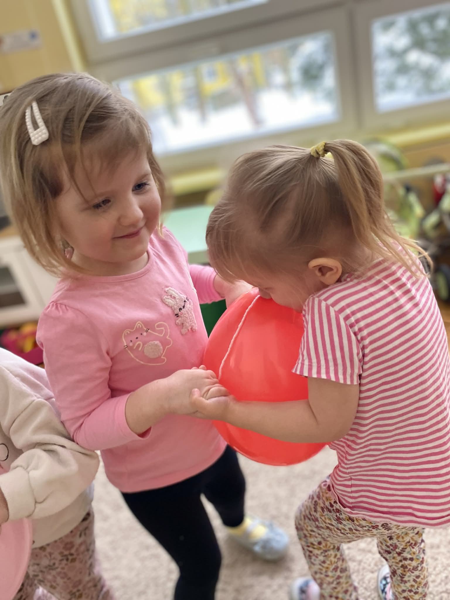 Balony stały się głównymi bohaterami dnia – od kolorowych dekoracji, po rekwizyty w emocjonujących konkurencjach. Przedszkolaki brały udział w slalomach, próbowały utrzymać balony w powietrzu siłą oddechu i tańczyły w parach, dbając o to, by ich kolorowy rekwizyt nie upadł na ziemię. Energia karnawału i balony wypełniły naszą salę po same brzegi! Działania rozwijały motorykę dużą oraz koordynację wzrokowo-ruchową poprzez zabawy zręcznościowe.