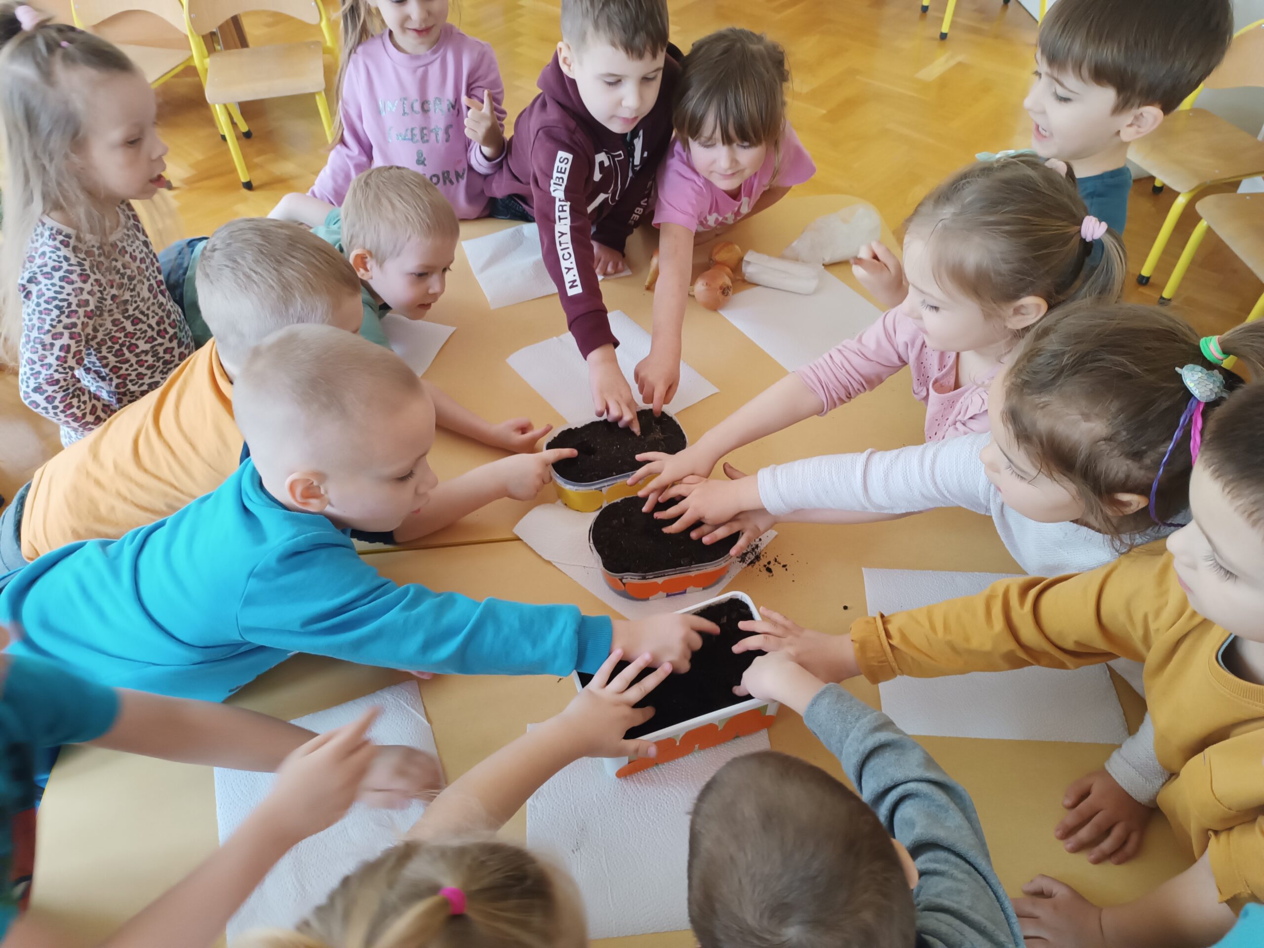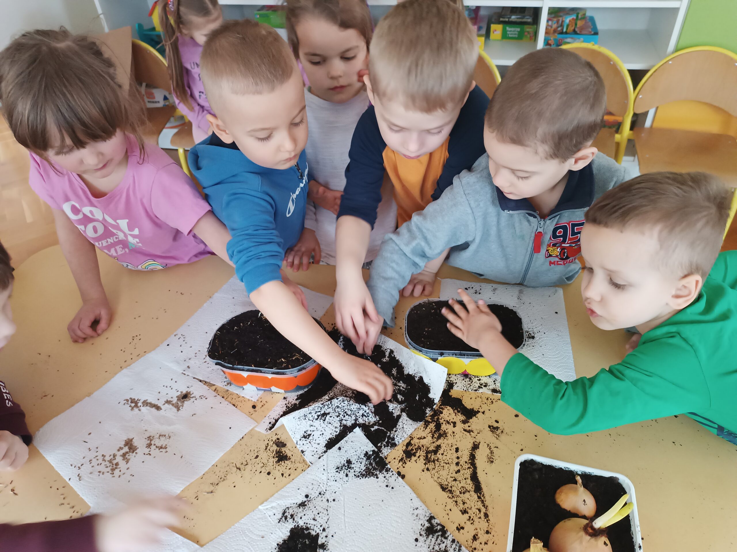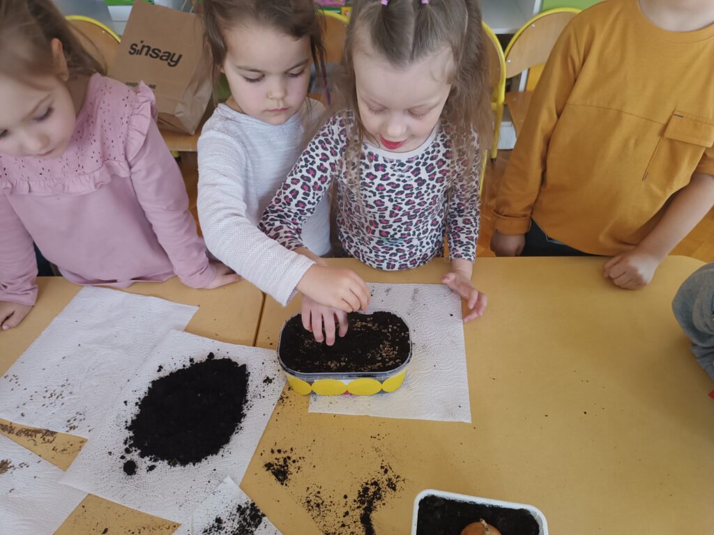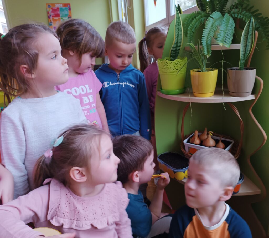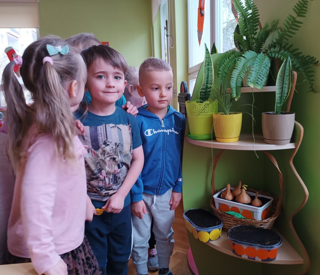 Chcąc przyspieszyć przyjście wiosny ,,Kotki” postanowiły założyć zielony ogródek. Zgromadziły potrzebne przybory, ziemię, sadzonki i nasionka. Przed przystąpieniem do pracy poznały warunki potrzebne roślinom do wzrostu. Po posadzeniu, zasianiu i podlaniu rośliny zostały umieszczone w kąciku przyrody, a dzieci muszą pamiętać o ich podlewaniu oraz obserwować ich wzrost.