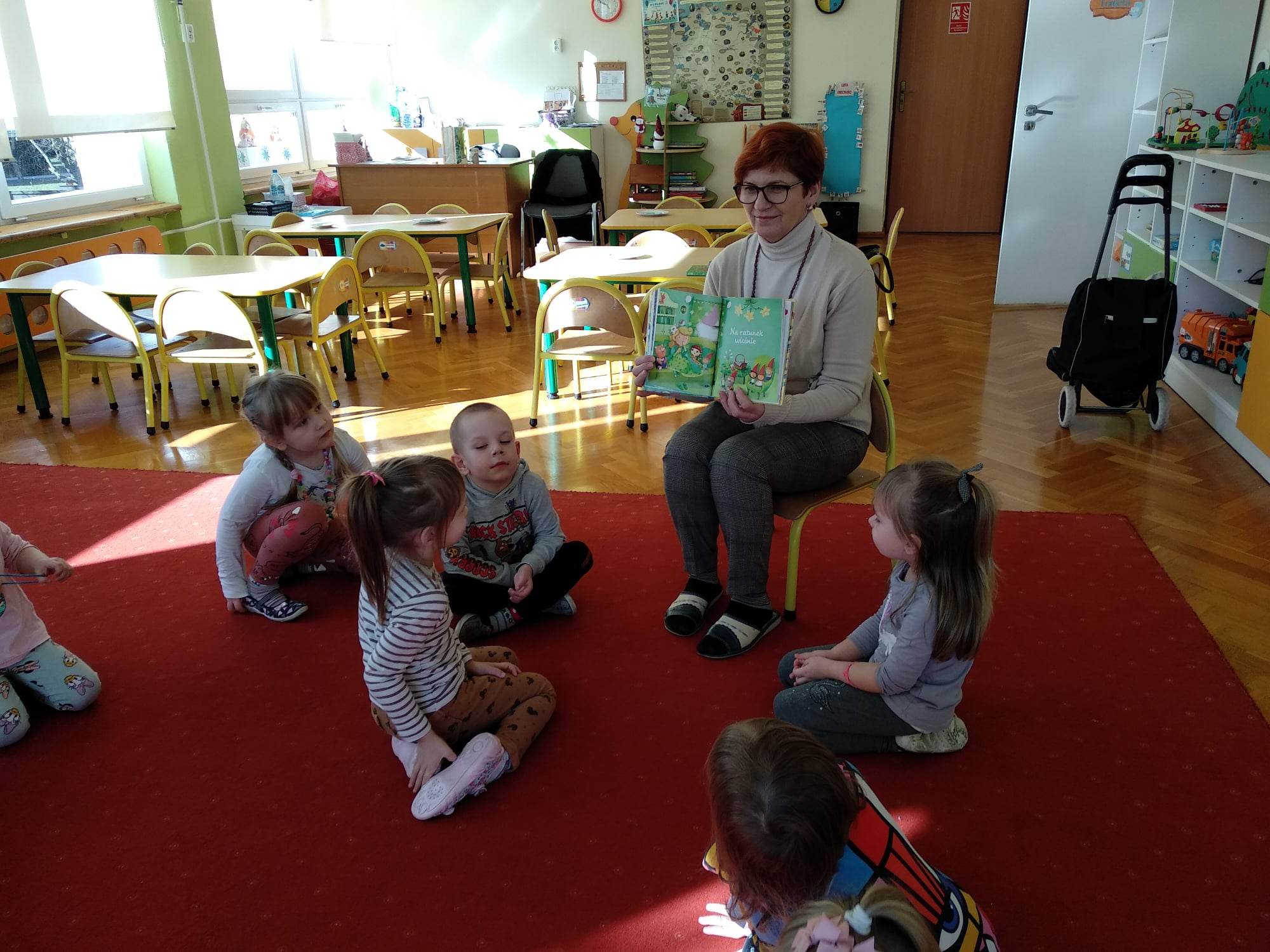 Codzienne czytanie dzieciom nie tylko rozwija ich wyobraźnię, doskonali mowę, ale także wzbogaca wiedzę o świecie, kształtując jednocześnie wrażliwość moralną. Mając na uwadze zalety płynące z czytania do naszego przedszkola zapraszamy gości, którzy czytając naszym przedszkolakom rozwijają ich zainteresowania czytelnicze. W tym tygodniu naszą grupę odwiedziła Pani bibliotekarka, która przeczytała dzieciom opowiadanie pt. „Na ratunek wiośnie”. Przedszkolaki z zainteresowaniem wysłuchały bajki, która zapoznała dzieci ze zmianami zachodzącymi w przyrodzie pod wpływem zmieniających się pór roku. Na zakończenie miłego spotkania wypożyczyliśmy książki.