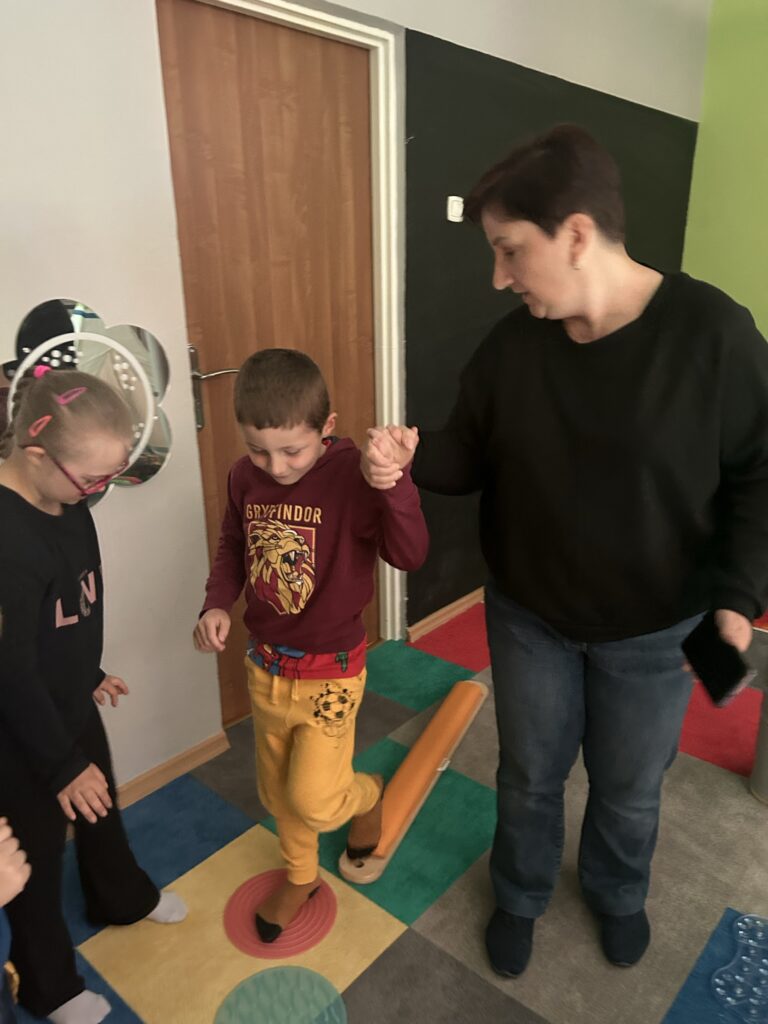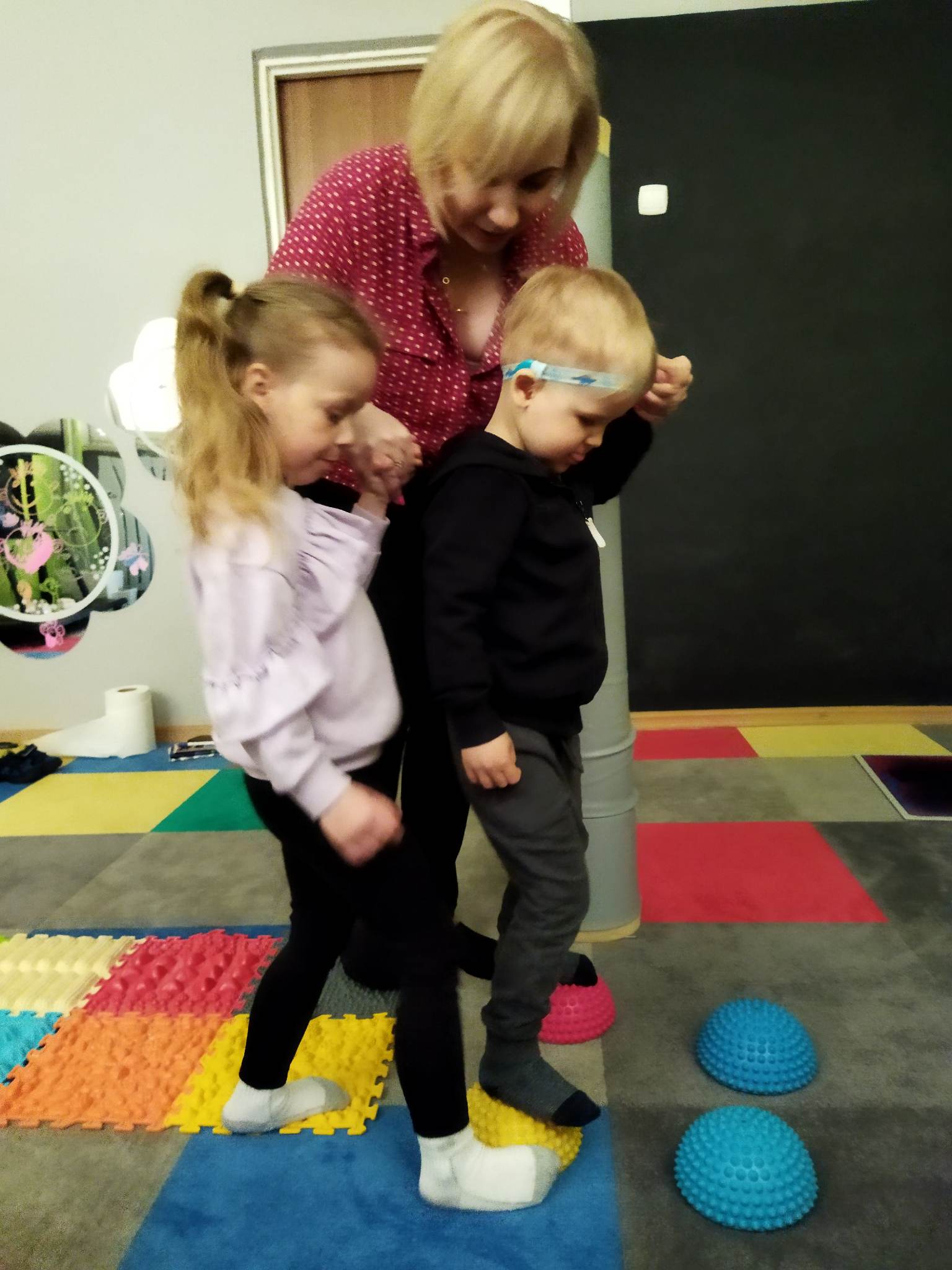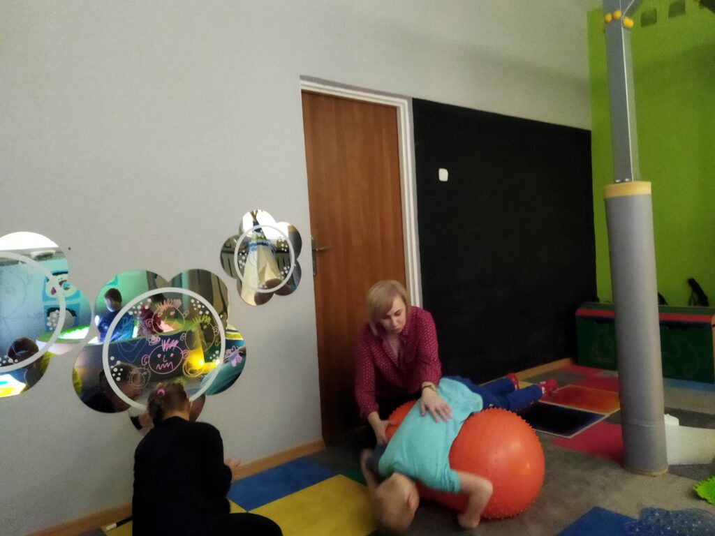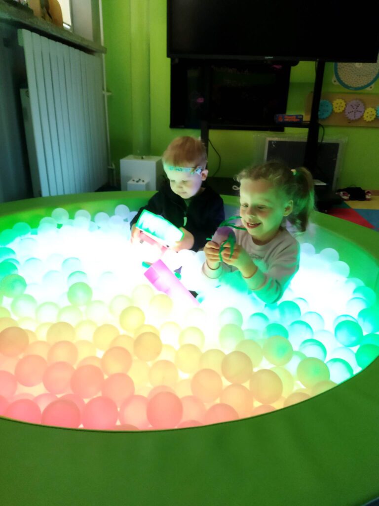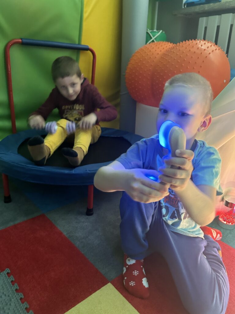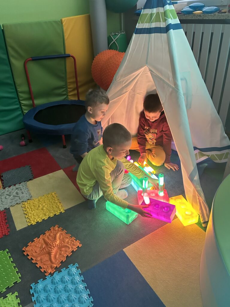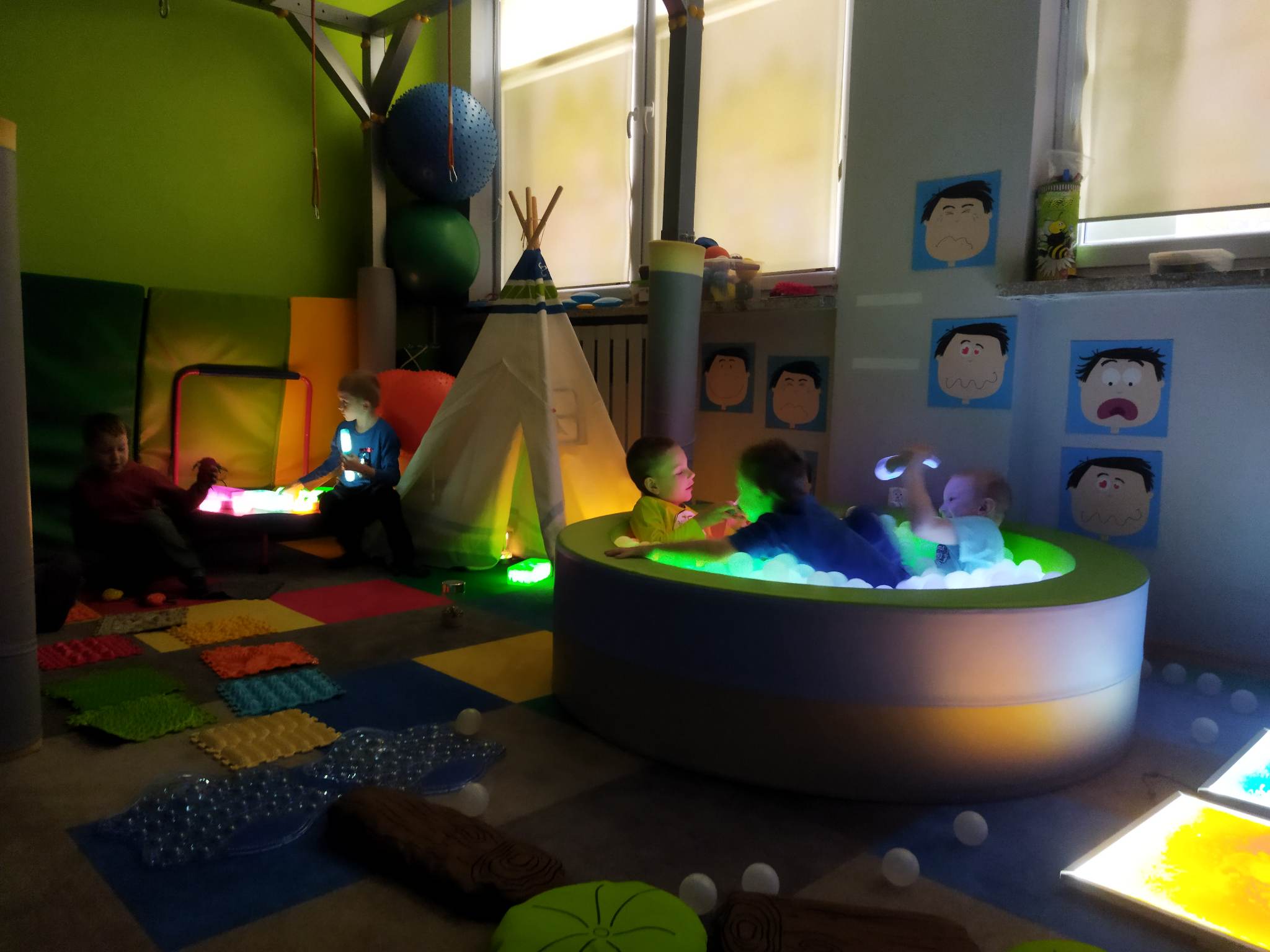 Ścieżka sensoryczna, masażyki, dyski do balansowania, huśtawki podwieszane, terapia światłem- to tylko niektóre elementy wykorzystane podczas zajęć rozwijających i usprawniających sferę społeczną i emocjonalną naszych milusińskich. Dzisiejsze spotkanie było pełne niespodzianek dla dzieci. Wszystkie wykonane ćwiczenia przyczyniły się do zredukowania napięcia, nie tylko mięśniowego, ale również emocjonalnego.