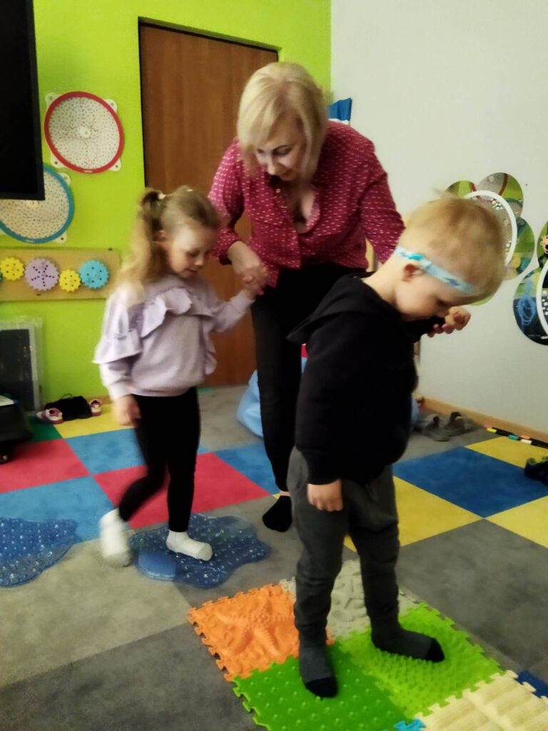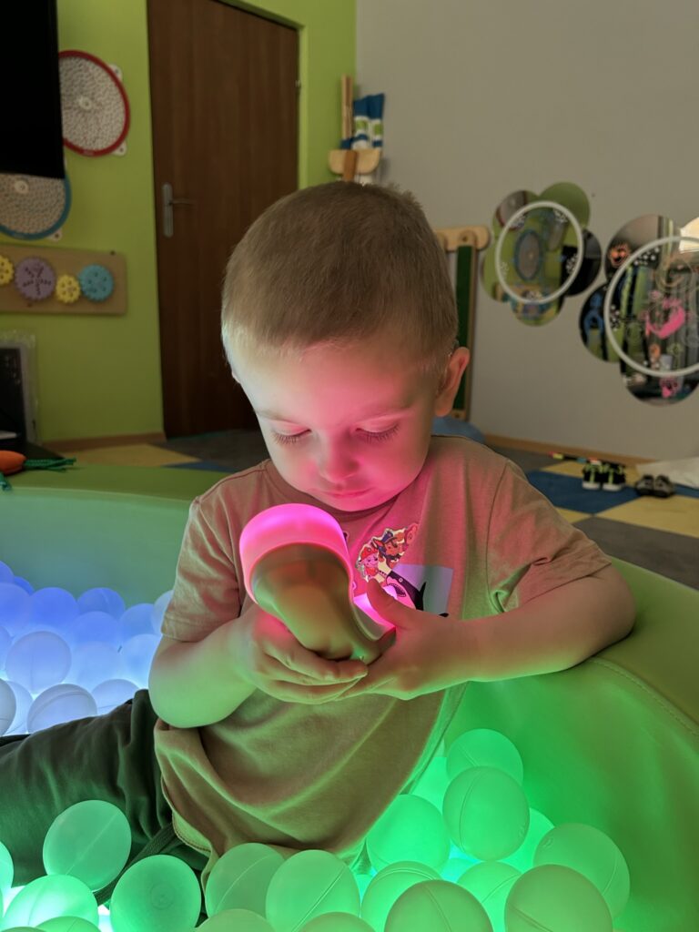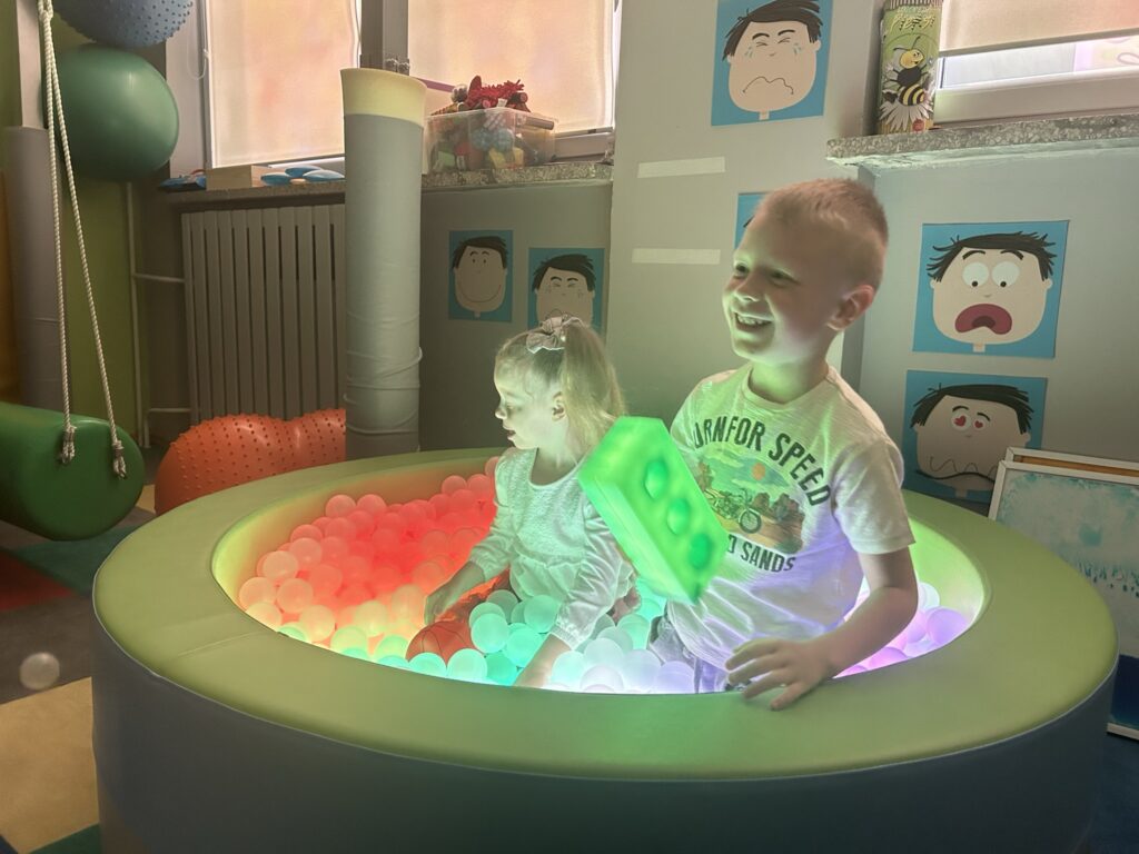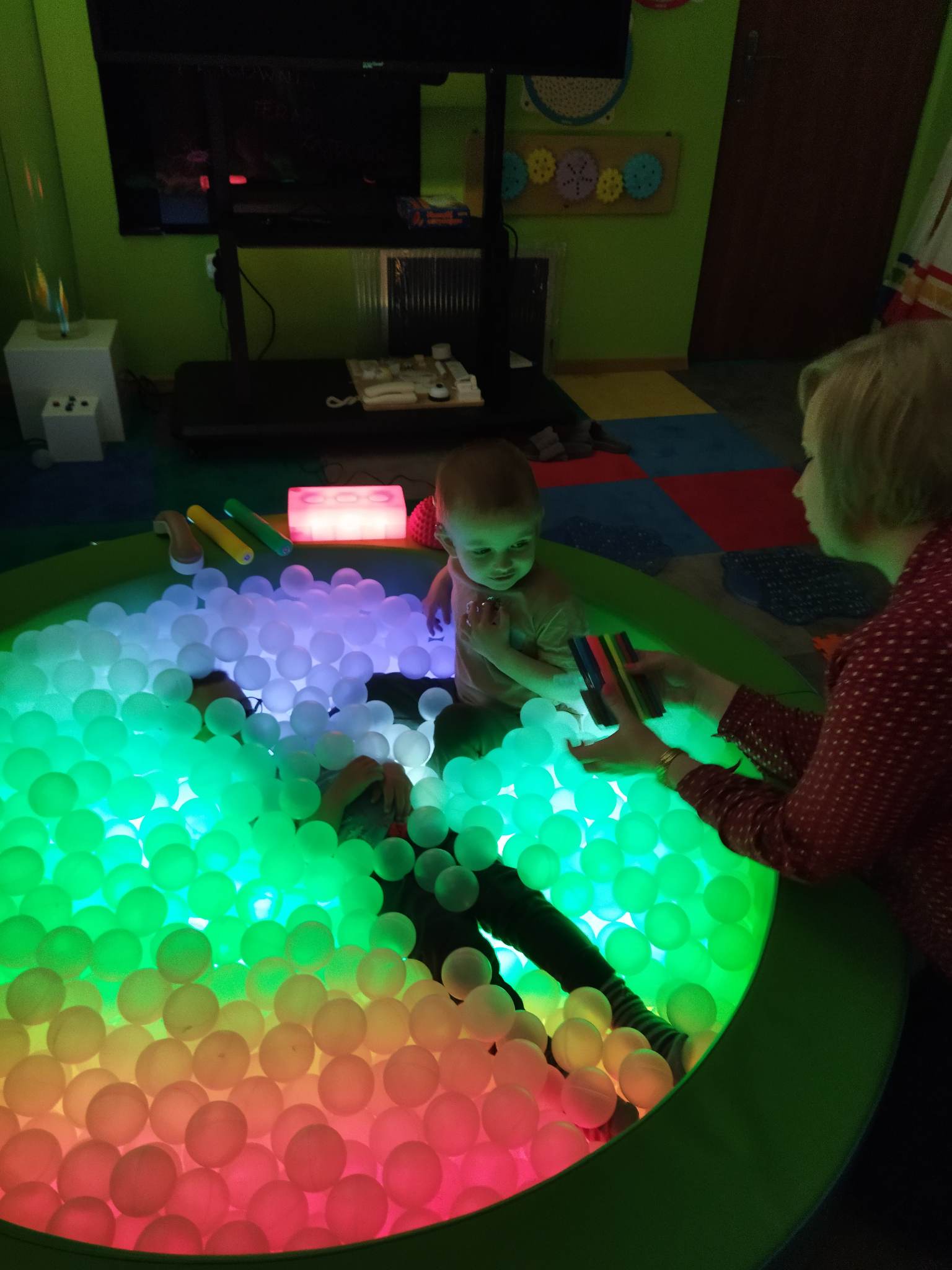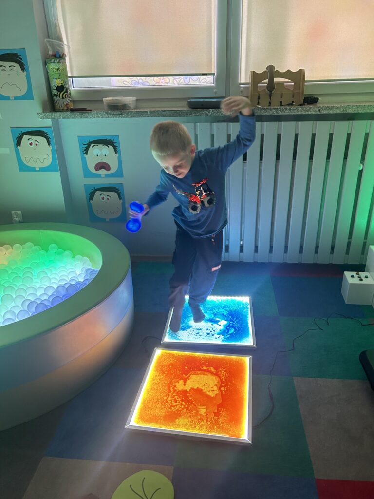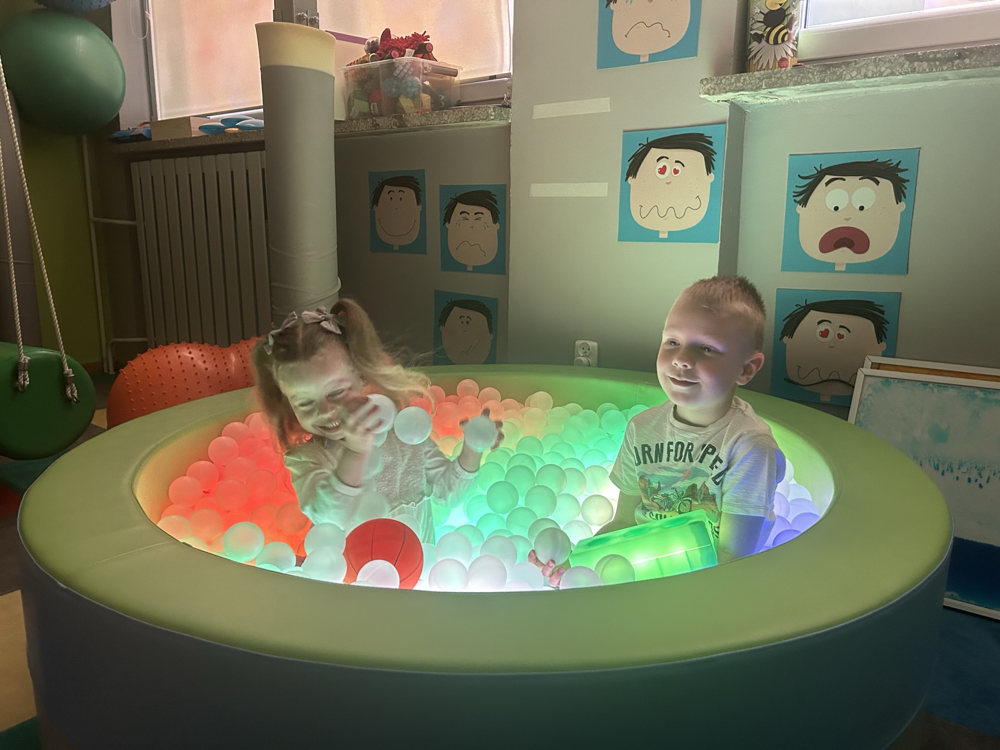 Ścieżka sensoryczna, masażyki, dyski do balansowania, huśtawki podwieszane, terapia światłem- to tylko niektóre elementy wykorzystane podczas zajęć rozwijających i usprawniających sferę społeczną i emocjonalną naszych milusińskich. Dzisiejsze spotkanie było pełne niespodzianek dla dzieci. Wszystkie wykonane ćwiczenia przyczyniły się do zredukowania napięcia, nie tylko mięśniowego, ale również emocjonalnego.