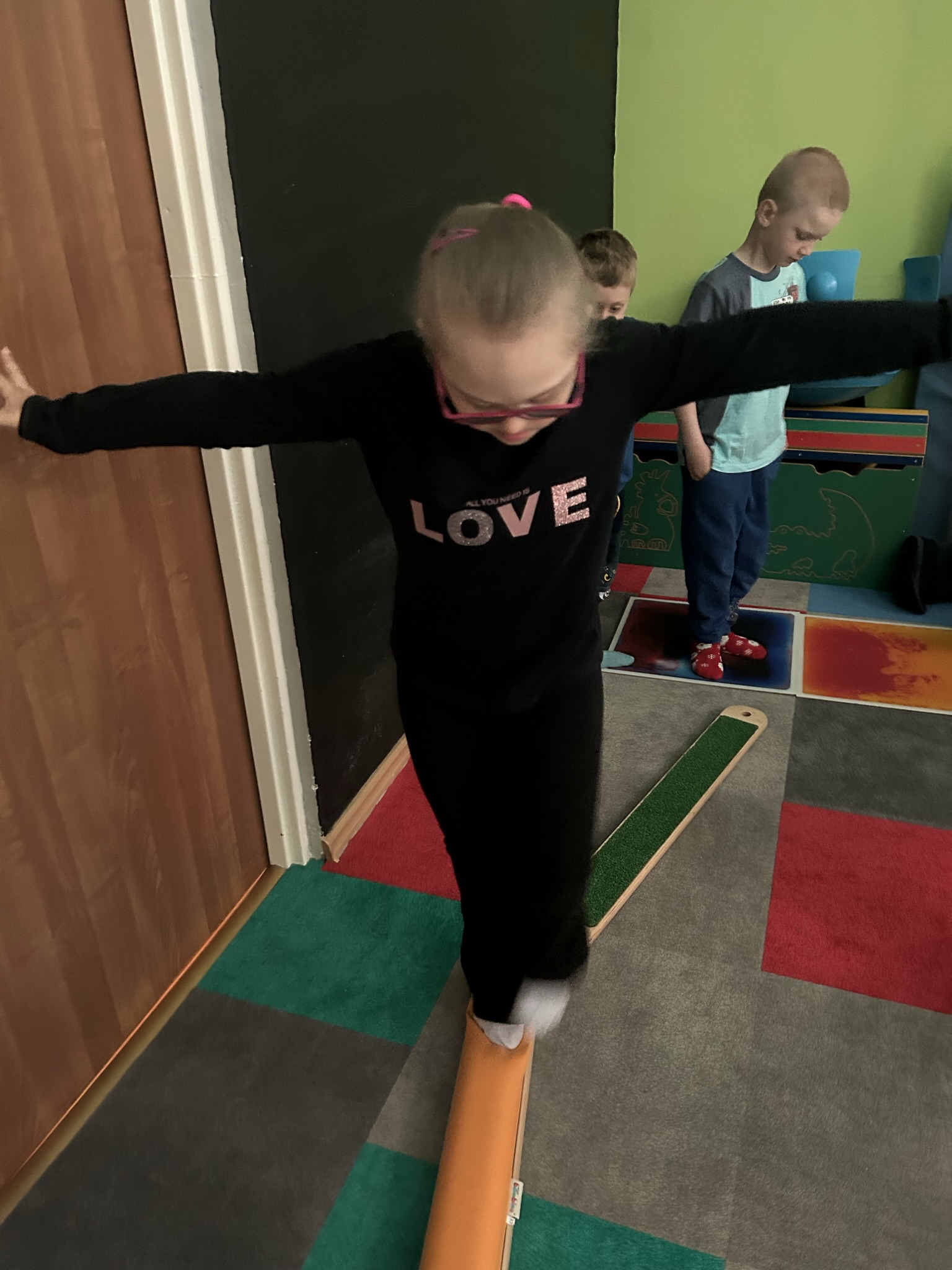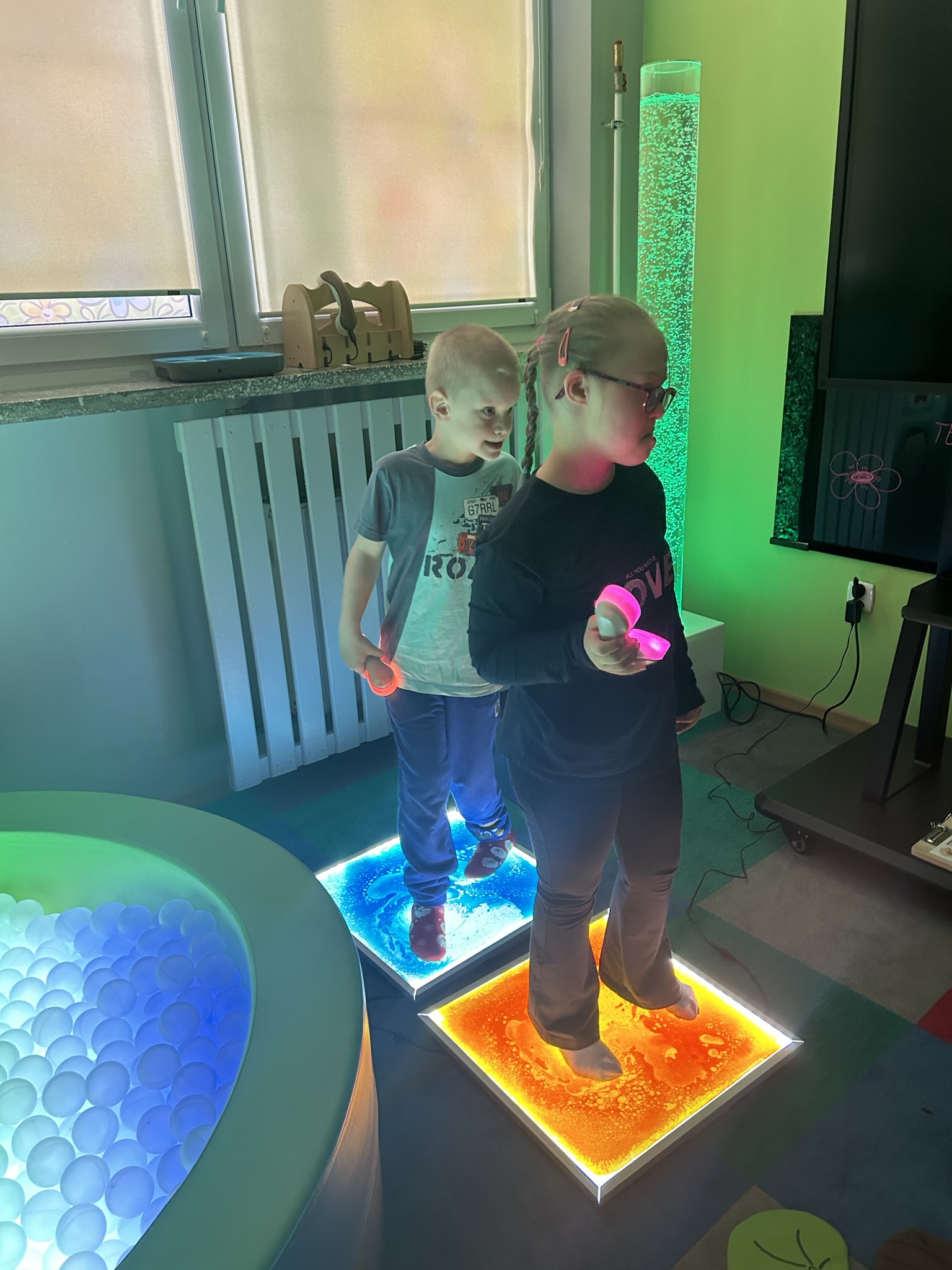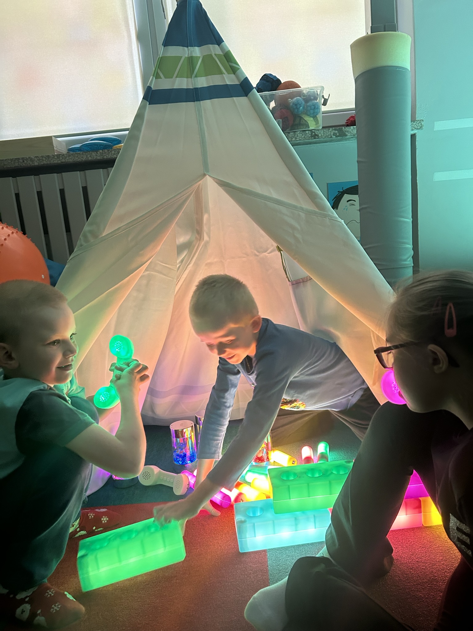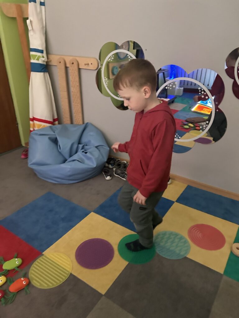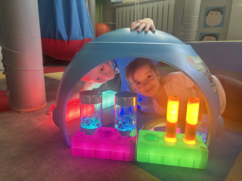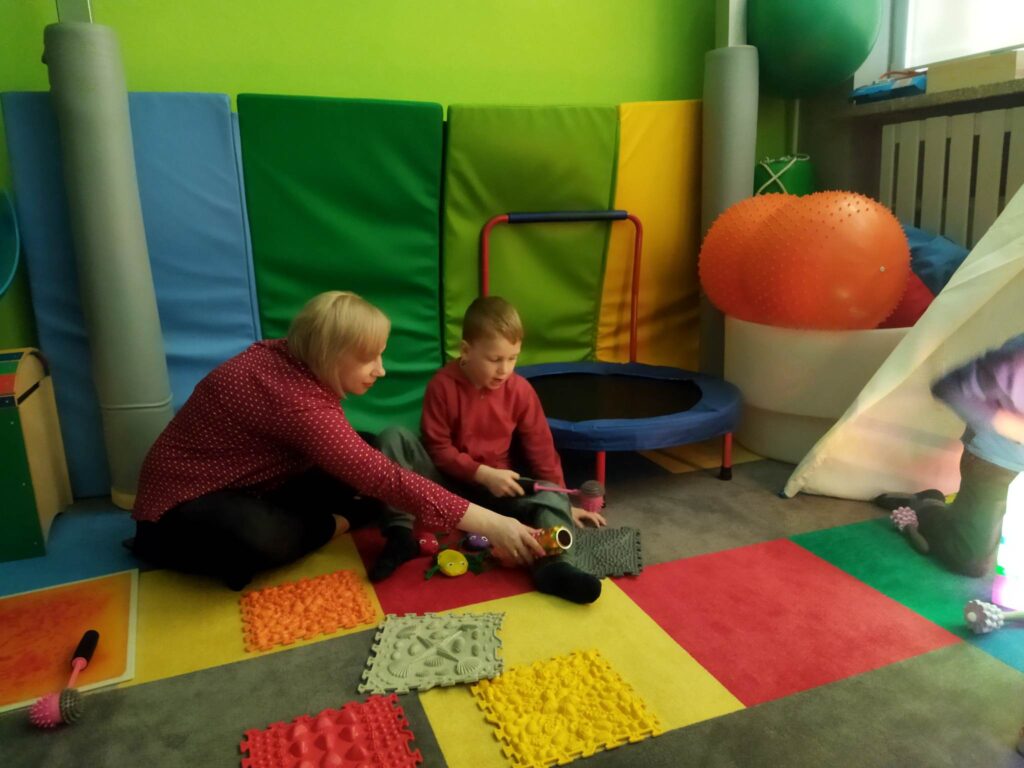 Ścieżka sensoryczna, masażyki, dyski do balansowania, huśtawki podwieszane, terapia światłem- to tylko niektóre elementy wykorzystane podczas zajęć rozwijających i usprawniających sferę społeczną i emocjonalną naszych milusińskich. Dzisiejsze spotkanie było pełne niespodzianek dla dzieci. Wszystkie wykonane ćwiczenia przyczyniły się do zredukowania napięcia, nie tylko mięśniowego, ale również emocjonalnego.