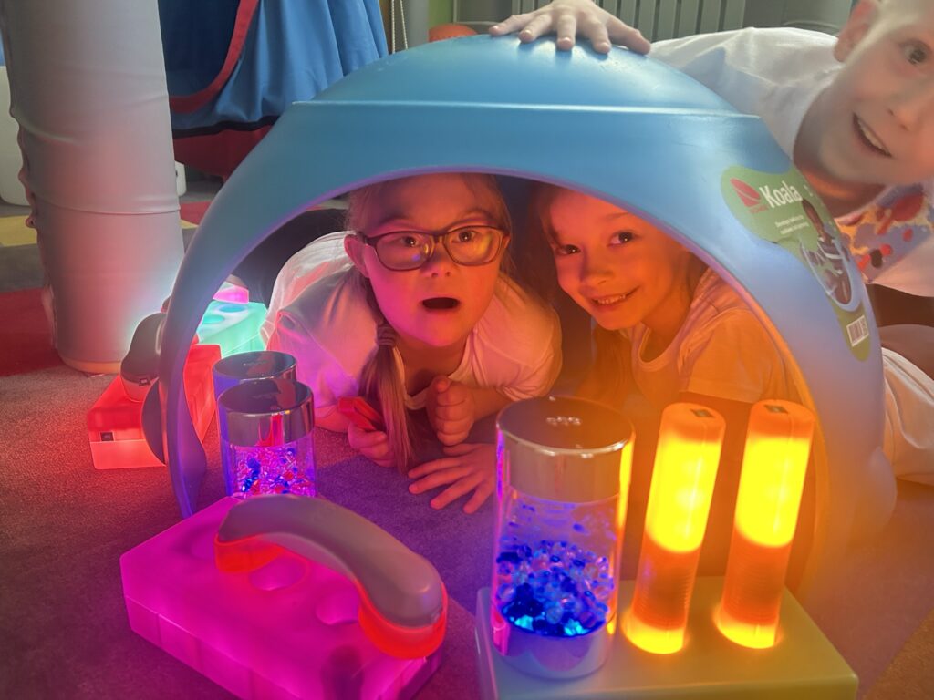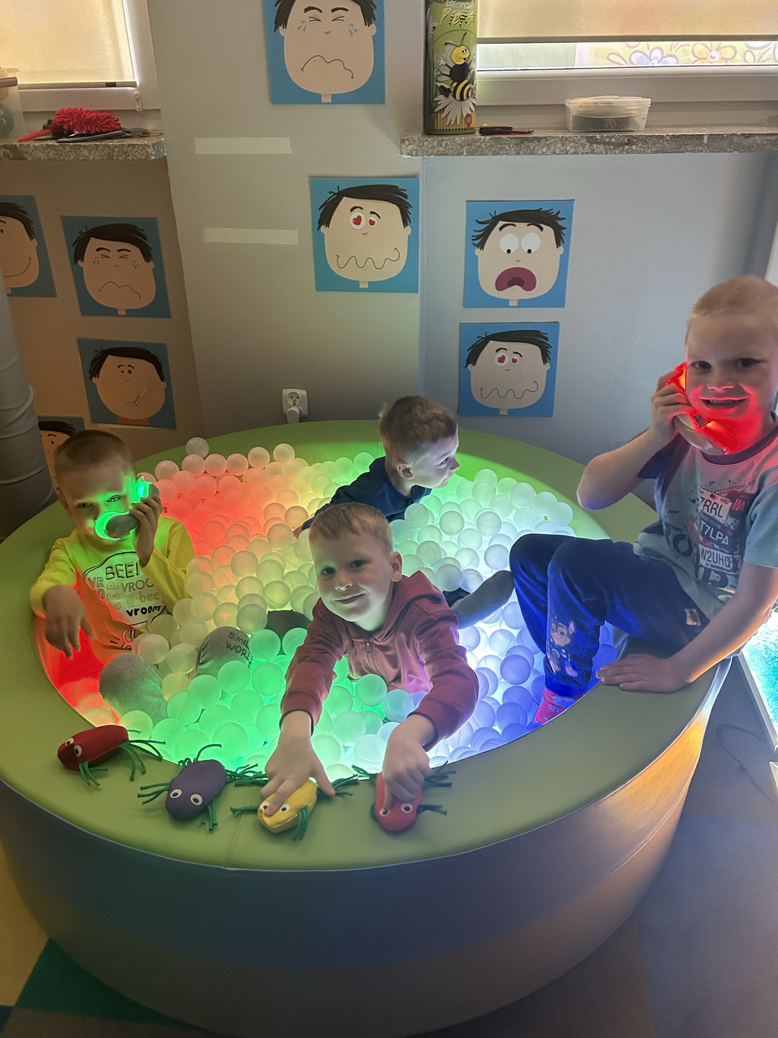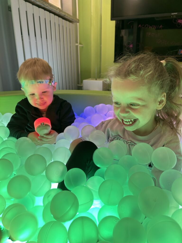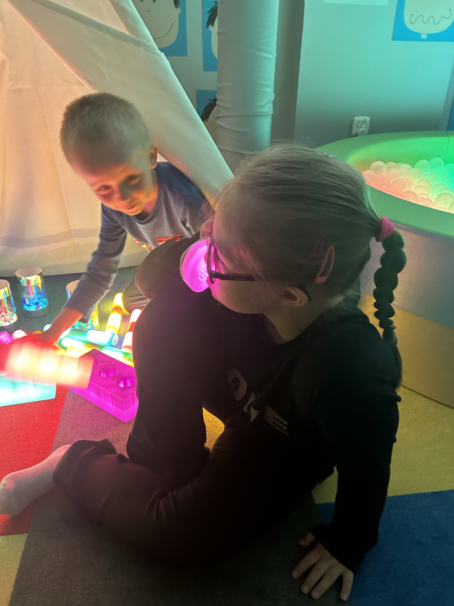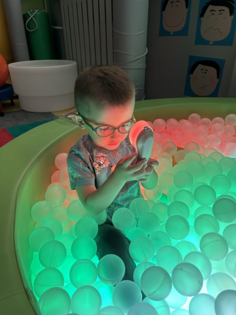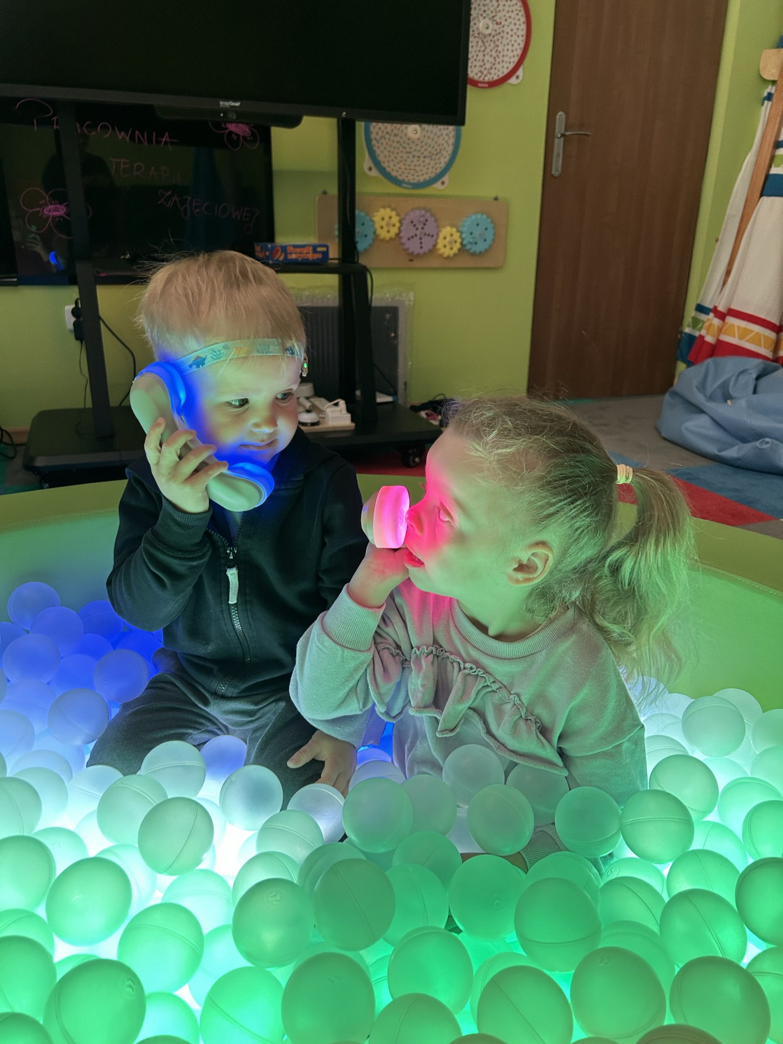 Ścieżka sensoryczna, masażyki, dyski do balansowania, huśtawki podwieszane, terapia światłem- to tylko niektóre elementy wykorzystane podczas zajęć rozwijających i usprawniających sferę społeczną i emocjonalną naszych milusińskich. Dzisiejsze spotkanie było pełne niespodzianek dla dzieci. Wszystkie wykonane ćwiczenia przyczyniły się do zredukowania napięcia, nie tylko mięśniowego, ale również emocjonalnego.