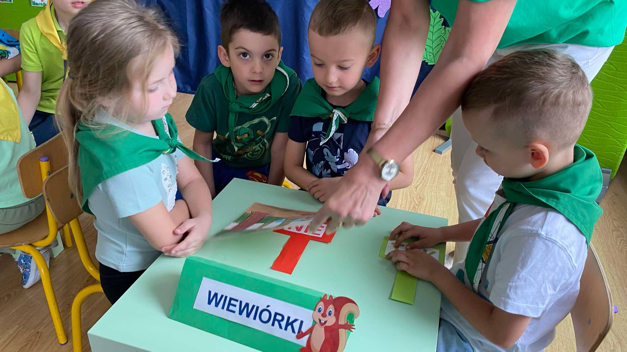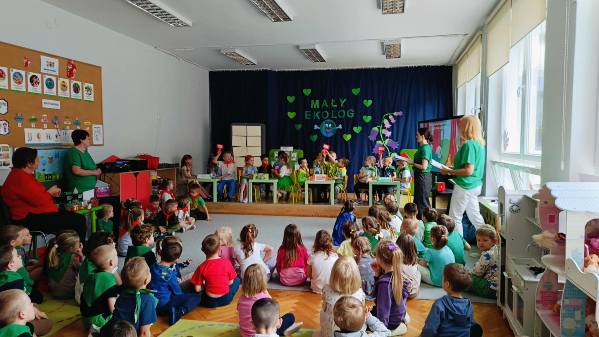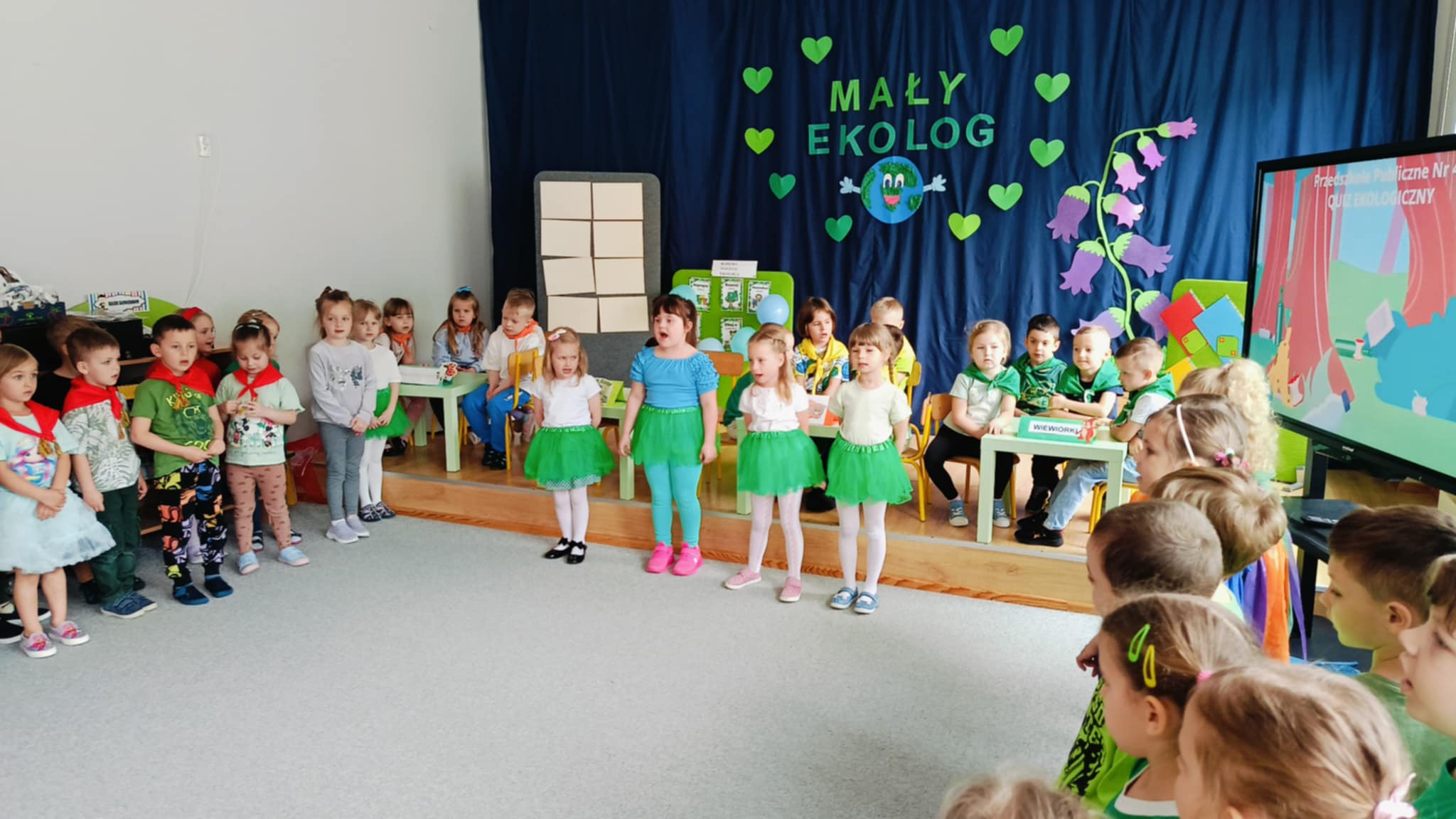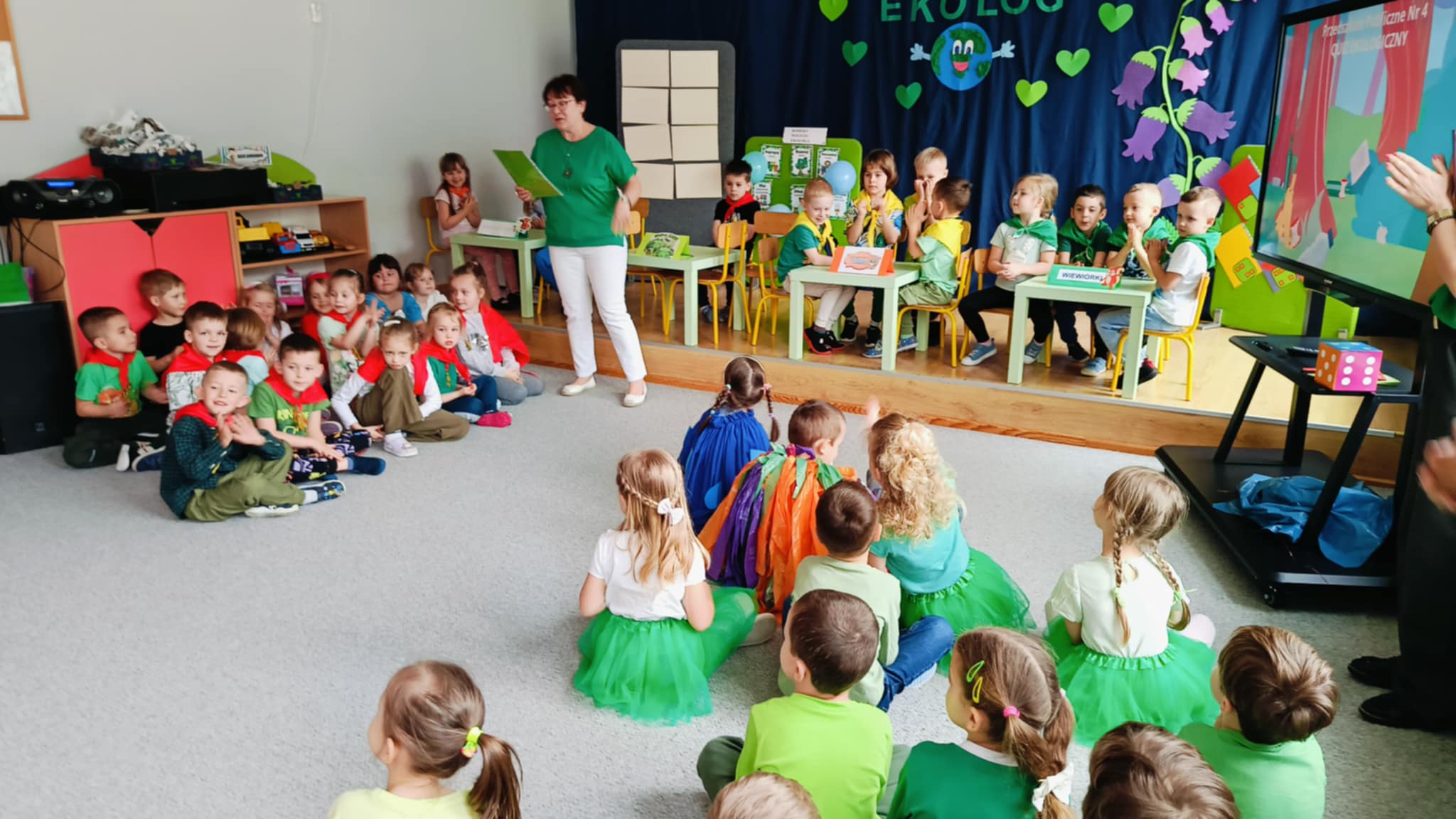 W ramach projektu transgranicznego ,,Współpraca korzystna dla klimatu – rozwój zielonej infrastruktury w Łęcznej i Kowlu” w naszym przedszkolu odbył się quiz ekologiczny ,,Mały Ekolog”. Jego uczestnikami były dzieci z grup: „Żabki”, „Misie”, „Wiewiórki” oraz „Biedronki”. Cztery drużyny, składające się z czterech uczestników każda, dzielnie rywalizowały, wykazując się dużą wiedzą na temat ochrony środowiska i ekologii. Głównymi celami wydarzenia było rozwijanie świadomości ekologicznej dzieci, kształtowanie postaw proekologicznych, promowanie współpracy w grupie oraz pogłębianie wiedzy o ochronie przyrody w sposób atrakcyjny i dostosowany do wieku uczestników. Wspólna zabawa połączona z nauką dostarczyła wszystkim wiele radości i była świetną okazją do utrwalenia ważnych nawyków dbania o naszą planetę.