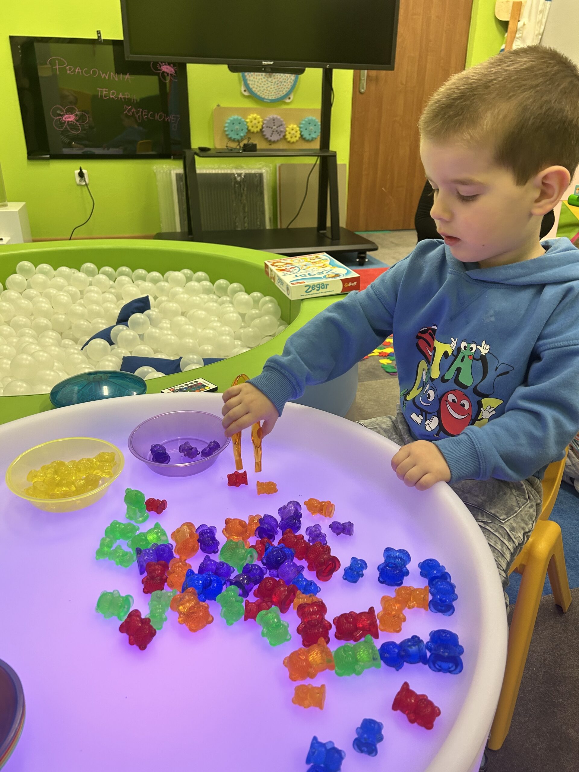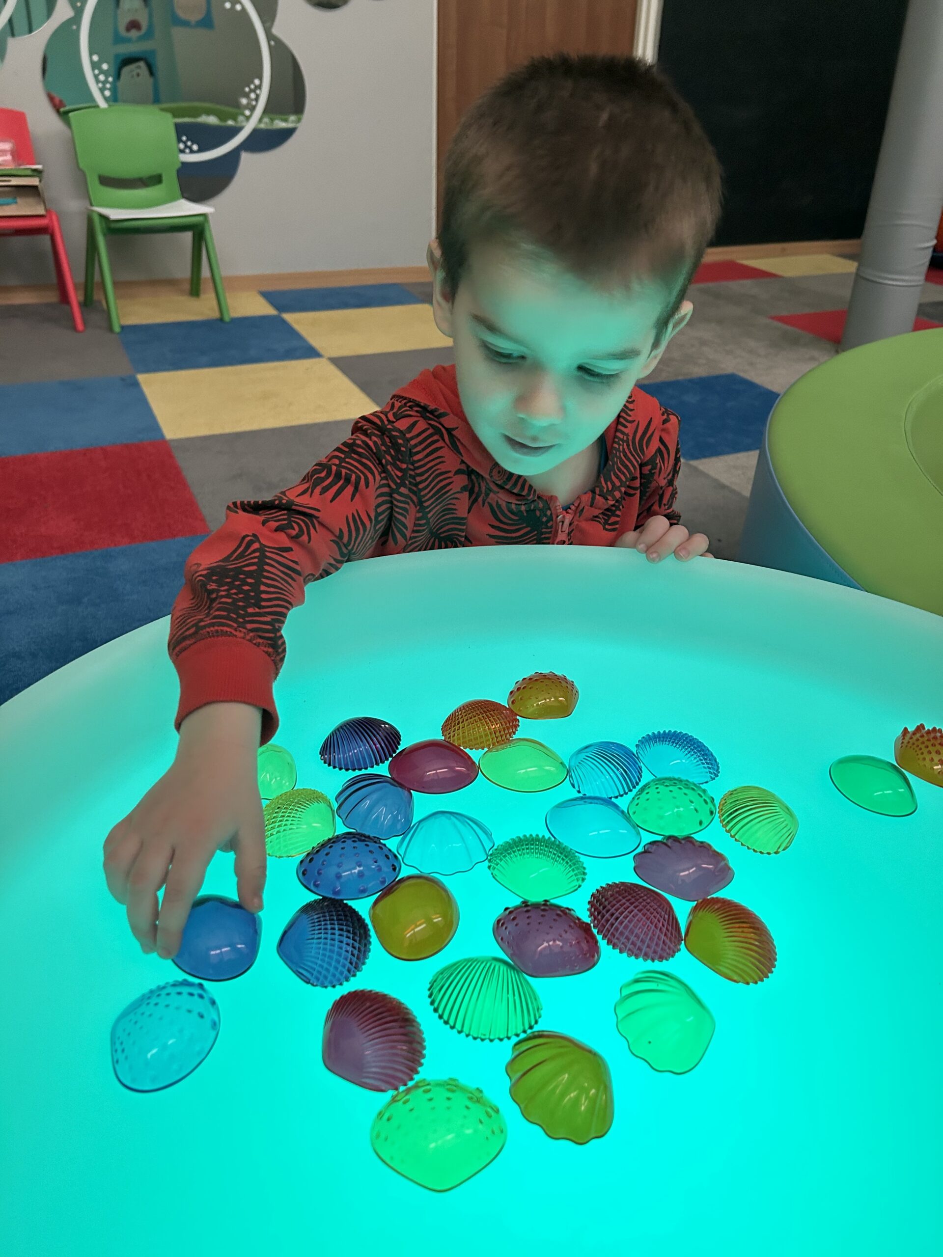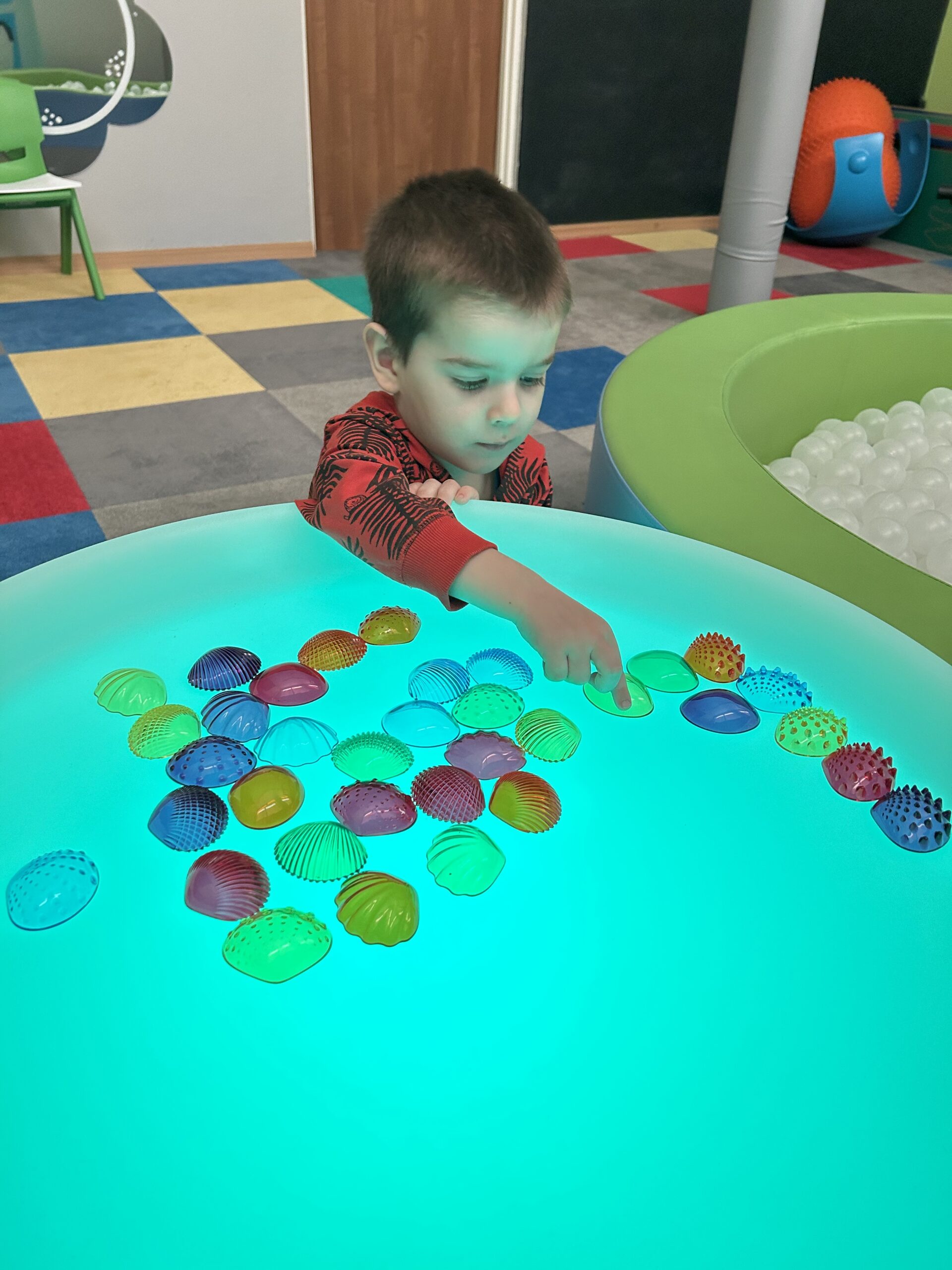 Podczas zajęć rozwijających naszą integrację sensoryczną tym razem skupiliśmy się głównie na wykonaniu masażyków z użyciem kulek z wypustkami, wałków do masażu, młoteczka do masażu z rączką, który poprawia krążenie i rozluźnia mięśnie, łagodzi dolegliwości bólowe, działa odprężająco. W przygotowaniu do dalszych ćwiczeń wykorzystaliśmy kuleczki do ściskania, które posłużyły usprawnianiu mięśni palców, dłoni, przedramienia. Ćwiczenia te doskonale wkomponowały się w zadania manualne z wykorzystaniem zabawy światłem.