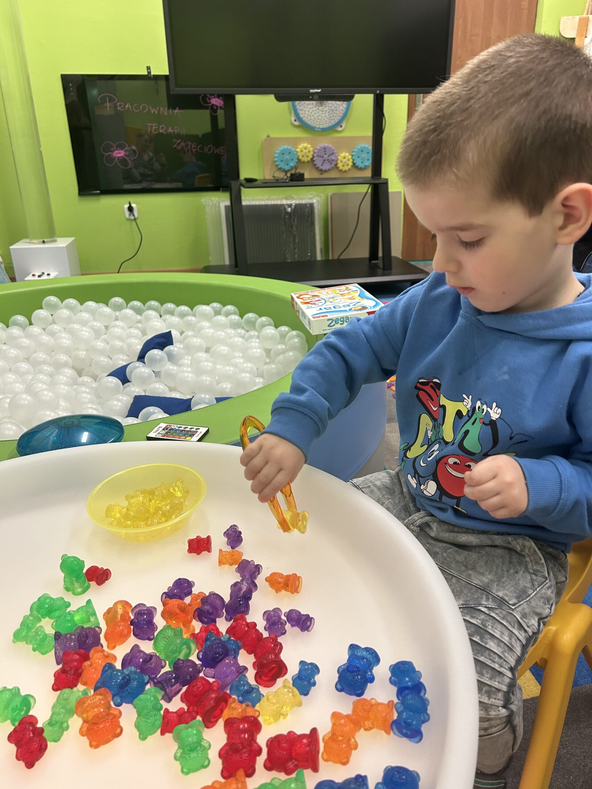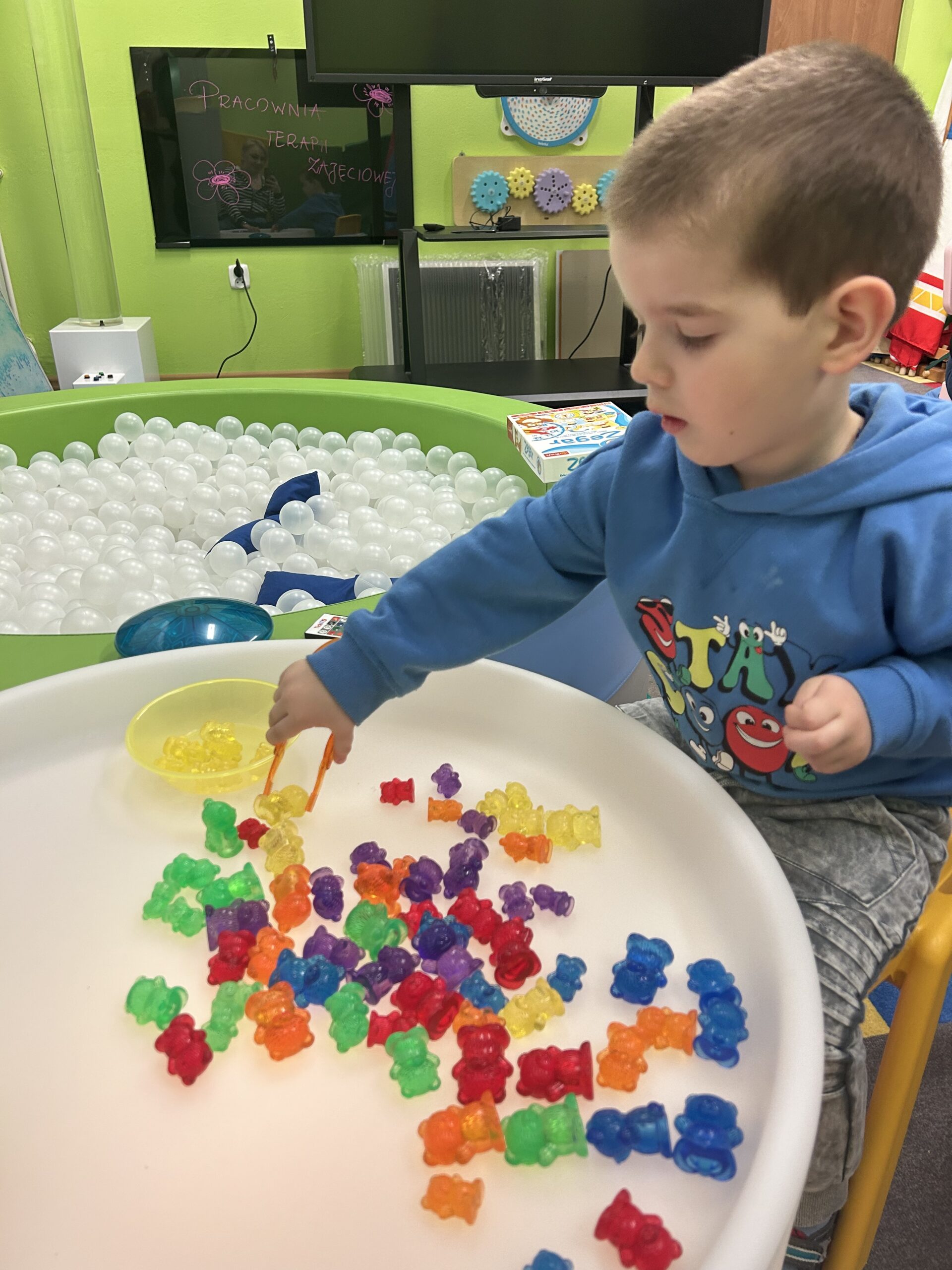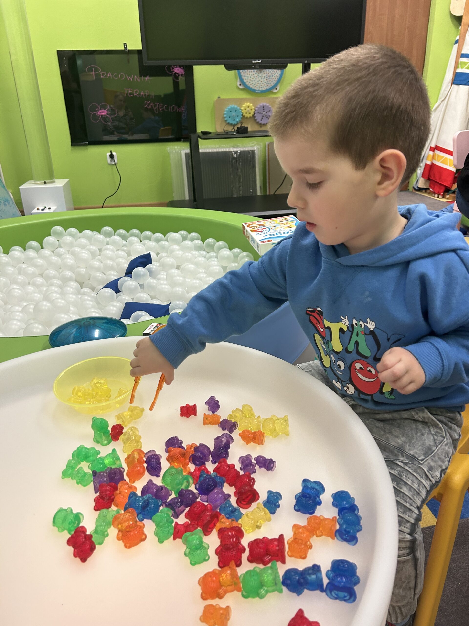Podczas zajęć rozwijających naszą integrację sensoryczną tym razem skupiliśmy się głównie na wykonaniu masażyków z użyciem kulek z wypustkami, wałków do masażu, młoteczka do masażu z rączką, który poprawia krążenie i rozluźnia mięśnie, łagodzi dolegliwości bólowe, działa odprężająco. W przygotowaniu do dalszych ćwiczeń wykorzystaliśmy kuleczki do ściskania, które posłużyły usprawnianiu mięśni palców, dłoni, przedramienia. Ćwiczenia te doskonale wkomponowały się w zadania manualne z wykorzystaniem zabawy światłem.