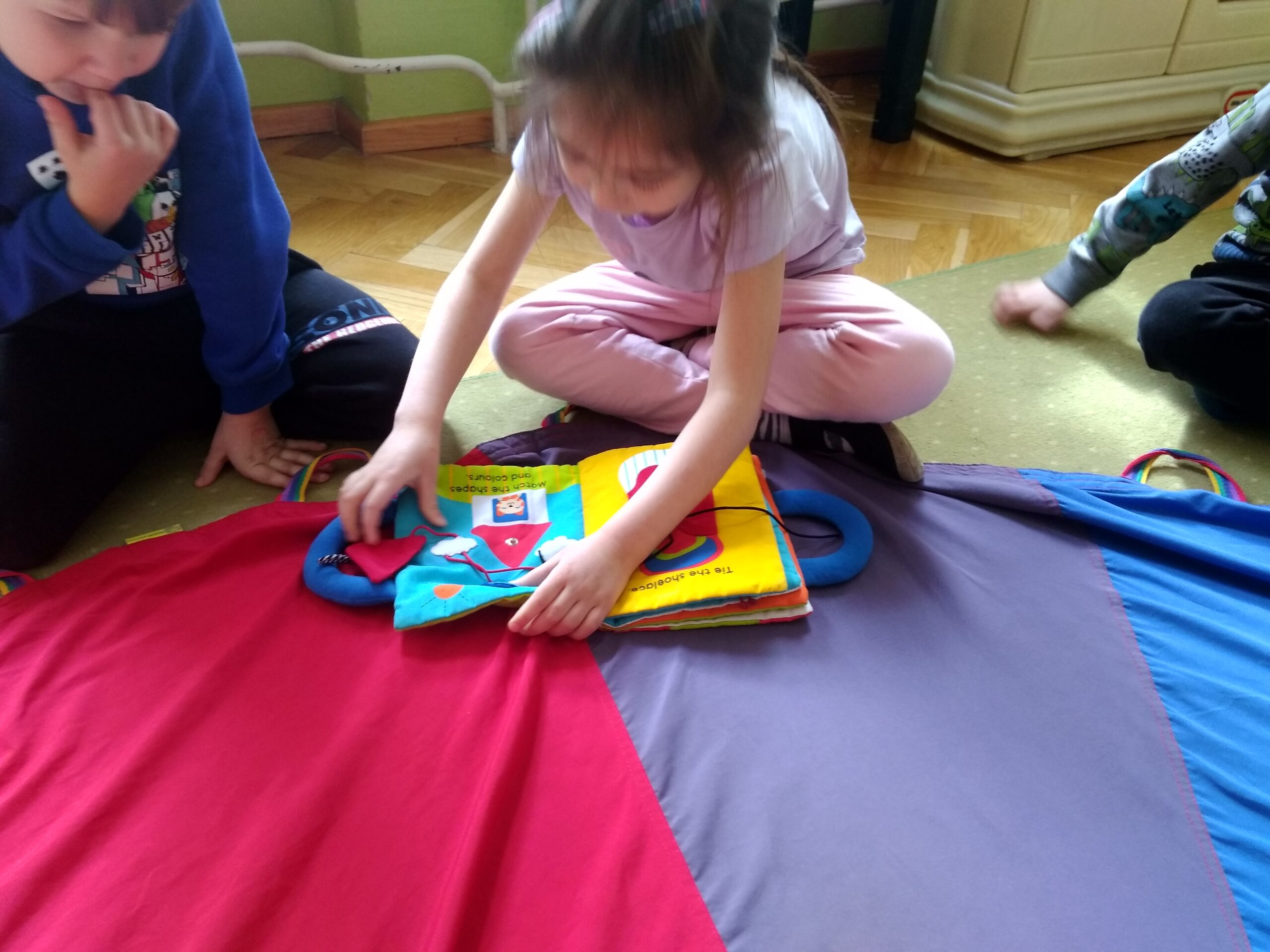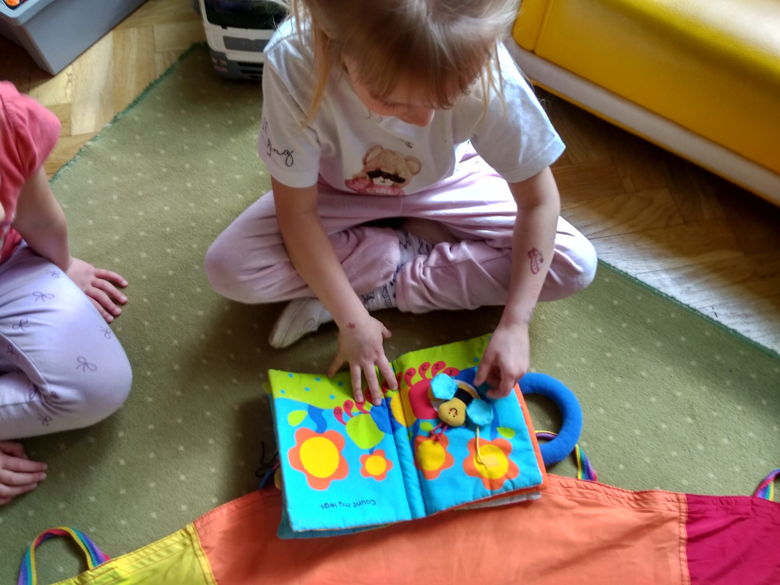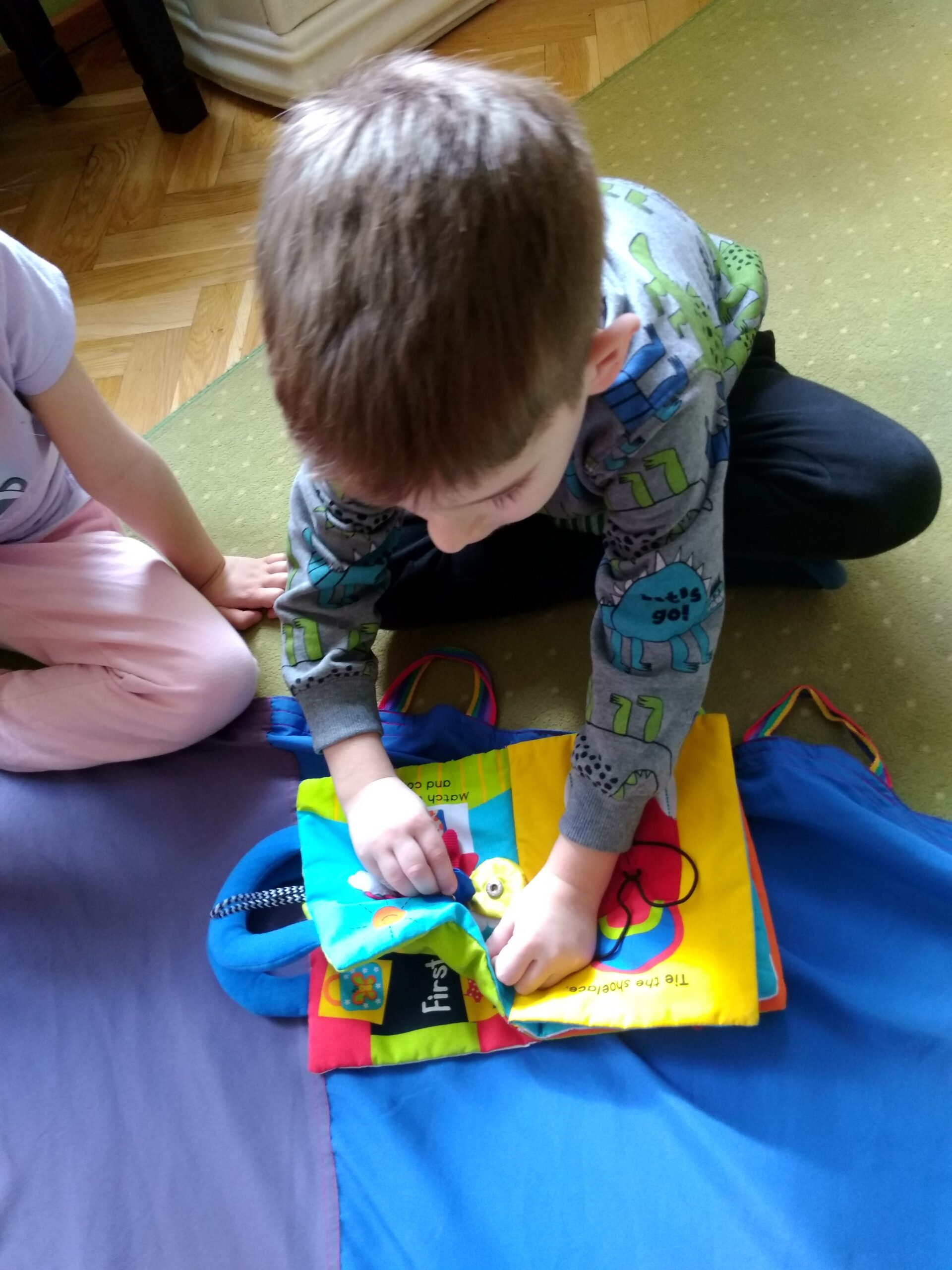 „My First Activity Book”- to miękka, kolorowa książeczka sensoryczna wykonana z różnych tkanin, za pomocą której dzieci nie tylko ćwiczyły umiejętności manualne, ale także poznawały słownictwo angielskie opisujące pierwsze czynności, jakich uczą się dzieci. Zajęcia dostarczyły dzieciom dużo dobrej zabawy.
