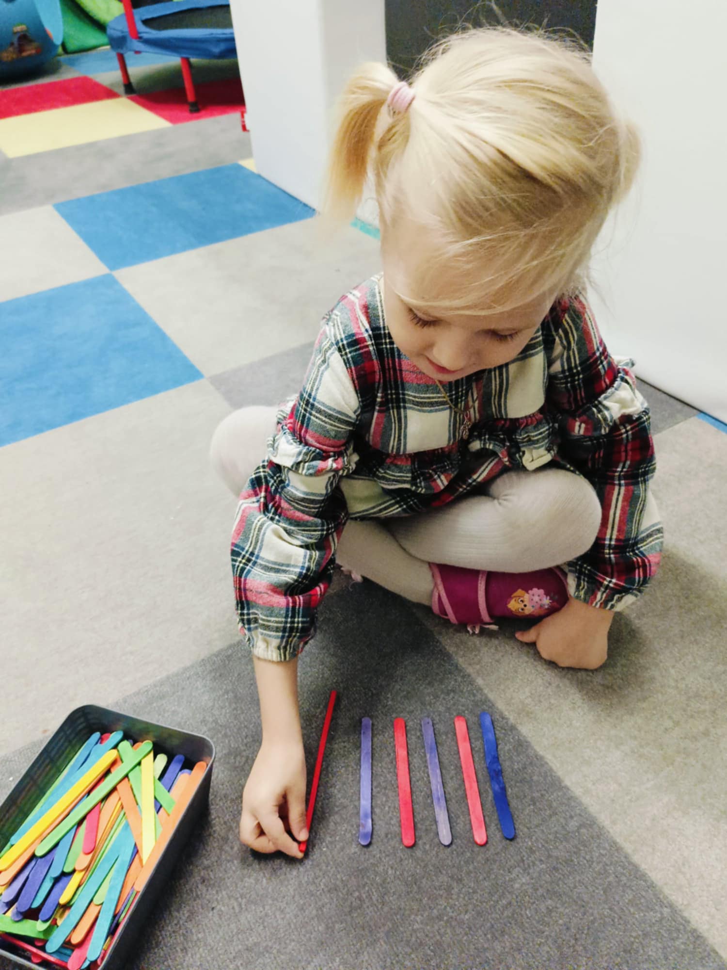 Podczas ostatnich zajęć rewalidacyjnych skupiliśmy się na rozwijaniu umiejętności językowych oraz stymulacji lewej półkuli mózgu poprzez zabawy i ćwiczenia praktyczne. Dziecko utrwalało znajomość kolorów poprzez tworzenie rytmów z kolorowych patyczków oraz układanie sekwencji. Wykorzystaliśmy pęsetę do segregowania kolorowych misiów, co dodatkowo wspierało rozwój motoryki małej i koncentracji. Na kolejnych zajęciach skupiliśmy się na poznawaniu figur geometrycznych. W ramach zajęć dziecko układało figury za pomocą kasztanów, co wspierało zarówno naukę kształtów, jak i zdolności manualne. Następnie wspólnie wyszukiwaliśmy przedmioty w sali przypominające poznane figury geometryczne. Zajęcia przebiegły w atmosferze zaciekawienia i aktywności ze strony dziecka.