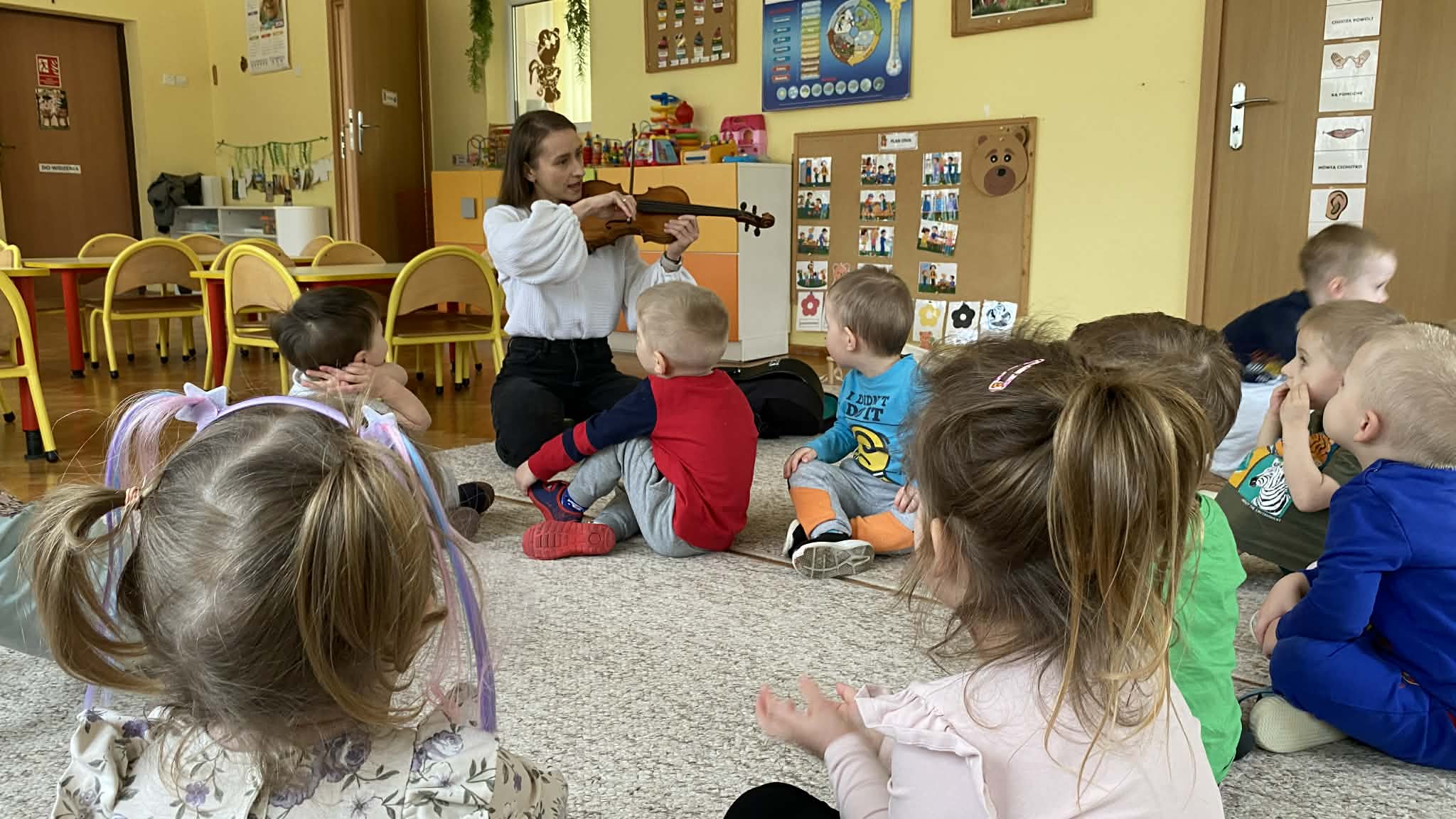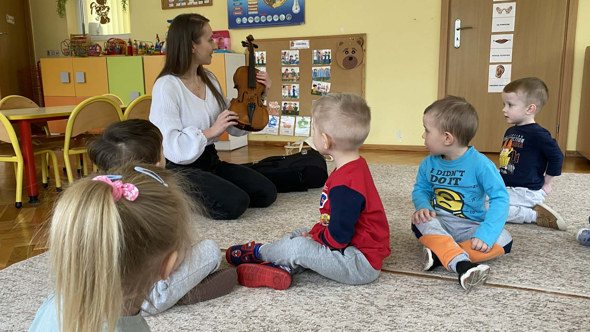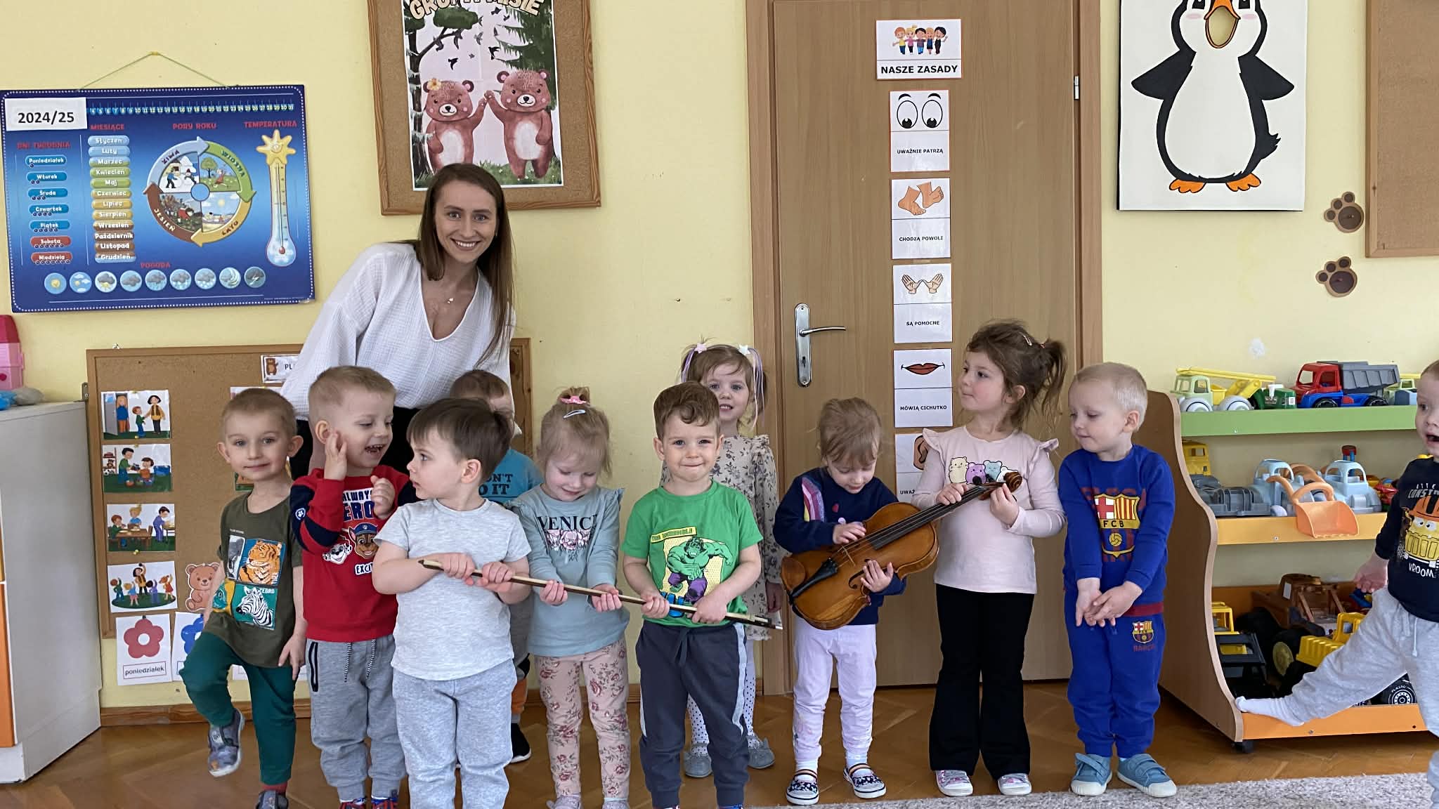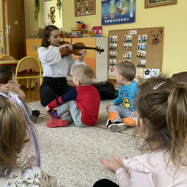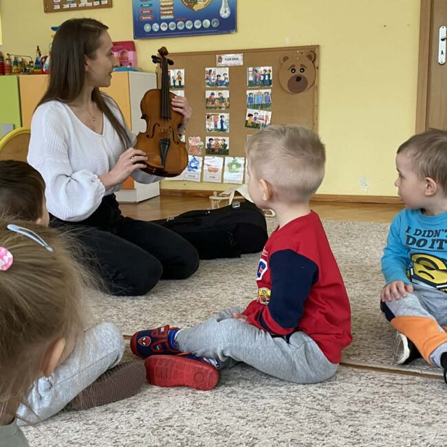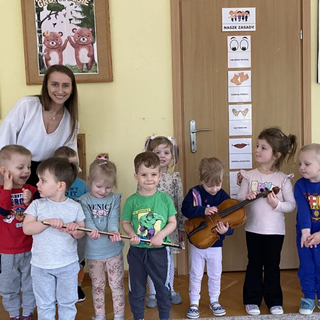 Naszą grupę odwiedziła wyjątkowa osoba – mama Miłosza, która podzieliła się z nami swoją wielką pasją, jaką jest gra na skrzypcach. Przedszkolaki miały okazję z bliska obejrzeć instrument, poznać jego budowę oraz posłuchać przepięknych melodii. To było niezwykle inspirujące i muzyczne spotkanie
