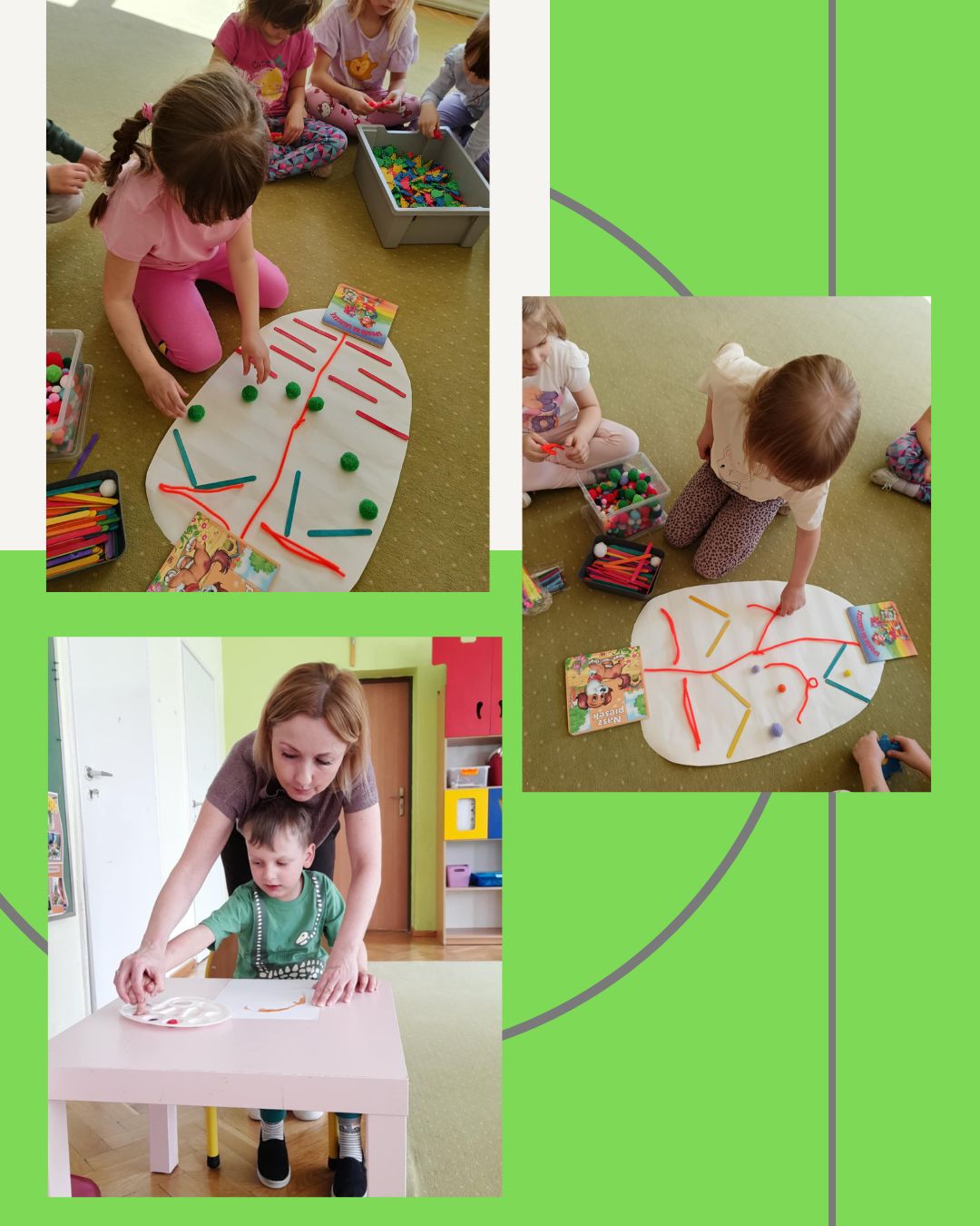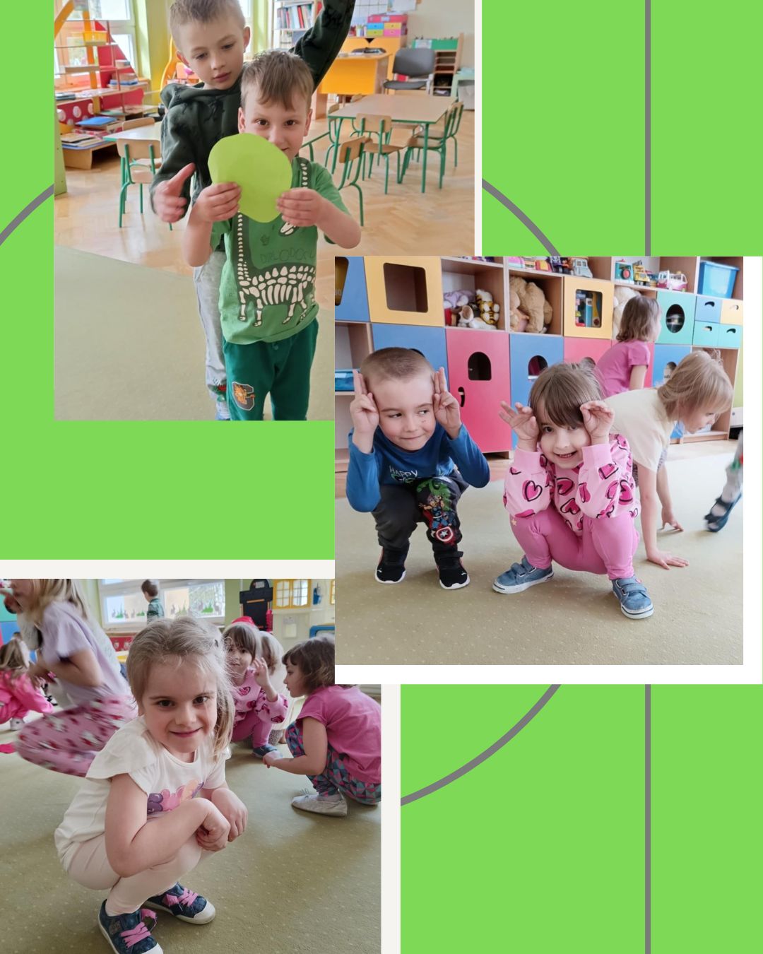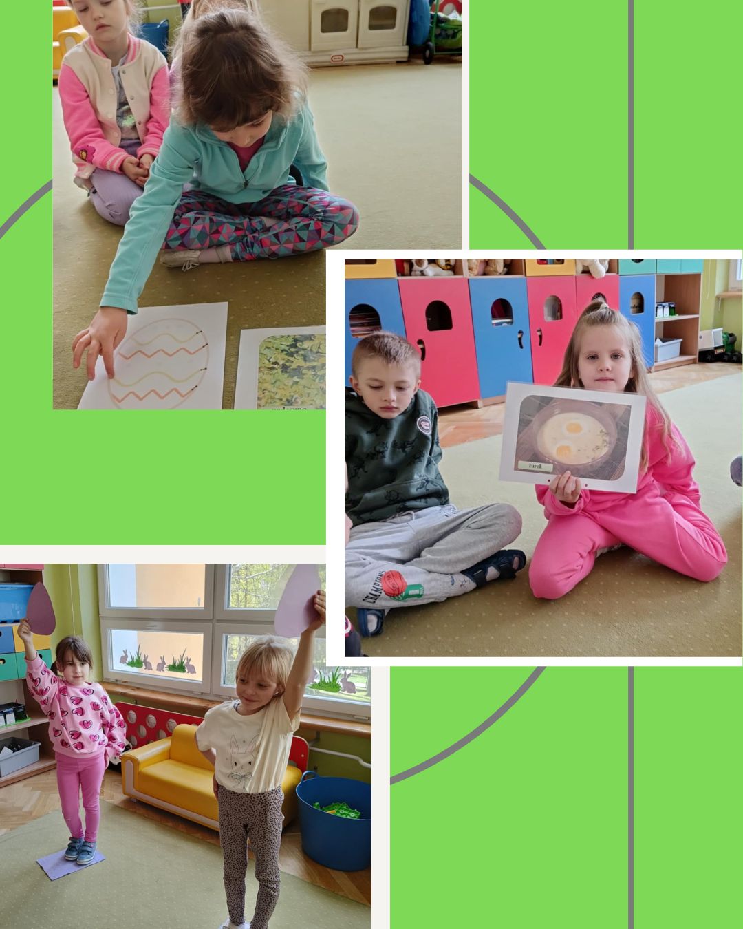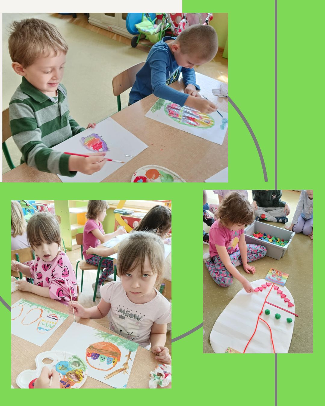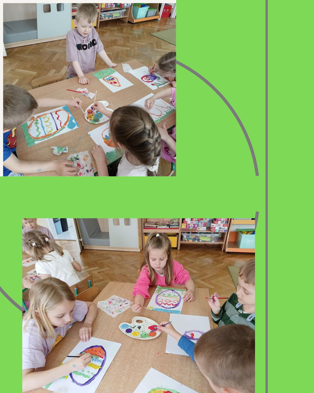Nie zabrakło również zabaw ruchowych o tematyce świątecznej, które wprowadziły dzieci w radosny, wiosenny nastrój. Na zakończenie każdy przedszkolak wykonał pracę plastyczną farbami według własnego pomysłu – powstały piękne, kolorowe obrazy związane ze Świętami Wielkanocnymi i wiosną.