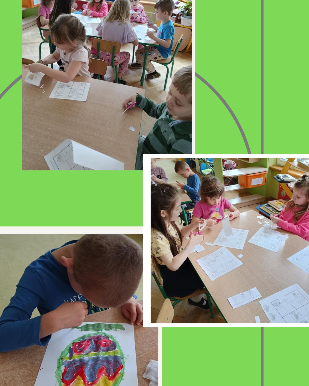 W ramach zajęć rozwijających logiczne myślenie dzieci rozwiązywały wielkanocne sudoku, a także pracowały nad pojęciem osi symetrii, ozdabiając pisankę tak, by obie jej strony były symetryczne.
