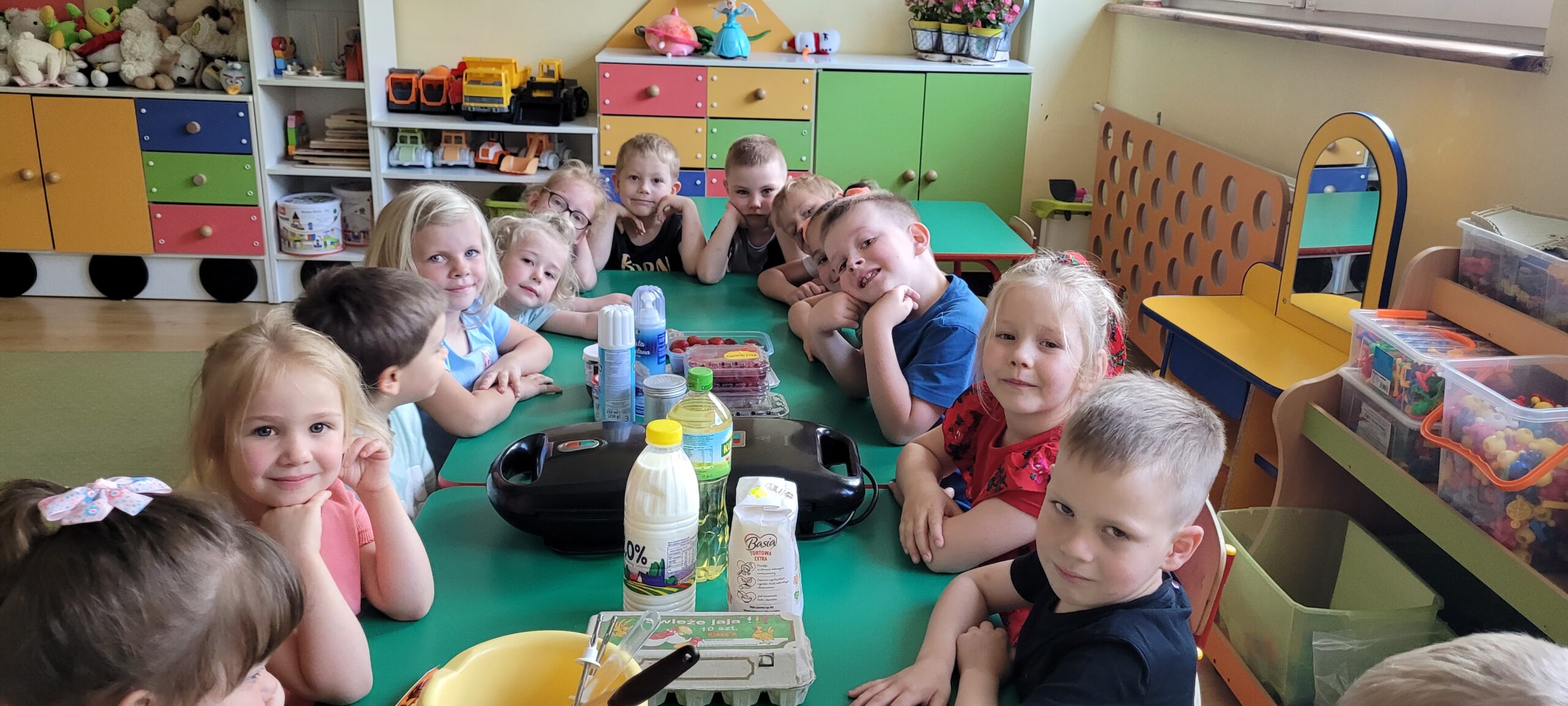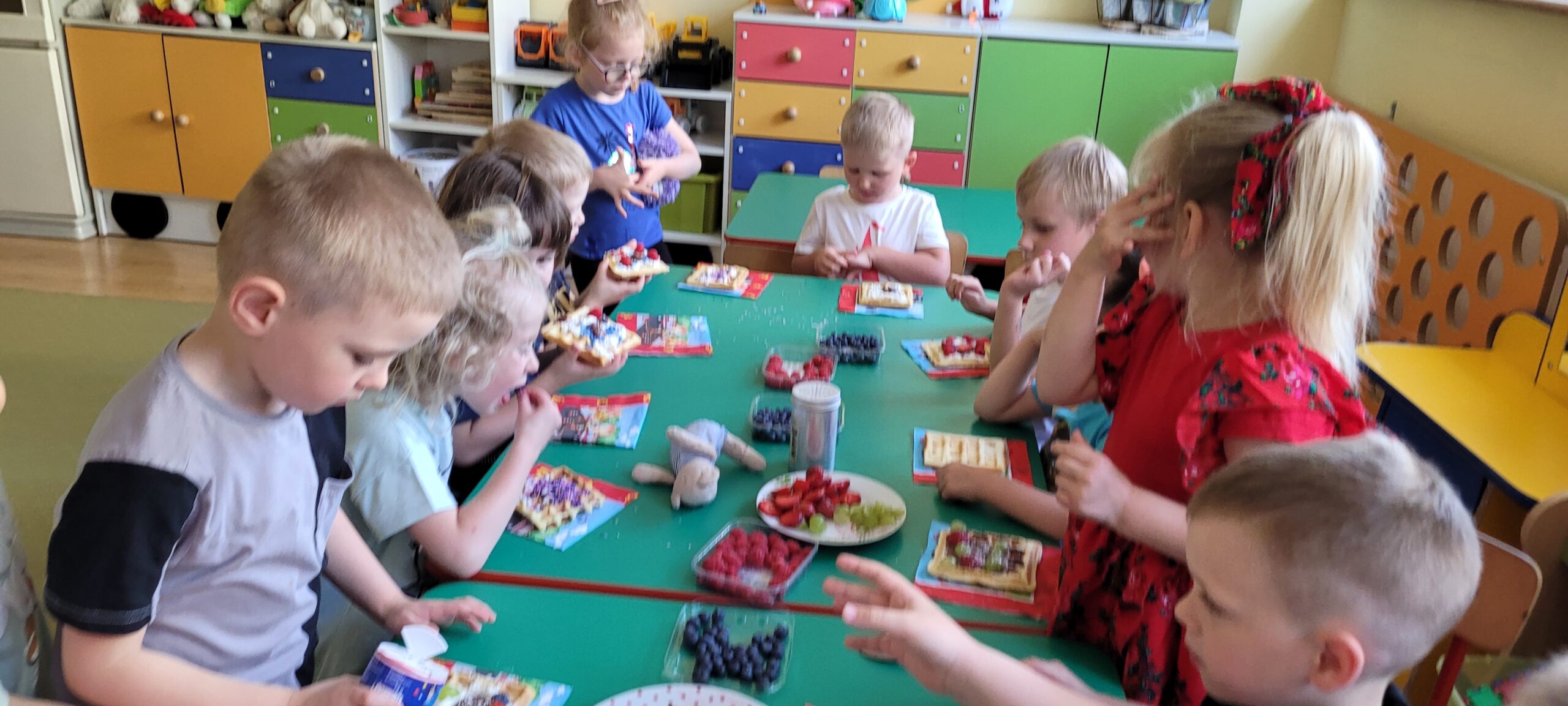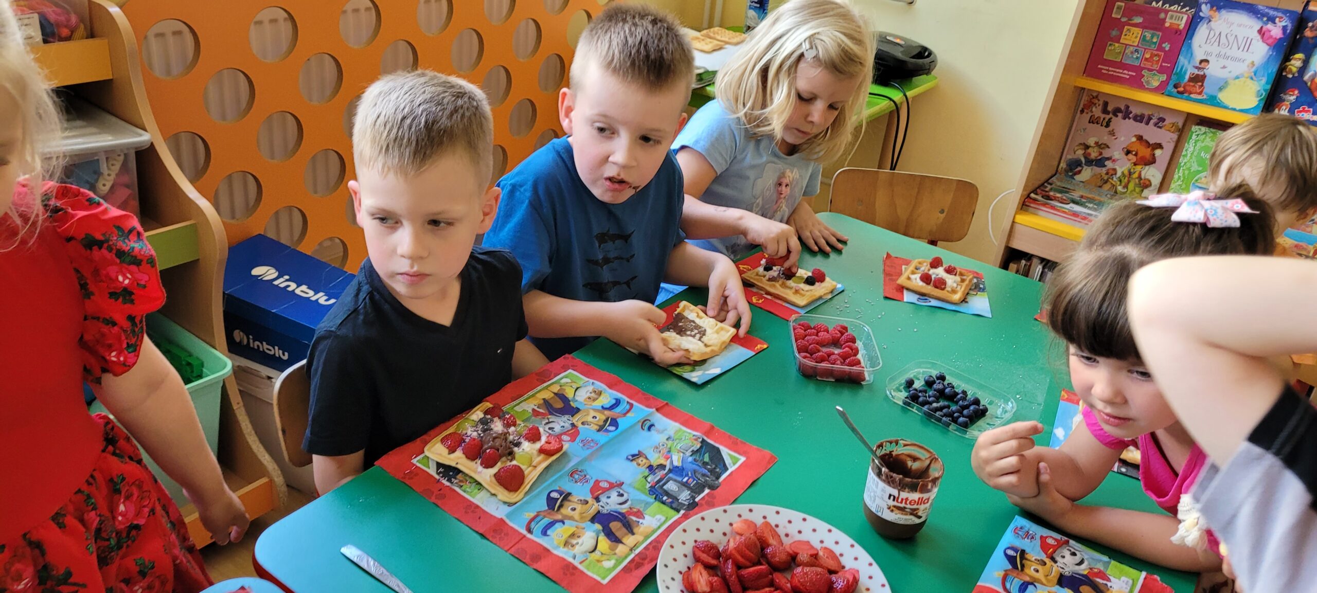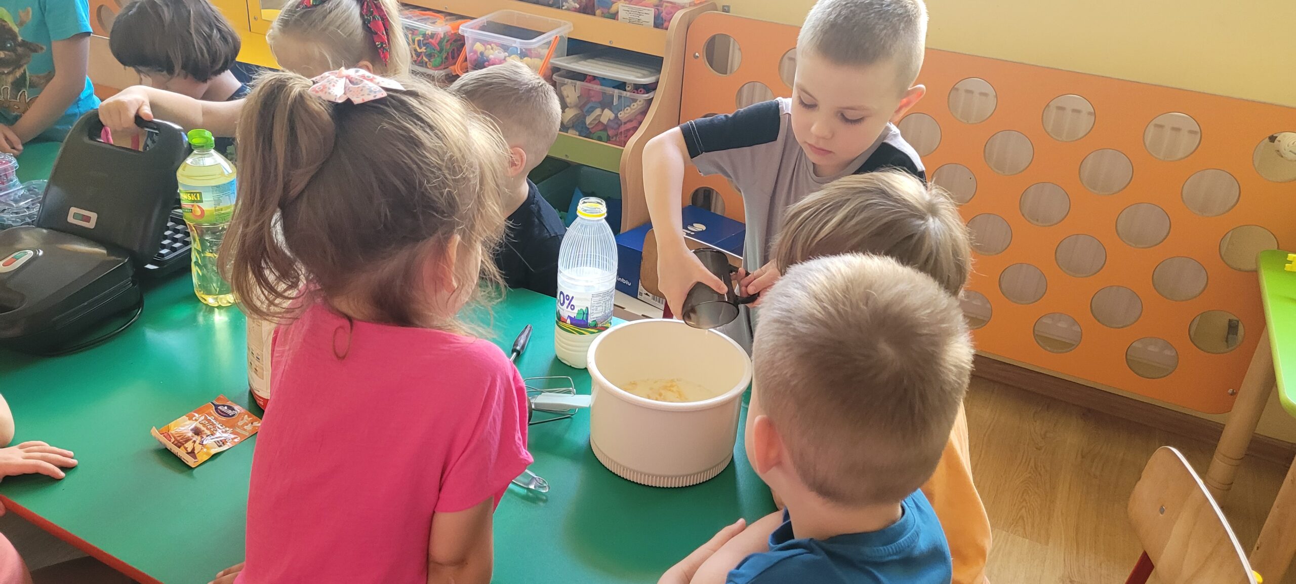 W piątek pięknie zapachniało w naszym przedszkolu, to dzieci z grupy – Żabki przyrządzały pyszne gofry. Dzieci z wielkim zapałem odmierzały składniki, wsypywały do miski i mieszały łyżką oraz używając robota kuchennego. Upieczone gofry były przepyszne!!! Słodkie i smacznie, a głównym dodatkiem do gofrów były owoce, bita śmietana i nutella i cukier puder.