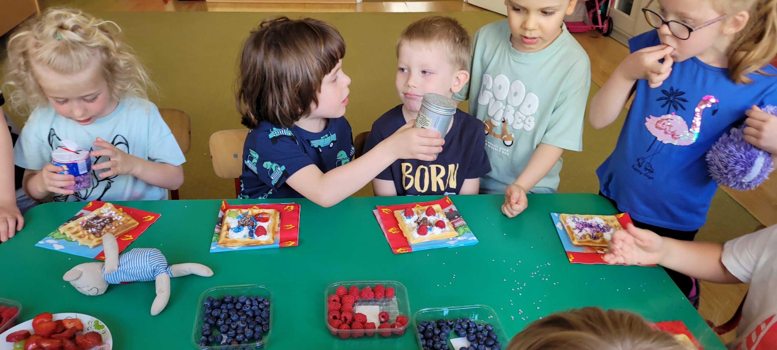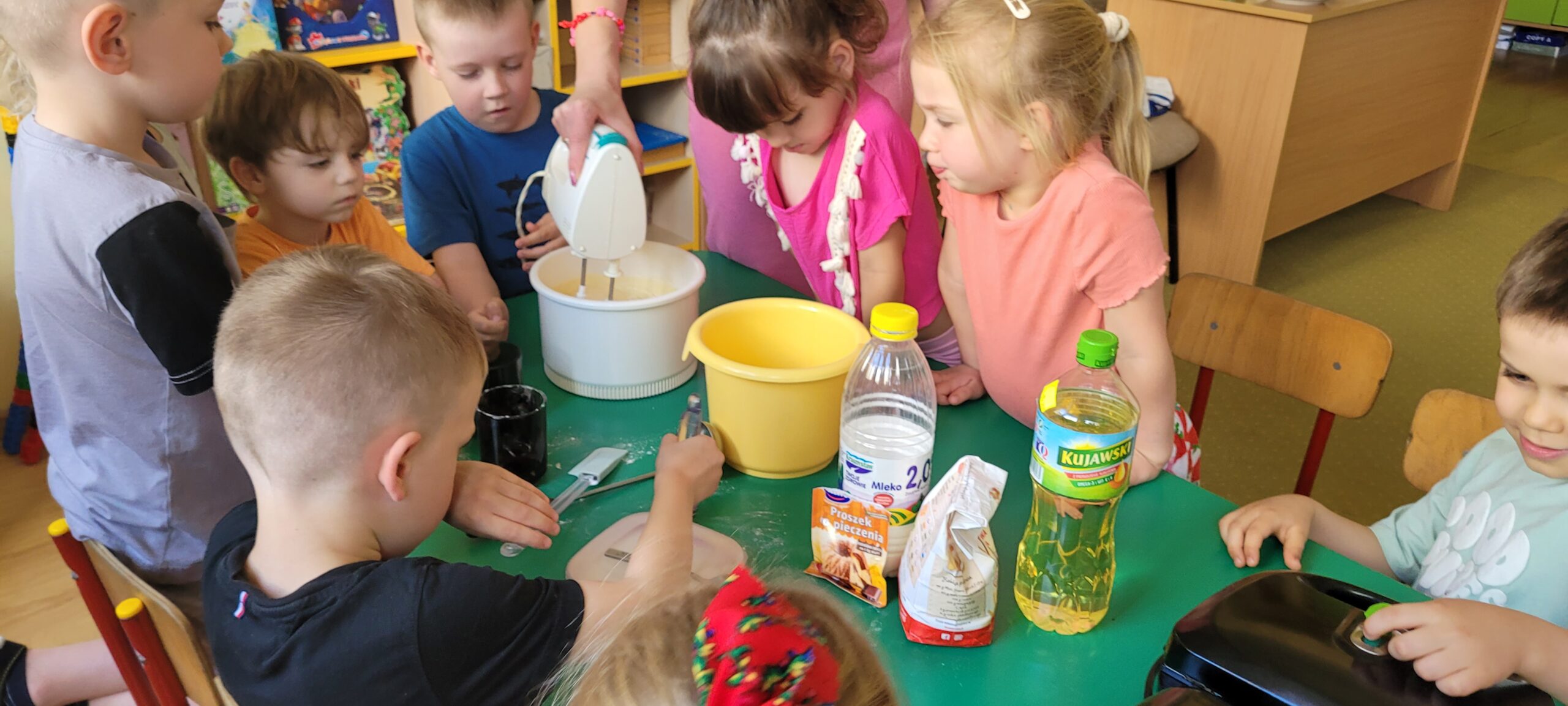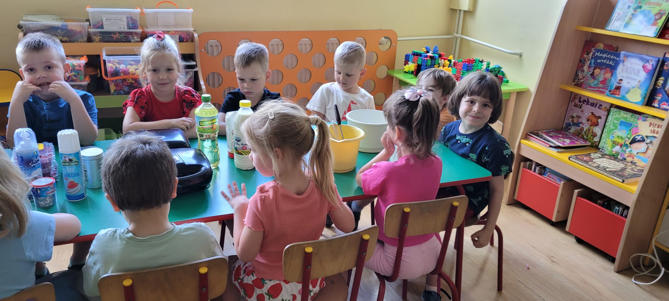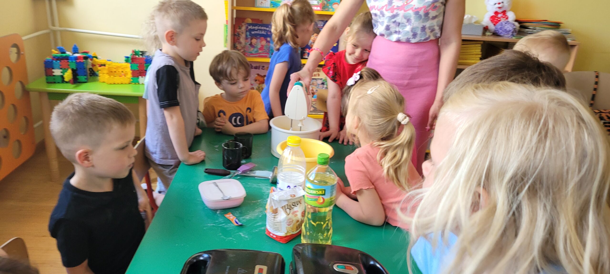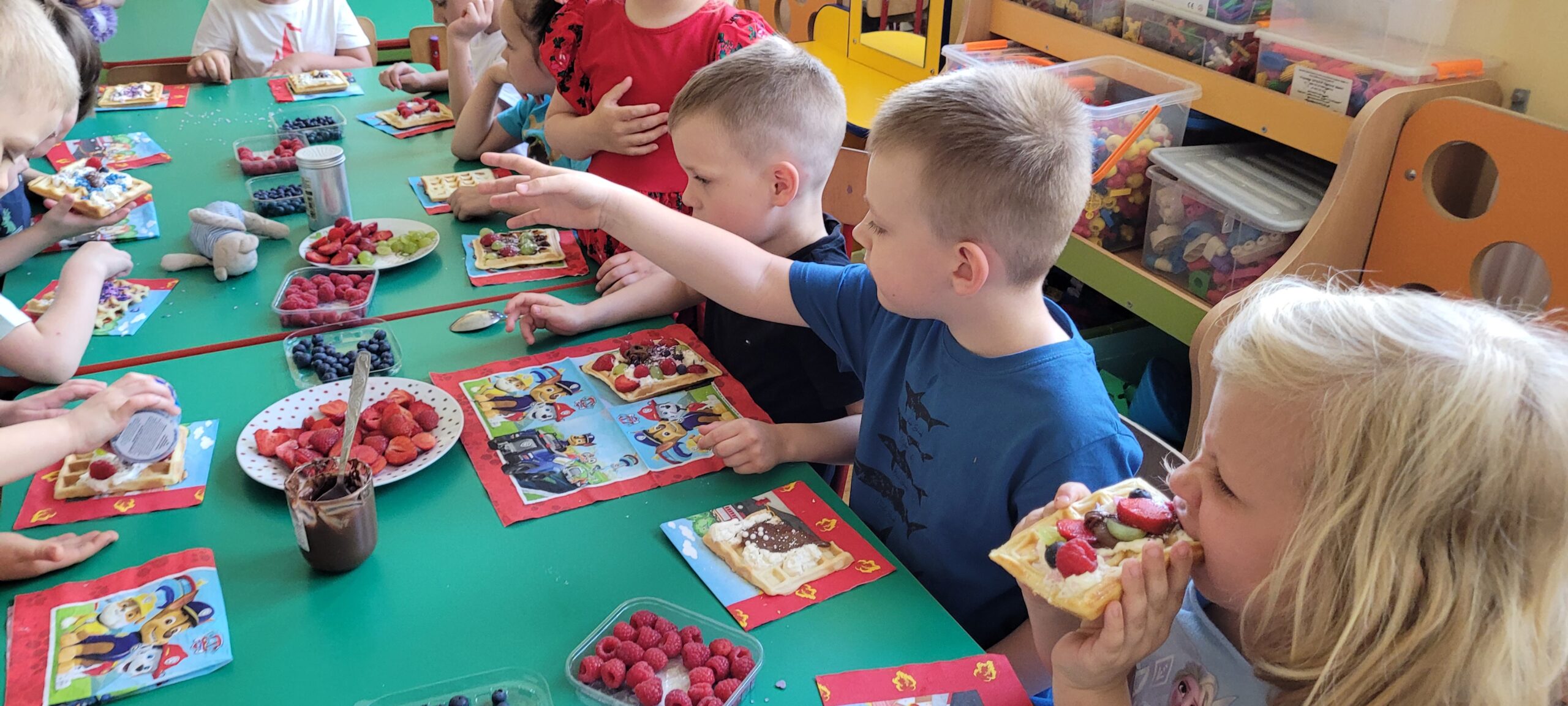 W piątek pięknie zapachniało w naszym przedszkolu, to dzieci z grupy – Żabki przyrządzały pyszne gofry. Dzieci z wielkim zapałem odmierzały składniki, wsypywały do miski i mieszały łyżką oraz używając robota kuchennego. Upieczone gofry były przepyszne!!! Słodkie i smacznie, a głównym dodatkiem do gofrów były owoce, bita śmietana i nutella i cukier puder.