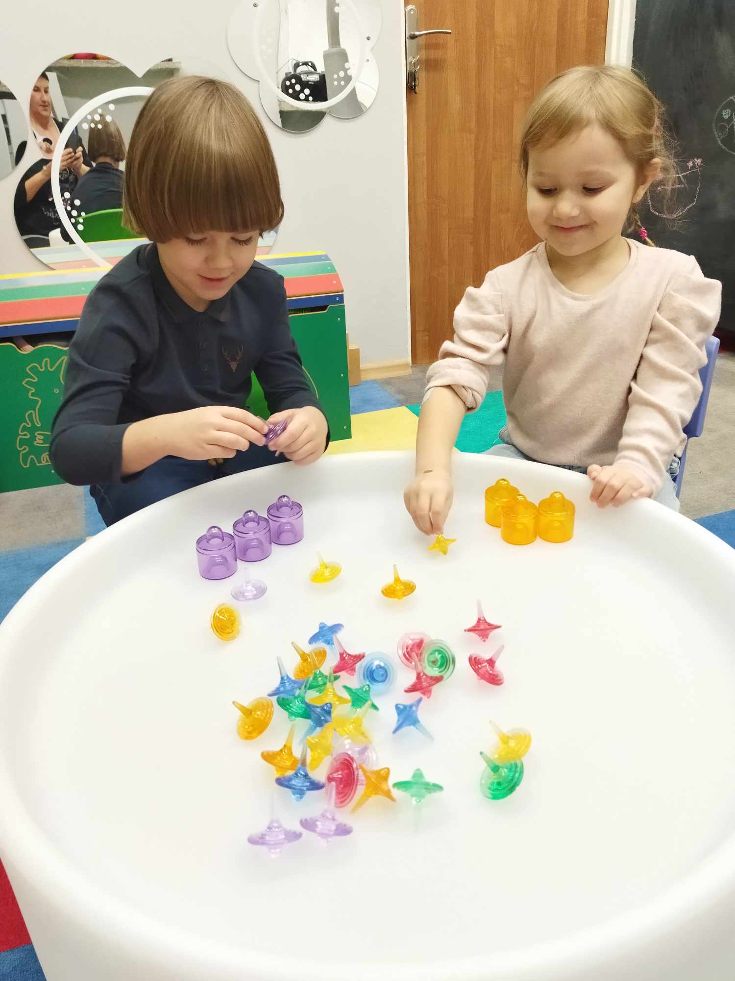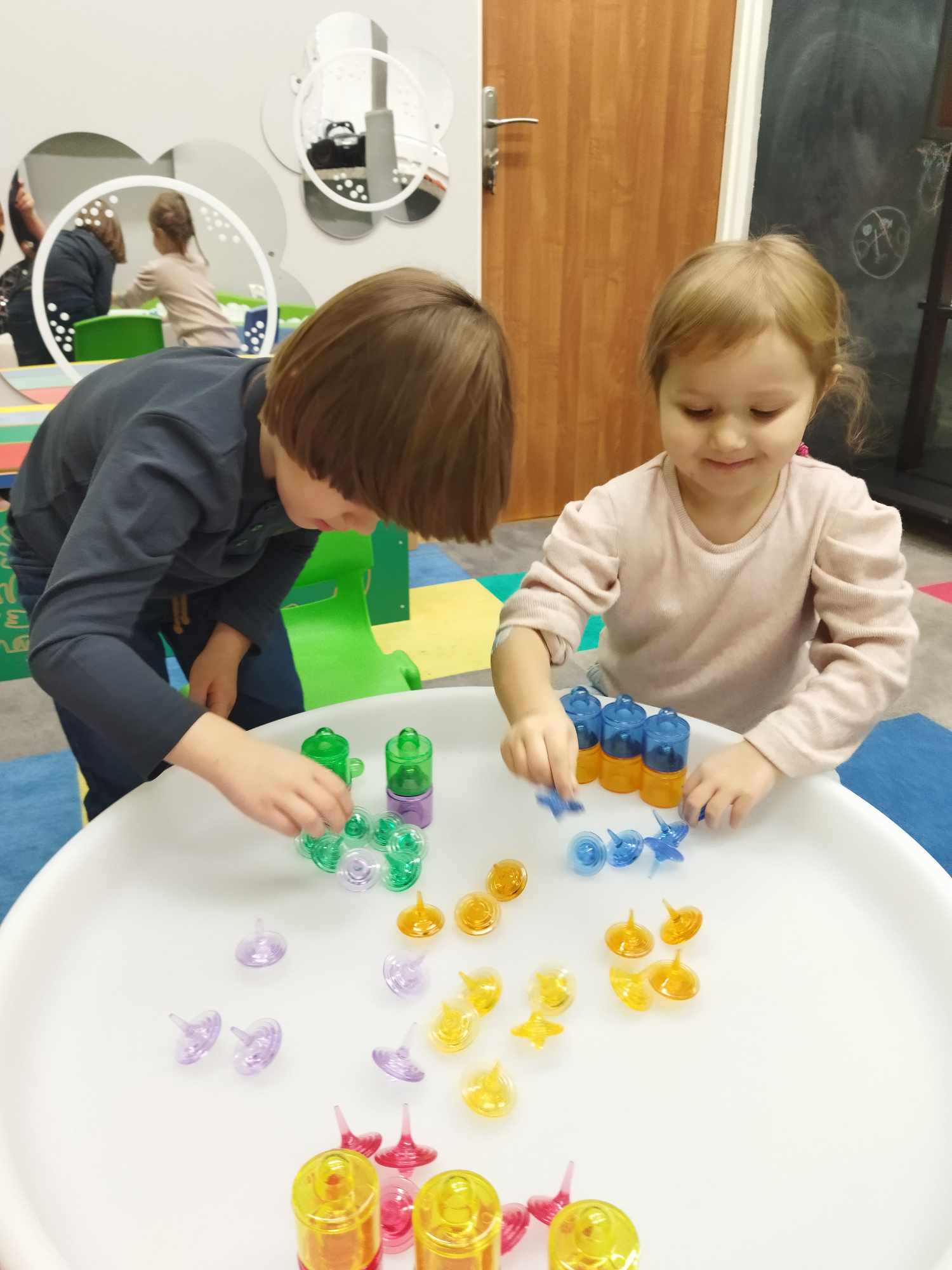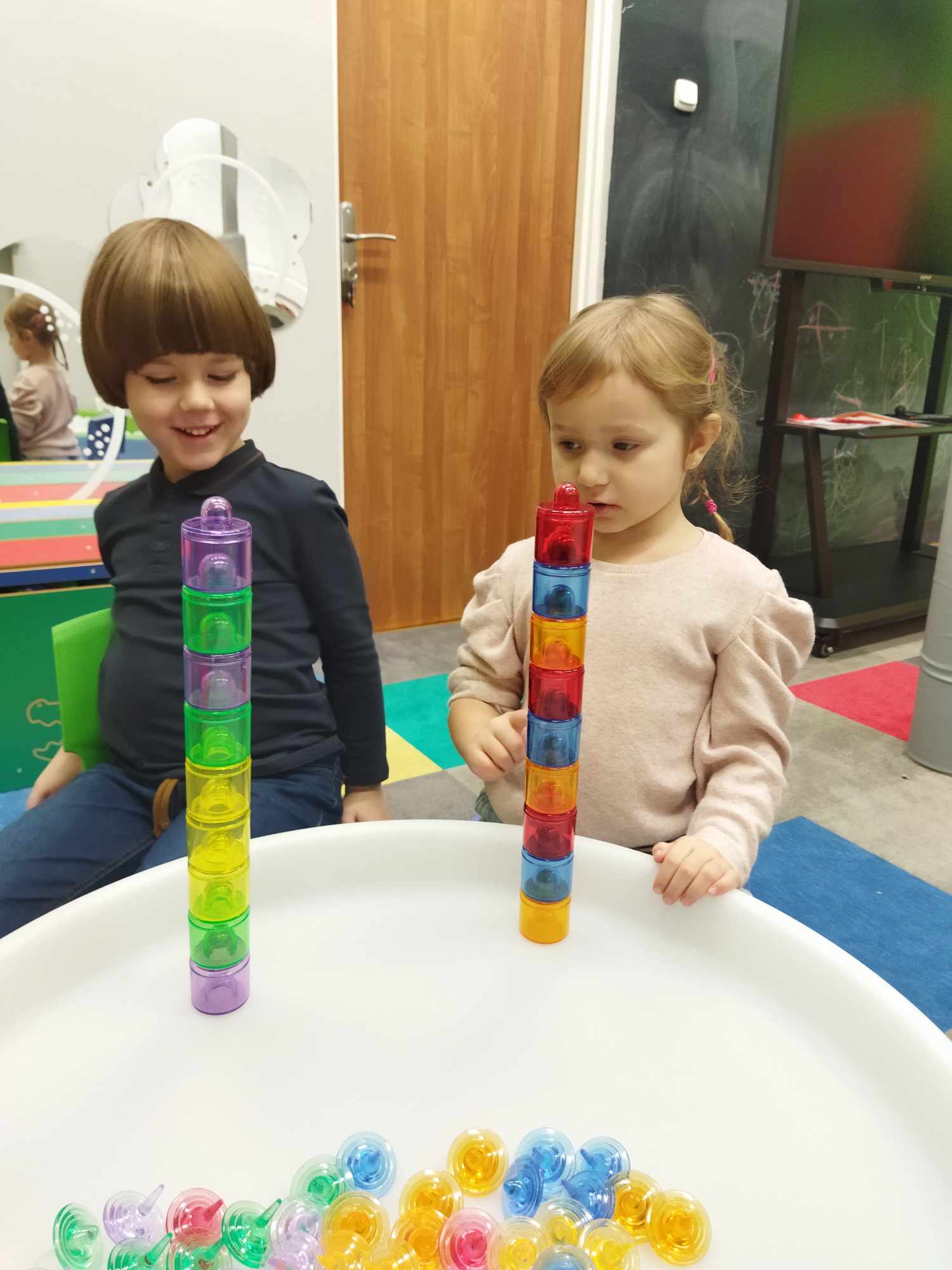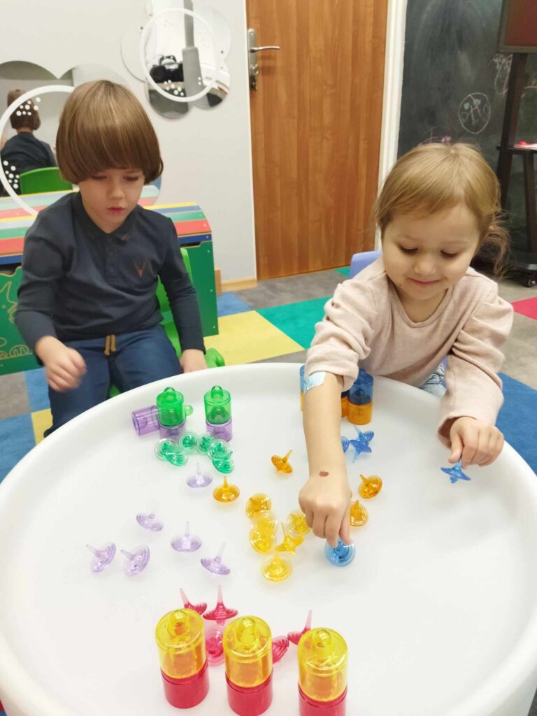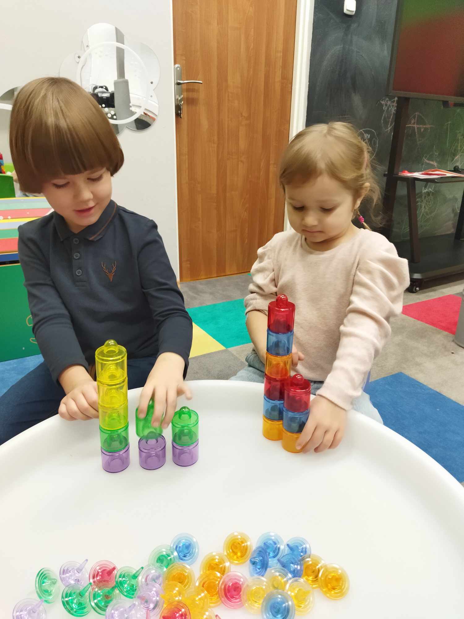 Dzieci z wielkim zaangażowaniem uczestniczą w zajęciach rozwiązując zadania o różnym poziomie trudności.