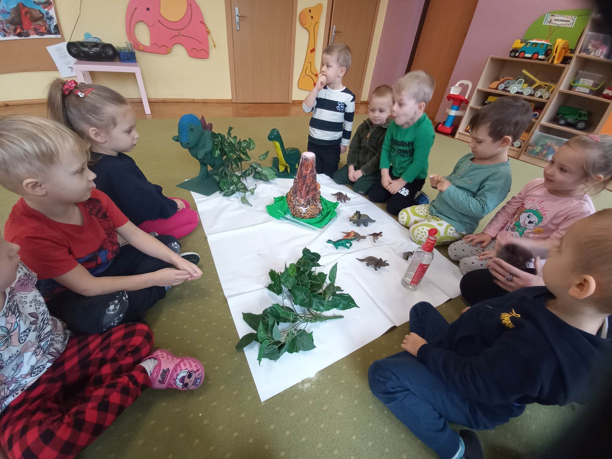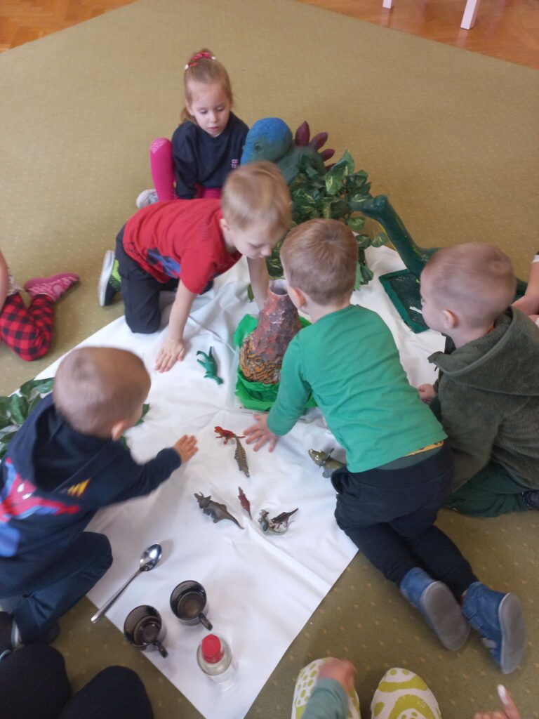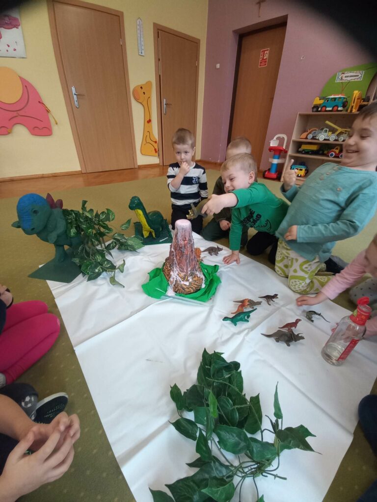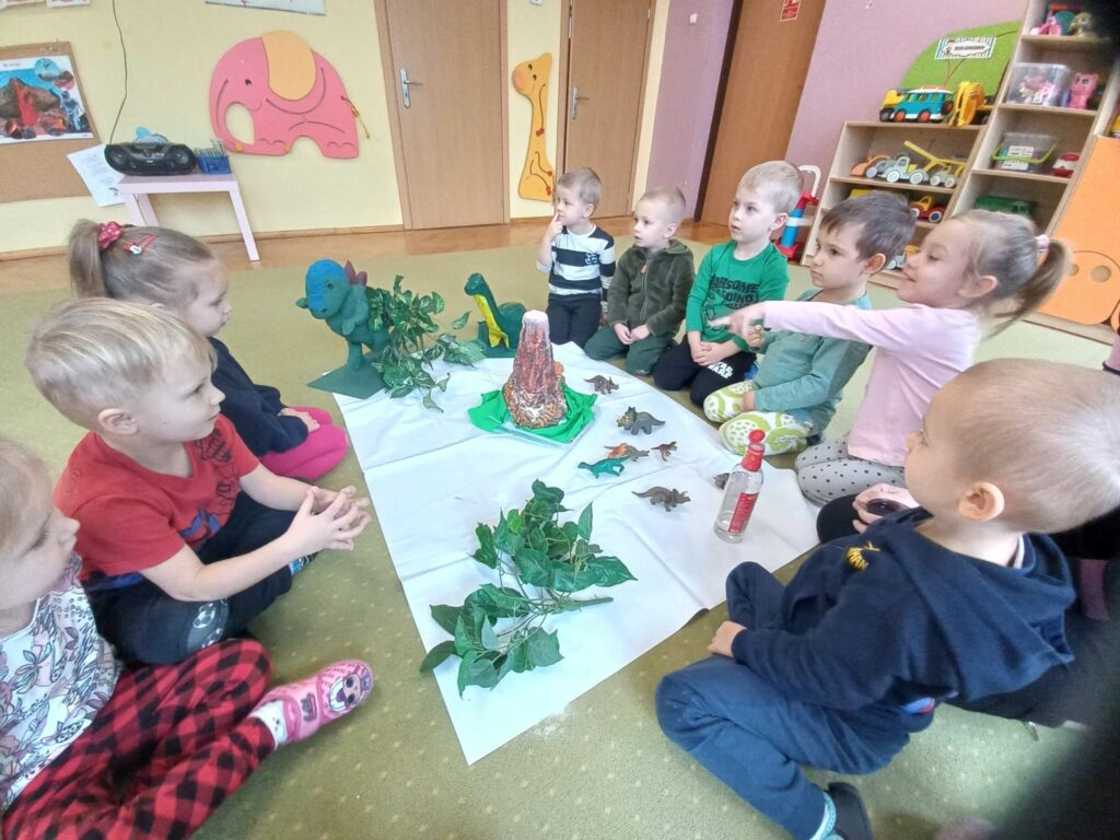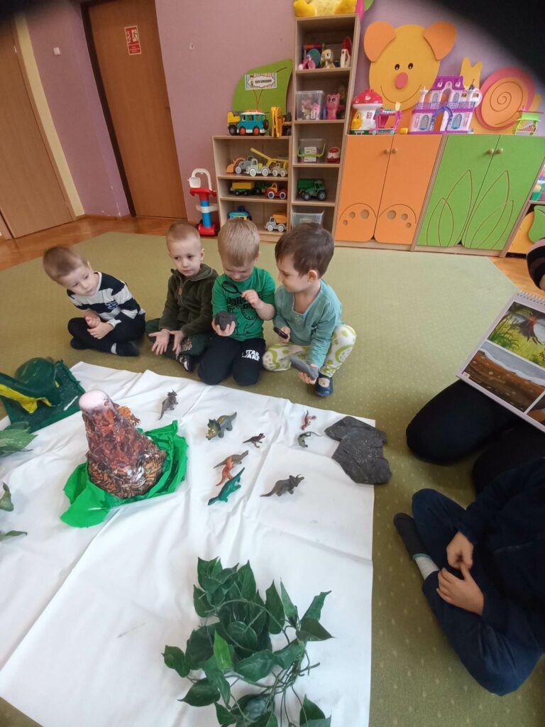 Dzieci z grupy „Słoneczka” rozmawiały o zwyczajach i losie dinozaurów. Na początku wysłuchaliśmy utworu H. Zdzitowieckiej pt. „O czym szeptały iskierki?”. Przedszkolaki dowiedziały się skąd pochodzi węgiel oraz do czego w dzisiejszych czasach jest wykorzystywany. Dzieci oglądały różne odmiany węgla, dotykały eksponaty, określały ich cechy zewnętrzne Wspólnie zrobiliśmy eksperyment- wybuch wulkanu. Jako pracę plastyczną wykonaliśmy dinozaury z papierowych talerzyków. Maluchy poznały także jak wygląda praca górników w kopalni.