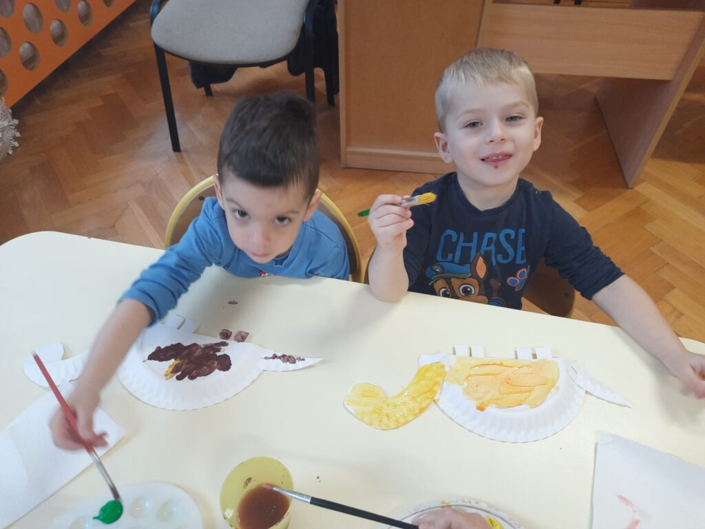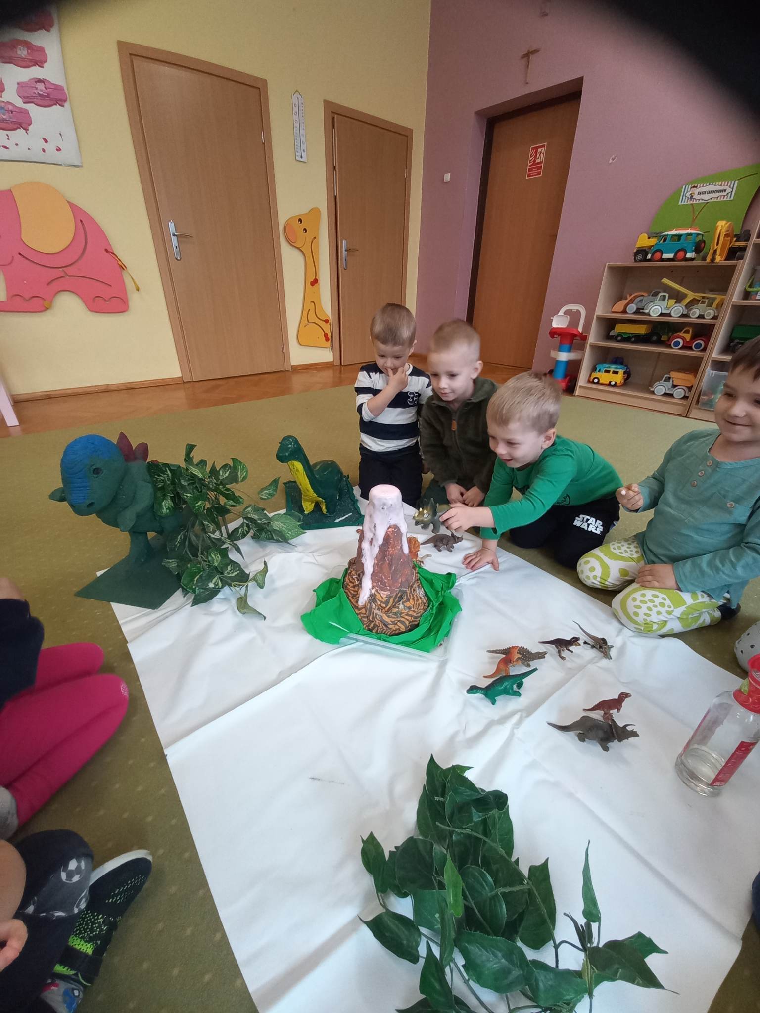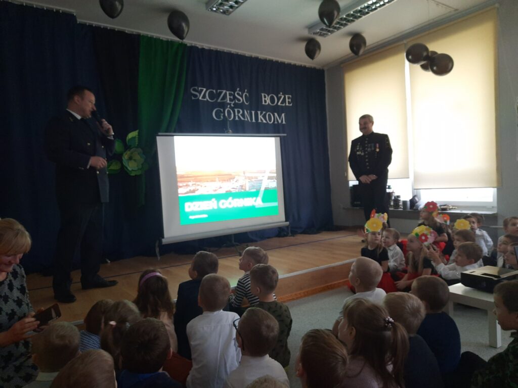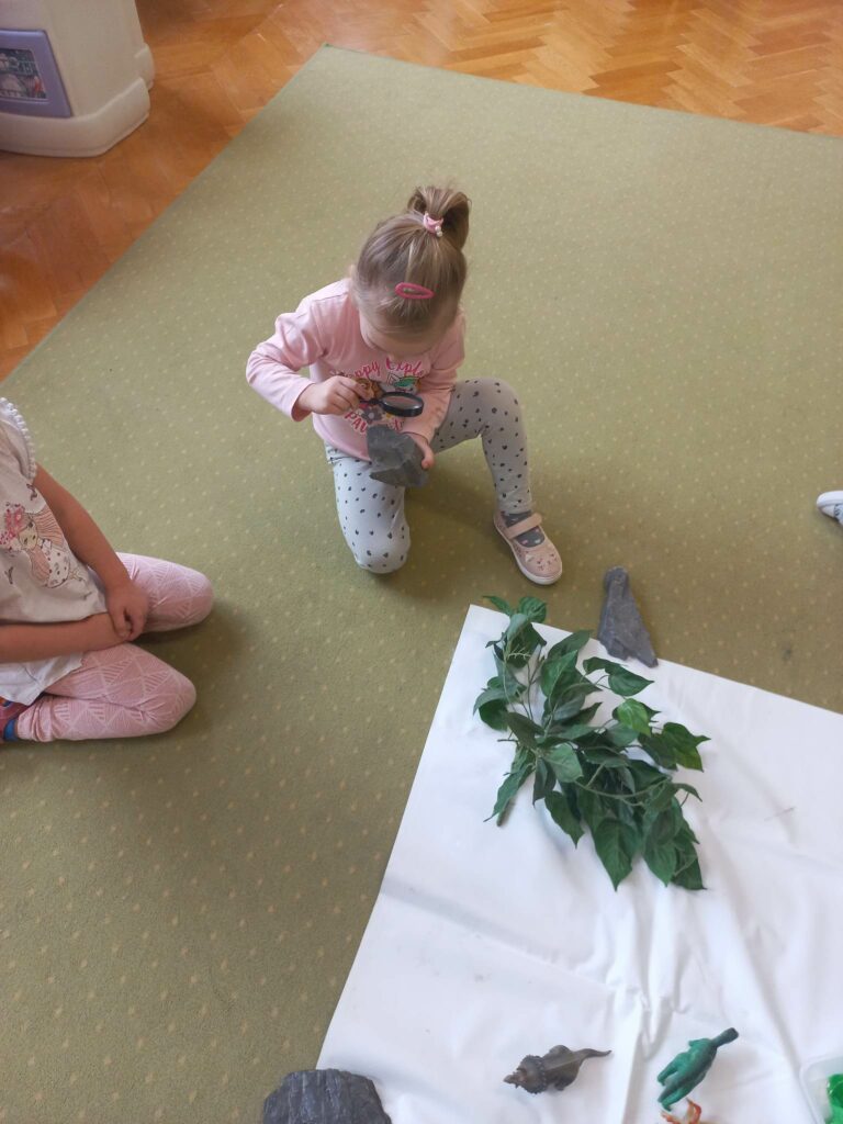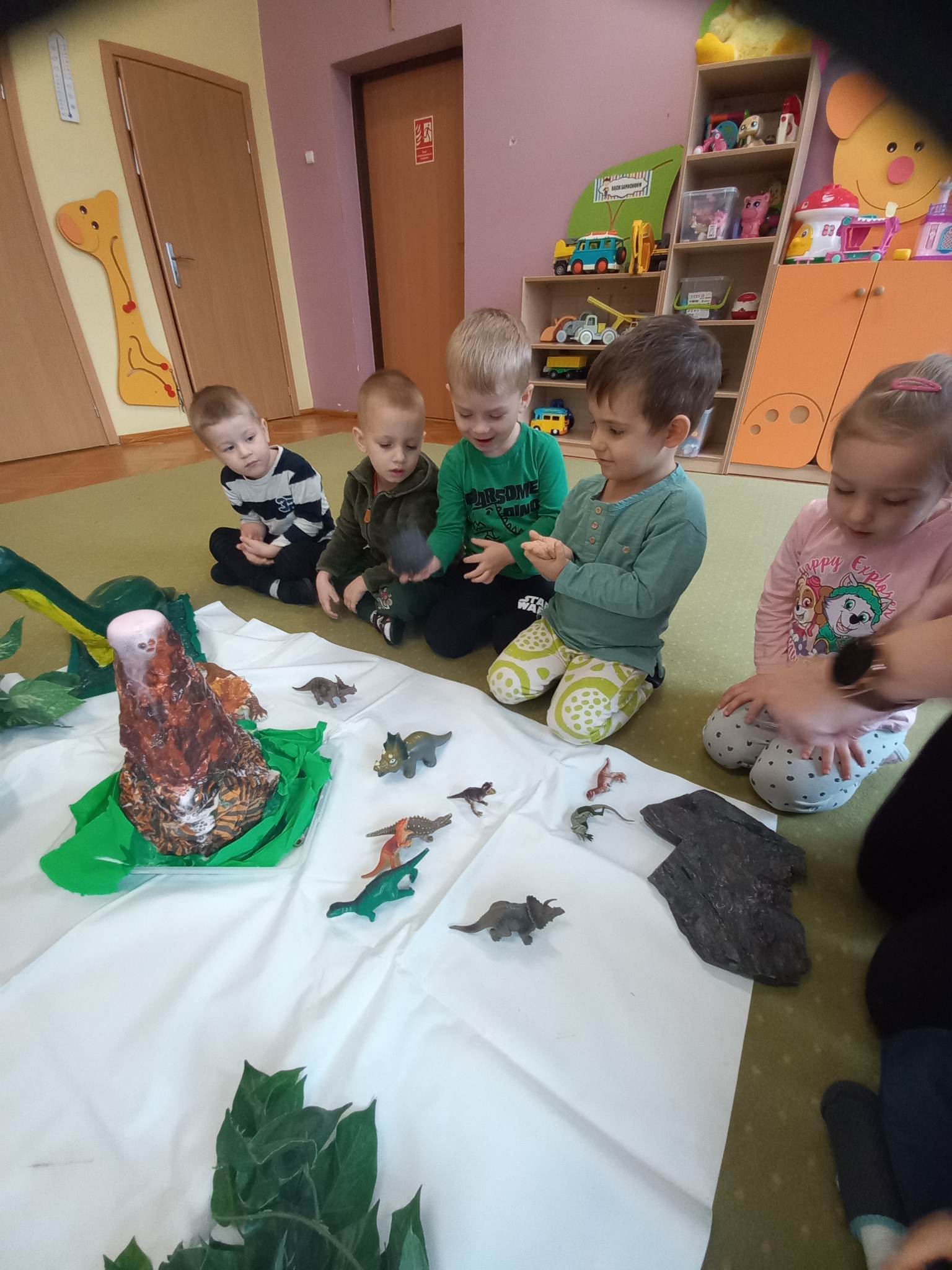 Dzieci z grupy „Słoneczka” rozmawiały o zwyczajach i losie dinozaurów. Na początku wysłuchaliśmy utworu H. Zdzitowieckiej pt. „O czym szeptały iskierki?”. Przedszkolaki dowiedziały się skąd pochodzi węgiel oraz do czego w dzisiejszych czasach jest wykorzystywany. Dzieci oglądały różne odmiany węgla, dotykały eksponaty, określały ich cechy zewnętrzne Wspólnie zrobiliśmy eksperyment- wybuch wulkanu. Jako pracę plastyczną wykonaliśmy dinozaury z papierowych talerzyków. Maluchy poznały także jak wygląda praca górników w kopalni.