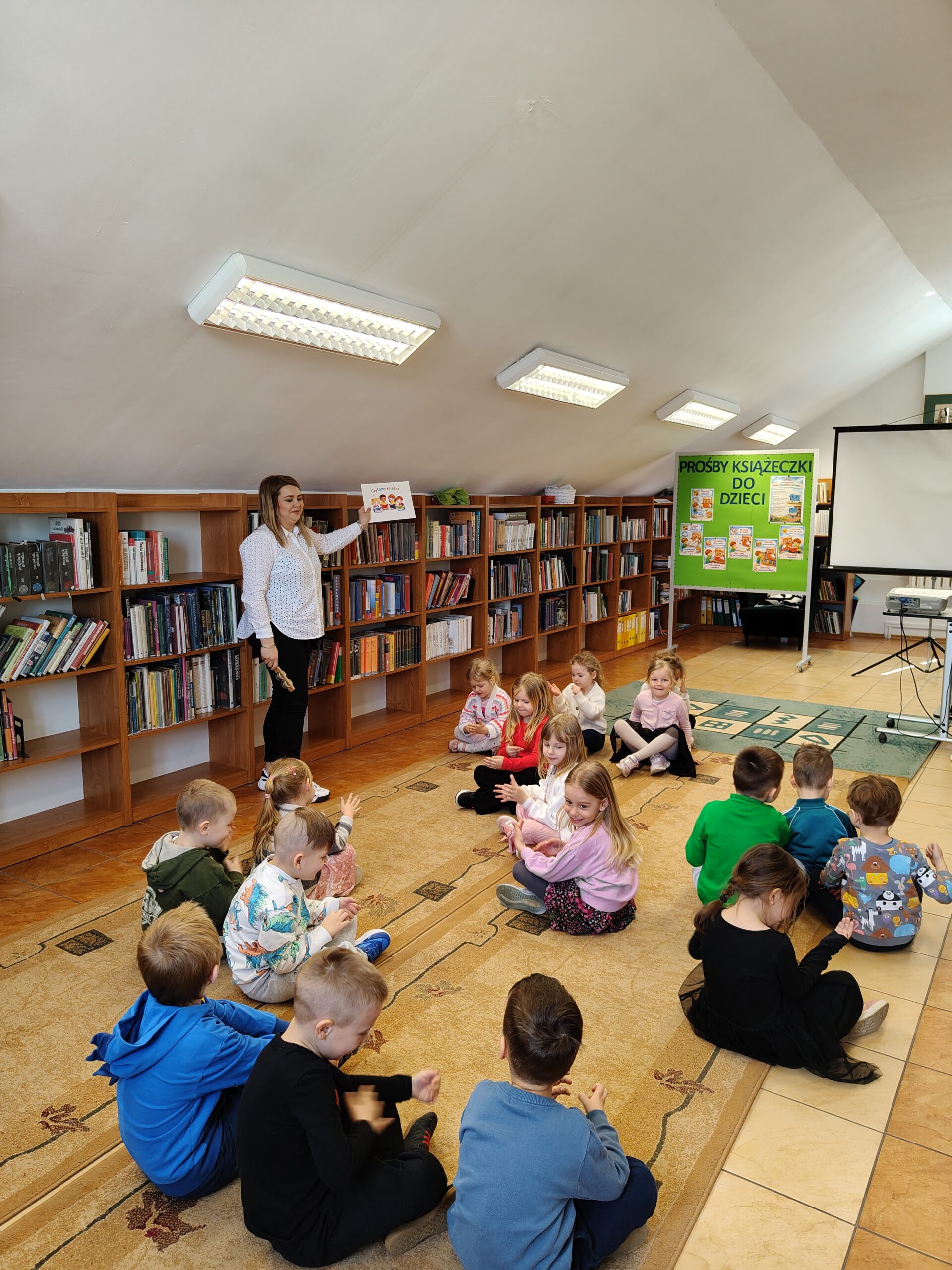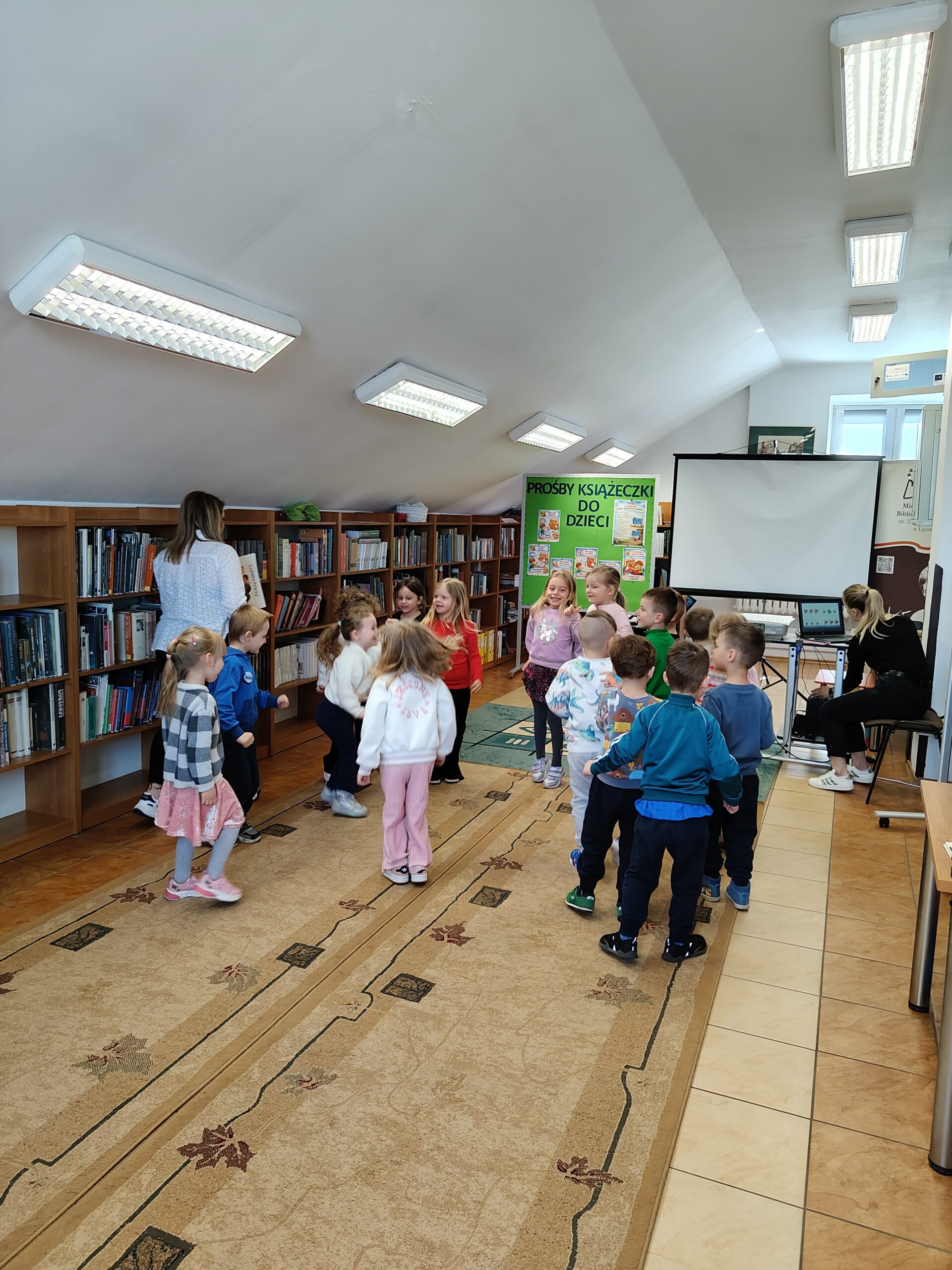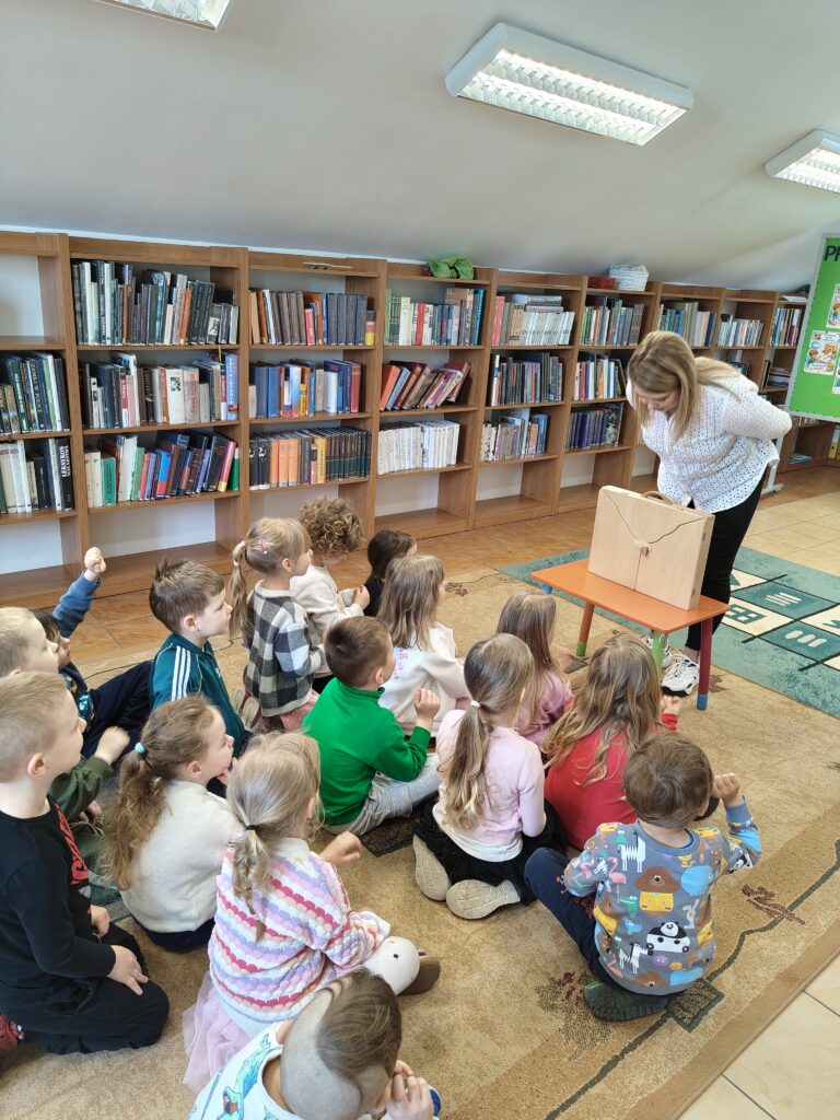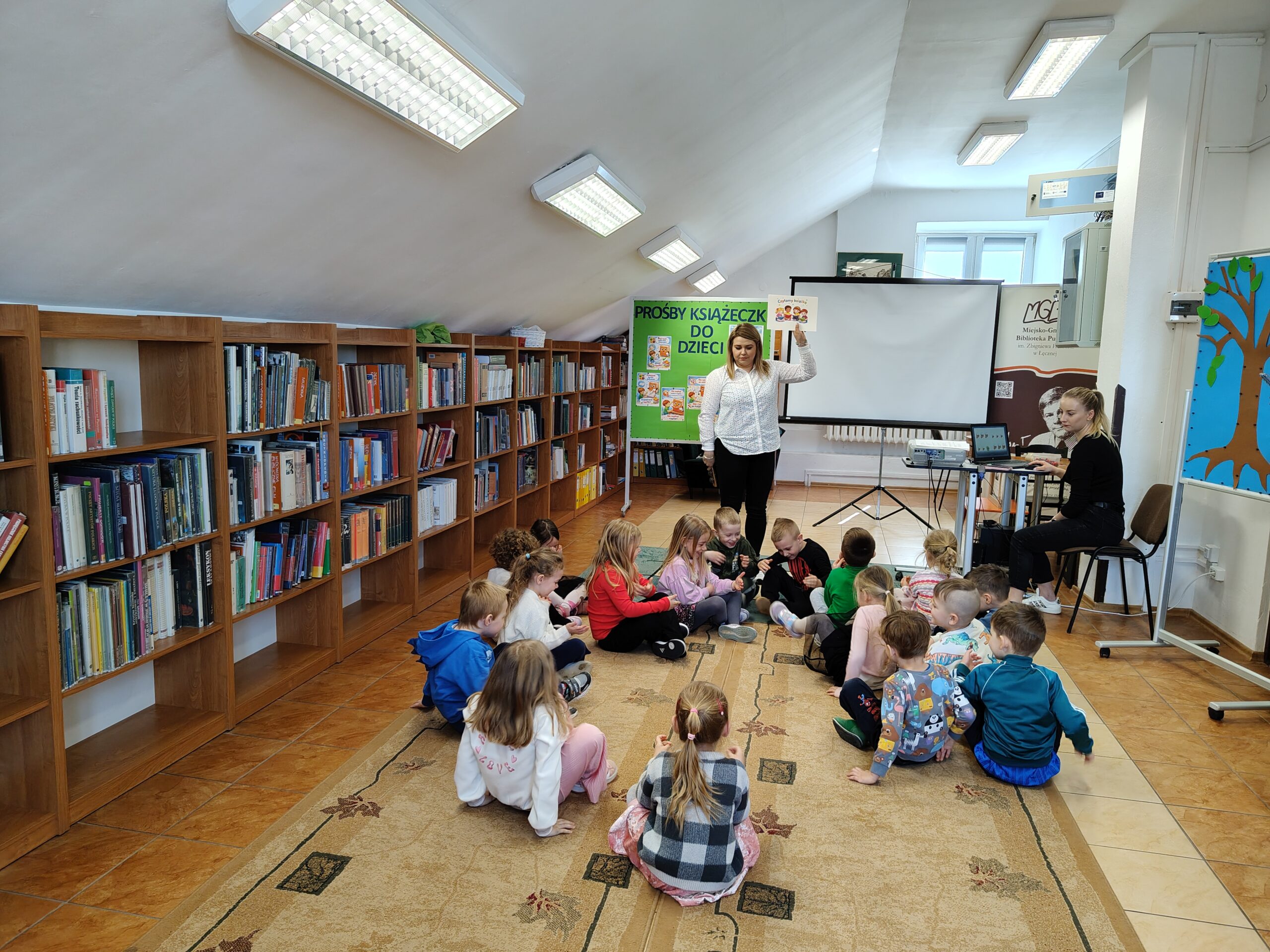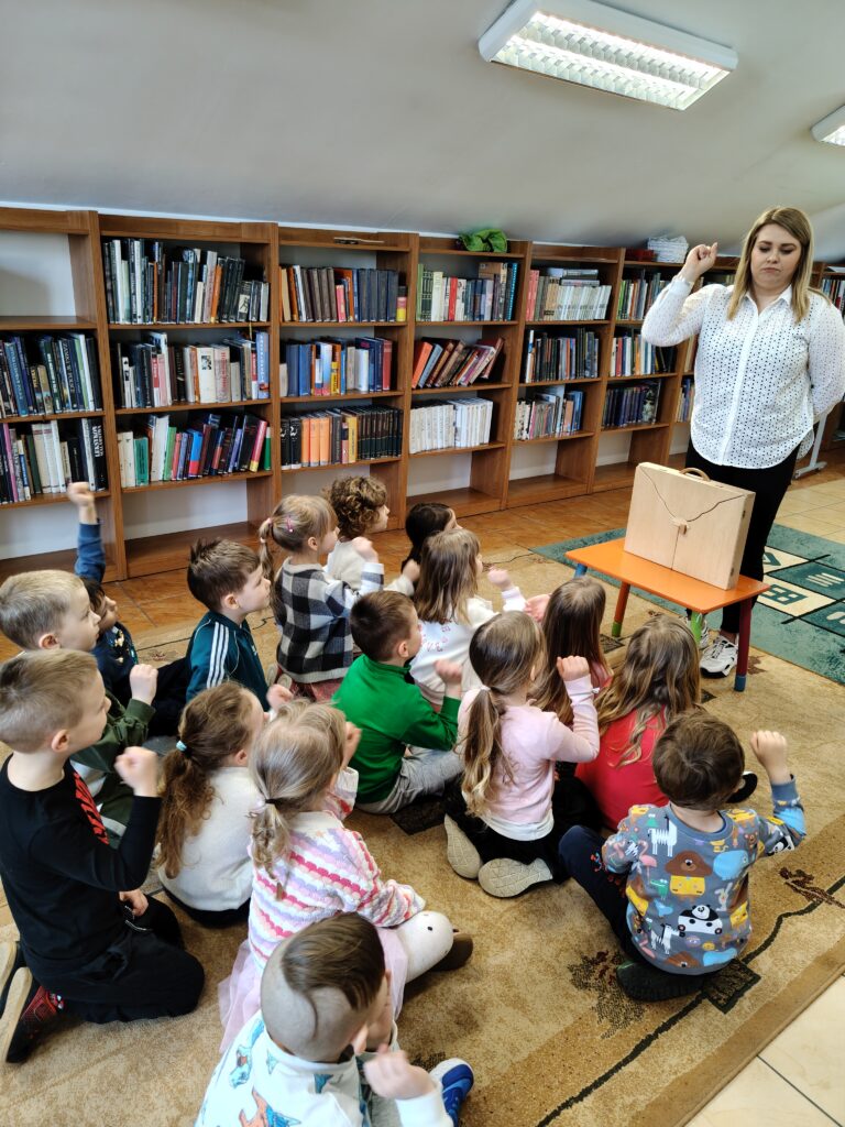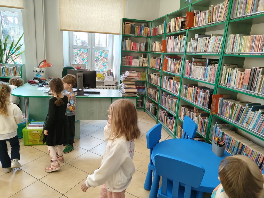 Pszczółki wybrały się na pieszą wycieczkę do Miejsko-Gminnej Biblioteki Publicznej przy ul. Bożnicznej w Łęcznej. Spotkanie odbyło się z okazji zbliżającego się Światowego Dnia Książki. Przedszkolaki zapoznały się z zasadami korzystania z książek – „Prośby książki do dzieci”, rozwiązywały zagadki dotyczące bohaterów literatury dziecięcej, wzięły udział w zabawach muzyczno-ruchowych oraz obejrzały bajeczkę o kotku w bibliotece. Dzieci miały okazję zobaczyć największą i najmniejszą książkę w bibliotece, a także książkę najgrubszą, przestrzenną oraz książkę szytą z filcu. Przedszkolaki obejrzały teatrzyk Kamishibai „Calineczka”. Pszczółki odwiedziły również Oddział dla dzieci, który jest pełen wspaniałych pozycji dla dzieci w różnym wieku. Bardzo dziękujemy pracownikom MGBP, a szczególnie pani Karolinie za miłe przyjęcie i ciekawe zajęcia edukacyjne.