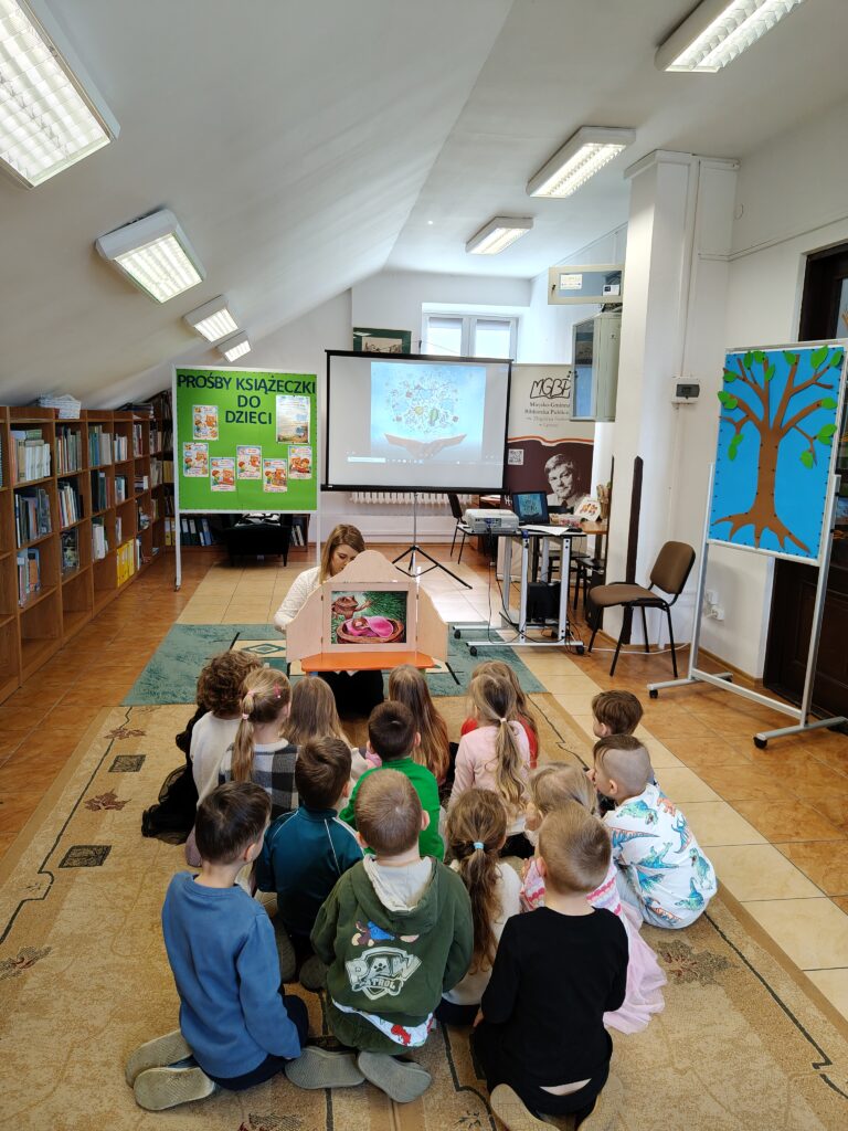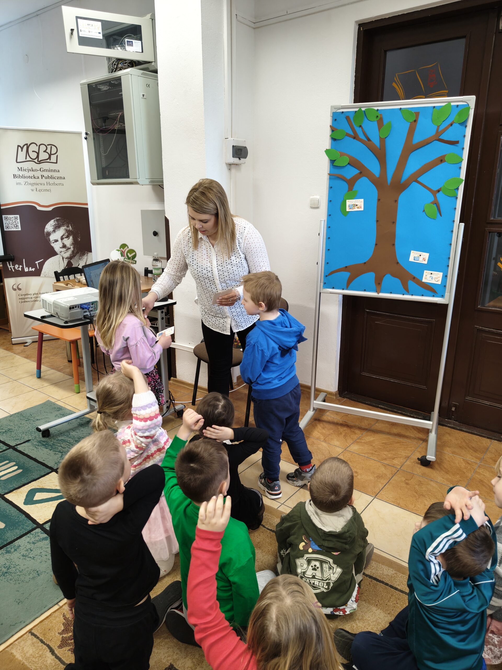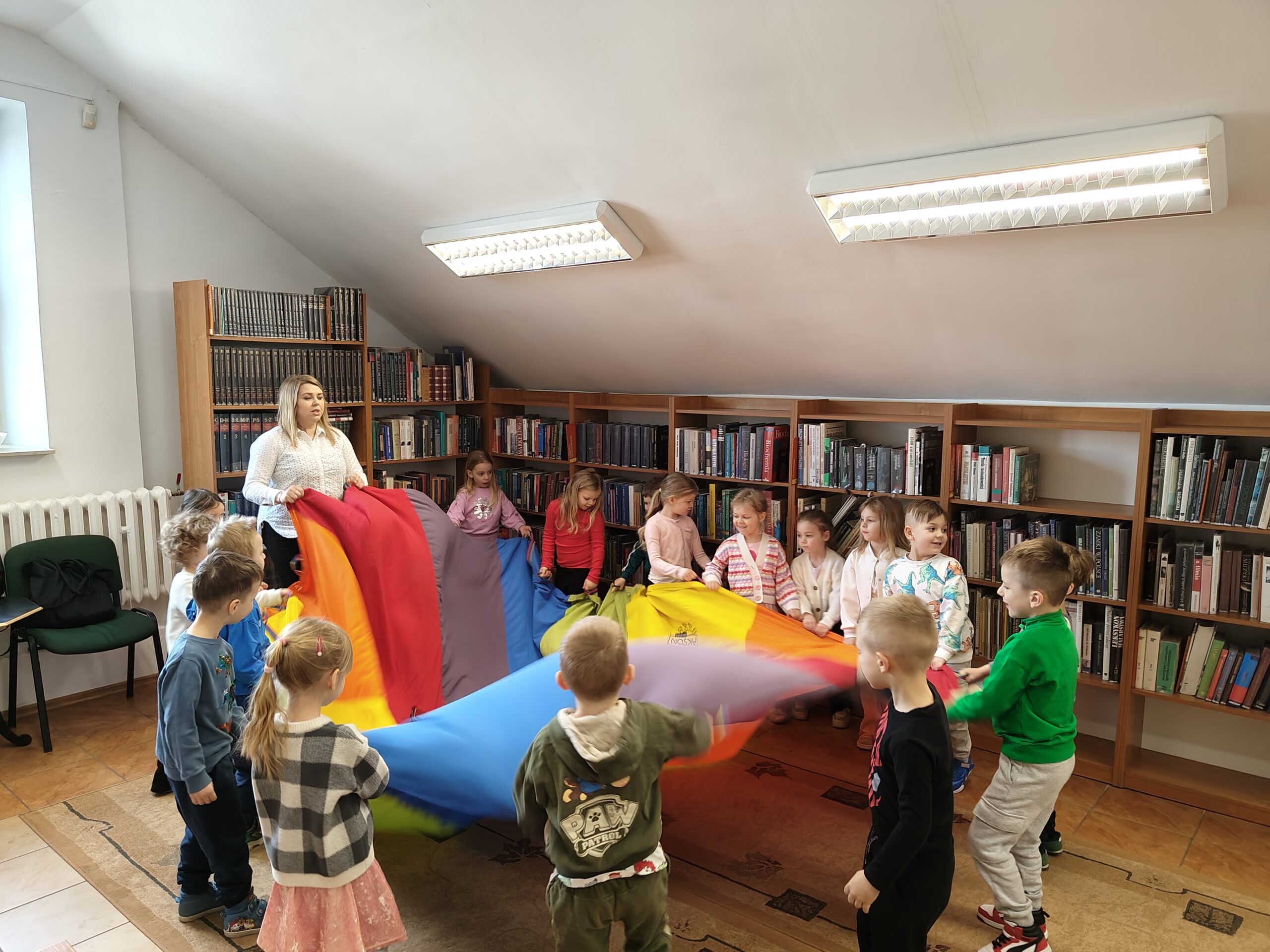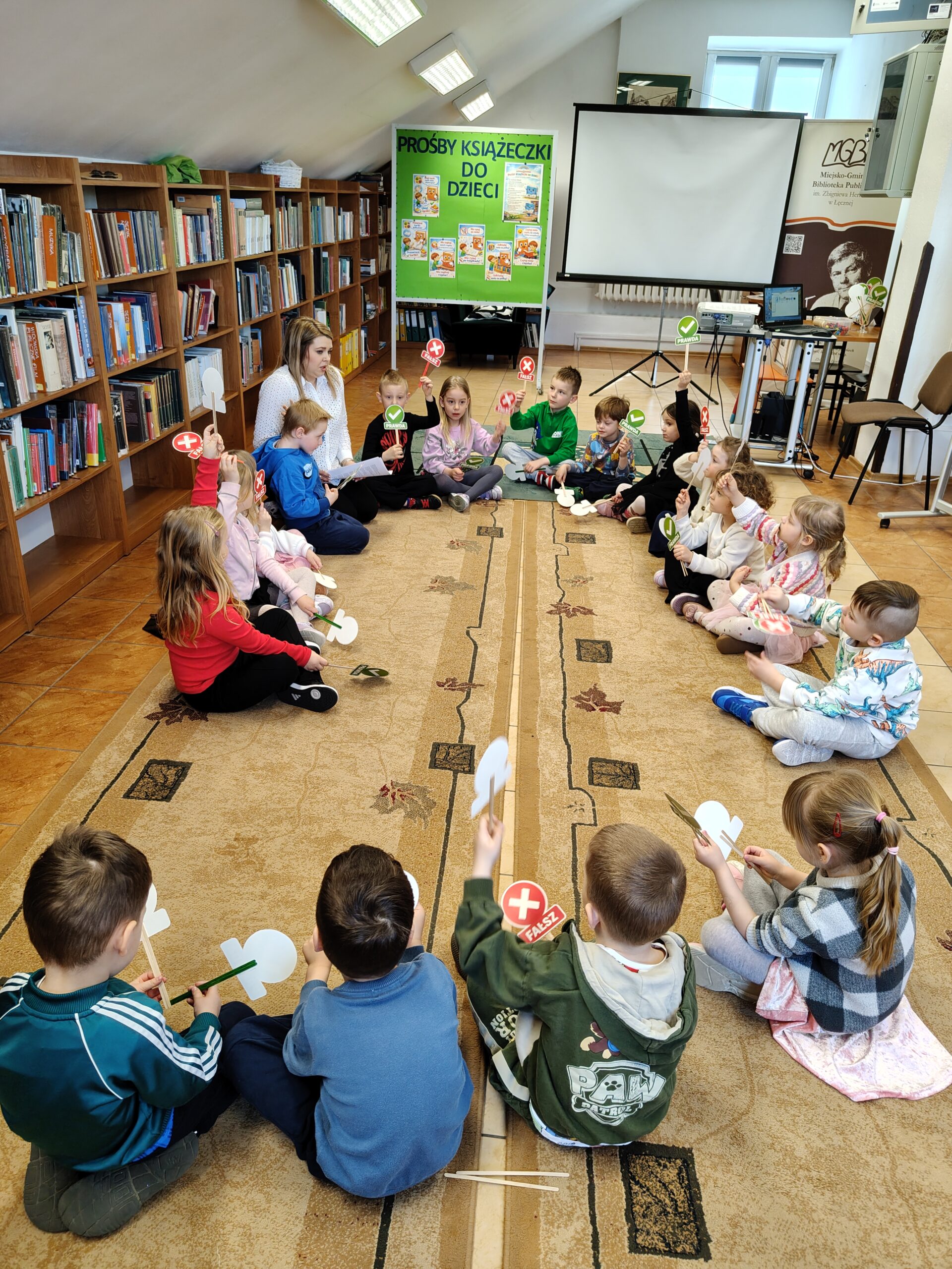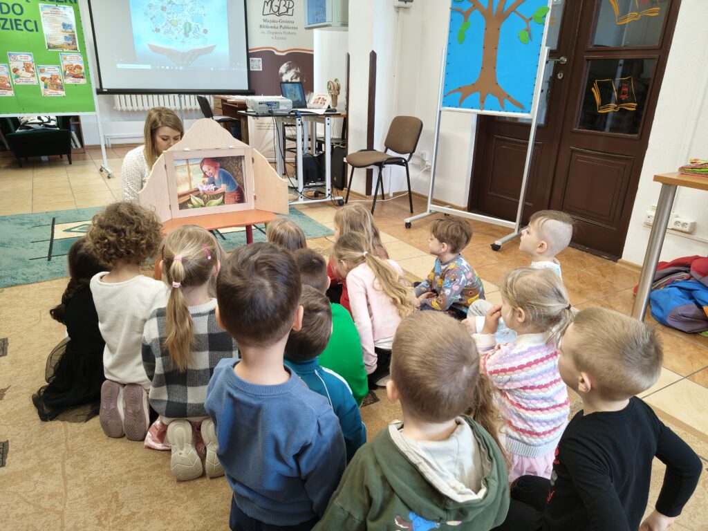 Pszczółki wybrały się na pieszą wycieczkę do Miejsko-Gminnej Biblioteki Publicznej przy ul. Bożnicznej w Łęcznej. Spotkanie odbyło się z okazji zbliżającego się Światowego Dnia Książki. Przedszkolaki zapoznały się z zasadami korzystania z książek – „Prośby książki do dzieci”, rozwiązywały zagadki dotyczące bohaterów literatury dziecięcej, wzięły udział w zabawach muzyczno-ruchowych oraz obejrzały bajeczkę o kotku w bibliotece. Dzieci miały okazję zobaczyć największą i najmniejszą książkę w bibliotece, a także książkę najgrubszą, przestrzenną oraz książkę szytą z filcu. Przedszkolaki obejrzały teatrzyk Kamishibai „Calineczka”. Pszczółki odwiedziły również Oddział dla dzieci, który jest pełen wspaniałych pozycji dla dzieci w różnym wieku. Bardzo dziękujemy pracownikom MGBP, a szczególnie pani Karolinie za miłe przyjęcie i ciekawe zajęcia edukacyjne.