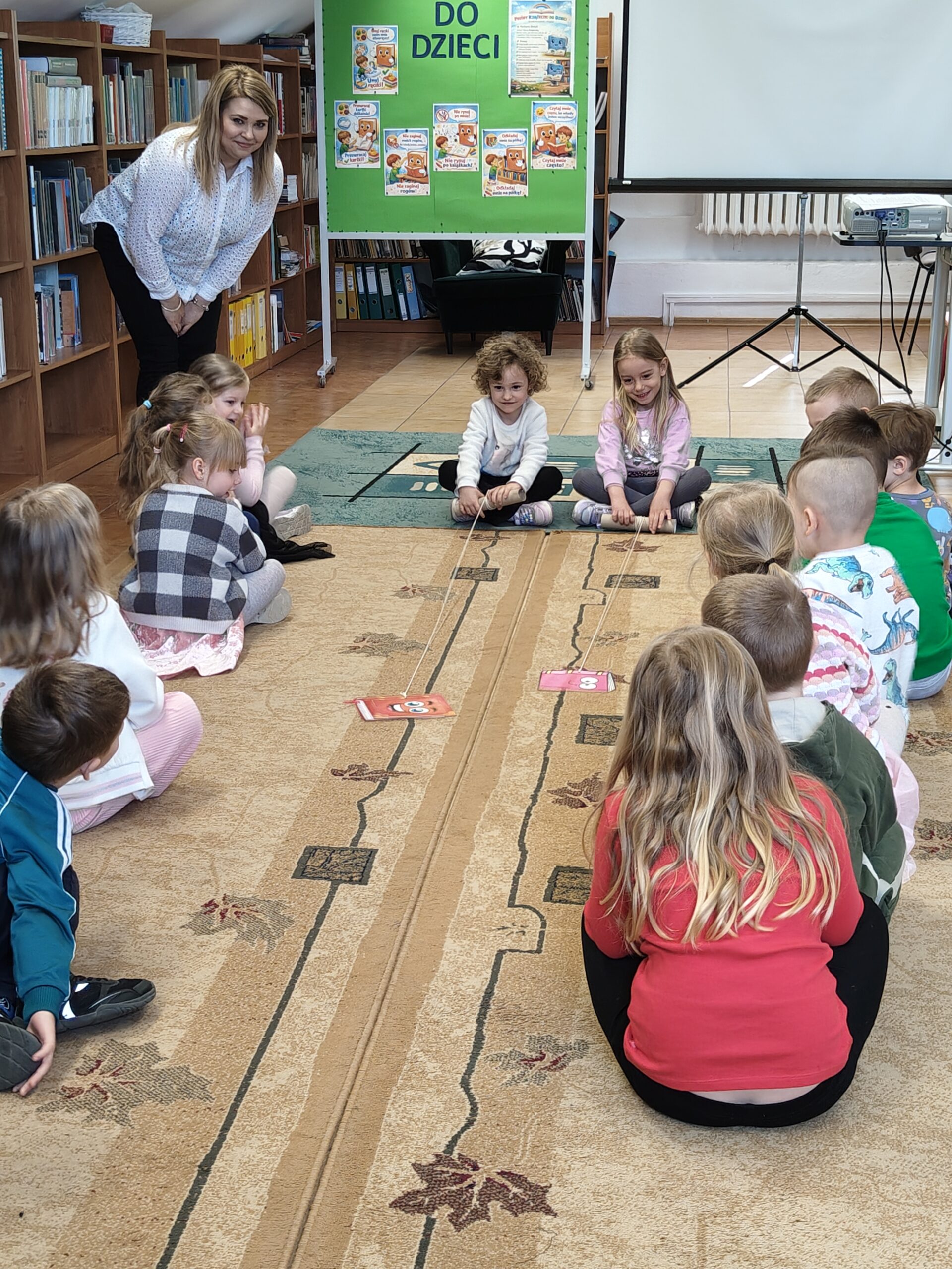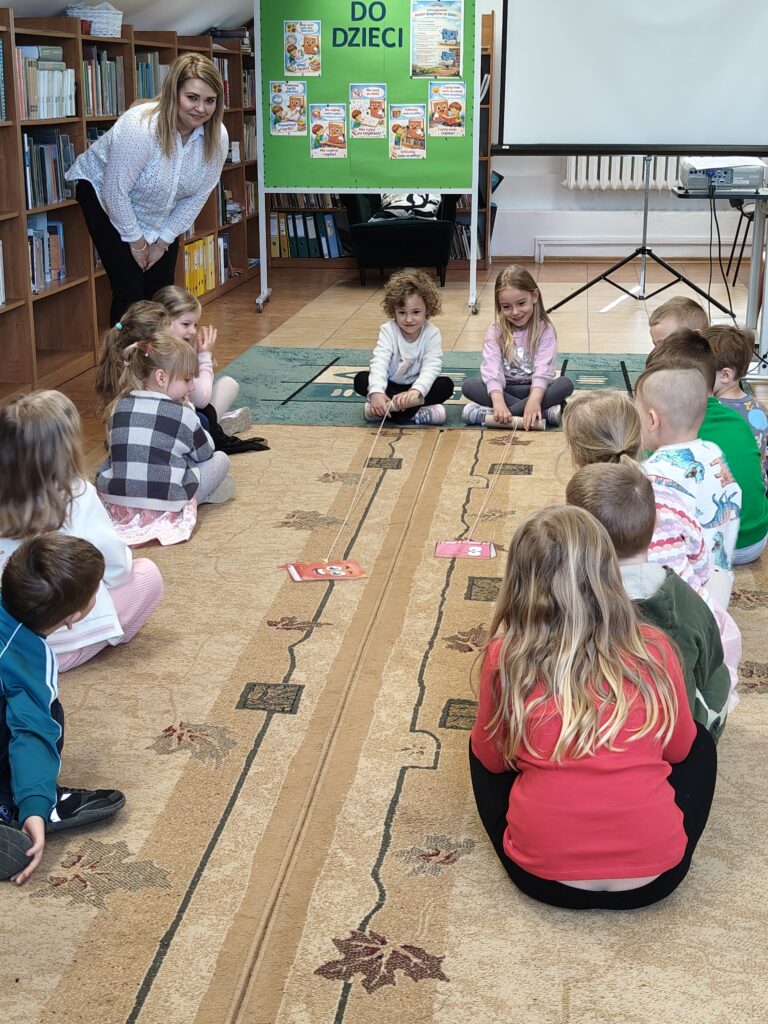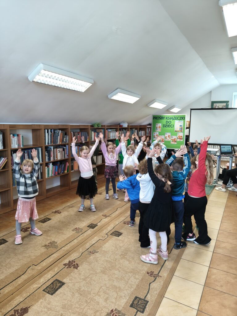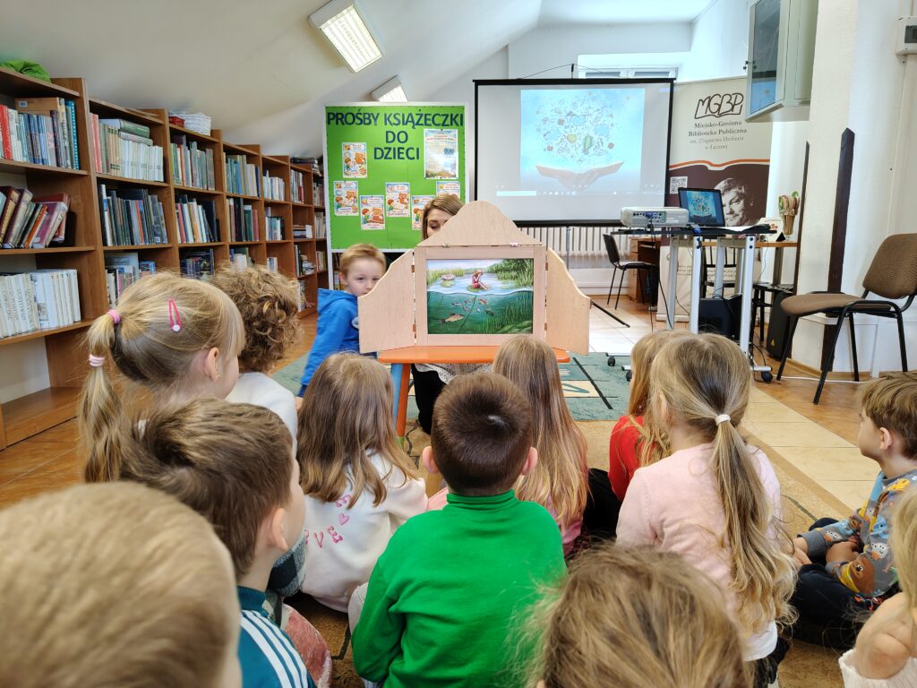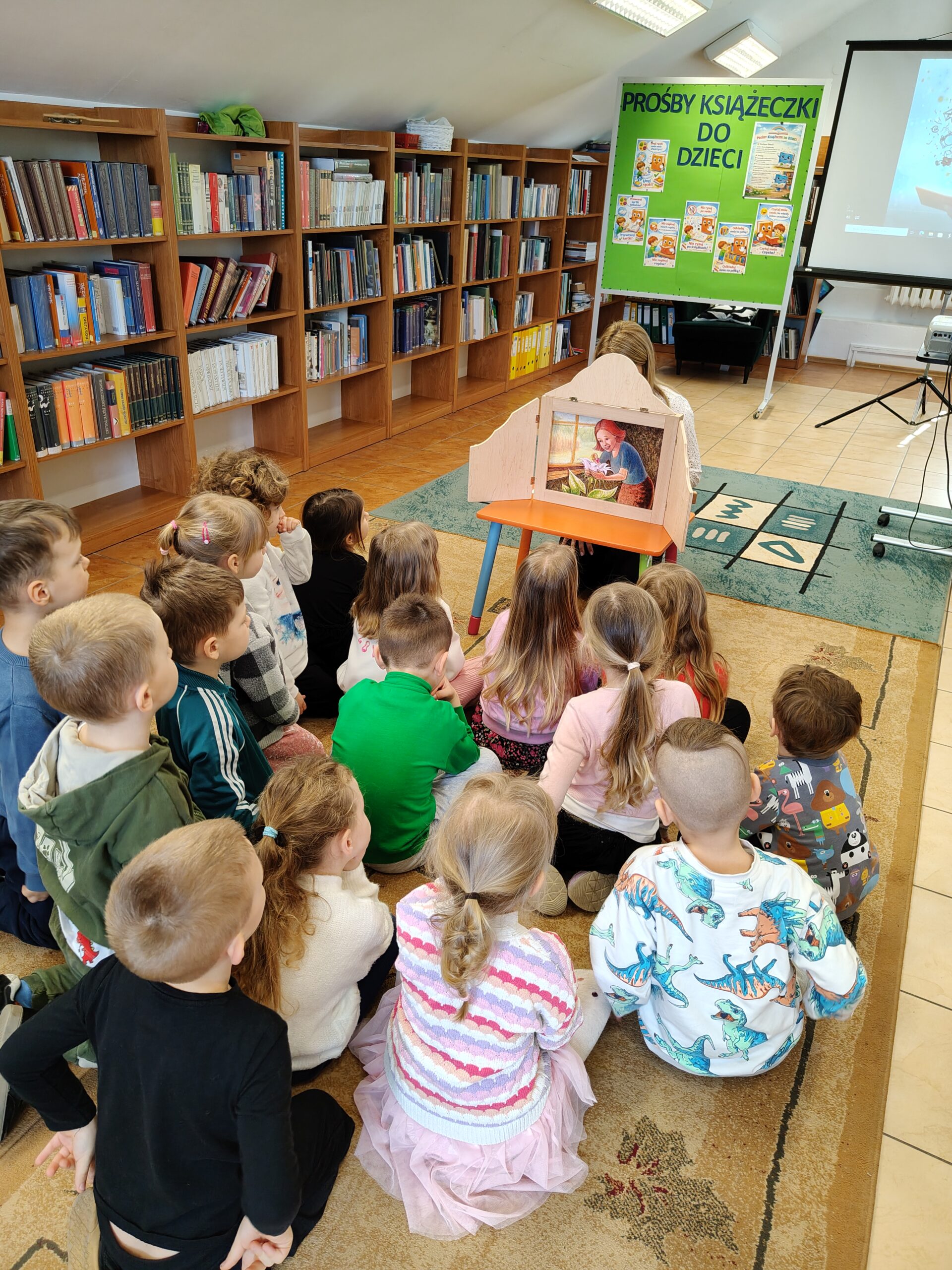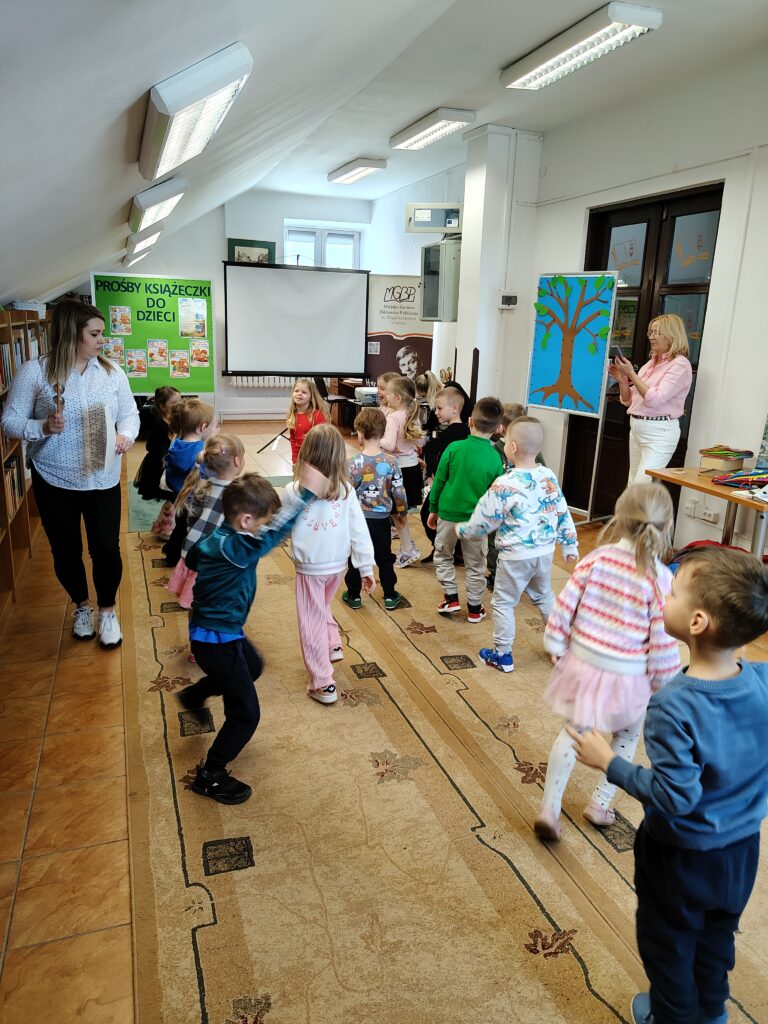 Pszczółki wybrały się na pieszą wycieczkę do Miejsko-Gminnej Biblioteki Publicznej przy ul. Bożnicznej w Łęcznej. Spotkanie odbyło się z okazji zbliżającego się Światowego Dnia Książki. Przedszkolaki zapoznały się z zasadami korzystania z książek – „Prośby książki do dzieci”, rozwiązywały zagadki dotyczące bohaterów literatury dziecięcej, wzięły udział w zabawach muzyczno-ruchowych oraz obejrzały bajeczkę o kotku w bibliotece. Dzieci miały okazję zobaczyć największą i najmniejszą książkę w bibliotece, a także książkę najgrubszą, przestrzenną oraz książkę szytą z filcu. Przedszkolaki obejrzały teatrzyk Kamishibai „Calineczka”. Pszczółki odwiedziły również Oddział dla dzieci, który jest pełen wspaniałych pozycji dla dzieci w różnym wieku. Bardzo dziękujemy pracownikom MGBP, a szczególnie pani Karolinie za miłe przyjęcie i ciekawe zajęcia edukacyjne.