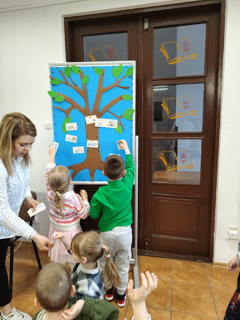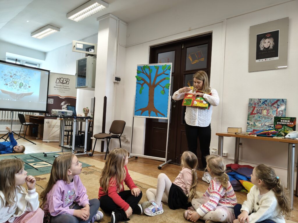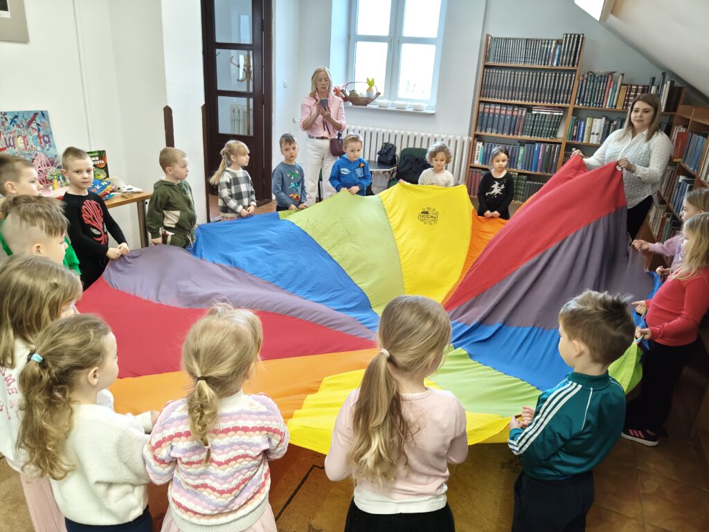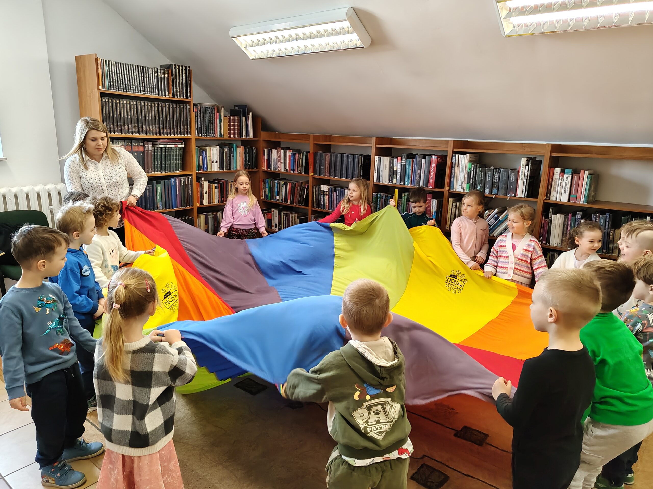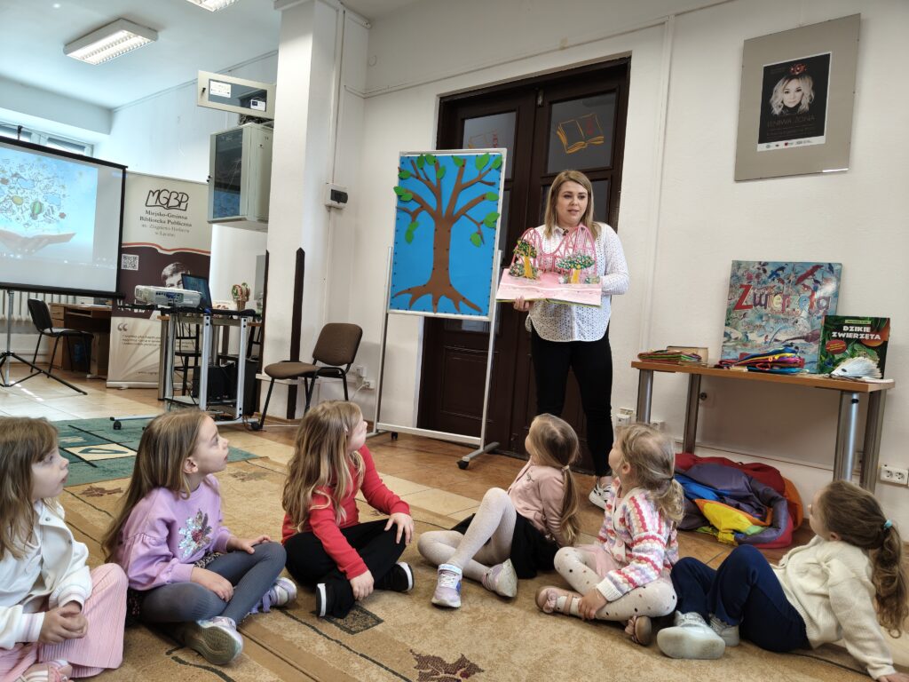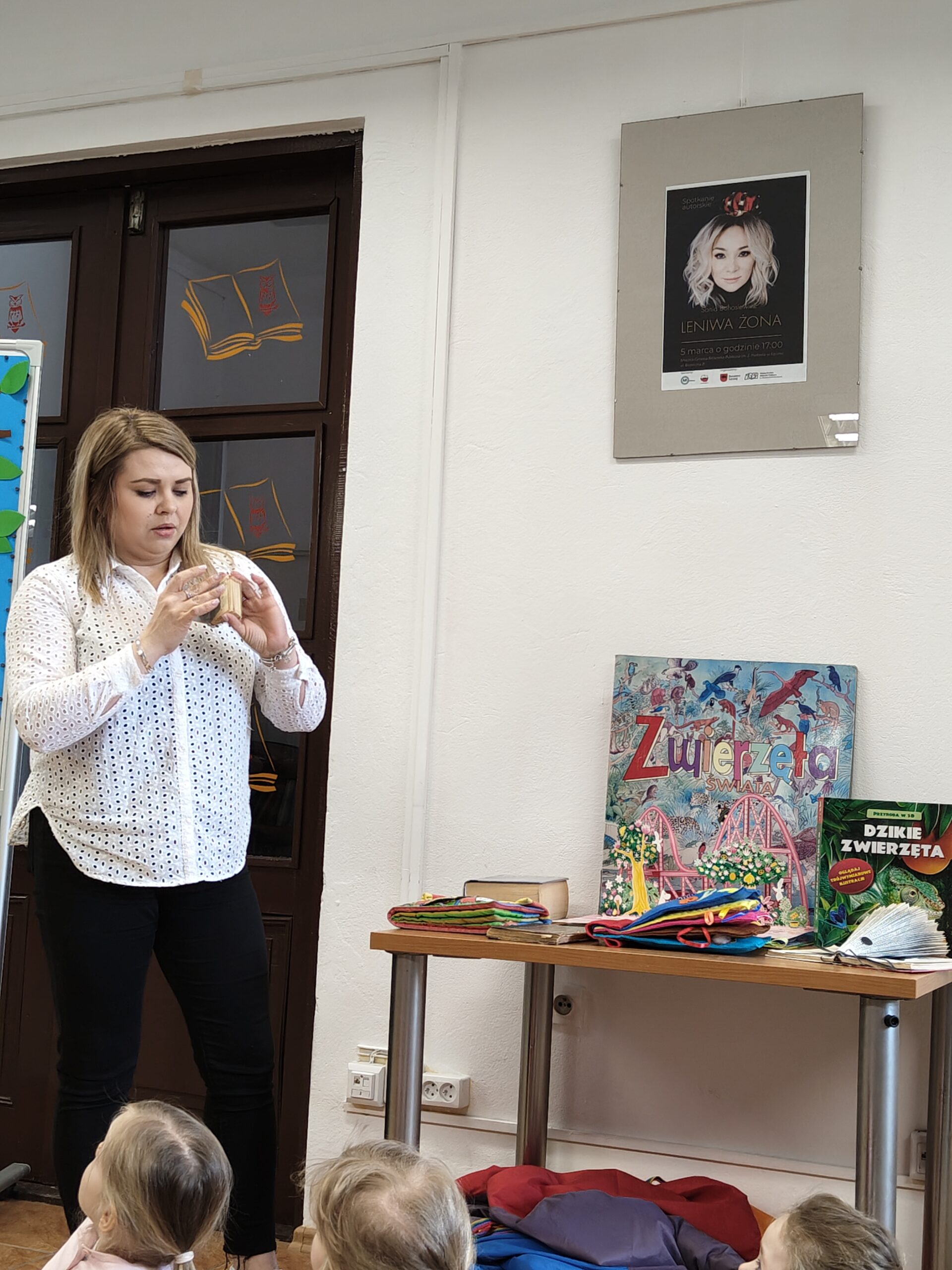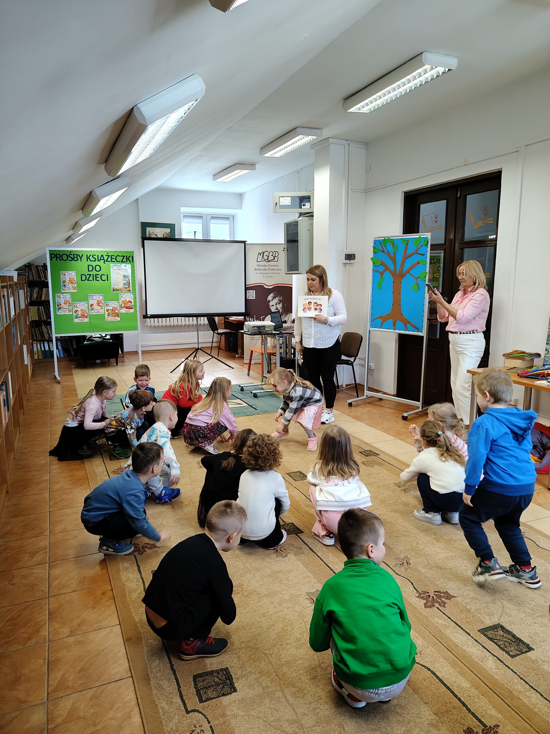 Pszczółki wybrały się na pieszą wycieczkę do Miejsko-Gminnej Biblioteki Publicznej przy ul. Bożnicznej w Łęcznej. Spotkanie odbyło się z okazji zbliżającego się Światowego Dnia Książki. Przedszkolaki zapoznały się z zasadami korzystania z książek – „Prośby książki do dzieci”, rozwiązywały zagadki dotyczące bohaterów literatury dziecięcej, wzięły udział w zabawach muzyczno-ruchowych oraz obejrzały bajeczkę o kotku w bibliotece. Dzieci miały okazję zobaczyć największą i najmniejszą książkę w bibliotece, a także książkę najgrubszą, przestrzenną oraz książkę szytą z filcu. Przedszkolaki obejrzały teatrzyk Kamishibai „Calineczka”. Pszczółki odwiedziły również Oddział dla dzieci, który jest pełen wspaniałych pozycji dla dzieci w różnym wieku. Bardzo dziękujemy pracownikom MGBP, a szczególnie pani Karolinie za miłe przyjęcie i ciekawe zajęcia edukacyjne.