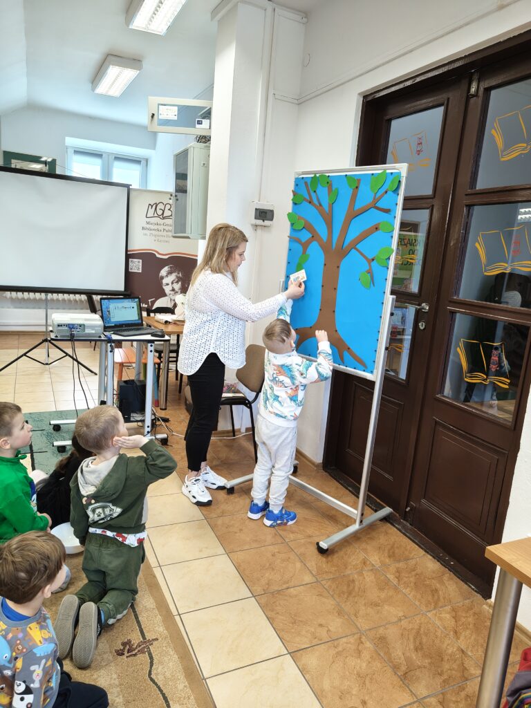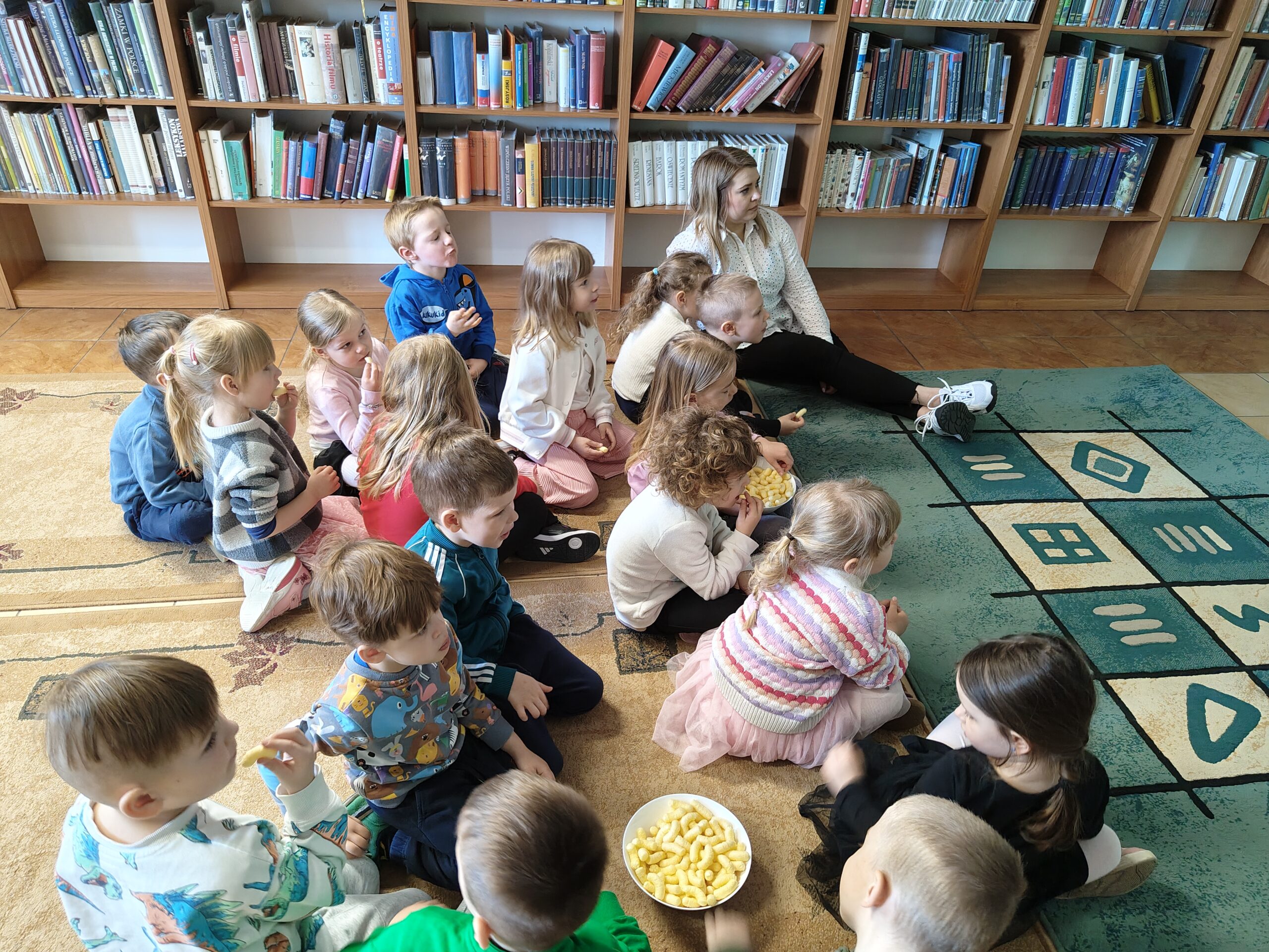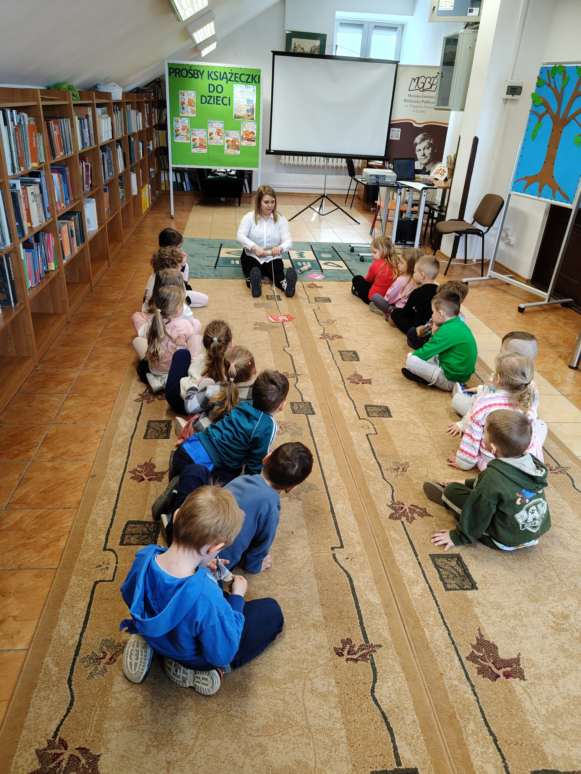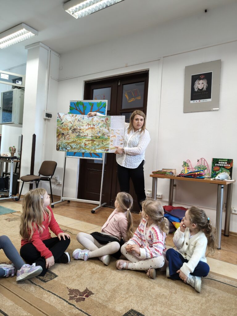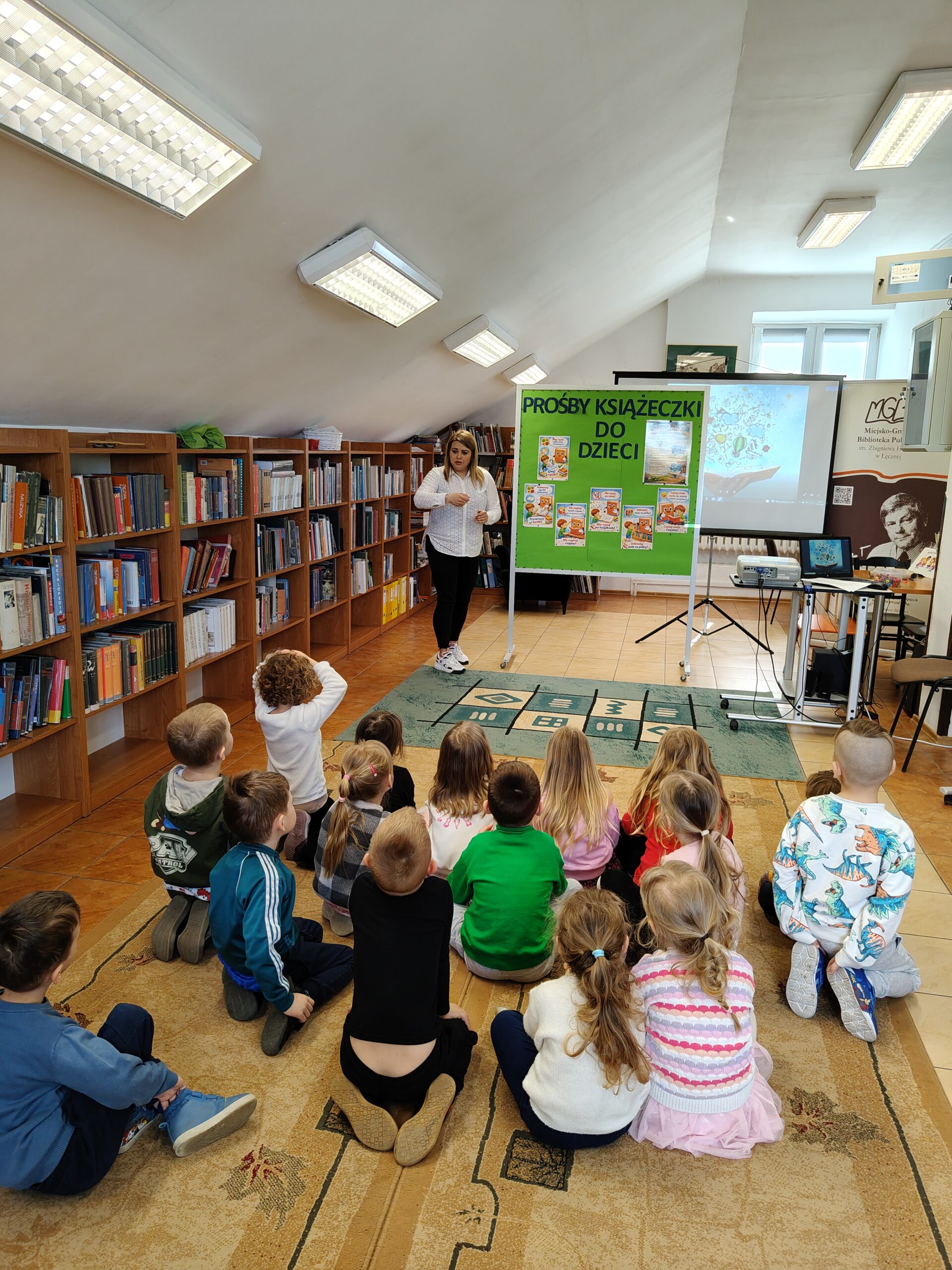 Pszczółki wybrały się na pieszą wycieczkę do Miejsko-Gminnej Biblioteki Publicznej przy ul. Bożnicznej w Łęcznej. Spotkanie odbyło się z okazji zbliżającego się Światowego Dnia Książki. Przedszkolaki zapoznały się z zasadami korzystania z książek – „Prośby książki do dzieci”, rozwiązywały zagadki dotyczące bohaterów literatury dziecięcej, wzięły udział w zabawach muzyczno-ruchowych oraz obejrzały bajeczkę o kotku w bibliotece. Dzieci miały okazję zobaczyć największą i najmniejszą książkę w bibliotece, a także książkę najgrubszą, przestrzenną oraz książkę szytą z filcu. Przedszkolaki obejrzały teatrzyk Kamishibai „Calineczka”. Pszczółki odwiedziły również Oddział dla dzieci, który jest pełen wspaniałych pozycji dla dzieci w różnym wieku. Bardzo dziękujemy pracownikom MGBP, a szczególnie pani Karolinie za miłe przyjęcie i ciekawe zajęcia edukacyjne.
