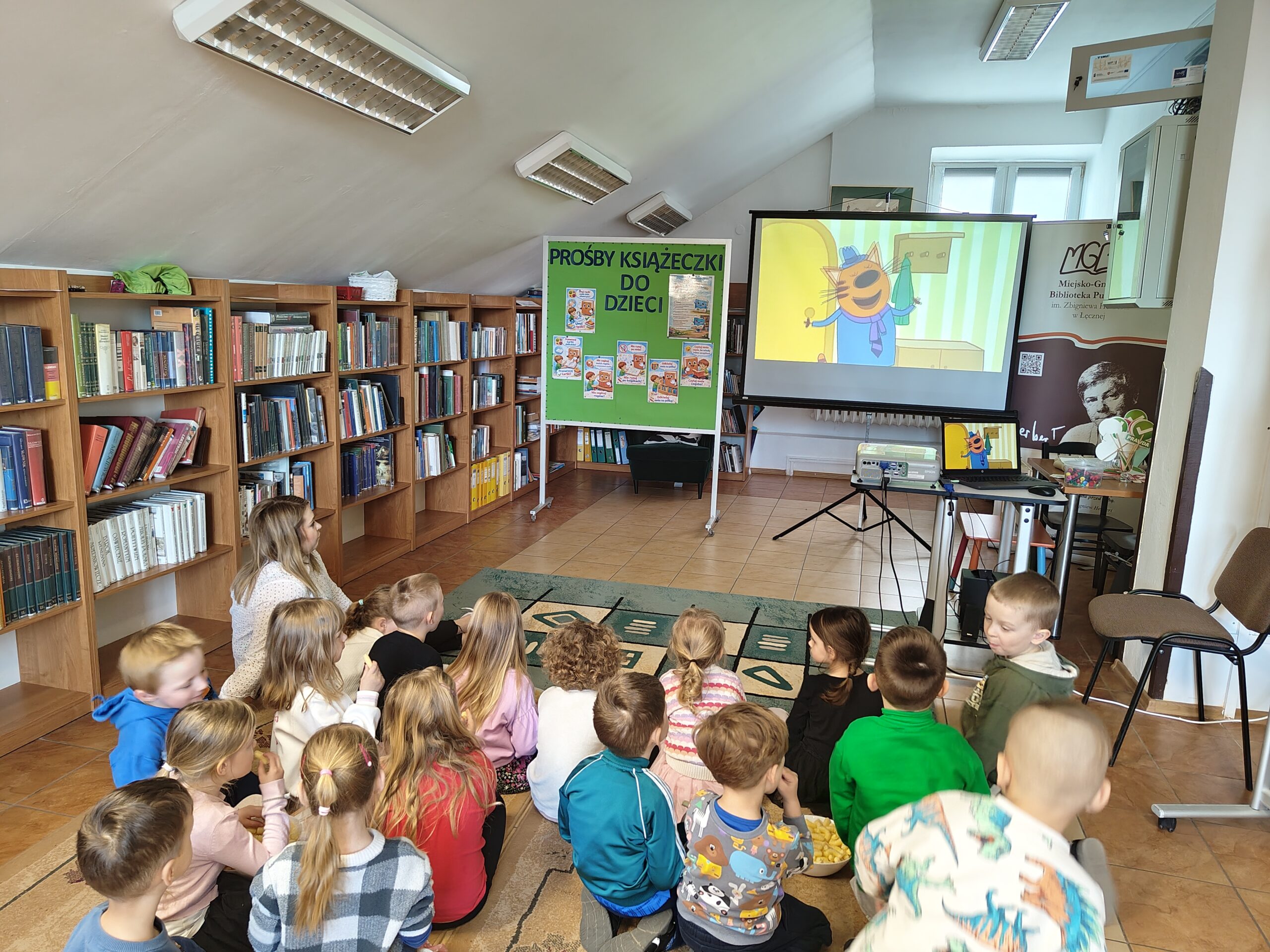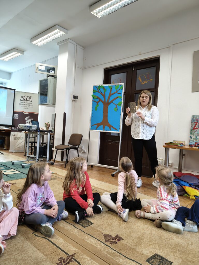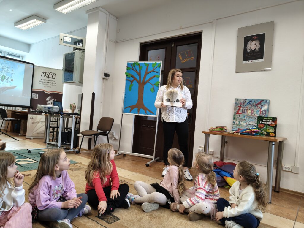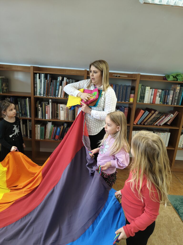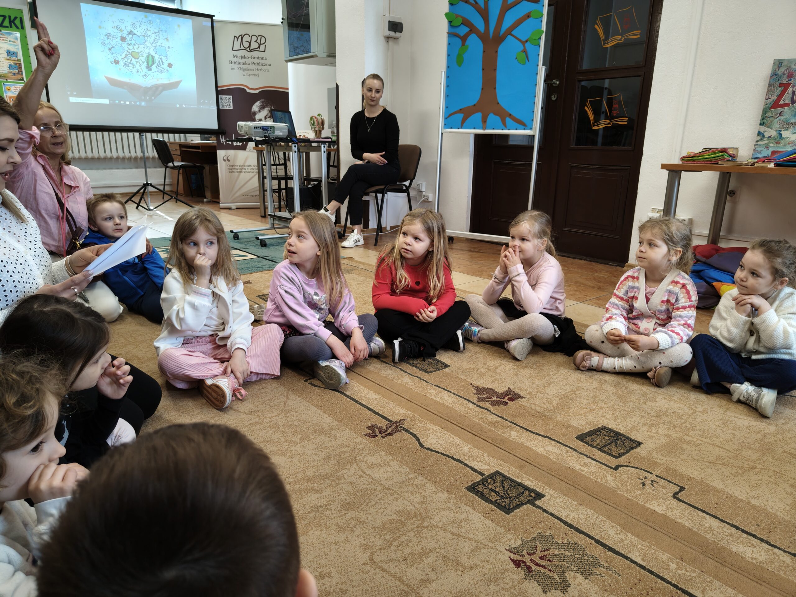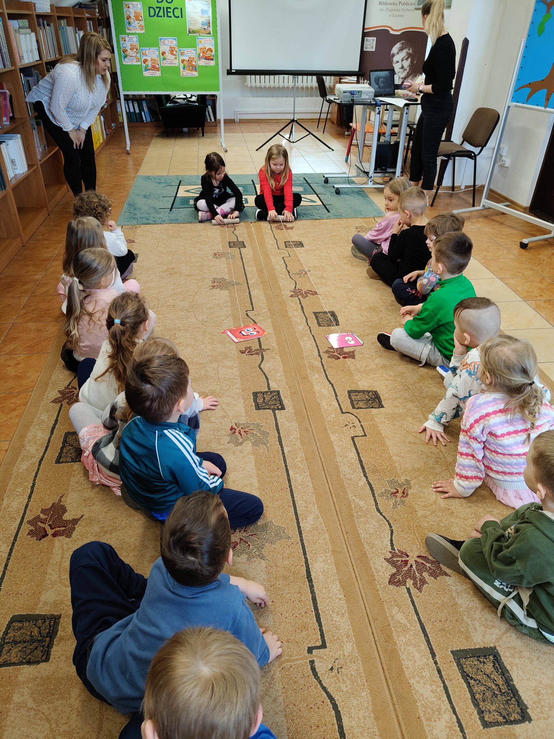 Pszczółki wybrały się na pieszą wycieczkę do Miejsko-Gminnej Biblioteki Publicznej przy ul. Bożnicznej w Łęcznej. Spotkanie odbyło się z okazji zbliżającego się Światowego Dnia Książki. Przedszkolaki zapoznały się z zasadami korzystania z książek – „Prośby książki do dzieci”, rozwiązywały zagadki dotyczące bohaterów literatury dziecięcej, wzięły udział w zabawach muzyczno-ruchowych oraz obejrzały bajeczkę o kotku w bibliotece. Dzieci miały okazję zobaczyć największą i najmniejszą książkę w bibliotece, a także książkę najgrubszą, przestrzenną oraz książkę szytą z filcu. Przedszkolaki obejrzały teatrzyk Kamishibai „Calineczka”. Pszczółki odwiedziły również Oddział dla dzieci, który jest pełen wspaniałych pozycji dla dzieci w różnym wieku. Bardzo dziękujemy pracownikom MGBP, a szczególnie pani Karolinie za miłe przyjęcie i ciekawe zajęcia edukacyjne.