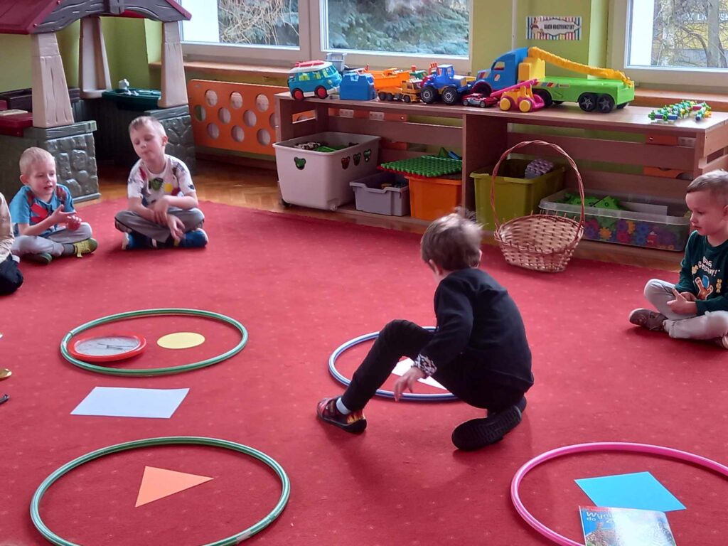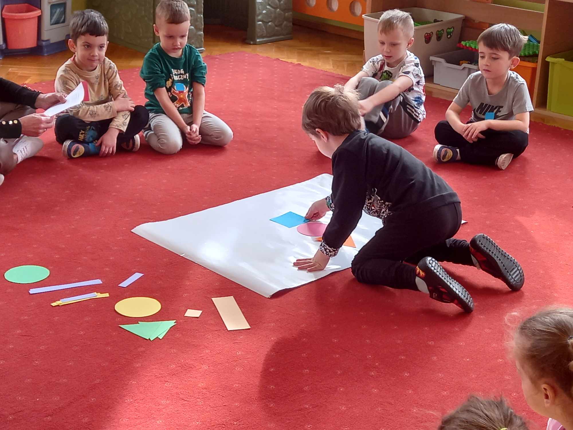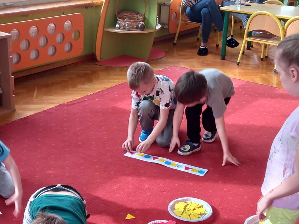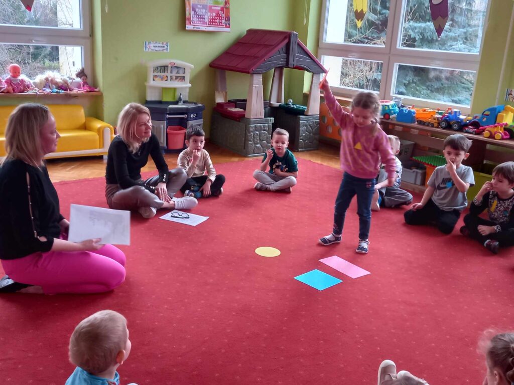 W grupie ,,Kotki” odbyły się zajęcia otwarte dla Rodziców pt.: „W krainie figur geometrycznych”. Głównym celem zajęć było utrwalenie nazw i wyglądu podstawowych figur geometrycznych. Przedszkolaki miały okazję pokazać swoim rodzicom jak się uczą poprzez zabawę i ile już potrafią. Zajęcia łączyły w sobie różnorodne formy aktywności. Poprzez udział w zabawach dzieci utrwaliły pojęcia i umiejętności matematyczne, rozróżniały figury geometryczne – ich kształt i kolory, uważnie i ze zrozumieniem słuchały opowiadania, układały różne przedmioty z figur, uzupełniały brakujące elementy w ciągu figur zgodnie z ustalonym rytmem, posługiwały się pojęciami: duży, mały, nad, pod, środek. Rodzice mieli możliwość obserwacji umiejętności matematycznych swoich dzieci, możliwość zaobserwowania swojego dziecka na tle grupy rówieśniczej. Uczestnictwo w tego rodzaju zajęciach daje rodzicom obraz pracy nauczyciela z dzieckiem, pokazuje stosowane metody i formy pracy. Dziękujemy Rodzicom za obecność, dzieciom za piękną postawę i aktywność na zajęciach.