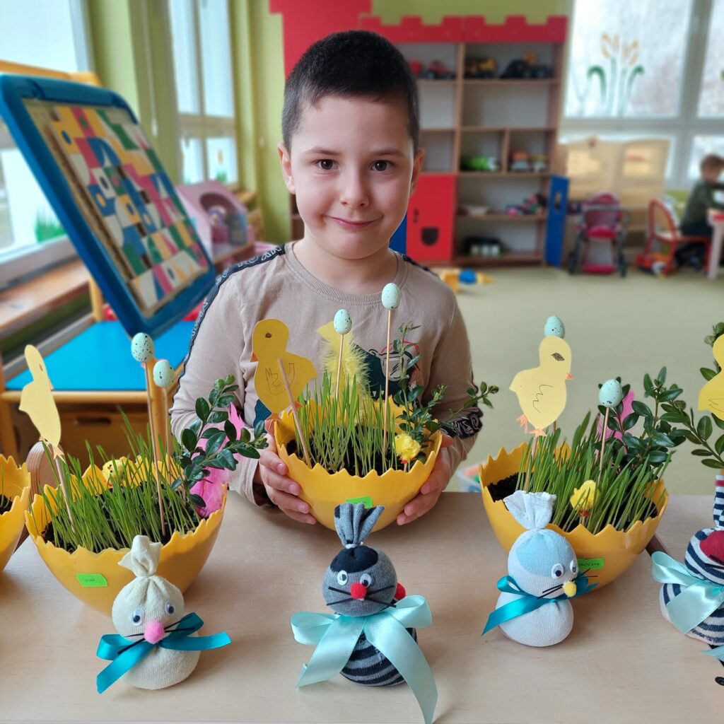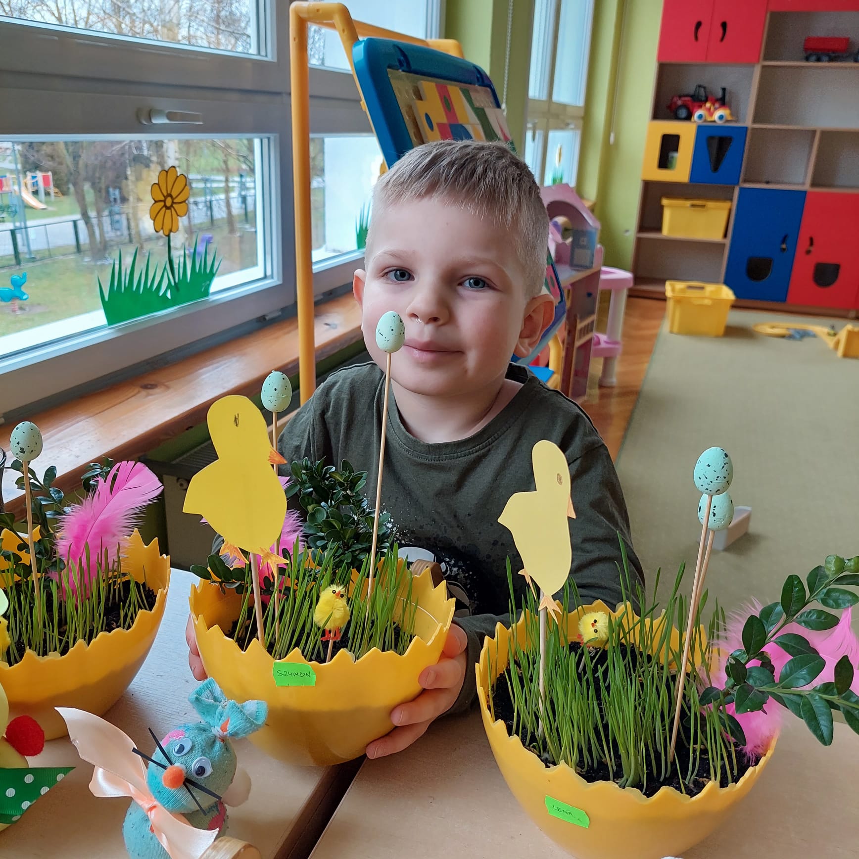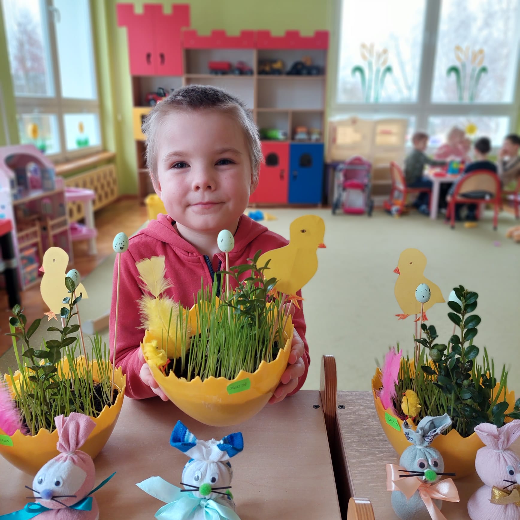 Wielkanoc w przedszkolu to okazja do rozmowy o symbolice świąt i towarzyszącym im obyczajach. Przedszkolaki zasiały owies, obserwowały jego wzrost a następnie ozdobiły swoje doniczki własnoręcznie wykonanymi ozdobami.Odwiedziliśmy bibliotekę przekazując prace plastyczne pt.Symbole wielkanocne.
