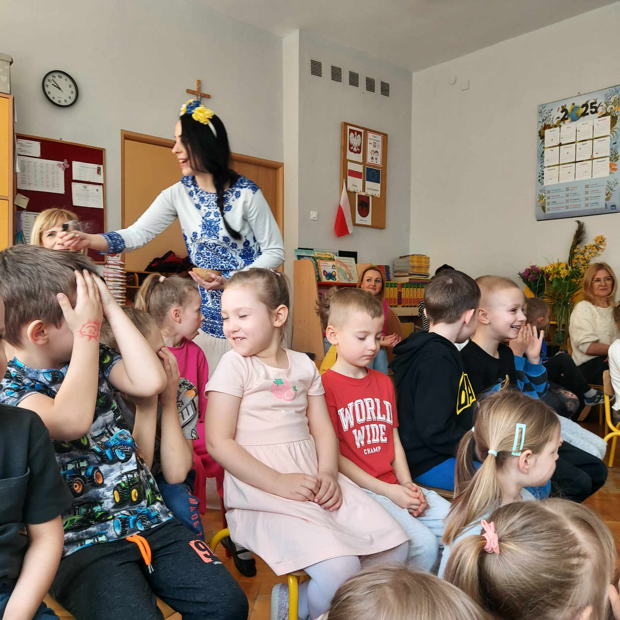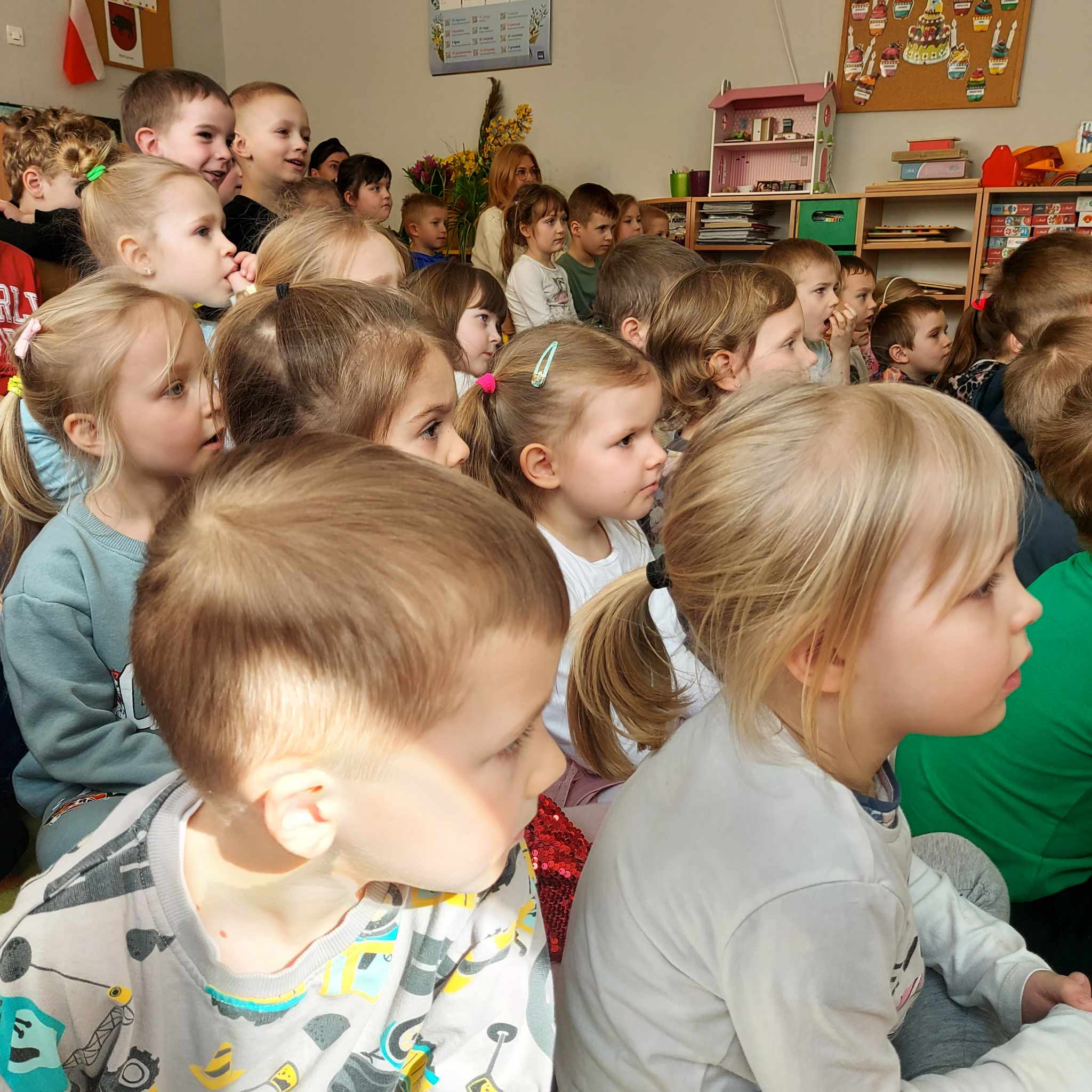 W naszym przedszkolu odbyło się wyjątkowe wydarzenie – teatrzyk pt. „Audycja Wiosenna”. Aktorki przeniosły dzieci w magiczny świat dawnych Słowian, opowiadając o wiosennych zwyczajach i obrzędach, które towarzyszyły nadejściu tej radosnej pory roku. W trakcie występu dzieci mogły zrelaksować się przy kojących dźwiękach muzyki inspirowanej naturą oraz aromacie unoszącej się szałwii. Dzięki zaangażowaniu artystek mali widzowie nie tylko świetnie się bawili, ale również poznali tradycje naszych przodków w niezwykle przystępny i ciekawy sposób. Dzieci wspólnie zatańczyły taniec wiosenny, a w sali zapanowała radosna, wiosenna atmosfera.