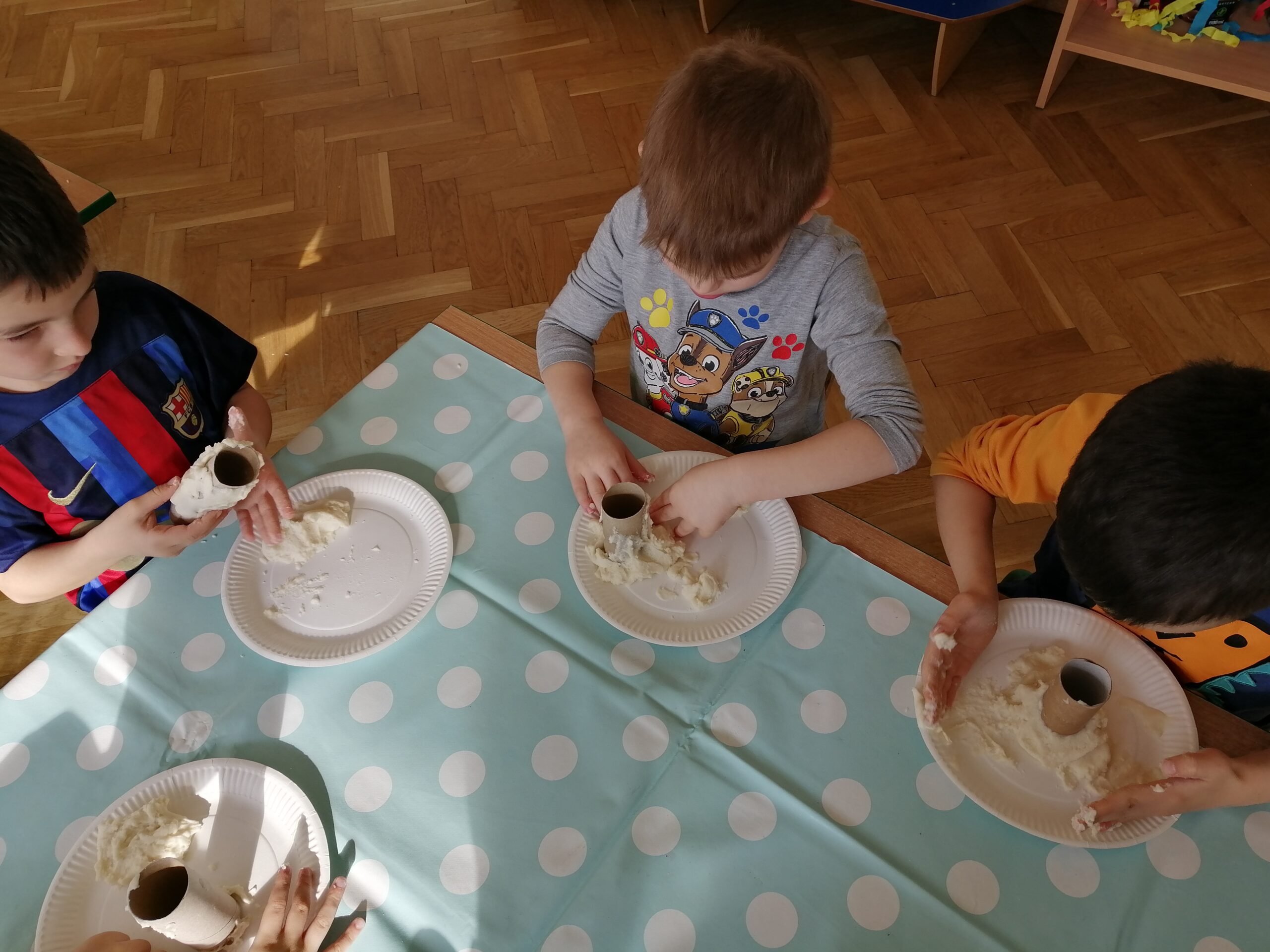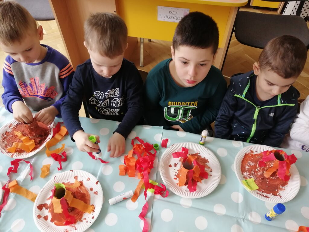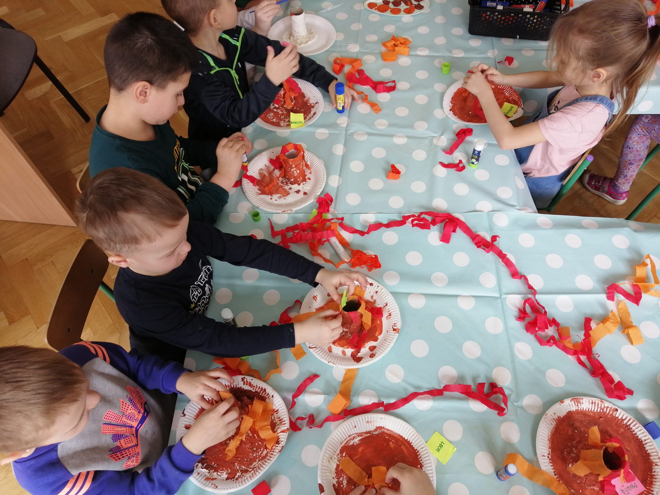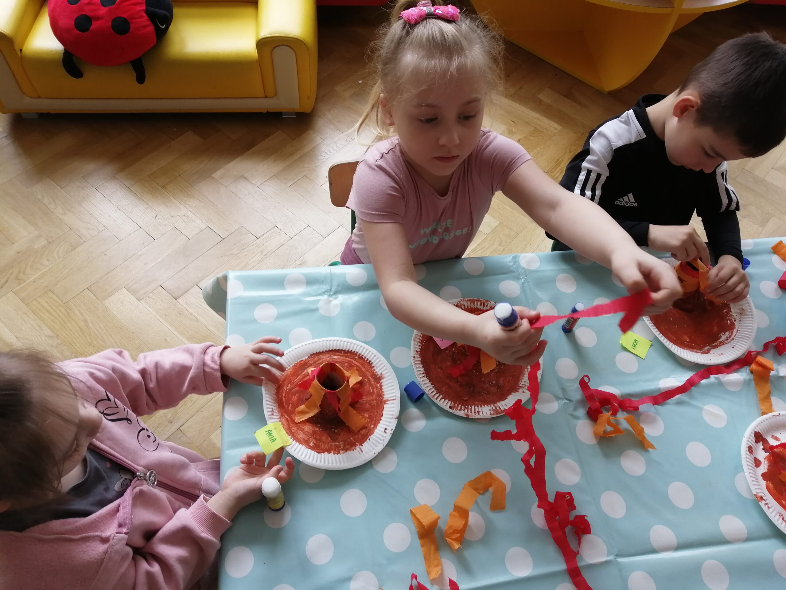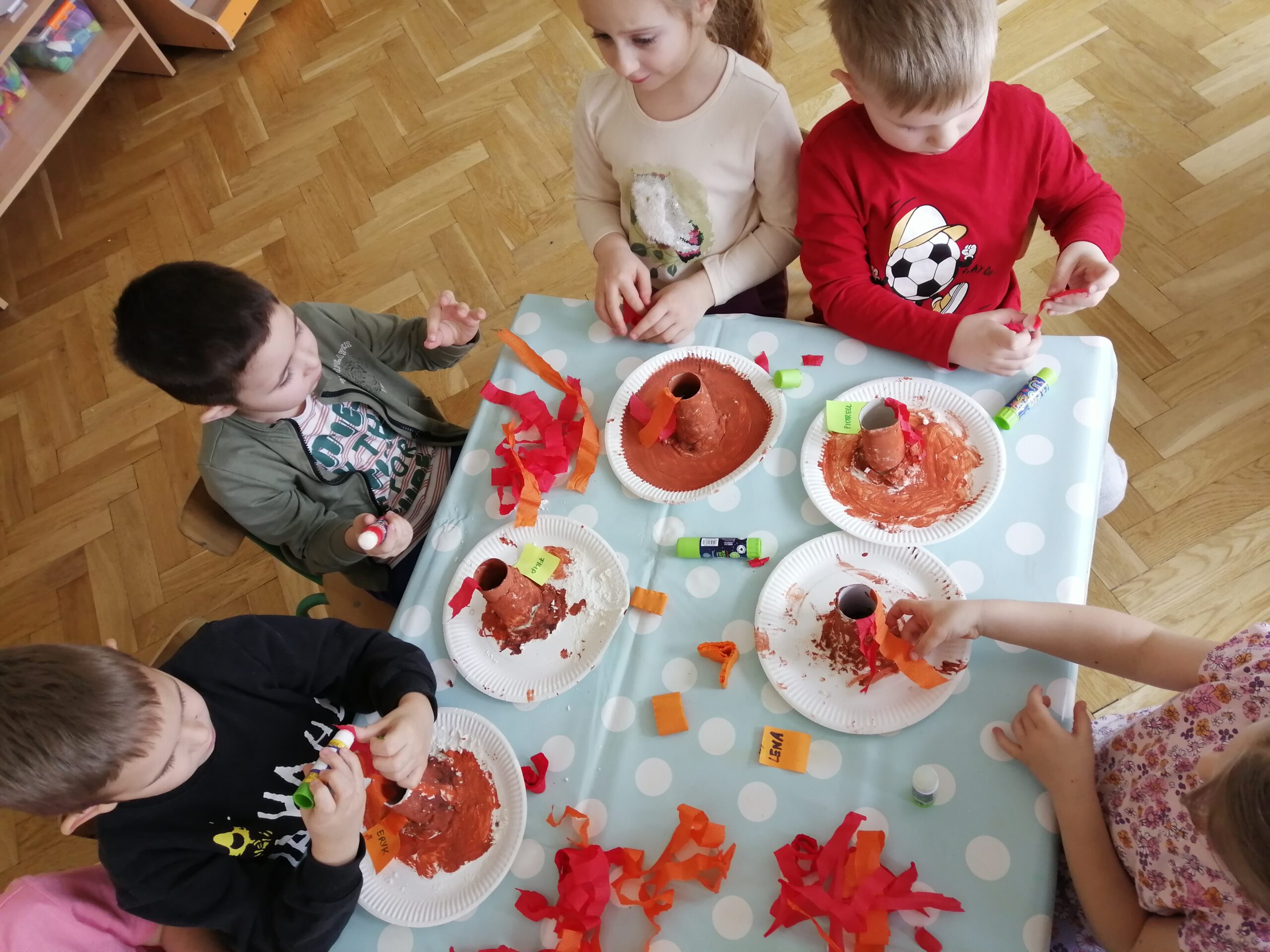 Przedszkolaki z grupy „Biedronki” przygotowały masę solną, a następnie lepiły z niej wulkany na talerzyku papierowym. Dzieci pozostawiły swoje prace do wyschnięcia i kolejnego dnia, mogły zabrać się za malowanie wulkanów farbami. Następnym krokiem było doklejenie lawy z bibuły i gotowe!