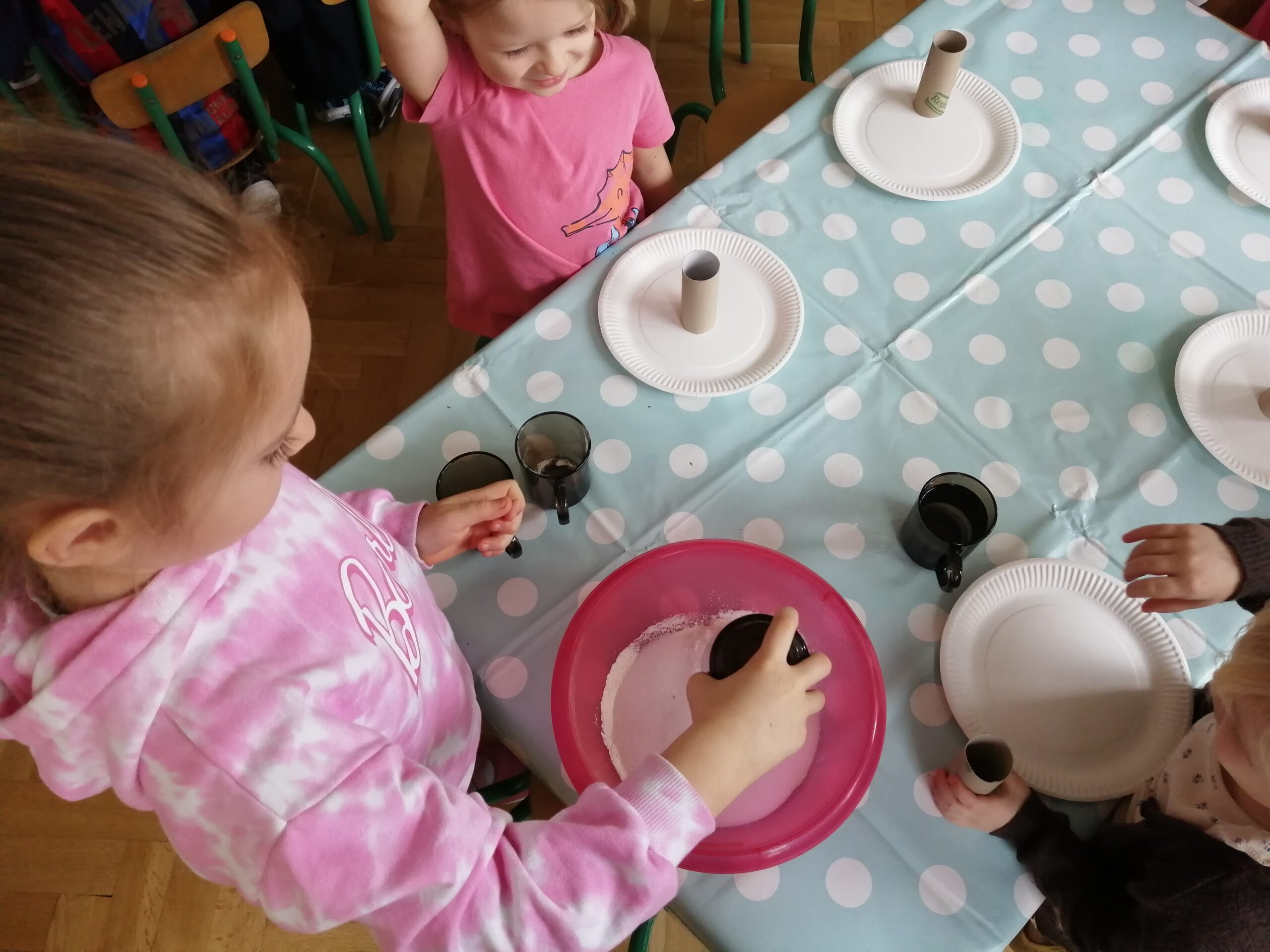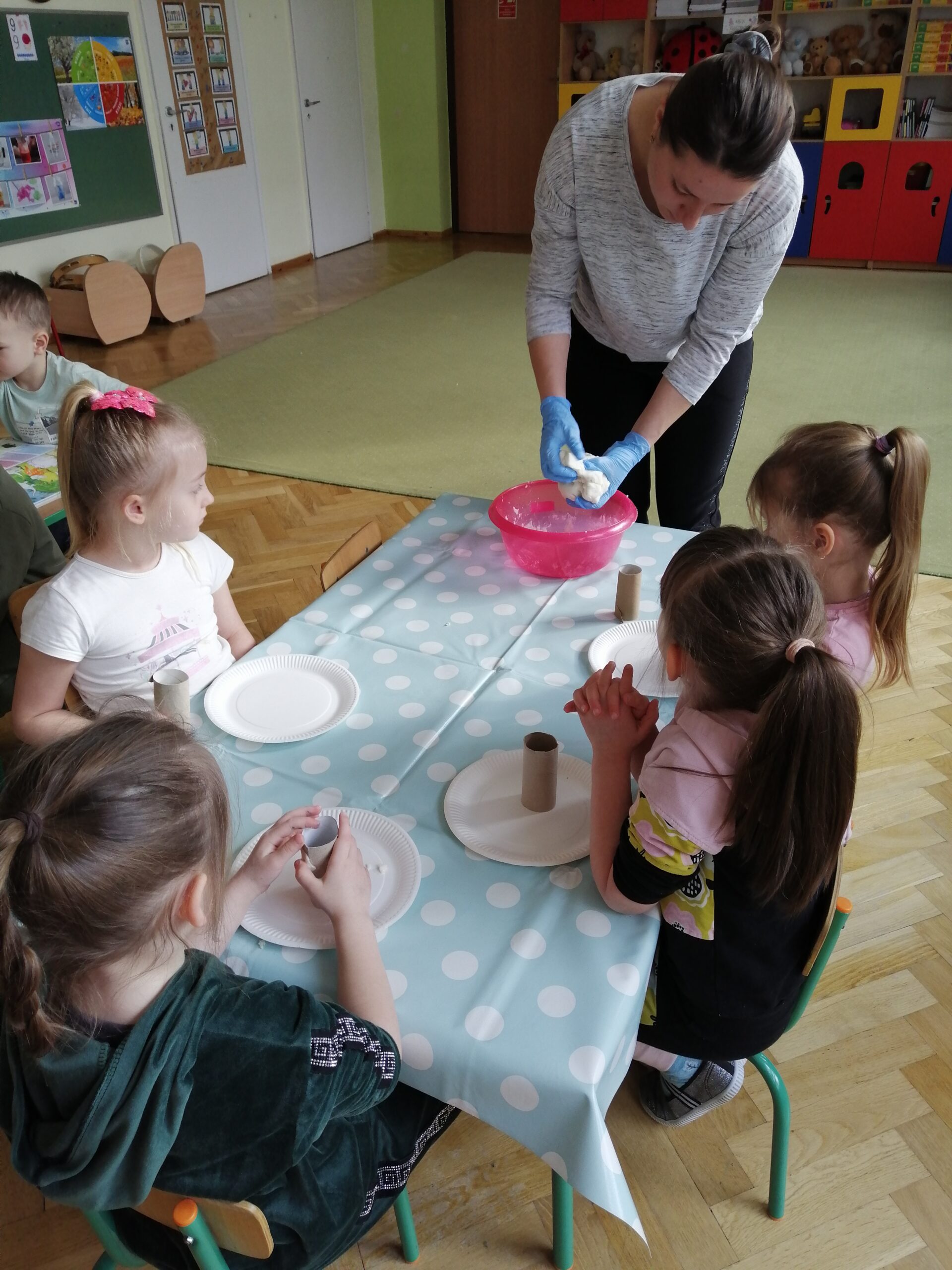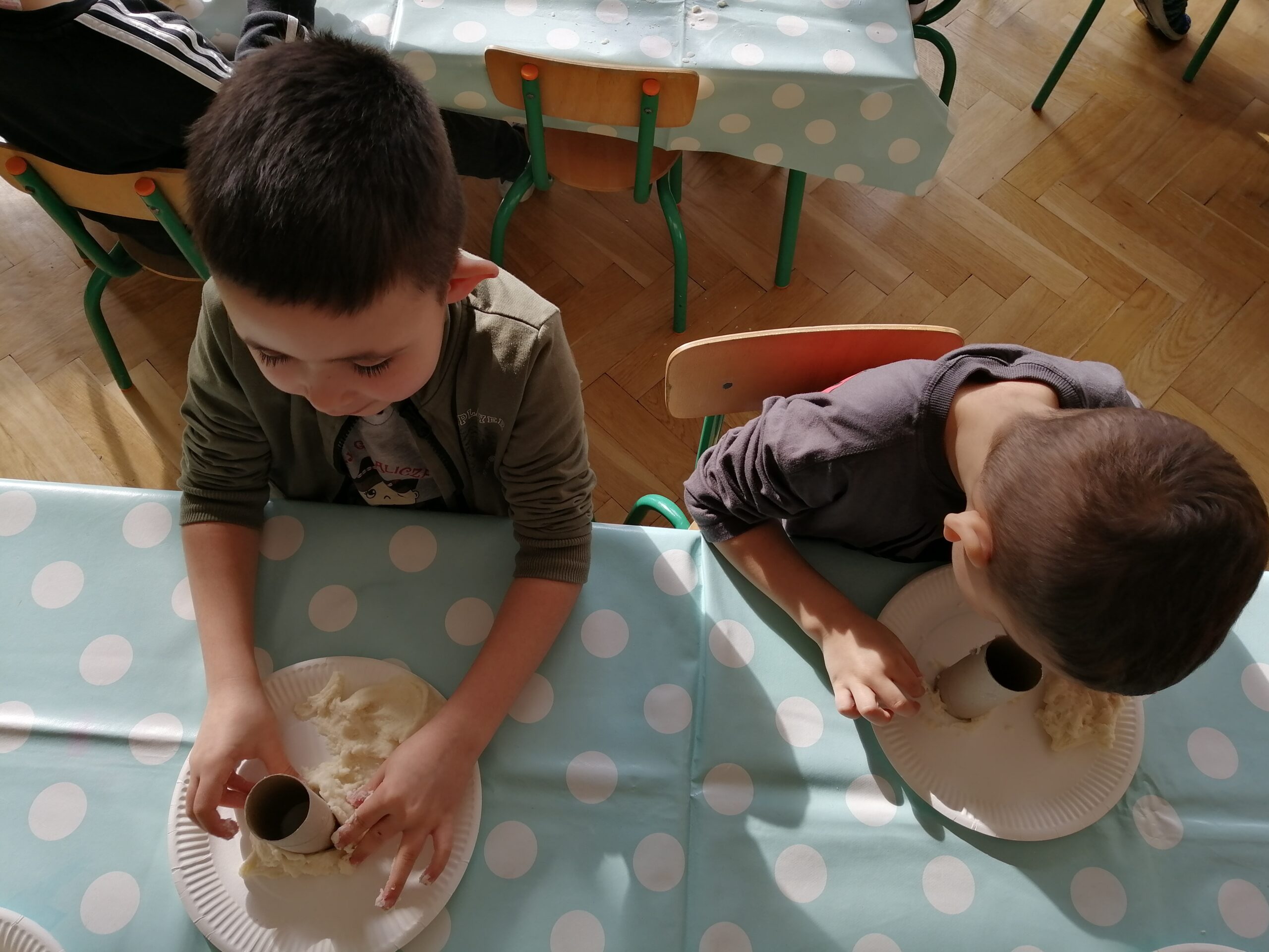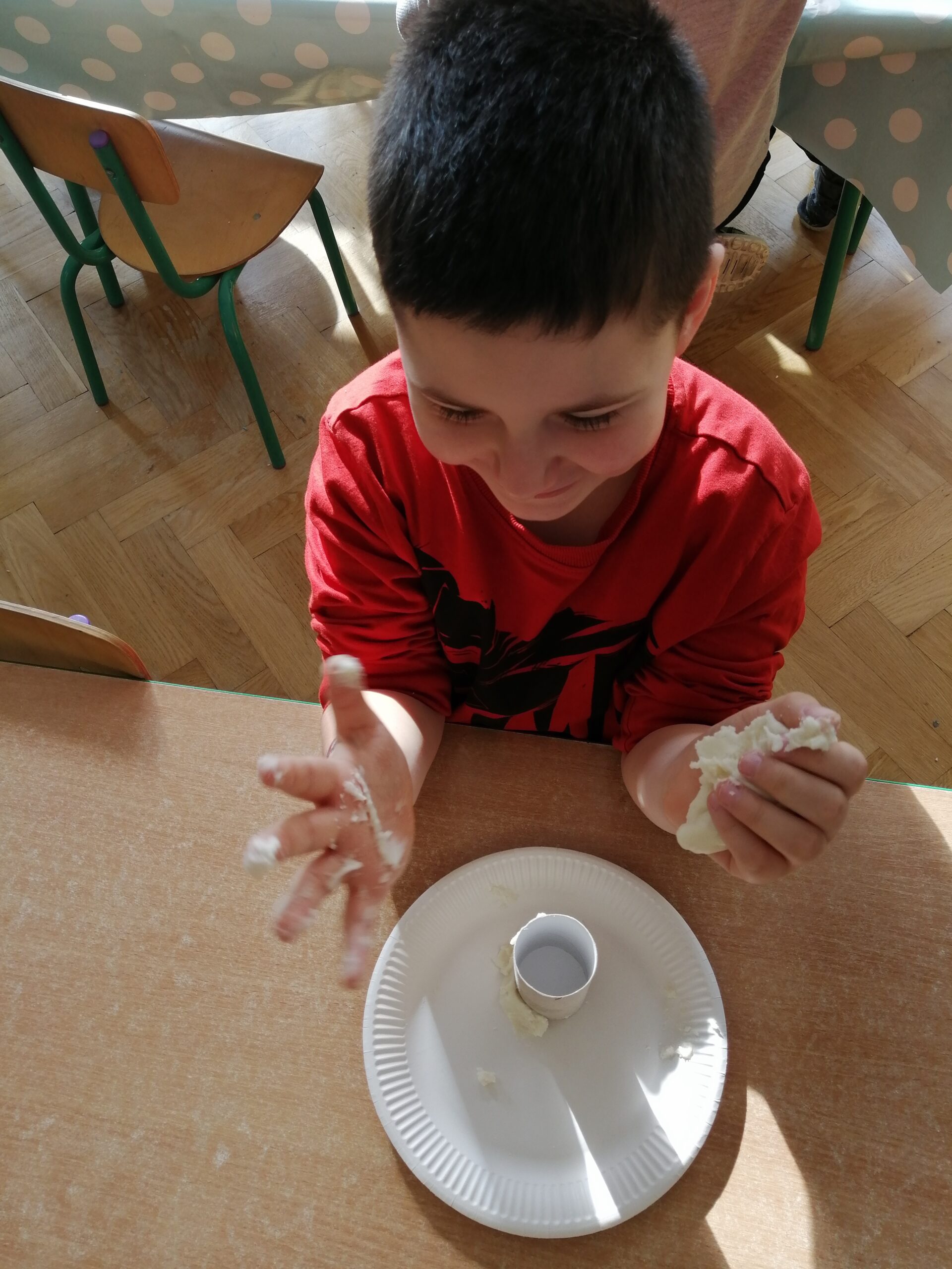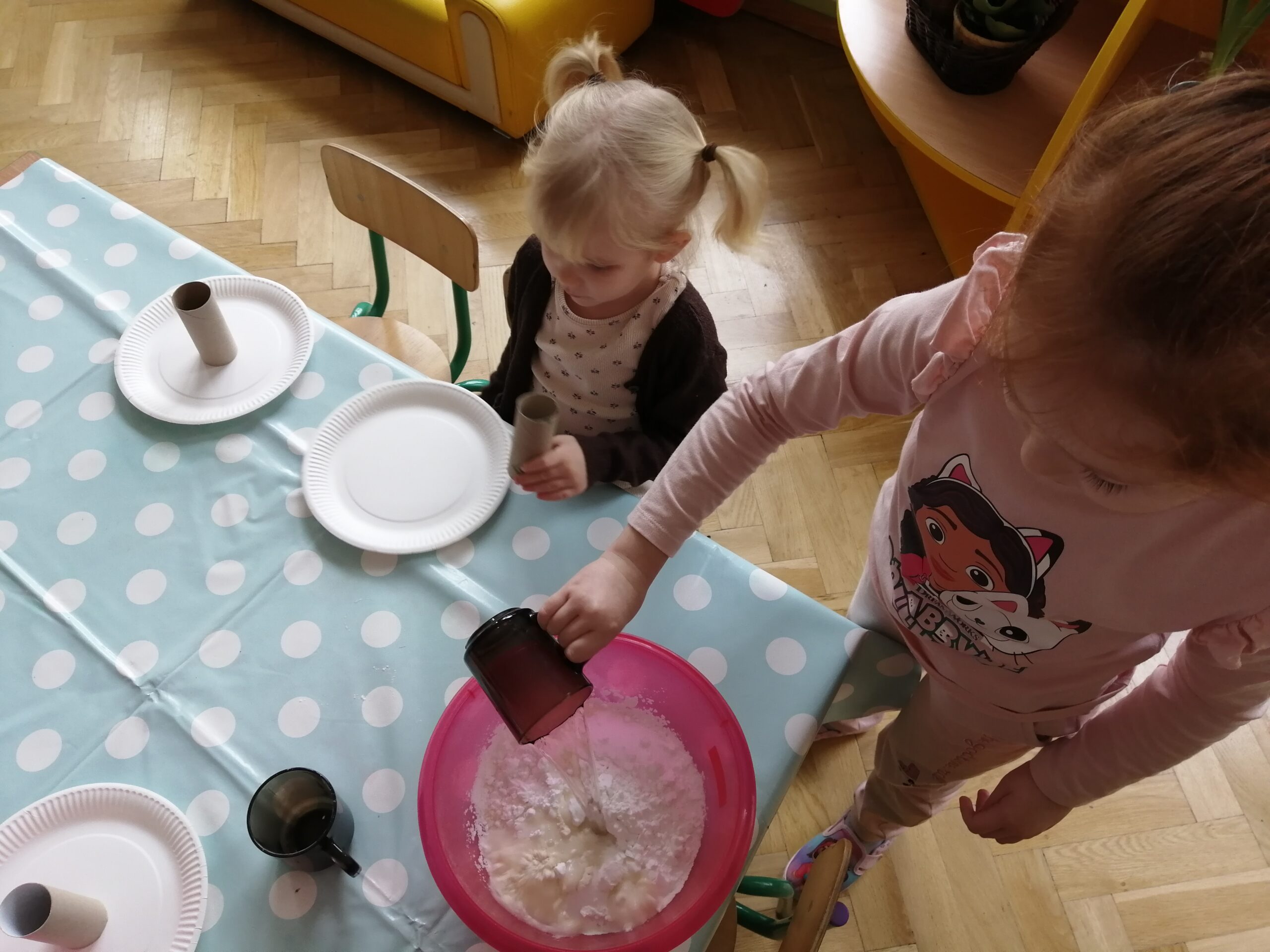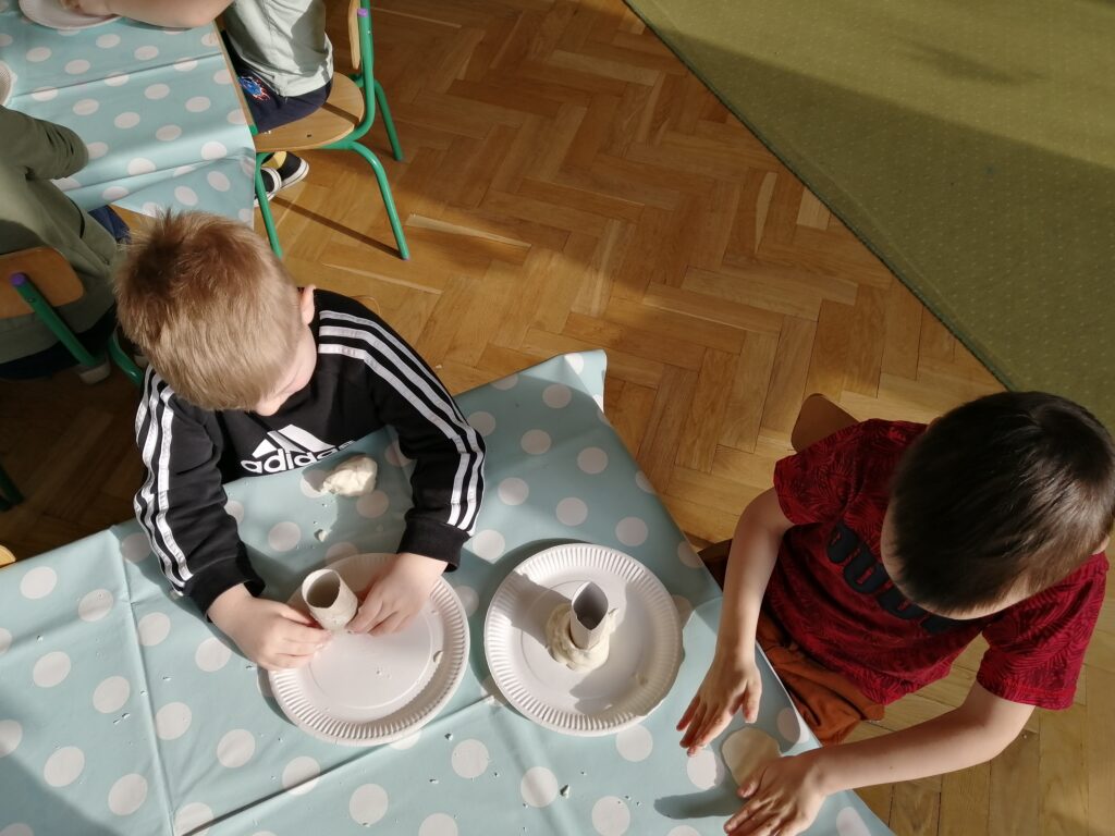 Przedszkolaki z grupy „Biedronki” przygotowały masę solną, a następnie lepiły z niej wulkany na talerzyku papierowym. Dzieci pozostawiły swoje prace do wyschnięcia i kolejnego dnia, mogły zabrać się za malowanie wulkanów farbami. Następnym krokiem było doklejenie lawy z bibuły i gotowe!