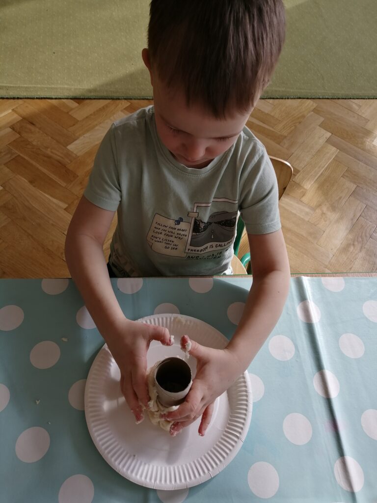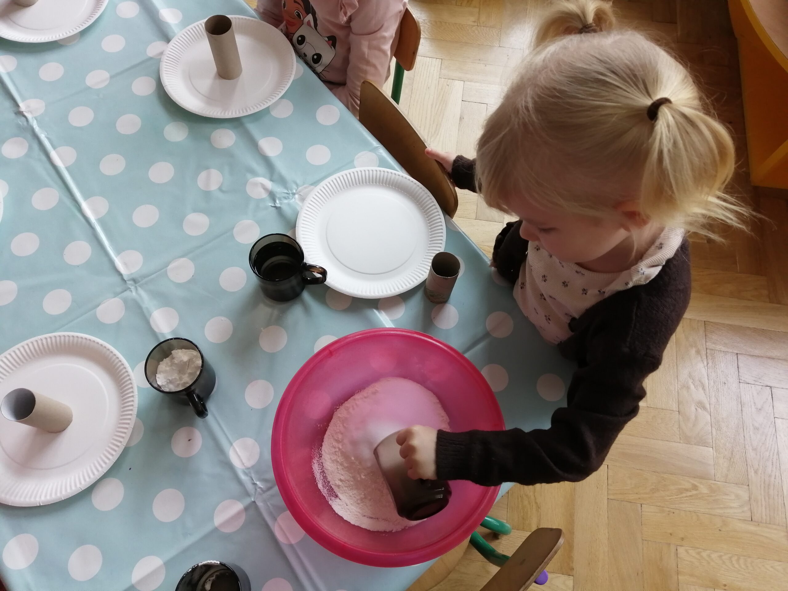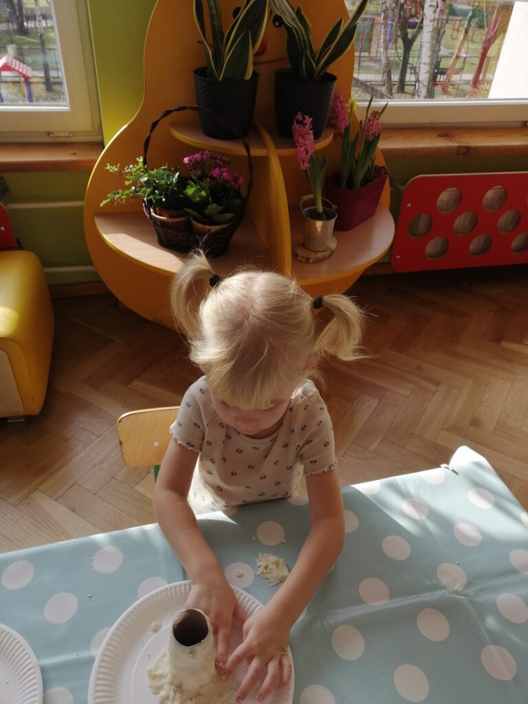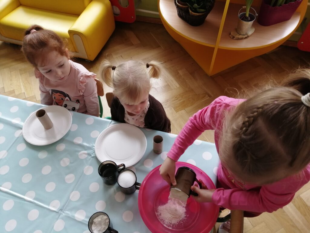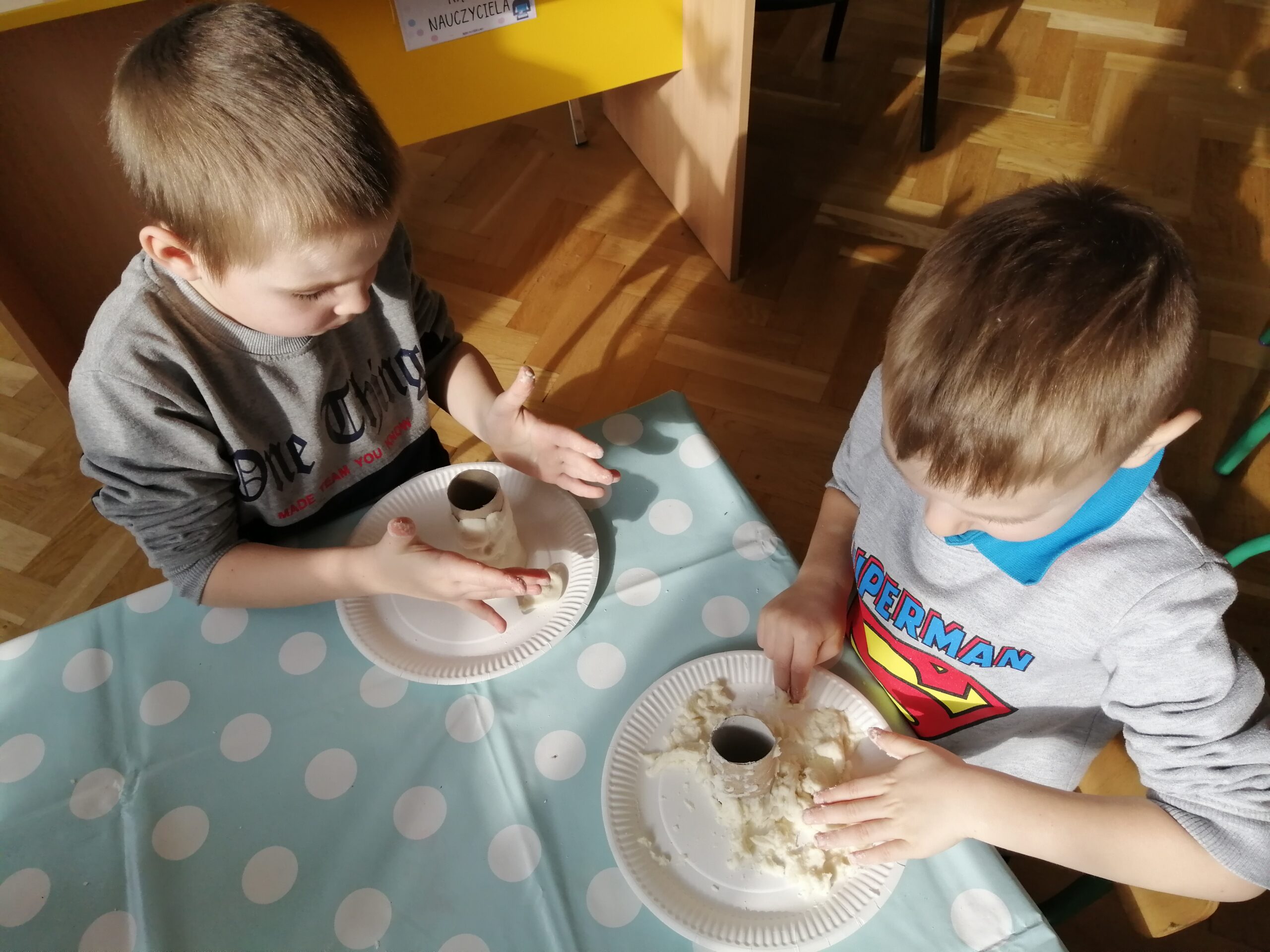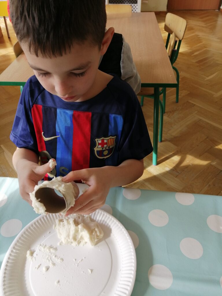 Przedszkolaki z grupy „Biedronki” przygotowały masę solną, a następnie lepiły z niej wulkany na talerzyku papierowym. Dzieci pozostawiły swoje prace do wyschnięcia i kolejnego dnia, mogły zabrać się za malowanie wulkanów farbami. Następnym krokiem było doklejenie lawy z bibuły i gotowe!