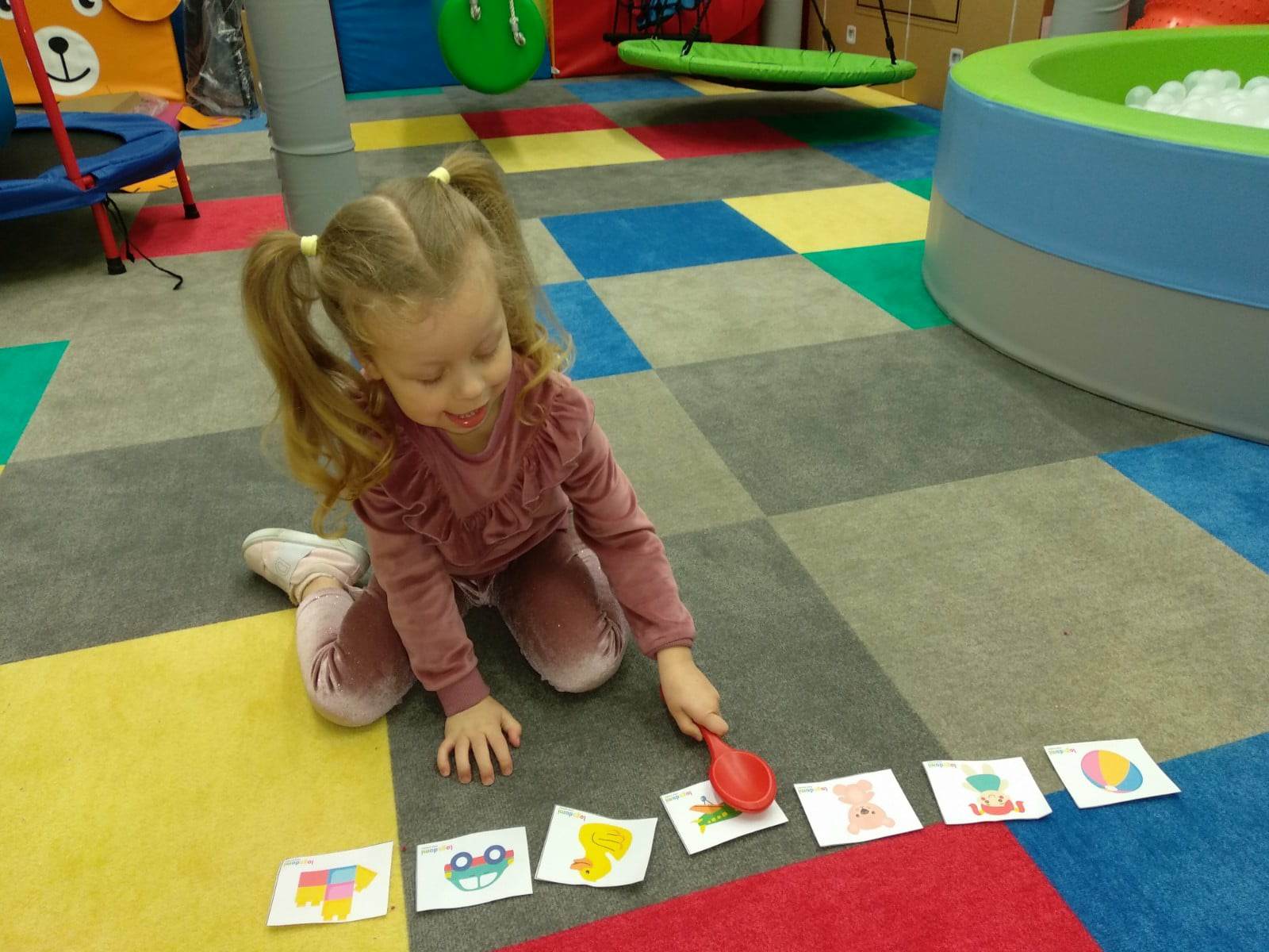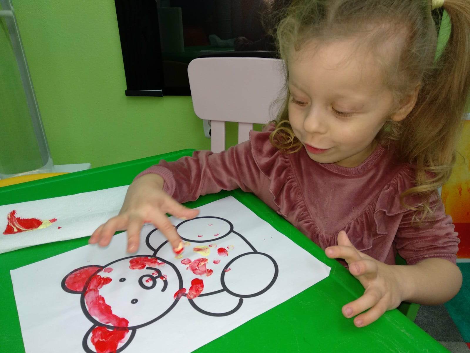 Podczas terapii logopedycznej wzbogacaliśmy zasób słownictwa biernego i czynnego oraz usprawnialiśmy motorykę narządów artykulacyjnych. Dzięki zabawie w układanie obrazków zgodnie z usłyszaną sekwencją ćwiczyliśmy pamięć słuchową, rymowanki pomocne były w doskonaleniu orientacji w schemacie własnego ciała, a zabawy paluszkowe i malowanie farbami stymulowało ośrodki ruchowe mowy.