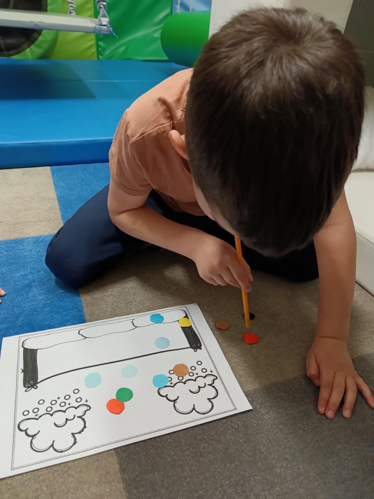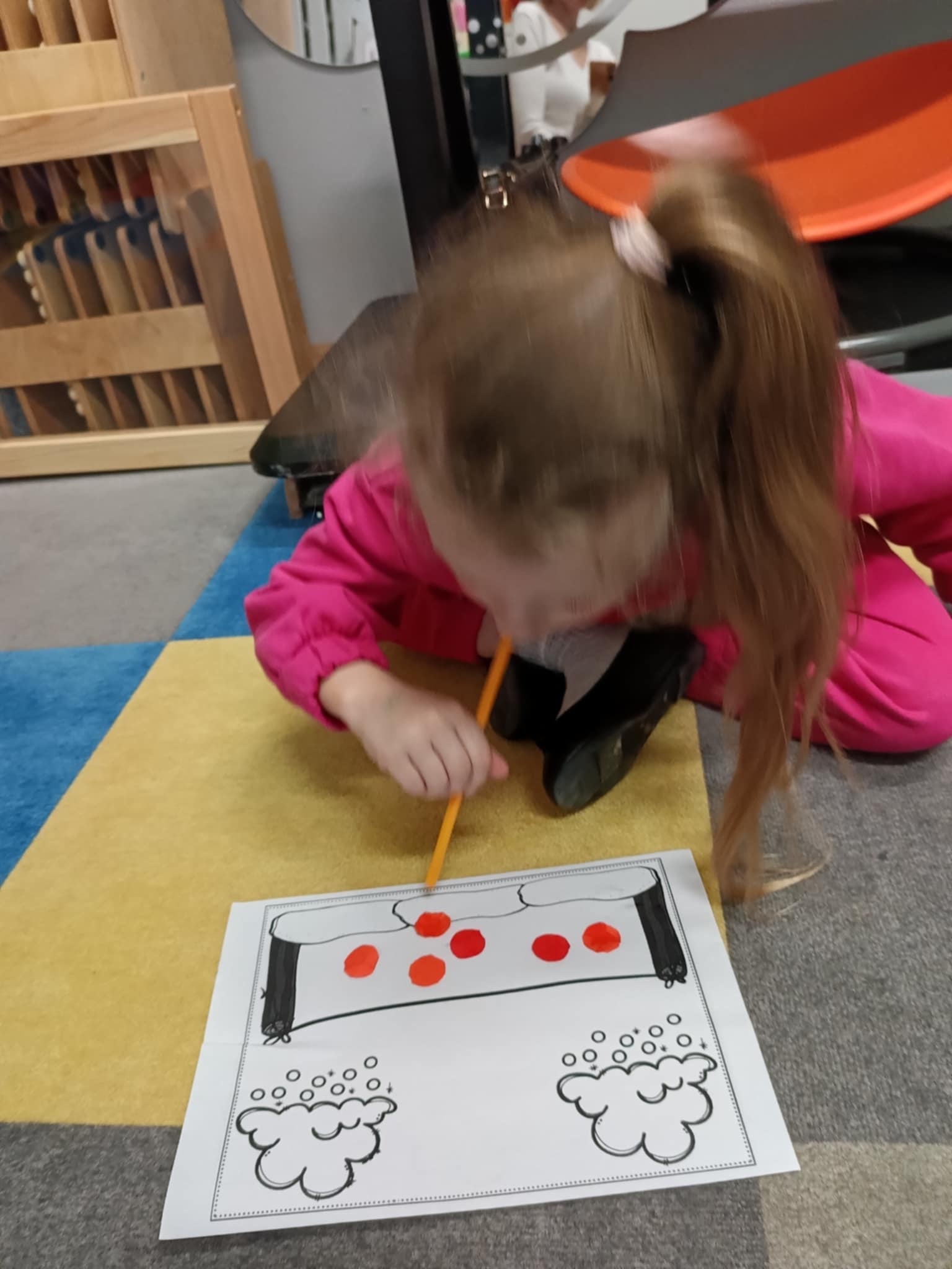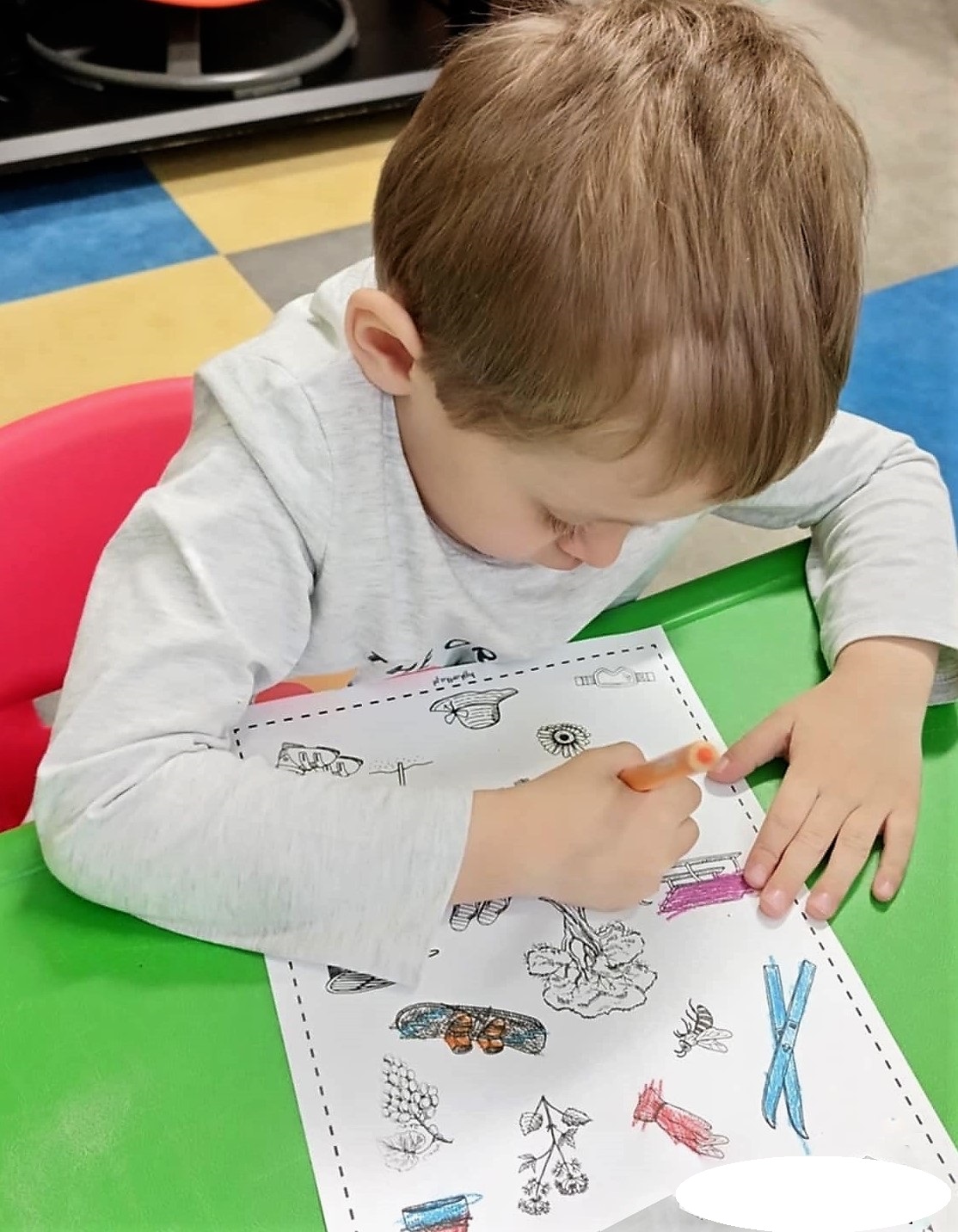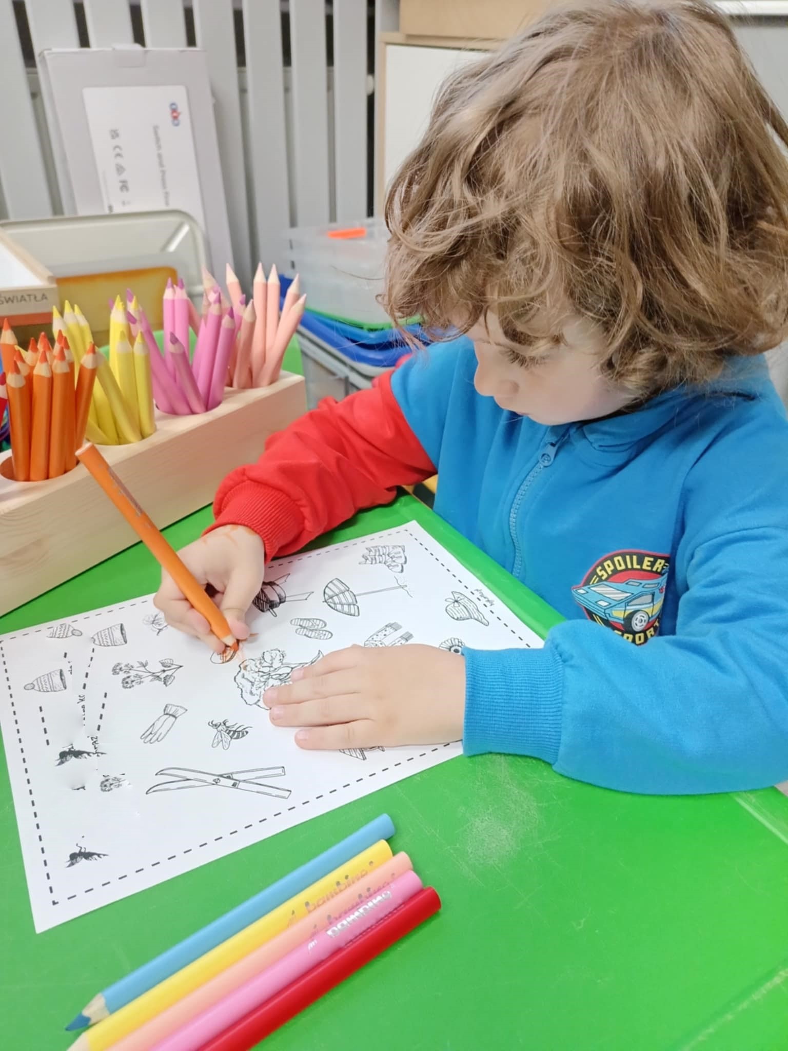 Dzieci rozwijały również motorykę małą poprzez kolorowanie obrazków ćwicząc jednocześnie logiczne myślenie (wybór odpowiednich ilustracji), wspólne pole uwagi oraz umiejętność wskazywania palcem. Zajęcia miały także na celu rozwój mowy biernej – dzieci rozpoznawały i wskazywały obrazki na podstawie poleceń nauczyciela, nazywały przedmioty oraz dzieliły je na sylaby, co wspierało percepcję słuchową i świadomość fonologiczną.