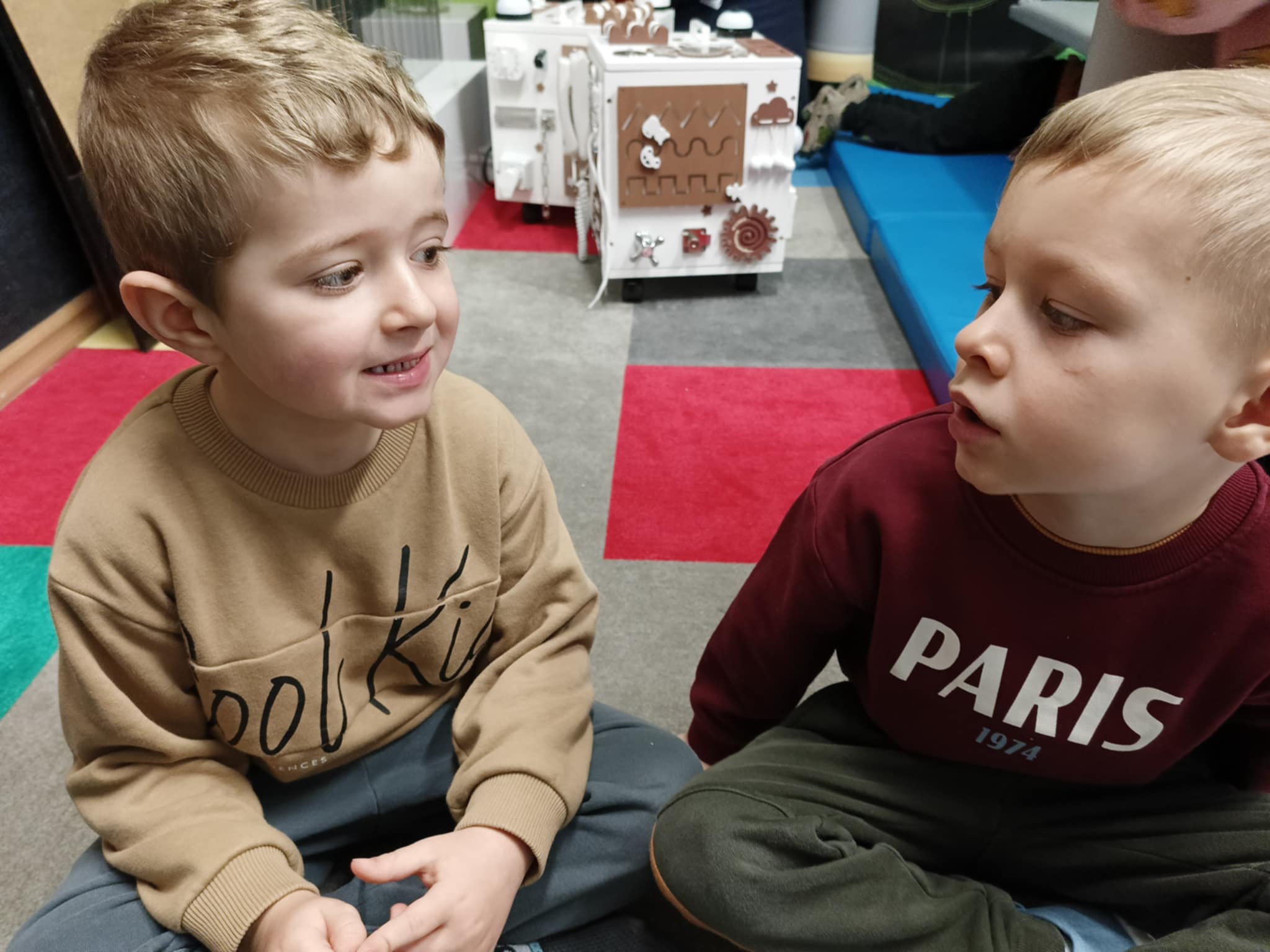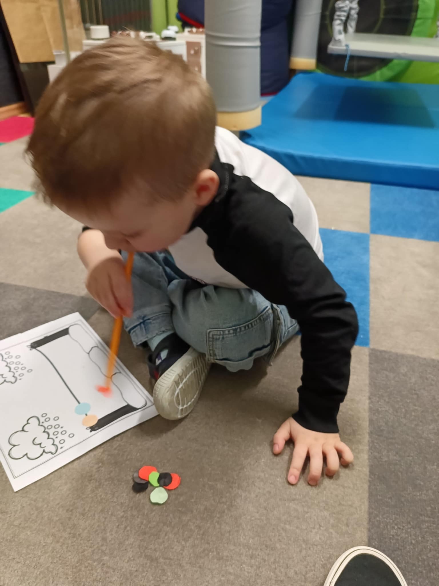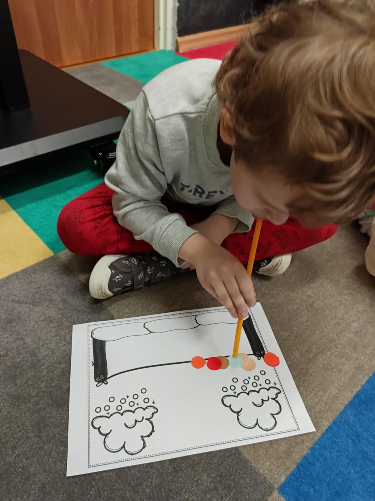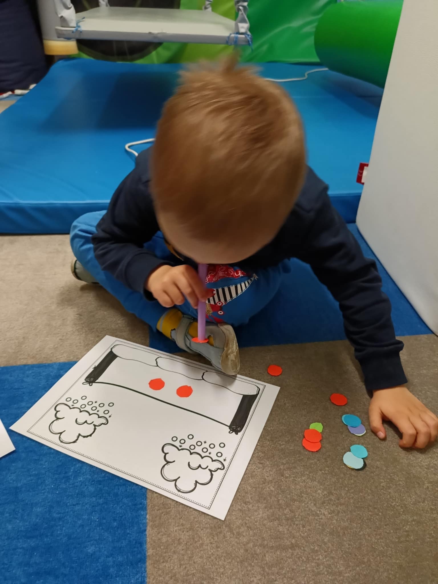 Dzieci rozwijały również motorykę małą poprzez kolorowanie obrazków ćwicząc jednocześnie logiczne myślenie (wybór odpowiednich ilustracji), wspólne pole uwagi oraz umiejętność wskazywania palcem. Zajęcia miały także na celu rozwój mowy biernej – dzieci rozpoznawały i wskazywały obrazki na podstawie poleceń nauczyciela, nazywały przedmioty oraz dzieliły je na sylaby, co wspierało percepcję słuchową i świadomość fonologiczną.