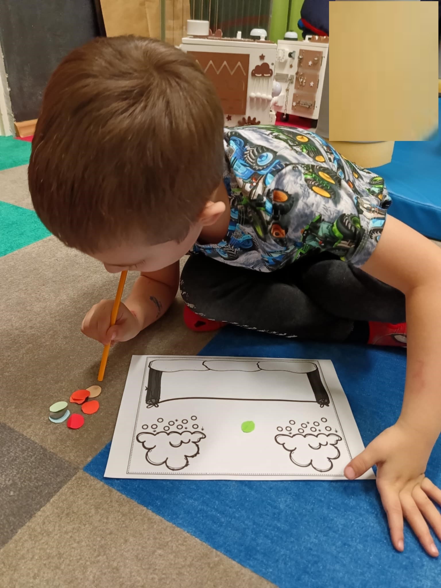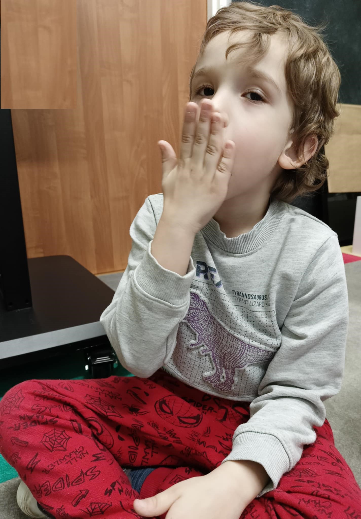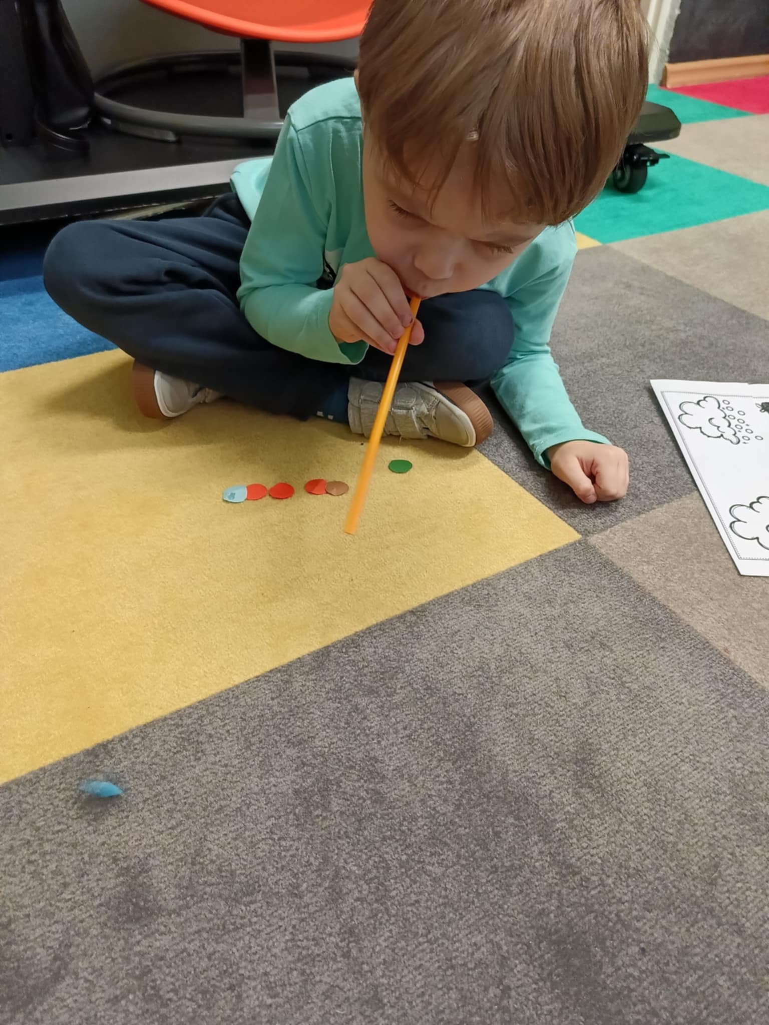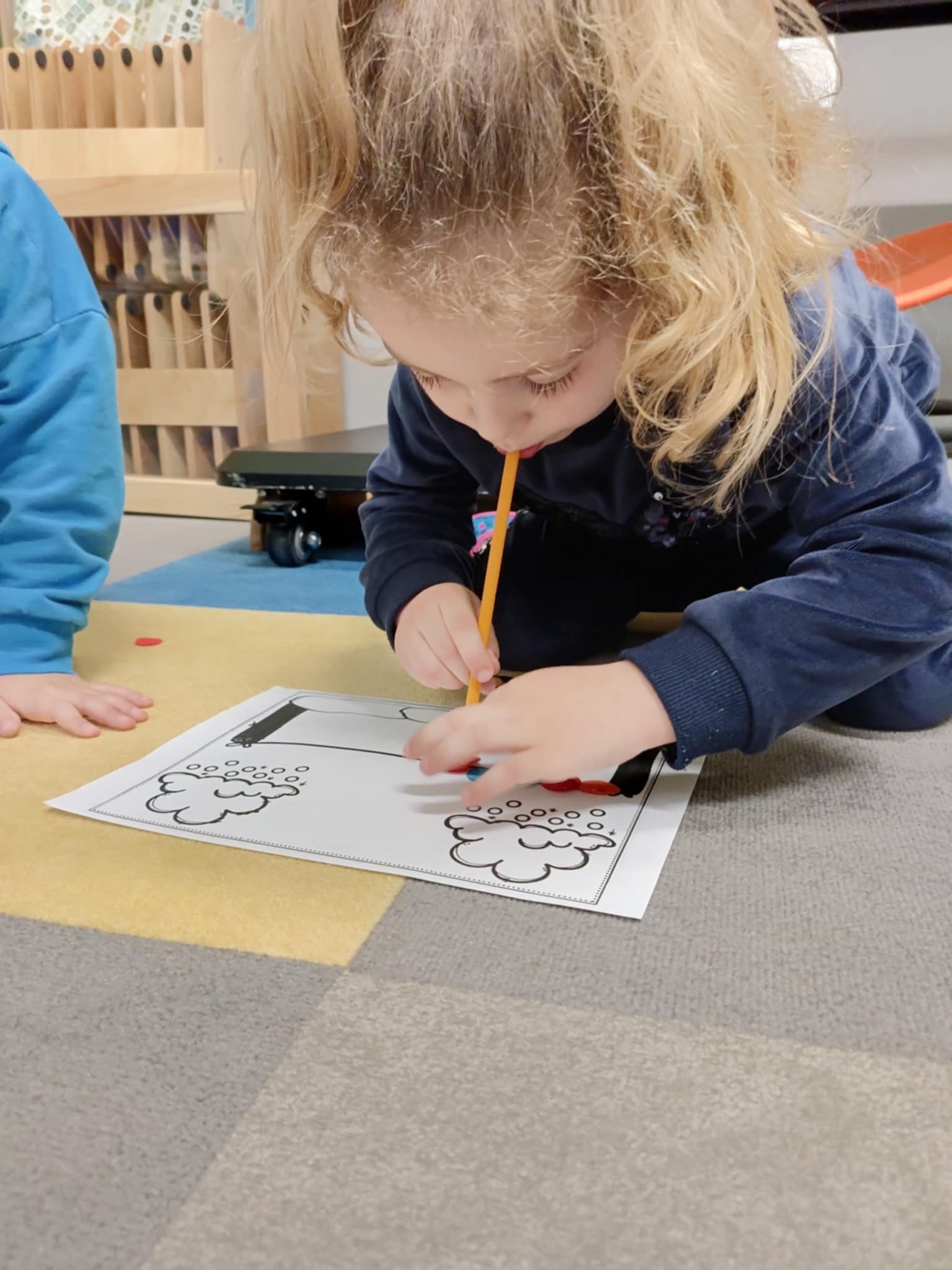 Dzieci rozwijały również motorykę małą poprzez kolorowanie obrazków ćwicząc jednocześnie logiczne myślenie (wybór odpowiednich ilustracji), wspólne pole uwagi oraz umiejętność wskazywania palcem. Zajęcia miały także na celu rozwój mowy biernej – dzieci rozpoznawały i wskazywały obrazki na podstawie poleceń nauczyciela, nazywały przedmioty oraz dzieliły je na sylaby, co wspierało percepcję słuchową i świadomość fonologiczną.
