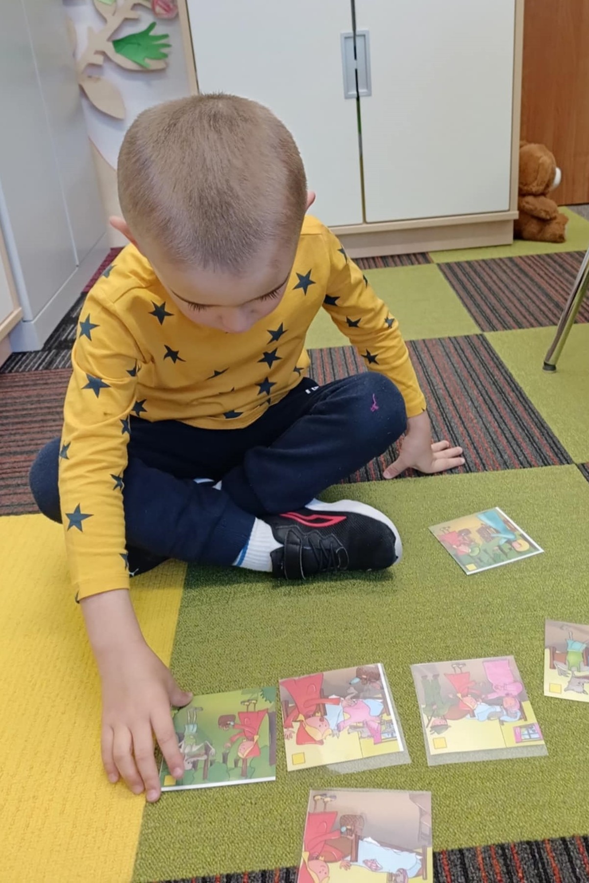 W ramach ćwiczenia umiejętności narracyjnych układaliśmy i opowiadaliśmy historyjkę obrazkową, rozwijając przy tym słownictwo oraz zdolność wypowiedzi ustnej.